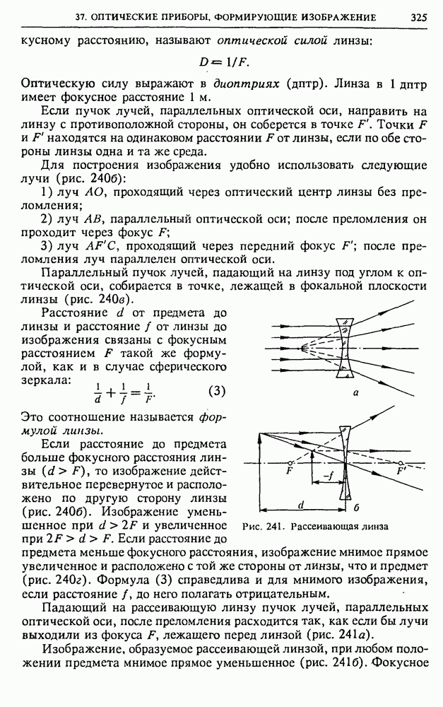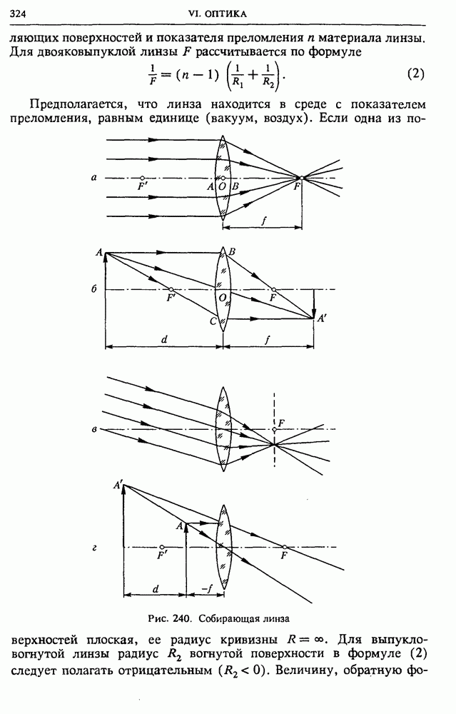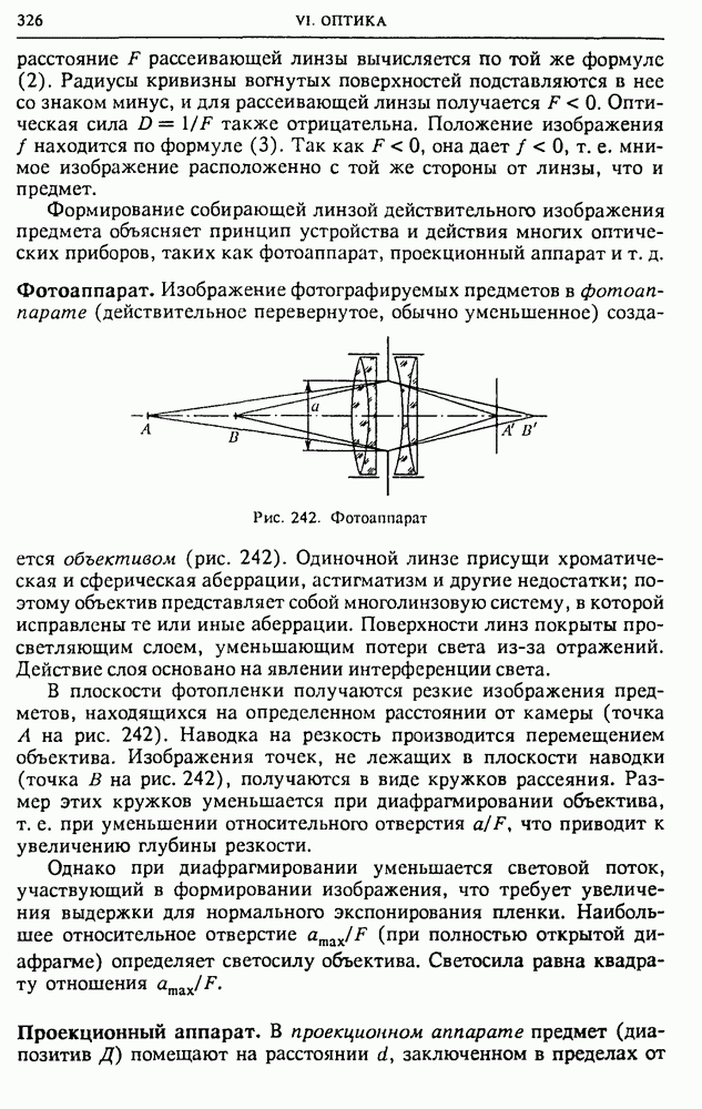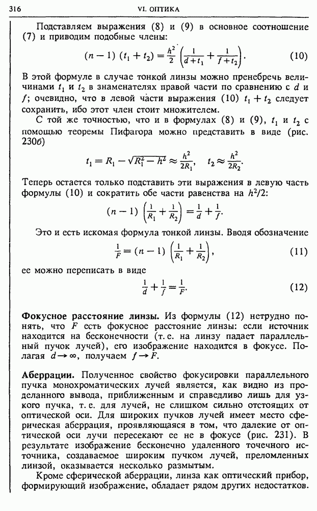 Фокусное расстояние линзы. Из формулы (12) нетрудно понять, что Аберрации. Полученное свойство фокусировки параллельного пучка монохроматических лучей является, как видно из проделанного вывода, приближенным и справедливо лишь для узкого пучка, т. е. для лучей, не слишком сильно отстоящих от оптической оси. Для широких пучков лучей имеет место сферическая аберрация, проявляющаяся в том, что далекие от оптической оси лучи пересекают ее не в фокусе (рис. 231). В результате изображение бесконечно удаленного точечного источника, создаваемое широким пучком лучей, преломленных линзой, оказывается несколько размытым. Кроме сферической аберрации, линза как оптический прибор, формирующий изображение, обладает рядом других недостатков. Например, даже узкий параллельный пучок монохроматических лучей, образующий некоторый угол с оптической осью линзы, после преломления не собирается в одну точку. При использовании немонохроматического света у линзы проявляется еще и хроматическая аберрация, связанная с тем, что показатель преломления При конструировании оптических приборов удается в большей или меньшей степени устранить эти недостатки путем применения специально рассчитанных сложных многолинзовых систем. Однако одновременно устранить все недостатки невозможно. Поэтому приходится идти на компромисс и, рассчитывая оптические приборы, предназначенные для определенной цели, добиваться устранения одних недостатков и мириться с присутствием других. Например, объективы, предназначенные для наблюдения объектов малой яркости, должны пропускать возможно больше света, что вынуждает мириться с некоторыми аберрациями, неизбежными при использовании широких пучков света.