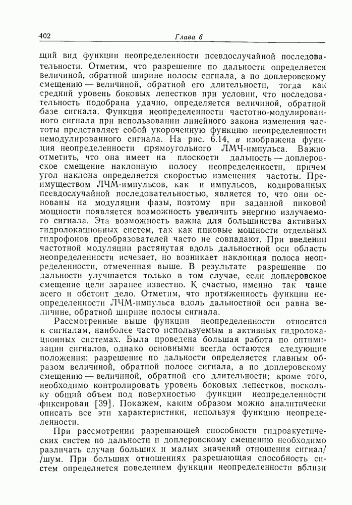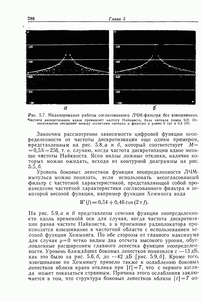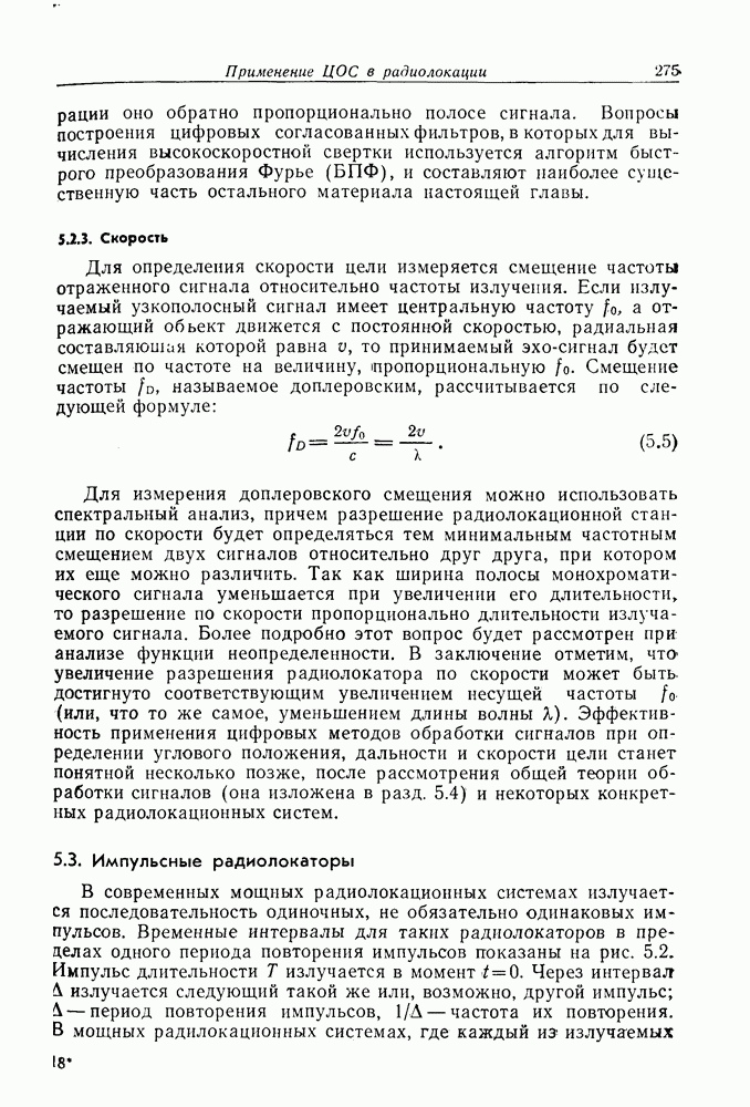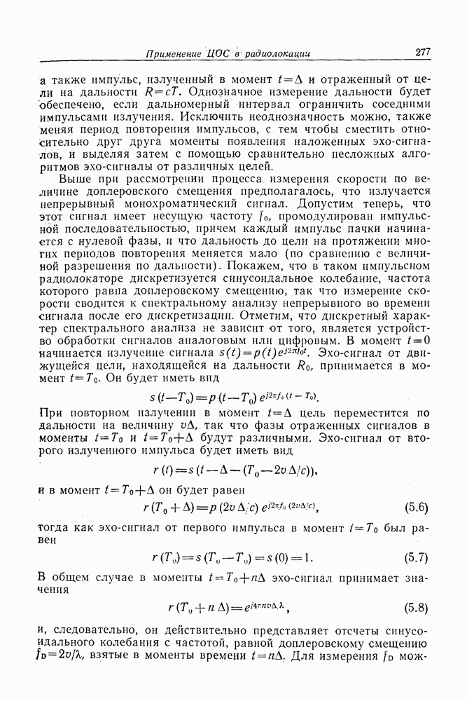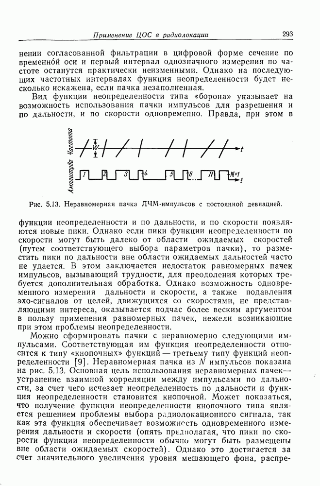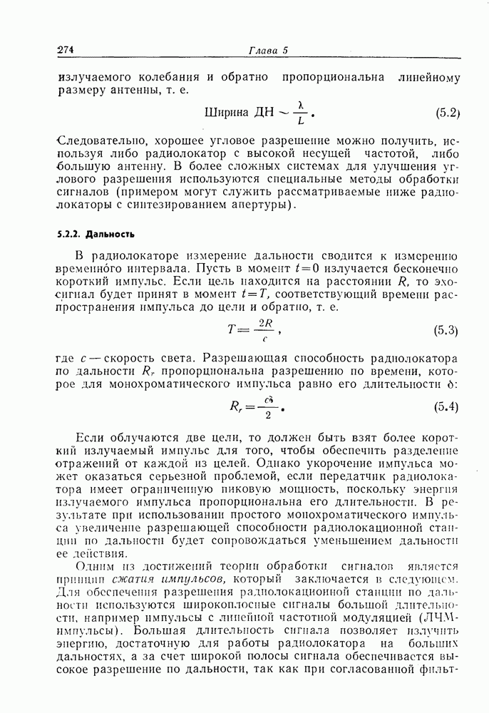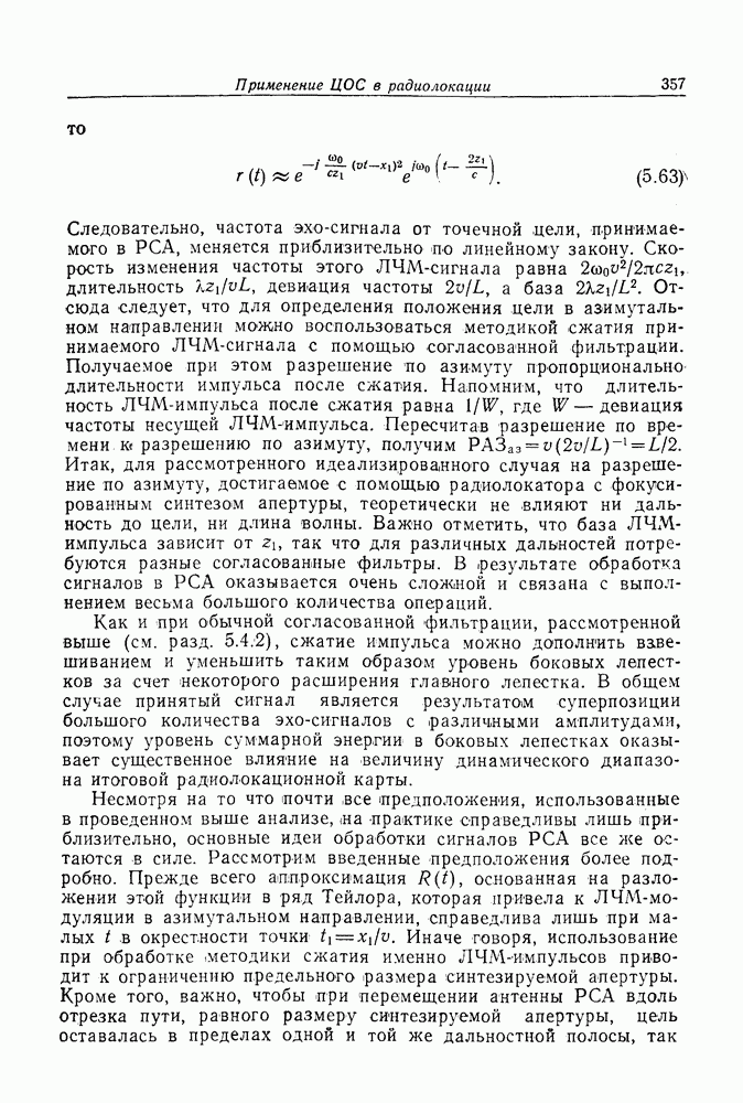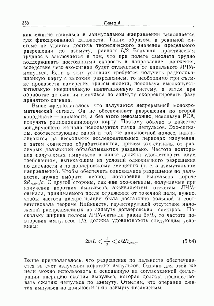 Следовательно, частота эхо-сигнала от точечной цели, принимаемого в РСА, меняется приблизительно по линейному закону. Скорость изменения частоты этого ЛЧМ-сигнала равна Как и при обычной согласованной фильтрации, рассмотренной выше (см. разд. 5.4.2), сжатие импульса можно дополнить взвешиванием и уменьшить таким образом уровень боковых лепестков за счет некоторого расширения главного лепестка. В общем случае принятый сигнал является результатам суперпозиции большого количества эхо-сигналов с различными амплитудами, поэтому уровень суммарной энергии в боковых лепестках оказывает существенное влияние на величину динамического диапазона итоговой радиолокационной карты. Несмотря на то что почти все предположения, использованные в проведенном выше анализе, на практике справедливы лишь приблизительно, основные идеи обработки сигналов РСА все же остаются в силе. Рассмотрим введенные предположения более подробно. Прежде всего аппроксимация как сжатие импульса в азимутальном направлении выполняется для фиксированной дальности. Таким образом, в реальной системе не удается достичь теоретического значения предельного разрешения по азимуту, равного Выше предполагалось, что излучается непрерывный монохроматический сигнал. Он не обеспечивает разрешения по второй координате — дальности, а без этого невозможно, используя РСА, получить радиолокационную карту. Поэтому обычно в качестве зондирующего сигнала используется пачка импульсов. Эхо-сигналы, соответствующие одной и той же дальностной полосе, накапливаются на нескольких последовательных периодах излучения, а затем совместно обрабатываются, причем эхо-сигналы от различных дальностей обрабатываются раздельно. Частота повторения излучаемых импульсов в пачке должна удовлетворять двум требованиям, вытекающим из условий однозначного разрешения по дальности и по доплеровскому смещению (т. е. в азимутальном направлении). Чтобы обеспечить однозначное разрешение по дальности, нужно выбрать период повторения импульсов короче