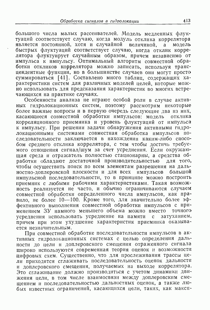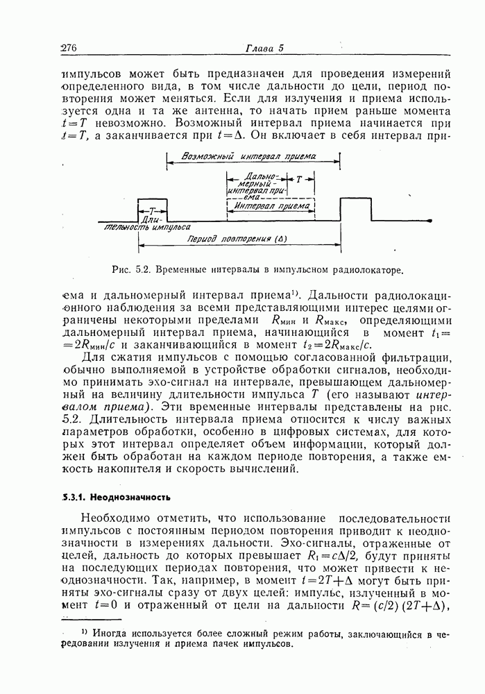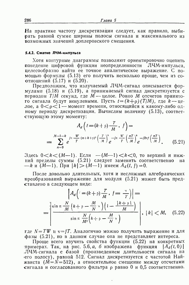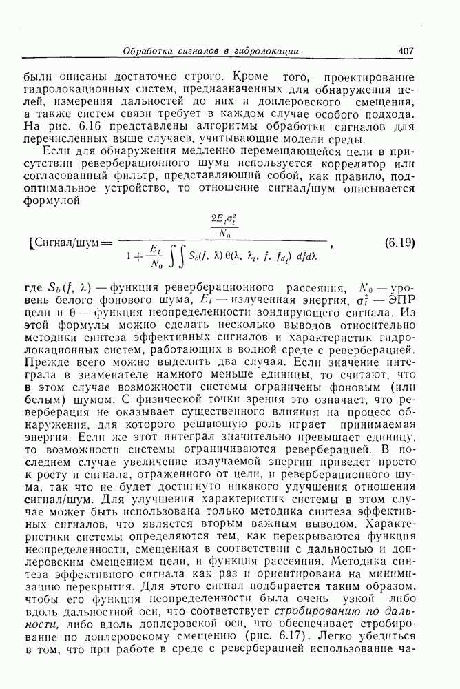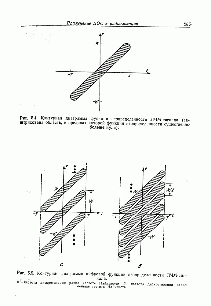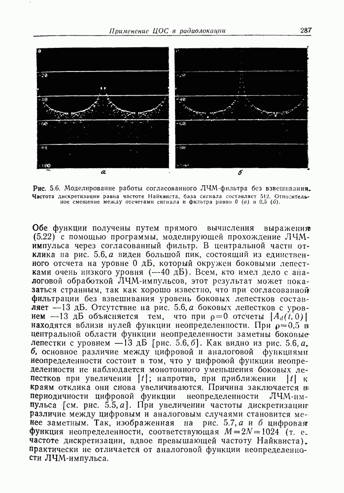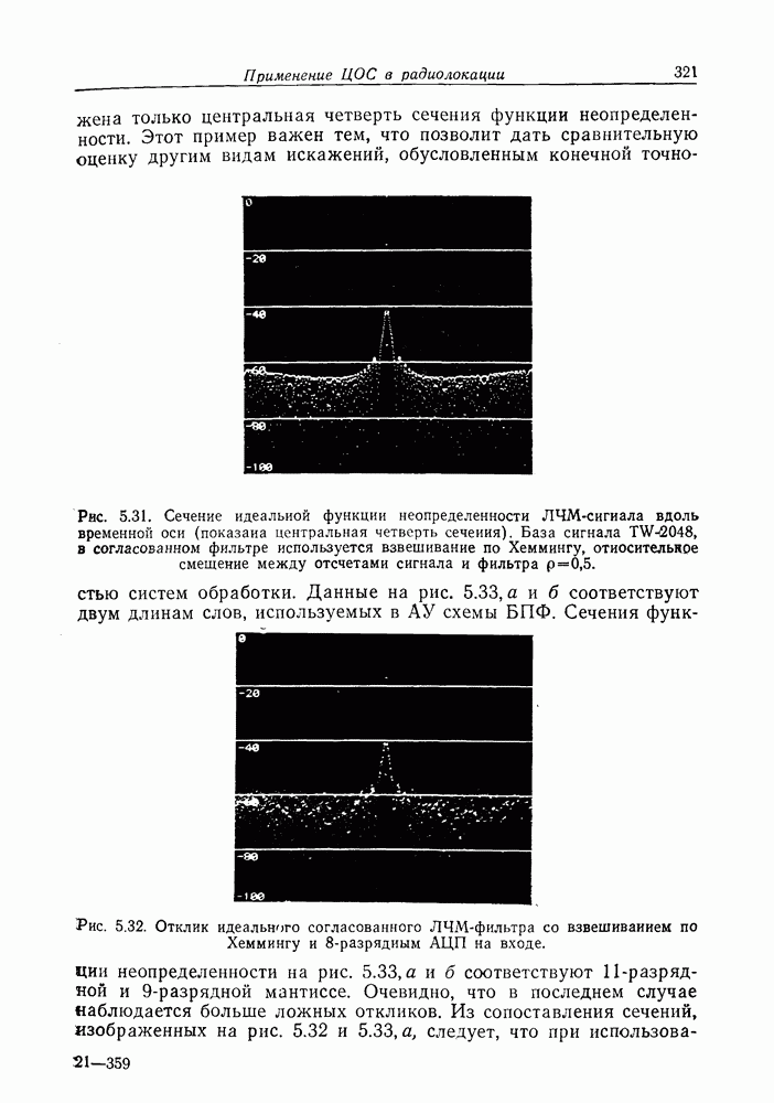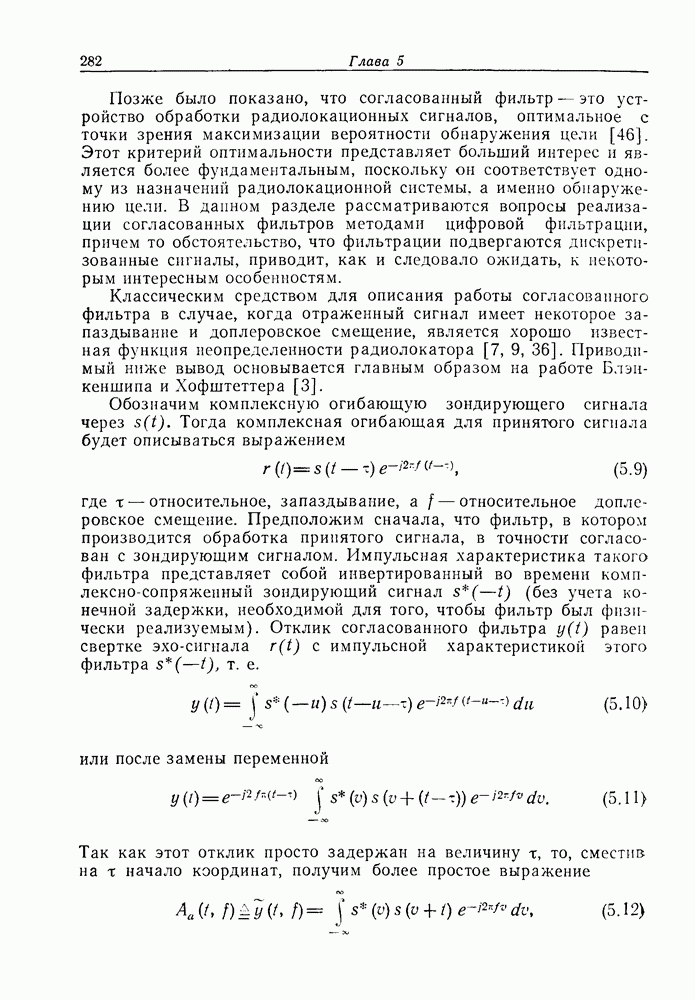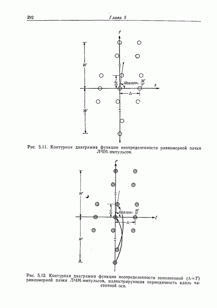Следовательно, частота эхо-сигнала от точечной цели, принимаемого в РСА, меняется приблизительно по линейному закону. Скорость изменения частоты этого ЛЧМ-сигнала равна Как и при обычной согласованной фильтрации, рассмотренной выше (см. разд. 5.4.2), сжатие импульса можно дополнить взвешиванием и уменьшить таким образом уровень боковых лепестков за счет некоторого расширения главного лепестка. В общем случае принятый сигнал является результатам суперпозиции большого количества эхо-сигналов с различными амплитудами, поэтому уровень суммарной энергии в боковых лепестках оказывает существенное влияние на величину динамического диапазона итоговой радиолокационной карты. Несмотря на то что почти все предположения, использованные в проведенном выше анализе, на практике справедливы лишь приблизительно, основные идеи обработки сигналов РСА все же остаются в силе. Рассмотрим введенные предположения более подробно. Прежде всего аппроксимация как сжатие импульса в азимутальном направлении выполняется для фиксированной дальности. Таким образом, в реальной системе не удается достичь теоретического значения предельного разрешения по азимуту, равного Выше предполагалось, что излучается непрерывный монохроматический сигнал. Он не обеспечивает разрешения по второй координате — дальности, а без этого невозможно, используя РСА, получить радиолокационную карту. Поэтому обычно в качестве зондирующего сигнала используется пачка импульсов. Эхо-сигналы, соответствующие одной и той же дальностной полосе, накапливаются на нескольких последовательных периодах излучения, а затем совместно обрабатываются, причем эхо-сигналы от различных дальностей обрабатываются раздельно. Частота повторения излучаемых импульсов в пачке должна удовлетворять двум требованиям, вытекающим из условий однозначного разрешения по дальности и по доплеровскому смещению (т. е. в азимутальном направлении). Чтобы обеспечить однозначное разрешение по дальности, нужно выбрать период повторения импульсов короче
