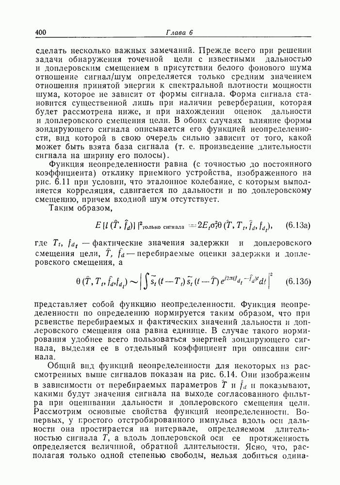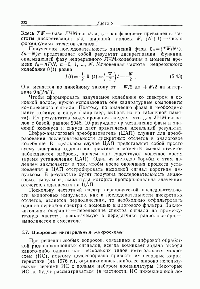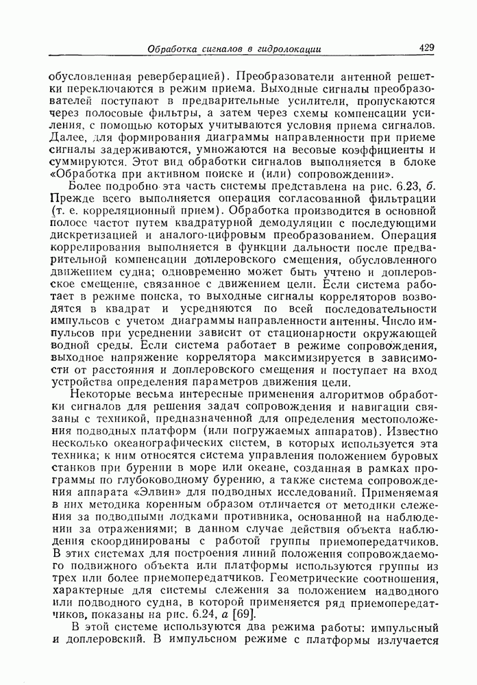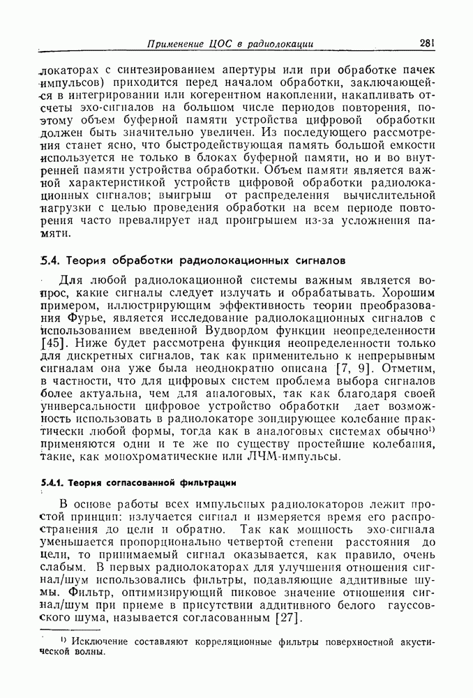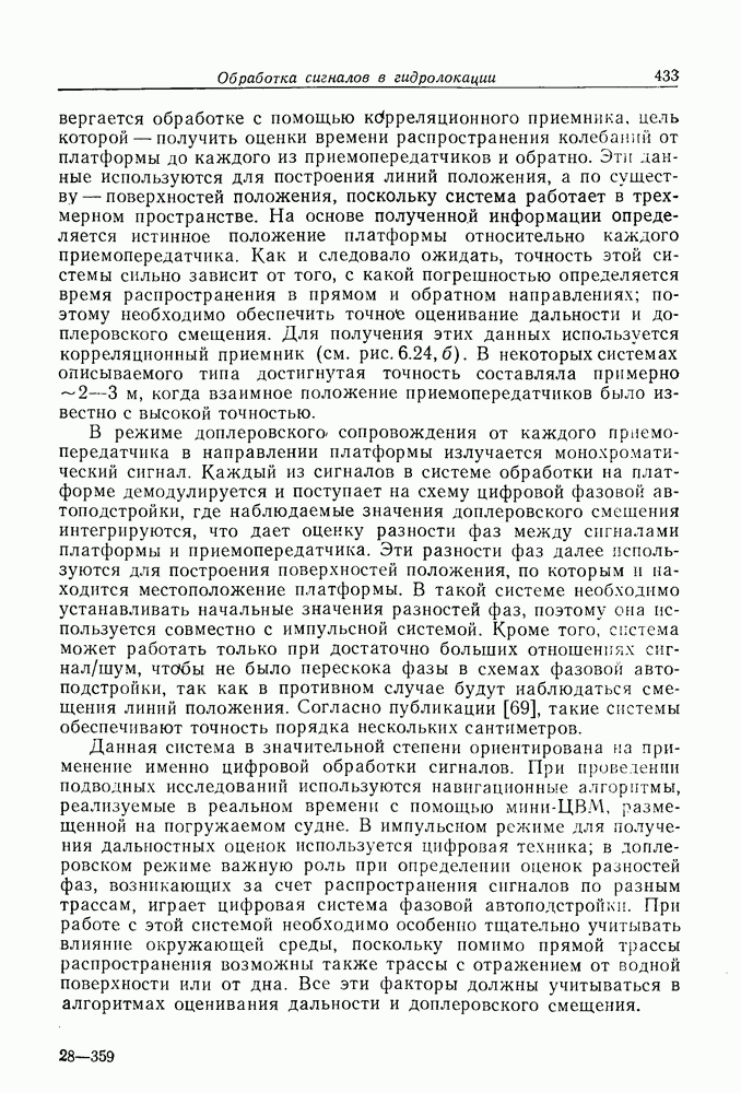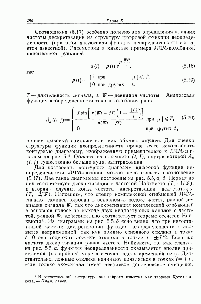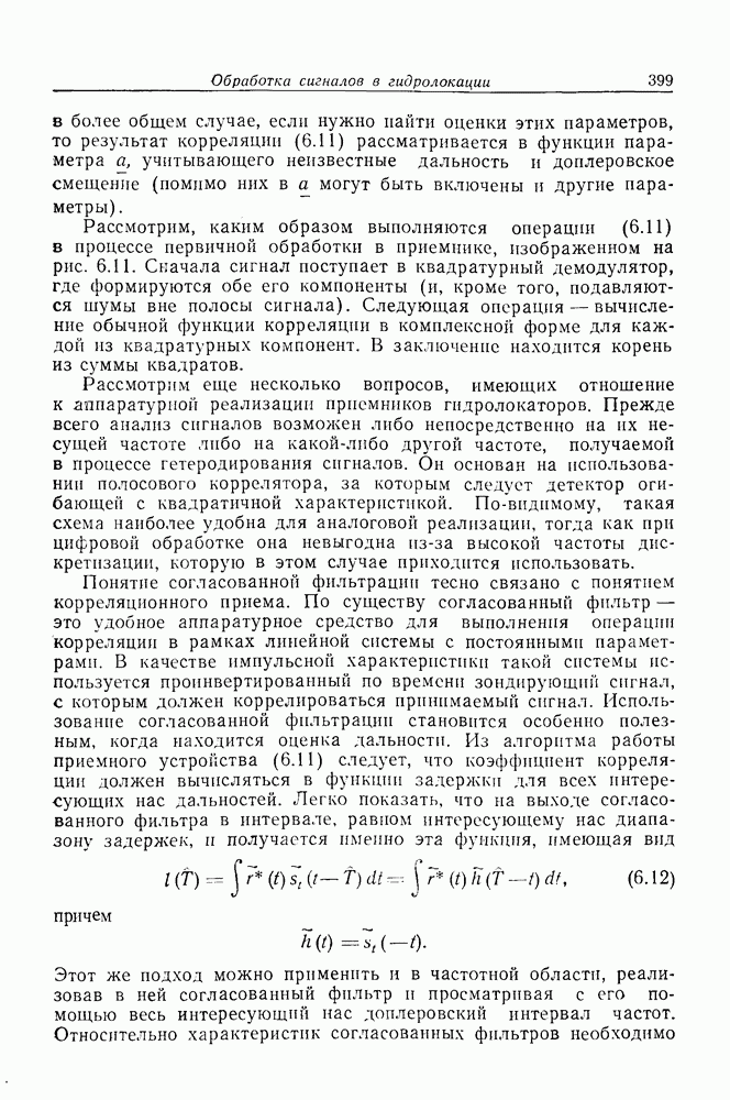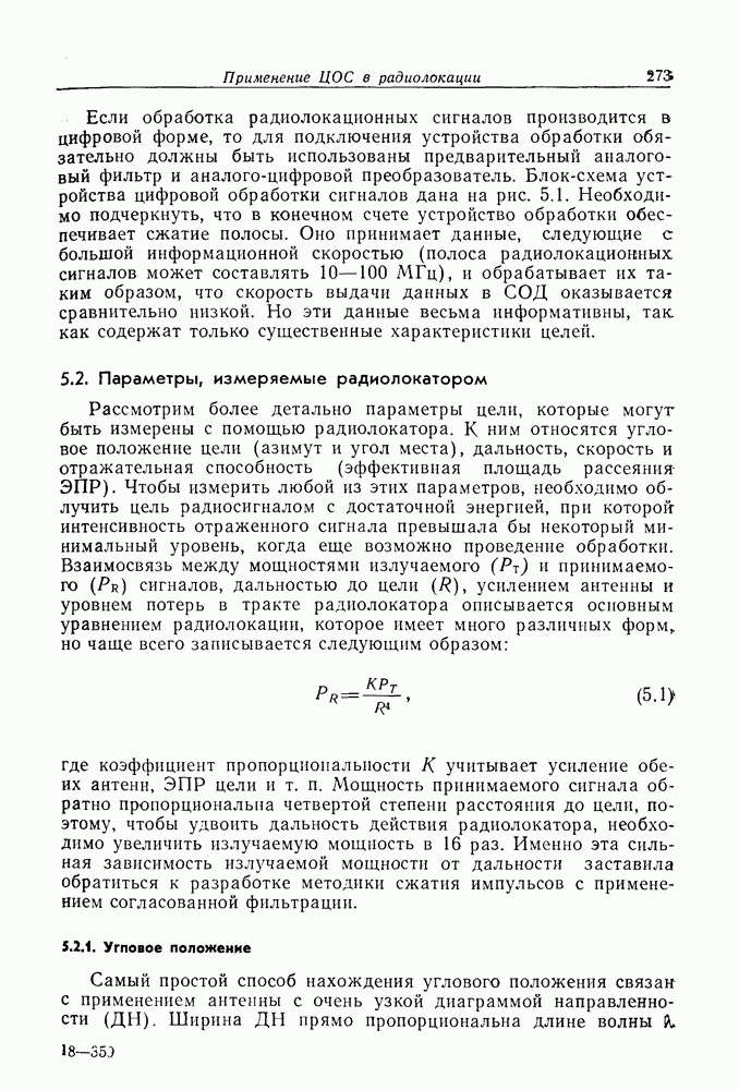 Следовательно, частота эхо-сигнала от точечной цели, принимаемого в РСА, меняется приблизительно по линейному закону. Скорость изменения частоты этого ЛЧМ-сигнала равна Как и при обычной согласованной фильтрации, рассмотренной выше (см. разд. 5.4.2), сжатие импульса можно дополнить взвешиванием и уменьшить таким образом уровень боковых лепестков за счет некоторого расширения главного лепестка. В общем случае принятый сигнал является результатам суперпозиции большого количества эхо-сигналов с различными амплитудами, поэтому уровень суммарной энергии в боковых лепестках оказывает существенное влияние на величину динамического диапазона итоговой радиолокационной карты. Несмотря на то что почти все предположения, использованные в проведенном выше анализе, на практике справедливы лишь приблизительно, основные идеи обработки сигналов РСА все же остаются в силе. Рассмотрим введенные предположения более подробно. Прежде всего аппроксимация как сжатие импульса в азимутальном направлении выполняется для фиксированной дальности. Таким образом, в реальной системе не удается достичь теоретического значения предельного разрешения по азимуту, равного Выше предполагалось, что излучается непрерывный монохроматический сигнал. Он не обеспечивает разрешения по второй координате — дальности, а без этого невозможно, используя РСА, получить радиолокационную карту. Поэтому обычно в качестве зондирующего сигнала используется пачка импульсов. Эхо-сигналы, соответствующие одной и той же дальностной полосе, накапливаются на нескольких последовательных периодах излучения, а затем совместно обрабатываются, причем эхо-сигналы от различных дальностей обрабатываются раздельно. Частота повторения излучаемых импульсов в пачке должна удовлетворять двум требованиям, вытекающим из условий однозначного разрешения по дальности и по доплеровскому смещению (т. е. в азимутальном направлении). Чтобы обеспечить однозначное разрешение по дальности, нужно выбрать период повторения импульсов короче