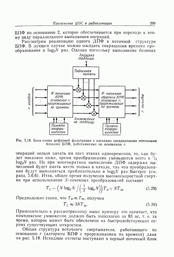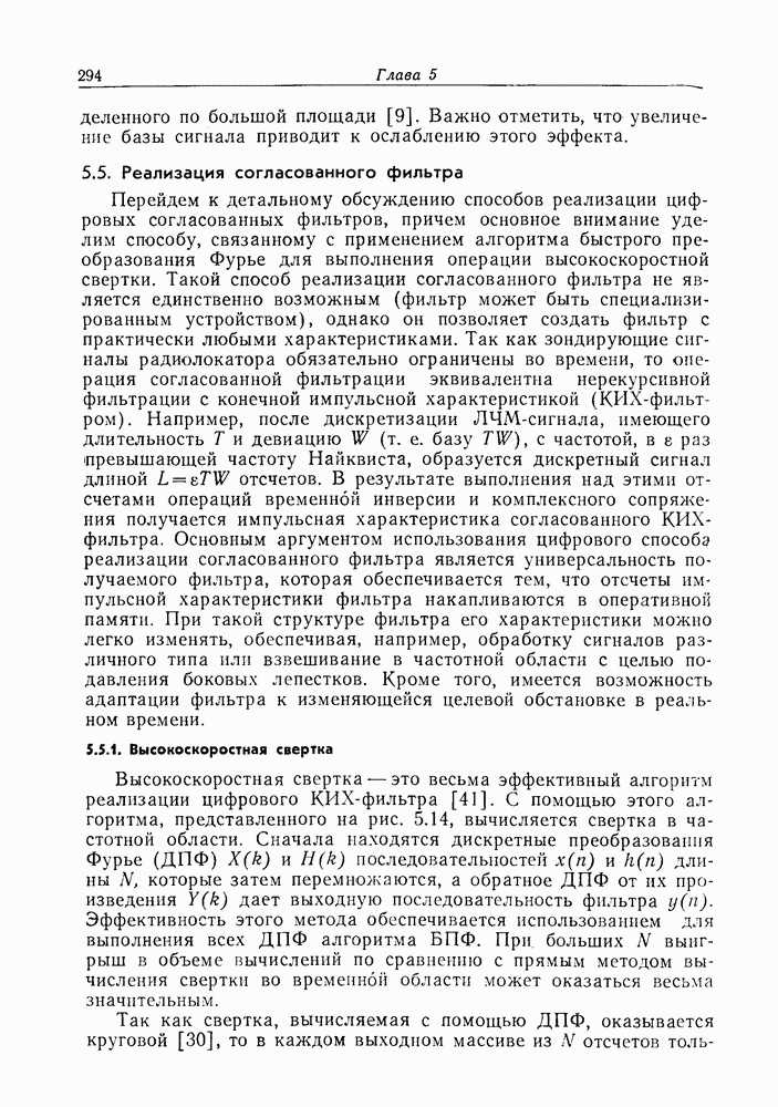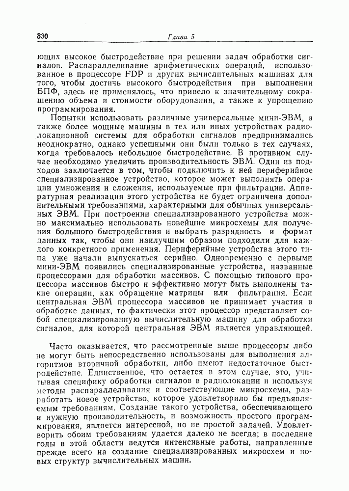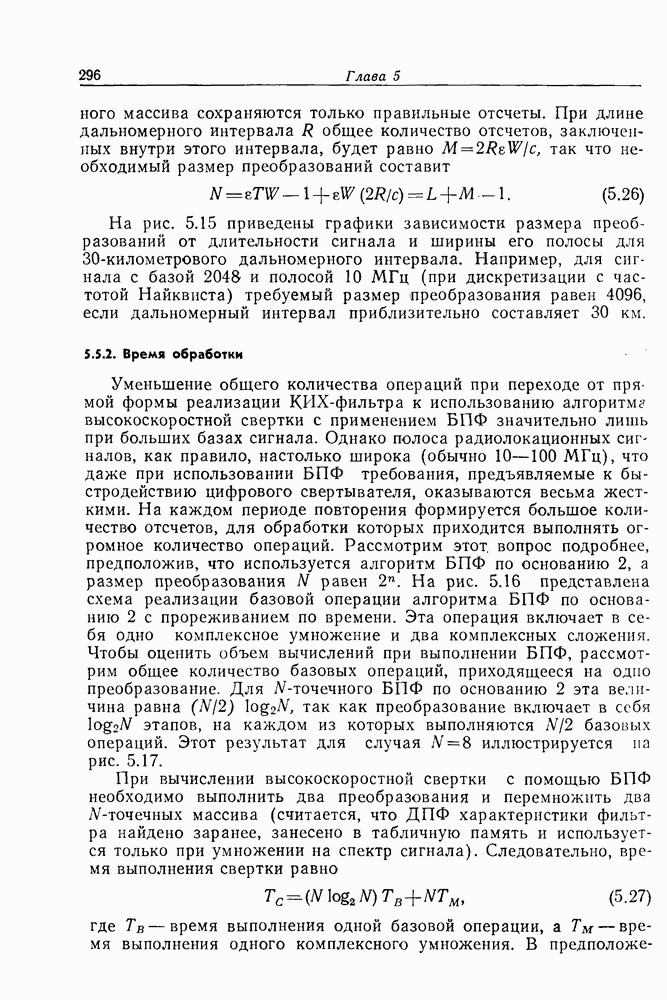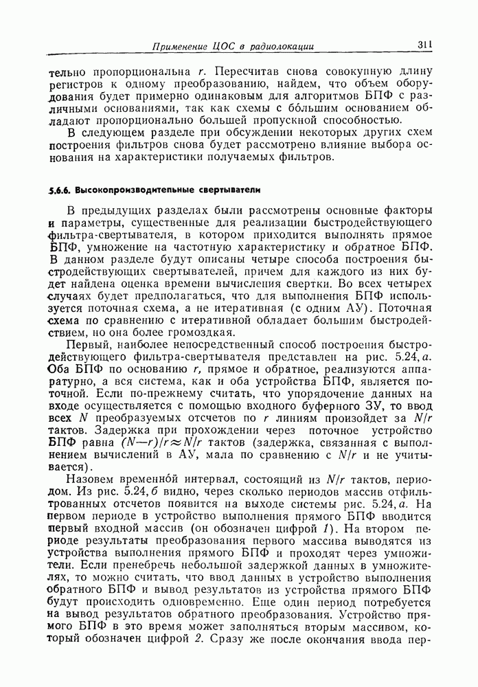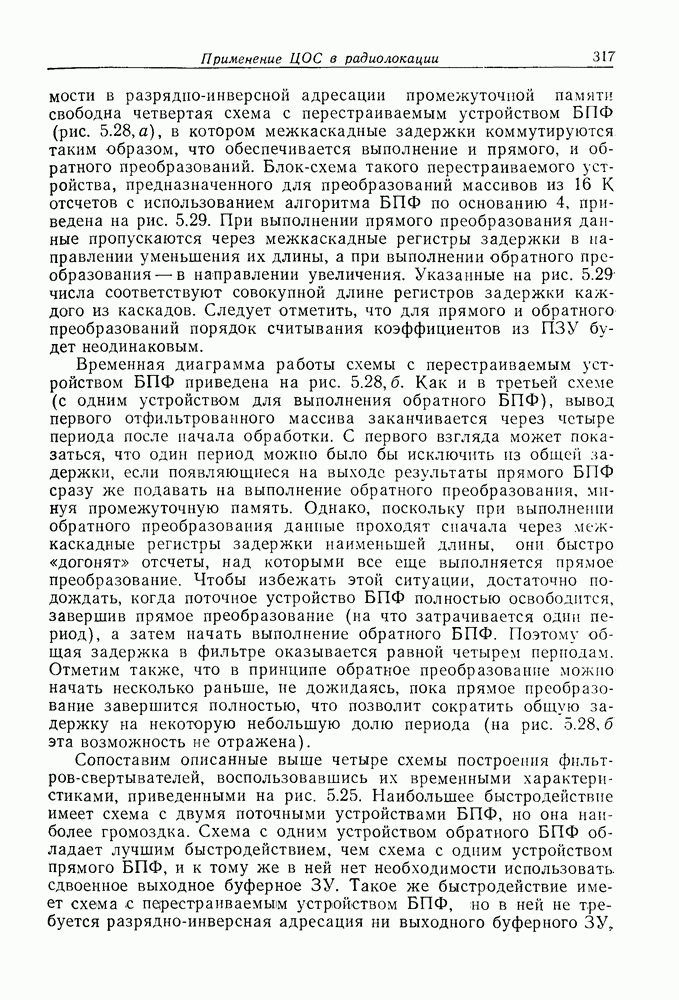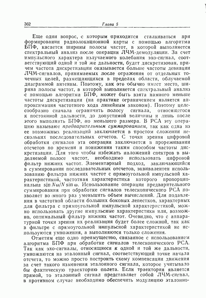 Если рассмотреть типовые характеристики РСА, то можно убедиться, что предъявляемые требования исключительно высоки. При Требование к быстродействию можно снизить, если использовать алгоритм высокоскоростной свертки с применением БПФ и распараллеливание операций, но даже при этом необходимая скорость вычислений остается все еще слишком высокой. Более того, объем памяти на самом деле требуется увеличить, так как необходимо промежуточное накопление данных. При работе РСА в телескопическом режиме применение алгоритма БПФ создает дополнительные возможности сокращения требуемого быстродействия и практической реализации устройства обработки сигналов РСА.