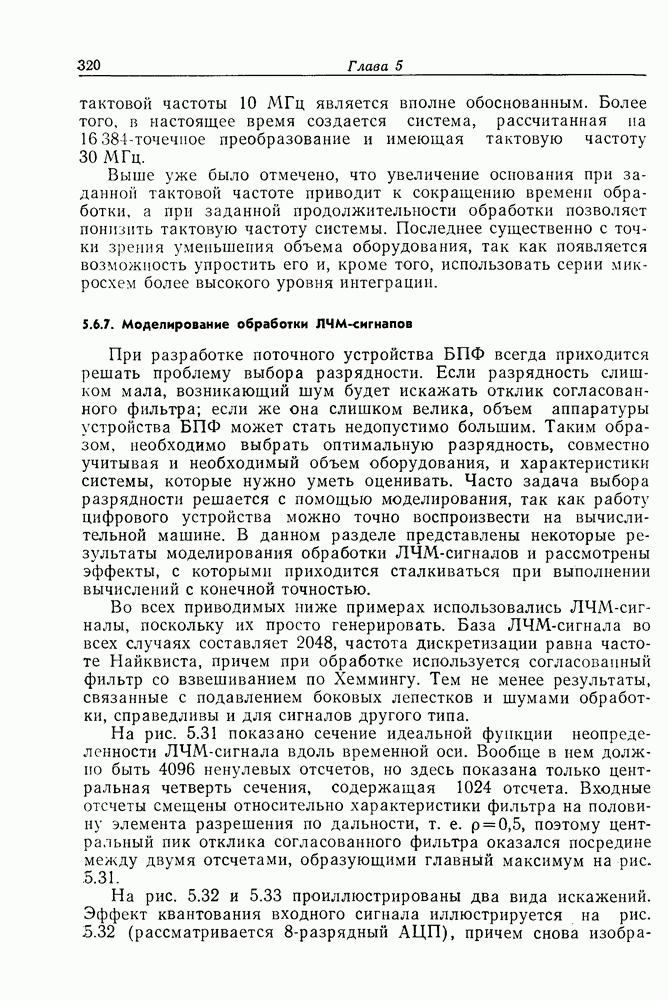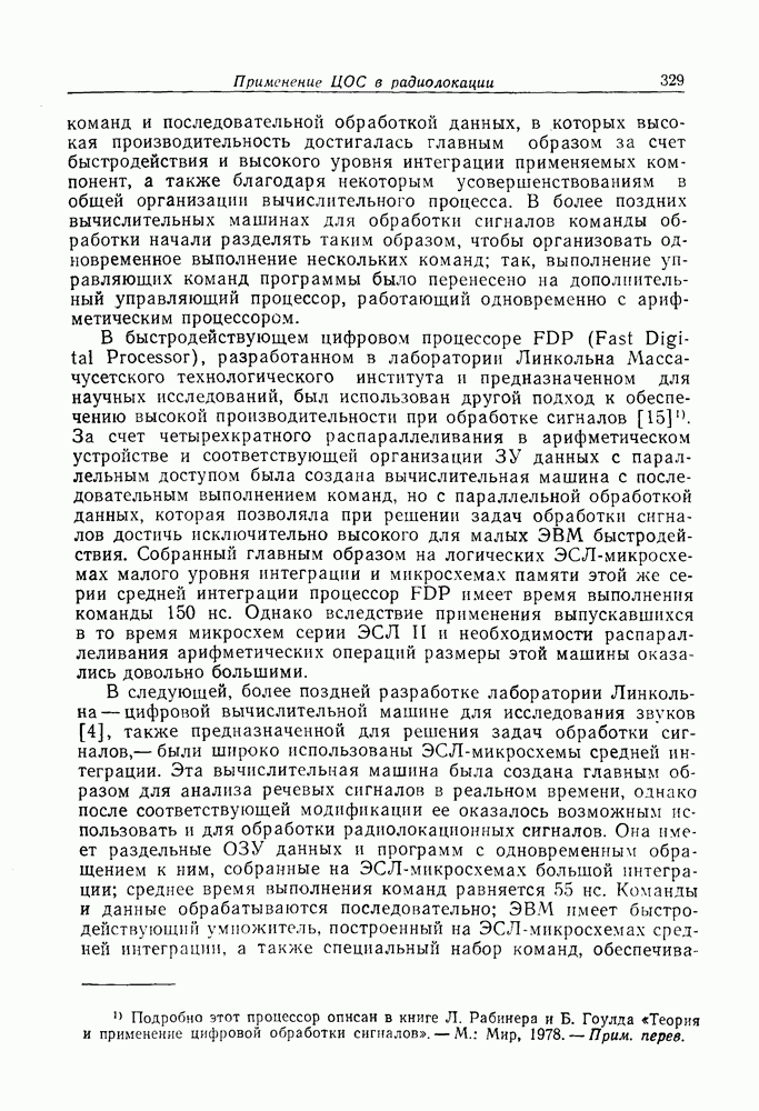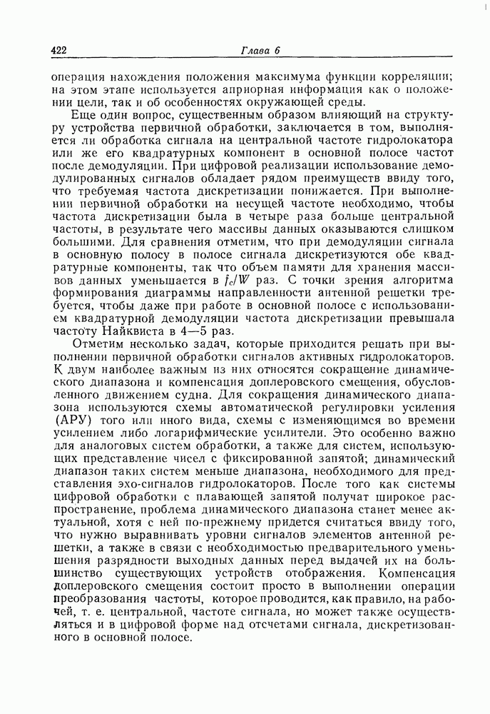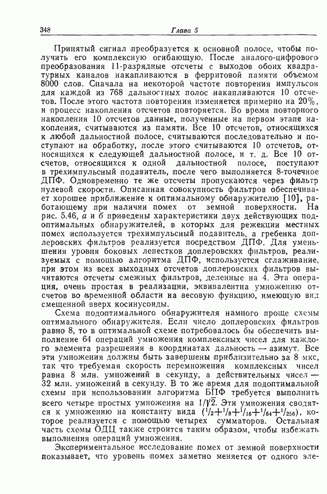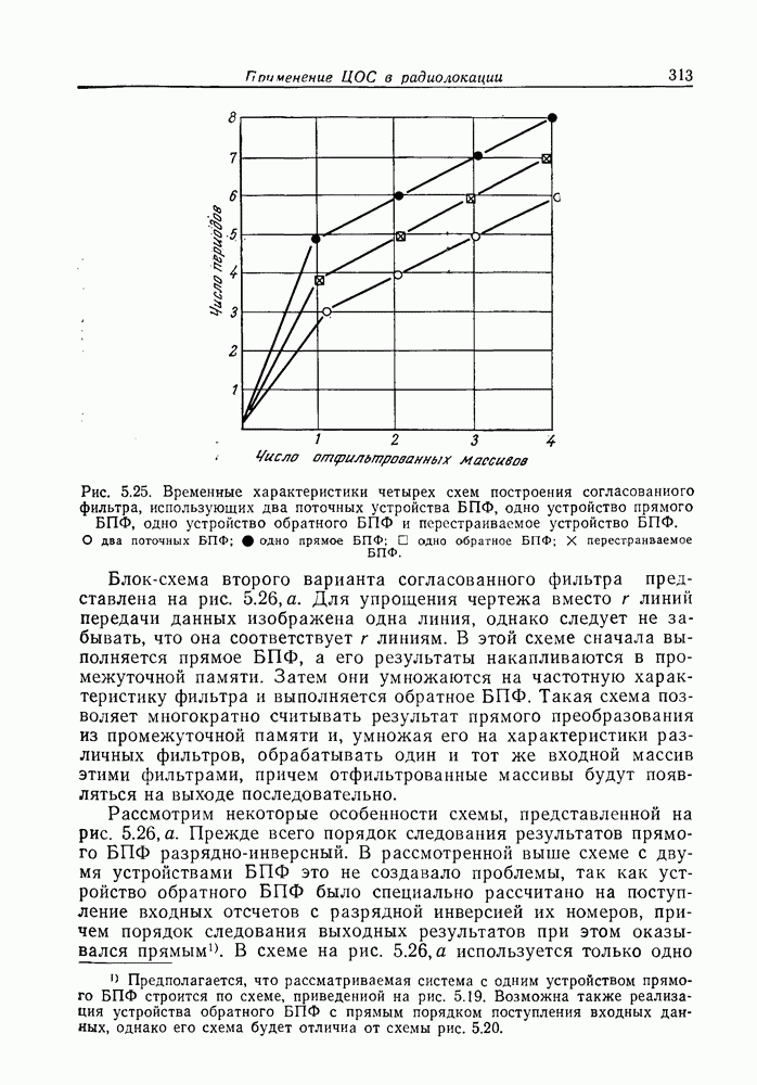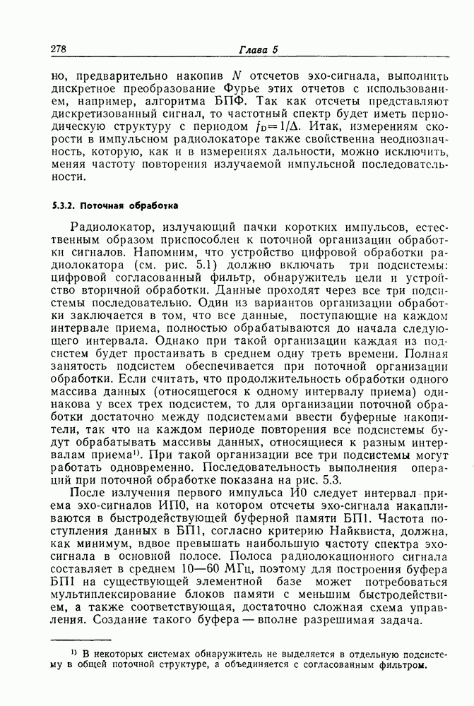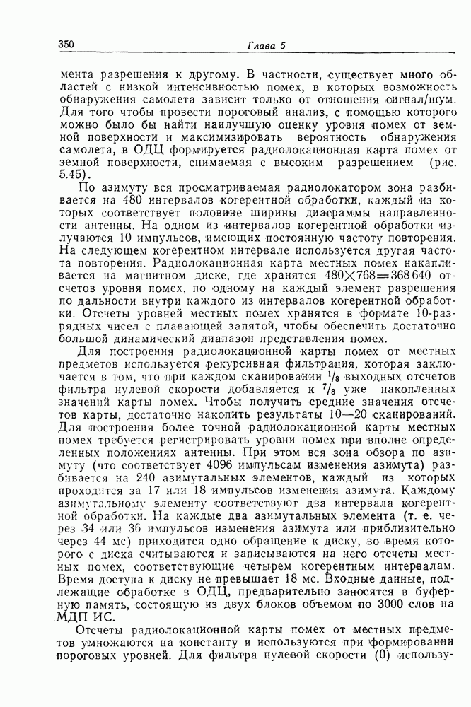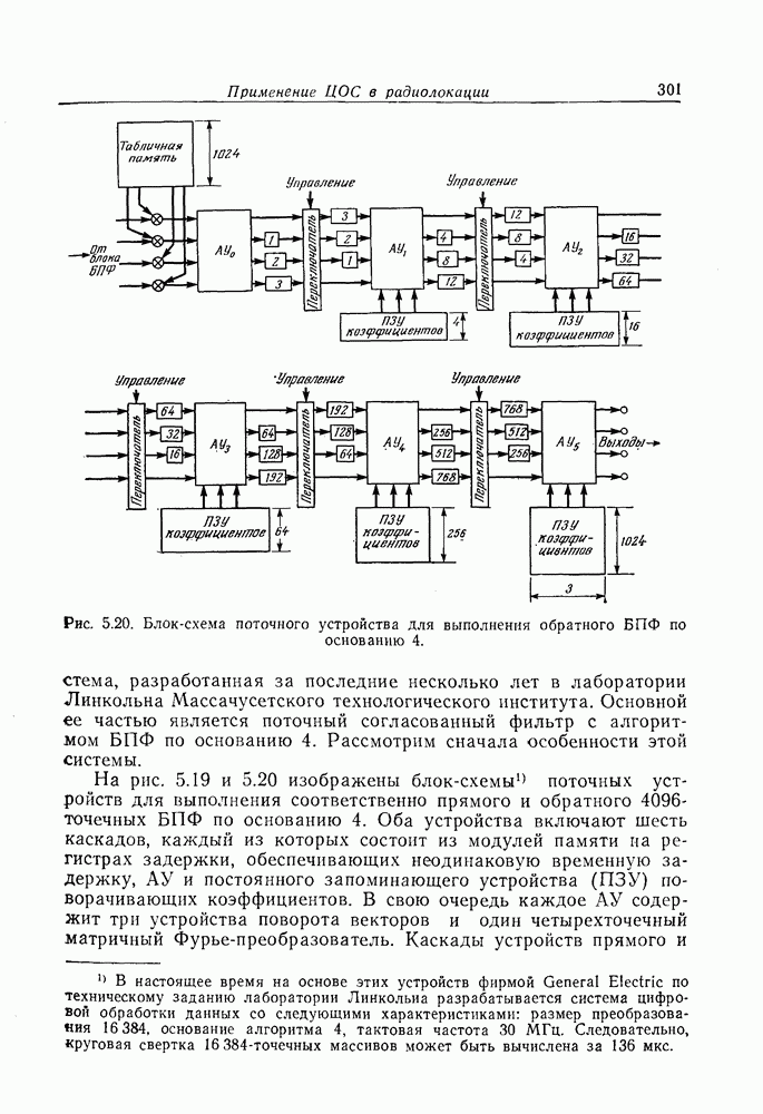 Если рассмотреть типовые характеристики РСА, то можно убедиться, что предъявляемые требования исключительно высоки. При Требование к быстродействию можно снизить, если использовать алгоритм высокоскоростной свертки с применением БПФ и распараллеливание операций, но даже при этом необходимая скорость вычислений остается все еще слишком высокой. Более того, объем памяти на самом деле требуется увеличить, так как необходимо промежуточное накопление данных. При работе РСА в телескопическом режиме применение алгоритма БПФ создает дополнительные возможности сокращения требуемого быстродействия и практической реализации устройства обработки сигналов РСА.
