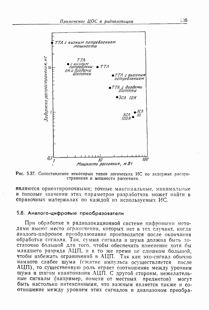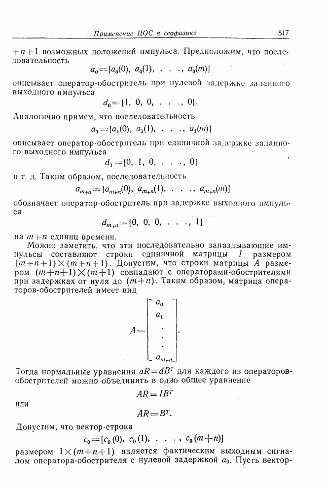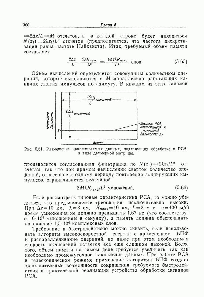 Выше предполагалось, что разрешение по дальности обеспечивается за счет излучения коротких импульсов. Однако для этой же цели можно использовать и основанную на согласованной фильтрации операцию сжатия импульса, которая должна предшествовать сжатию импульса по азимуту. Отметим, что операции сжатия импульса по дальности и по азимуту независимы. 5.10.2. Объем вычисленийМетодика обработки сигналов РСА, описанная в предыдущем разделе, предполагает выполнение согласованной фильтрации по двум переменным — дальности и азимуту. Обычно, чтобы справиться с (большим объемом данных, которые приходится накапливать и обрабатывать в системах РСА, использовались методы оптической обработки сигналов. При этом оптическая обработка выполнялась, как правило, не в реальном времени: данные предварительно регистрировались на фотопленке. Для проведения обработки использовалась очень сложная оптическая система. Оптические системы имеют существенные недостатки. Они очень дорогие и, кроме того, ограничивают возможности проведения полосовой съемки при движении по не совсем прямолинейной траектории, причем практически нельзя скорректировать это движение, поскольку оптическая обработка не является универсальной. Конечно, с точки зрения универсальности обработки -и возможности ее выполнения в реальном времени предпочтение следует отдать цифровым методам, однако при их использовании сталкиваются с трудностями, связанными с широкой полосой обрабатываемых сигналов, большим требуемым объемом памяти и огромным количеством операций, которые приходится выполнять при картографировании с высоким разрешением. Структура устройства цифровой обработки сигналов РСА в значительной степени будет определяться используемыми элементами. Ниже рассматриваются требования, предъявляемые к объему памяти для хранения данных и быстродействию устройства обработки. В РСА для каждого зондирующего импульса приходится накапливать данные, относящиеся ко всем интересующим нас дальностям. Если для обеспечения разрешения по дальности используется сжатие импульсов с помощью согласованной фильтрации, то этот вид обработки может быть выполнен непосредственно над входными данными. Для получения разрешения по азимуту (Необходимо накопить данные по большому числу зондирований. Если накапливаемые данные размещаются в виде матрицы (рис. 5.51), элементы которой упорядочены по дальности и по времени, то заполнение матрицы производится по столбцам. Пр и сжатии сигналов по азимуту необходима совместная обработка отсчетов, размещающихся на одной строке. Для хранения накапливаемых отсчетов требуется память весьма большого объема. Кроме того, достаточно громоздкой оказывается и сама обработка, так как для каждой дальностной полосы требуется свой, отличный от других фильтр, обеспечивающий сжатие импульсов по азимуту. Приведем конкретный пример. Пусть разрешающие способности по азимуту и по дальности равны, причем общий диапазон просматриваемых при съемке дальностей равен