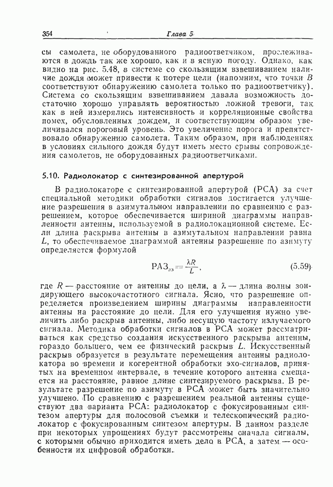 5.10. Радиолокатор с синтезированной апертуройВ радиолокаторе с синтезированной апертурой (РСА) за счет специальной методики обработки сигналов достигается улучшение разрешения в азимутальном направлении по сравнению с разрешением, которое обеспечивается шириной диаграммы направленности антенны, используемой в радиолокационной системе. Если длина раскрыва антенны в азимутальном направлении равна