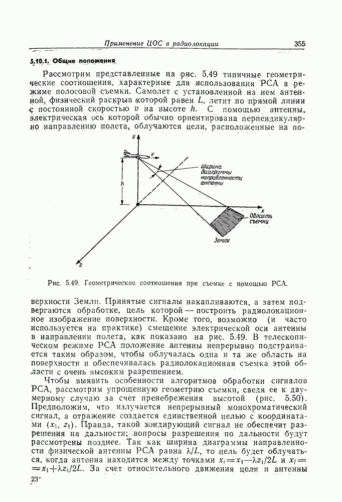 где 5.10.1, Общие положенияРассмотрим представленные на рис. 5.49 типичные геометрические соотношения, характерные для использования РСА в режиме полосовой съемки. Самолет с установленной на нем антенной, физический, раскрыв которой равен