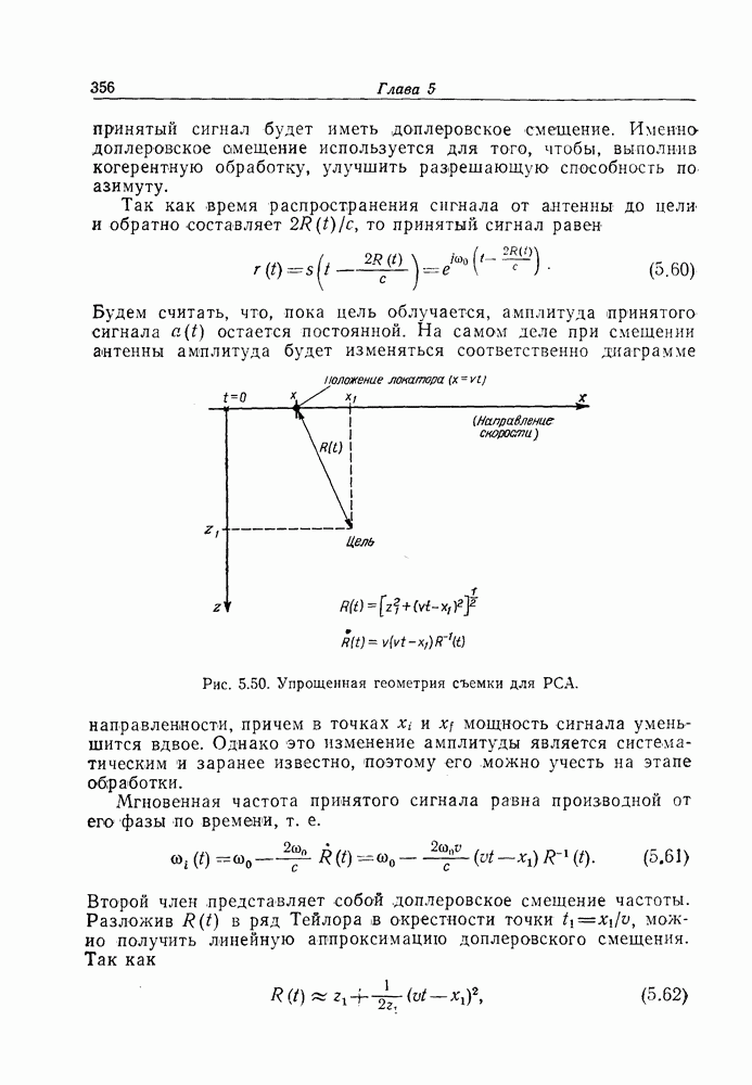 Рис. 5.50. Упрощенная геометрия съемки для РСА. Однако это изменение амплитуды является систематическим Мгновенная частота принятого сигнала равна производной от его фазы по времени, т. е.