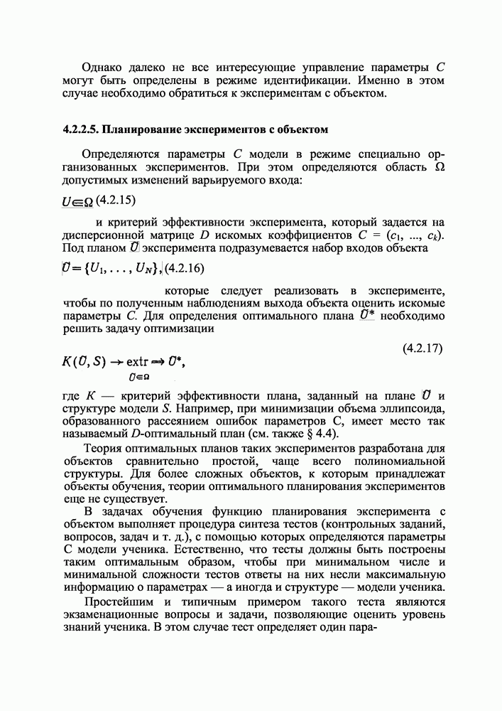 В задачах обучения функцию планирования эксперимента с объектом выполняет процедура синтеза тестов (контрольных заданий, вопросов, задач и т. д.), с помощью которых определяются параметры С модели ученика. Естественно, что тесты должны быть построены таким оптимальным образом, чтобы при минимальном числе и минимальной сложности тестов ответы на них несли максимальную информацию о параметрах — а иногда и структуре — модели ученика.