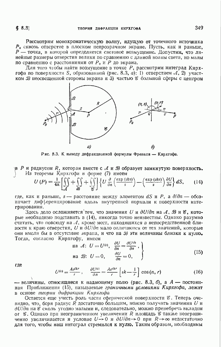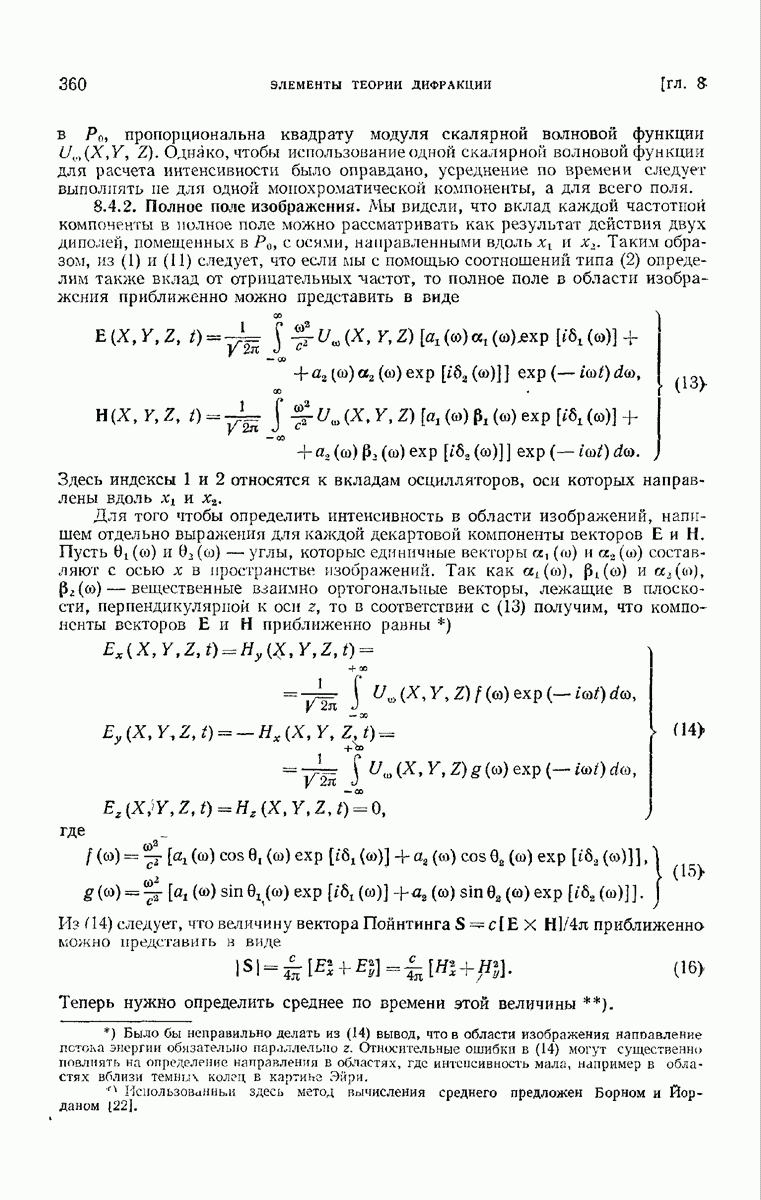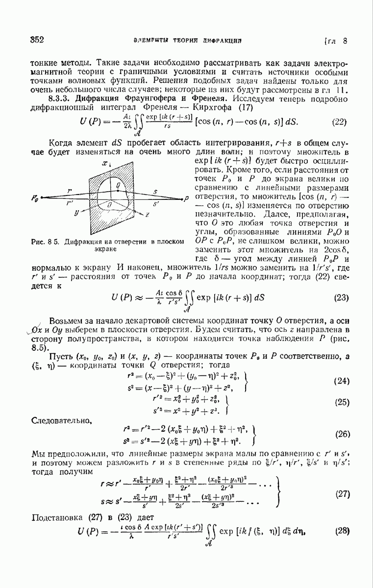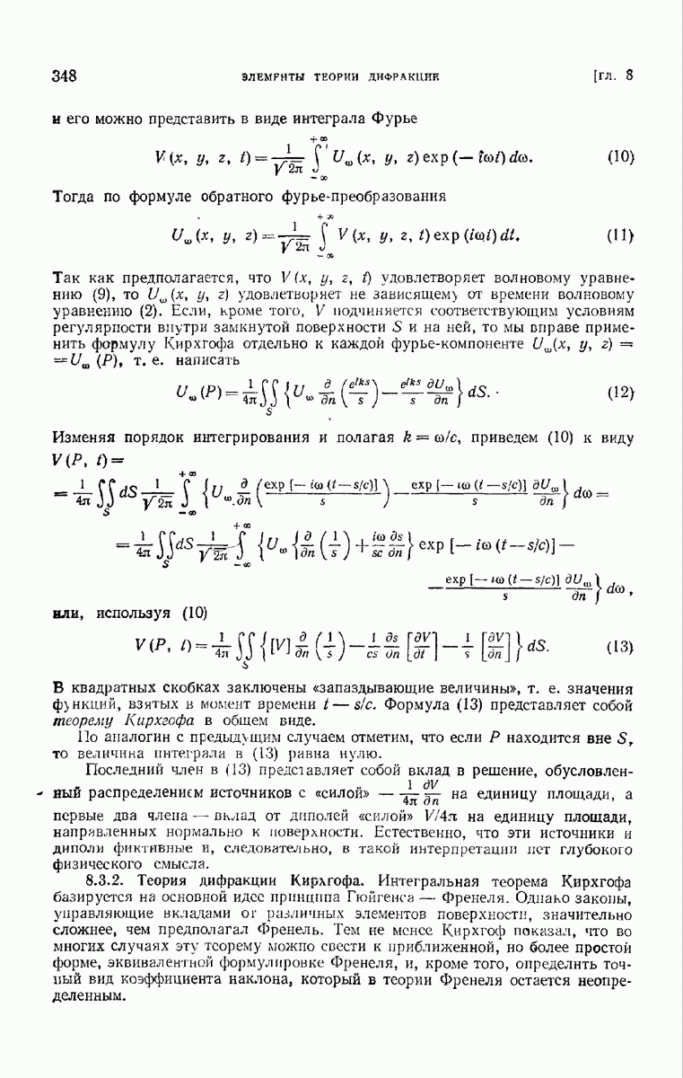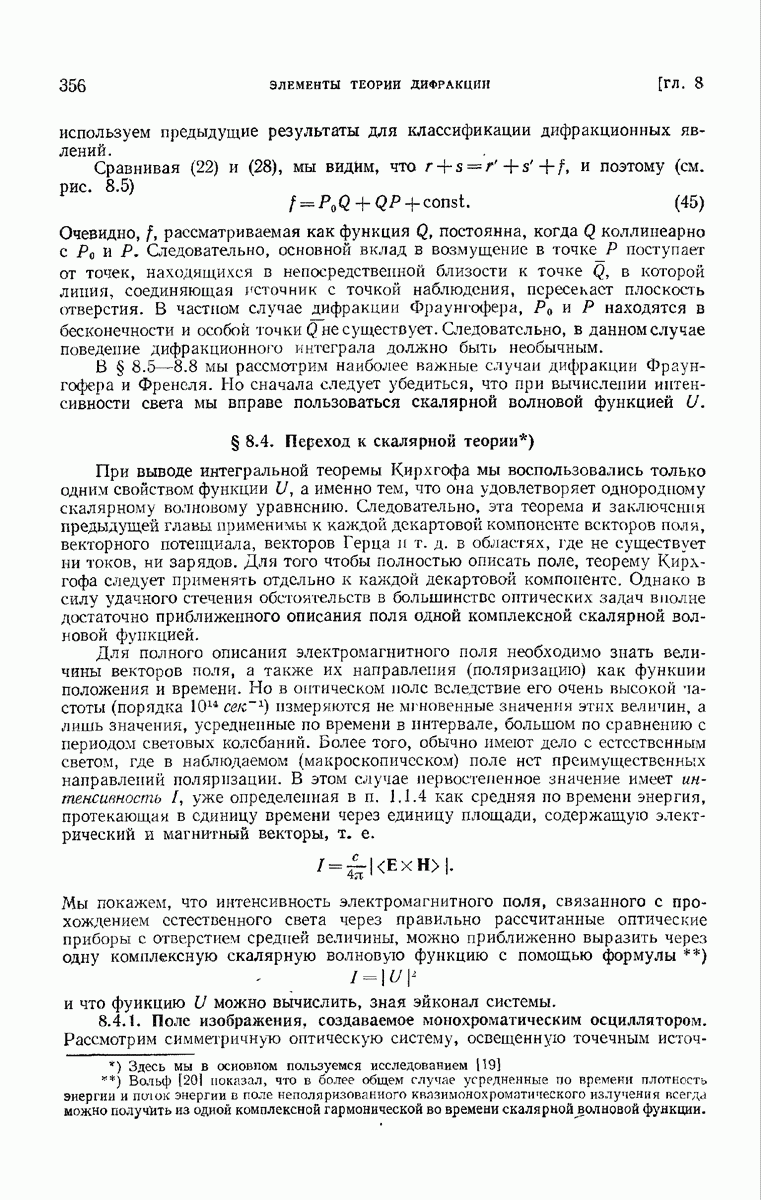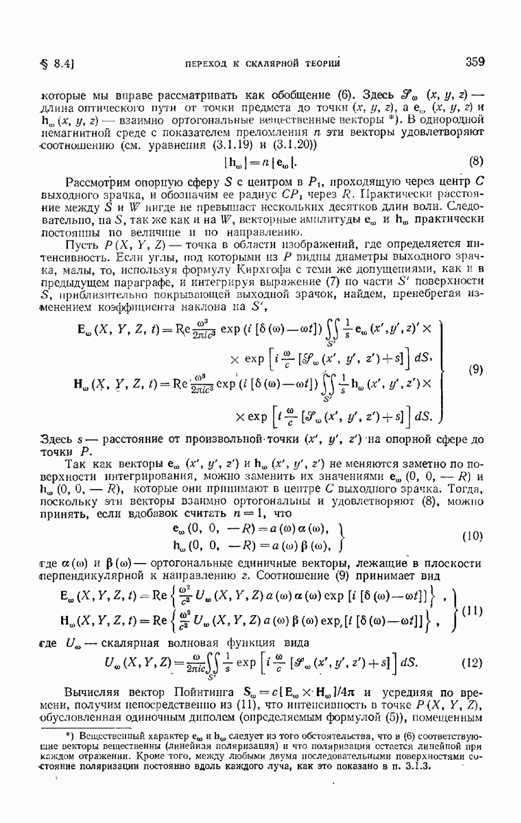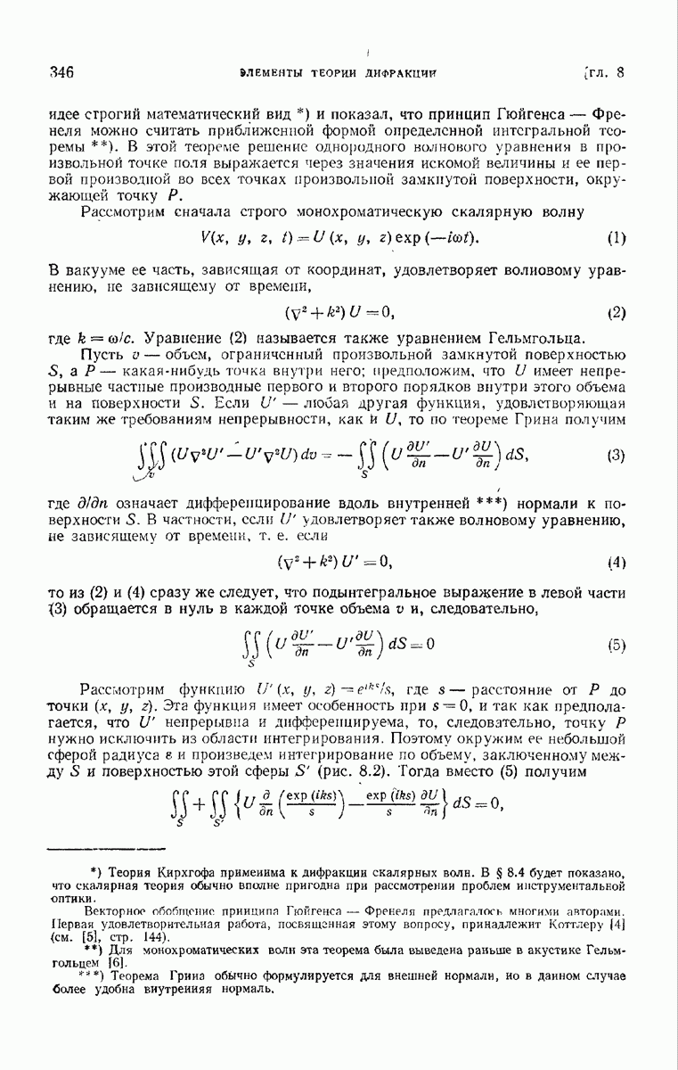 а именно тем, что она удовлетворяет однородному скалярному волновому уравнению. Следовательно, эта теорема и заключения предыдущей главы применимы к каждой декартовой компоненте векторов поля, векторного потенциала, векторов Герца и т. д. в областях, где не существует ни токов, ни зарядов. Для того чтобы полностью описать поле, теорему Кирхгофа следует применять отдельно к каждой декартовой компоненте. Однако в силу удачного стечения обстоятельств в большинстве оптических задач вполне достаточно приближенного описания поля одной комплексной скалярной волновой функцией.