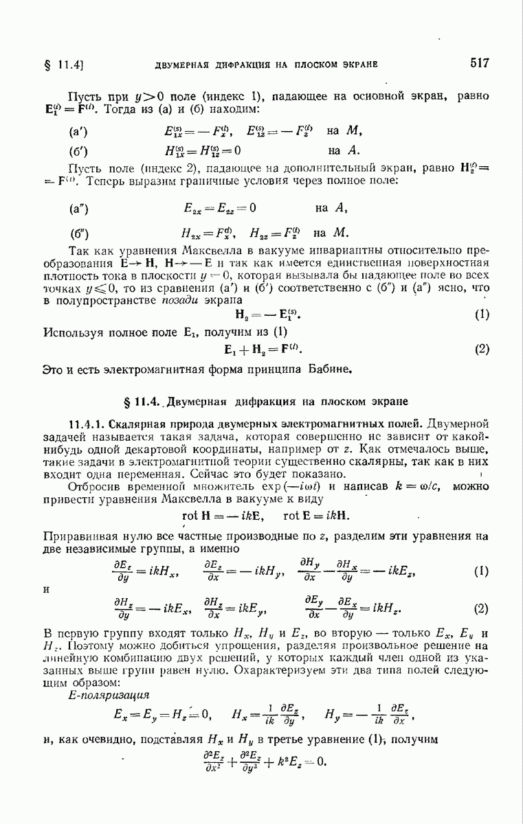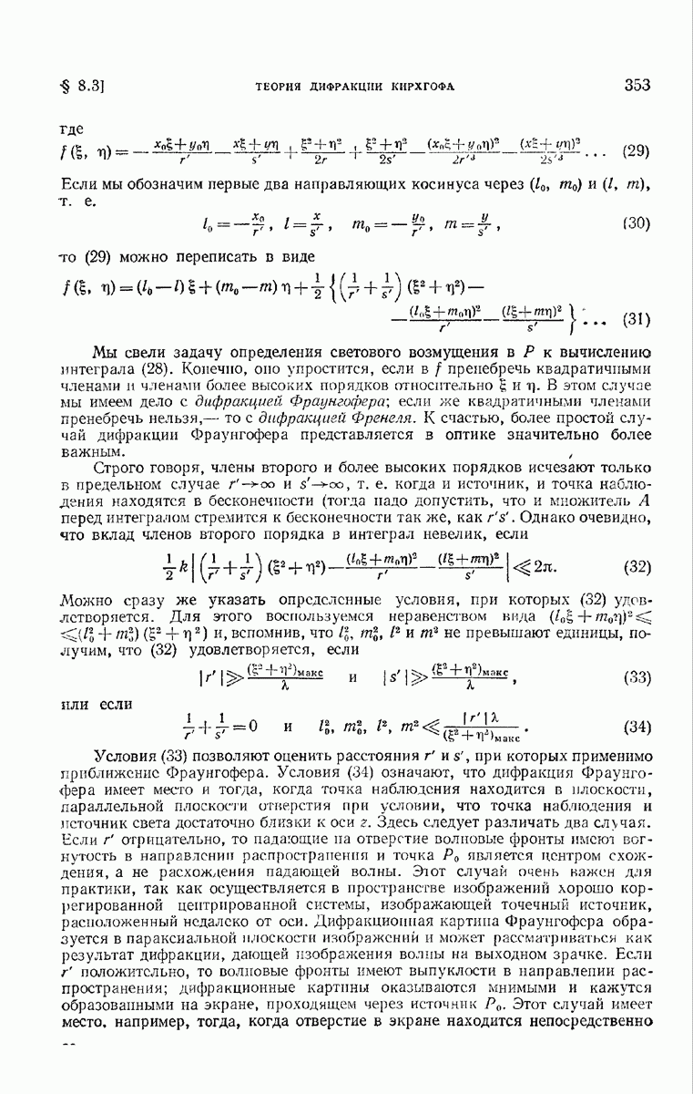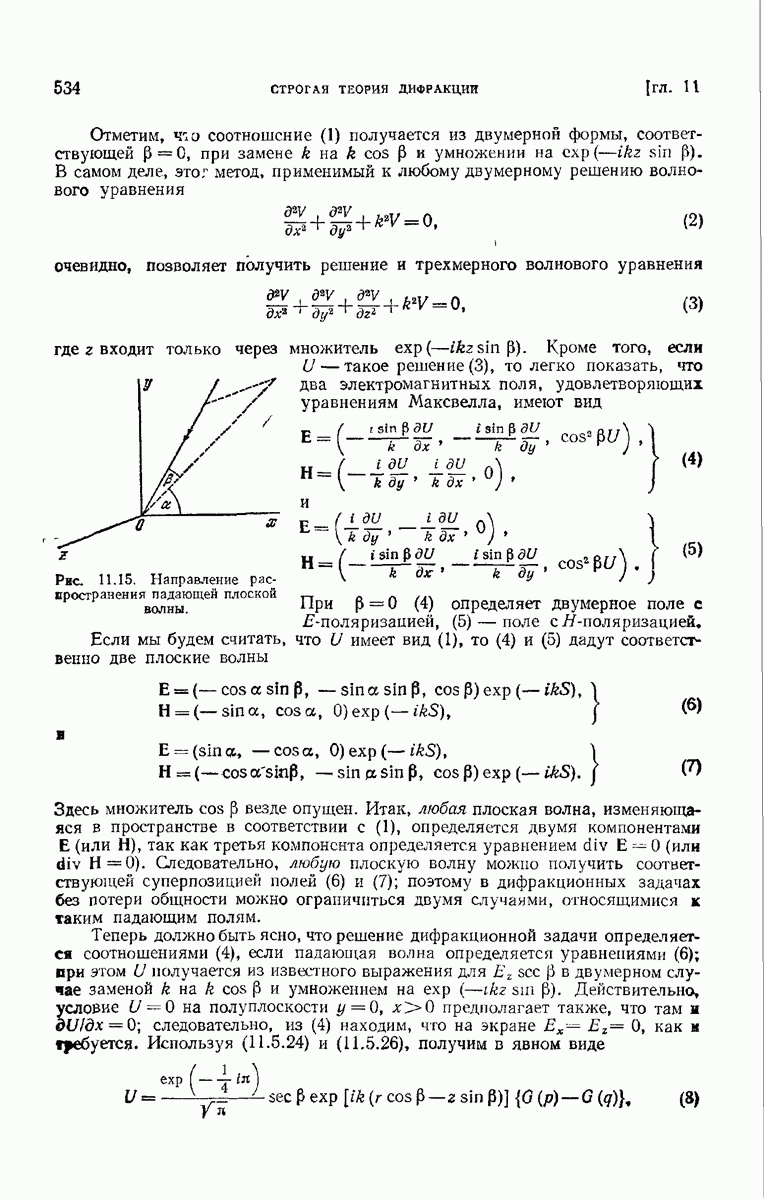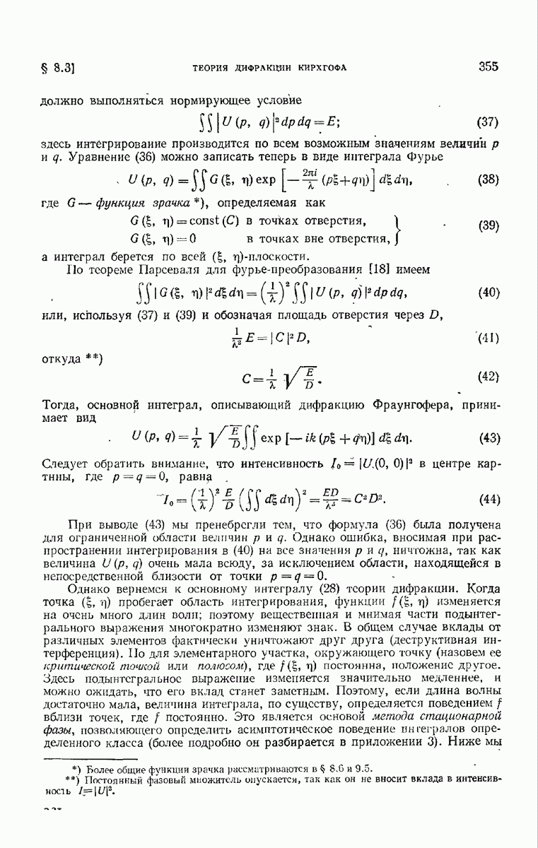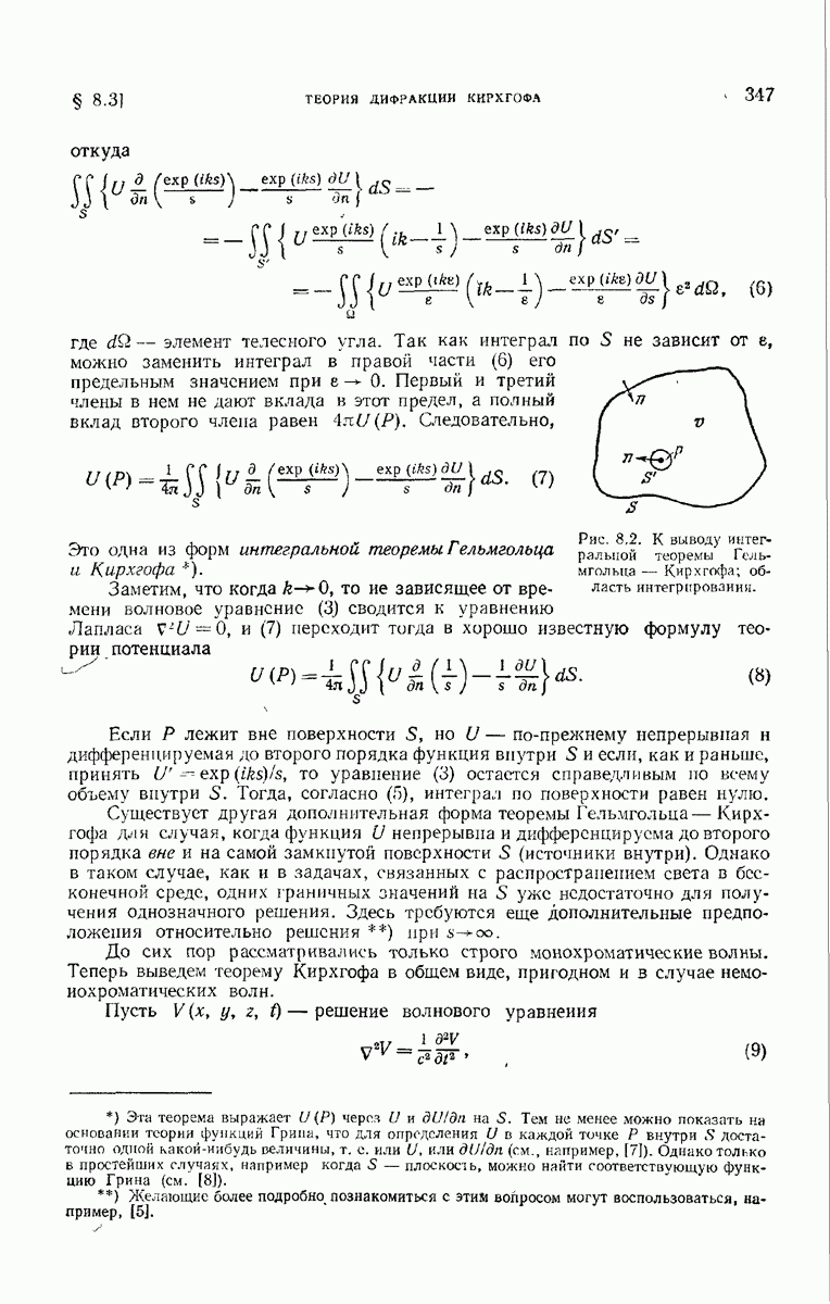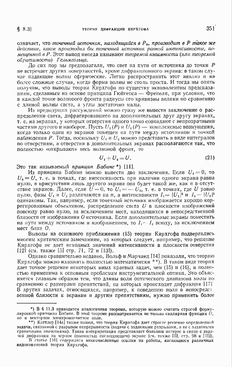 а именно тем, что она удовлетворяет однородному скалярному волновому уравнению. Следовательно, эта теорема и заключения предыдущей главы применимы к каждой декартовой компоненте векторов поля, векторного потенциала, векторов Герца и т. д. в областях, где не существует ни токов, ни зарядов. Для того чтобы полностью описать поле, теорему Кирхгофа следует применять отдельно к каждой декартовой компоненте. Однако в силу удачного стечения обстоятельств в большинстве оптических задач вполне достаточно приближенного описания поля одной комплексной скалярной волновой функцией.