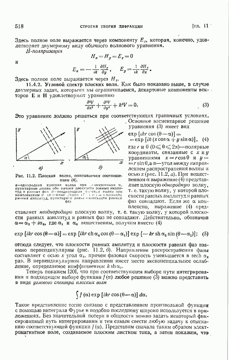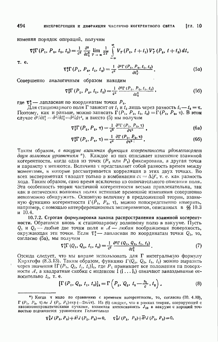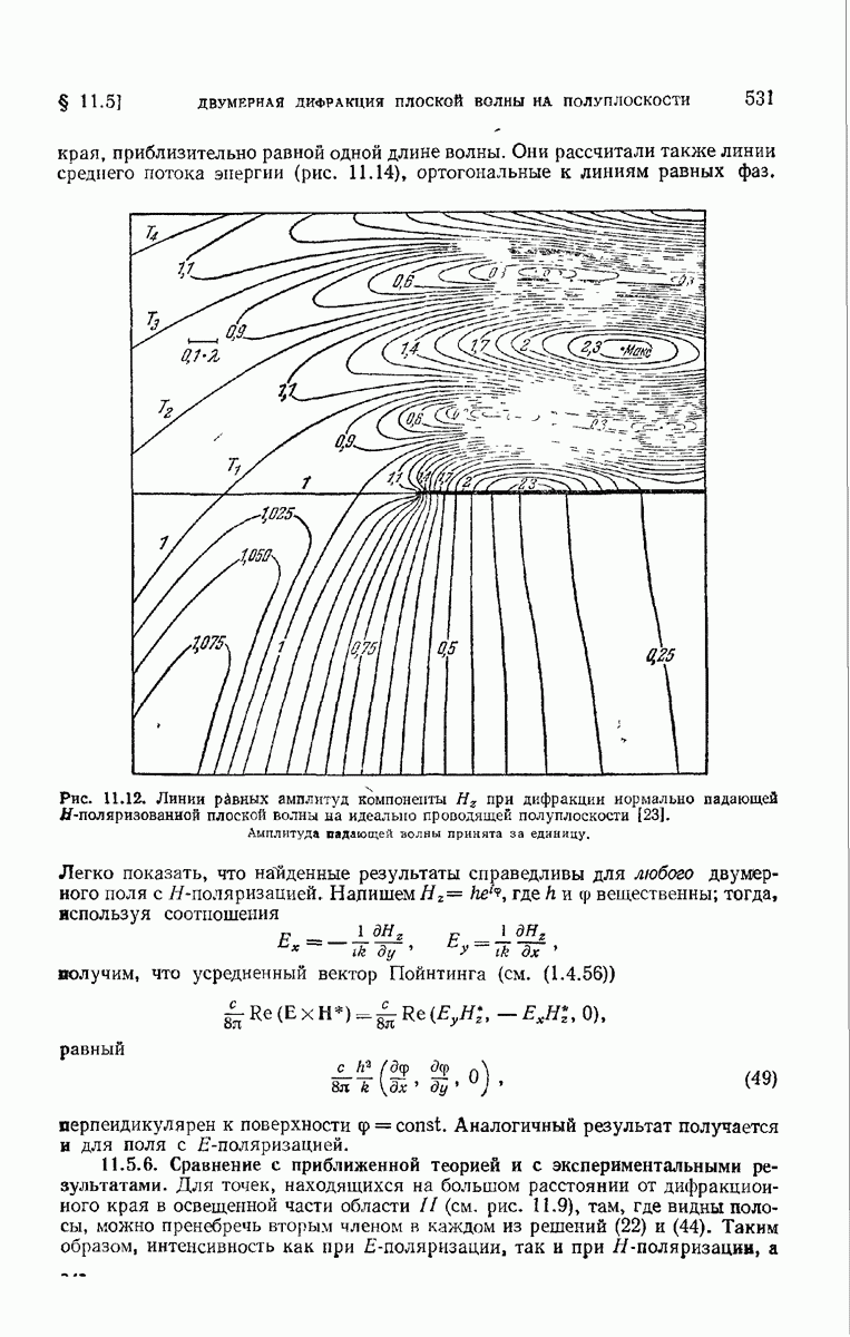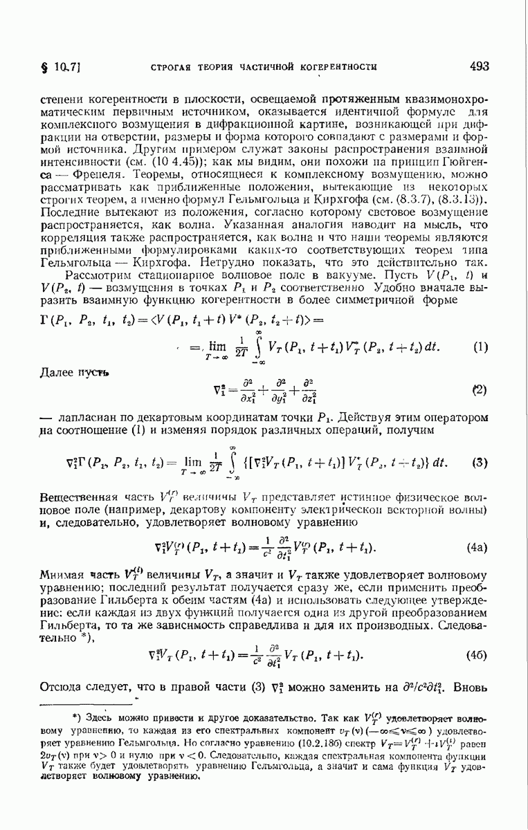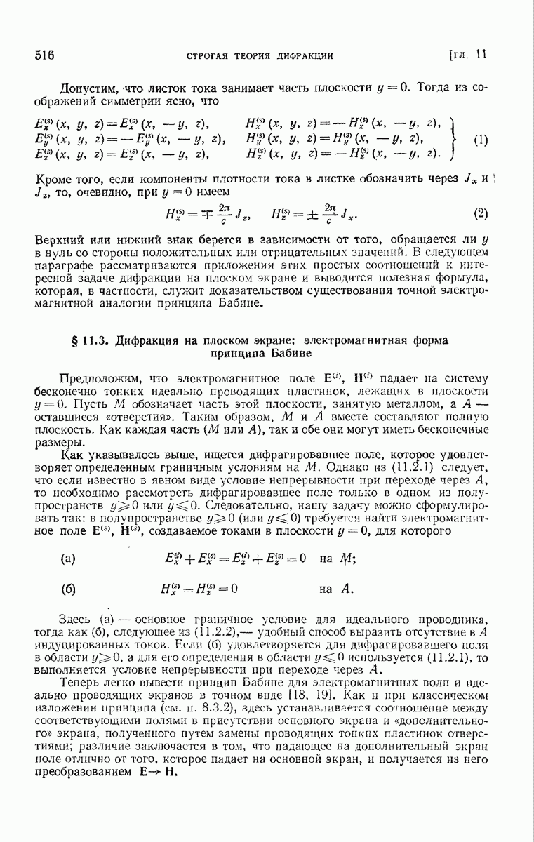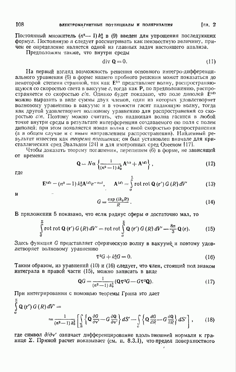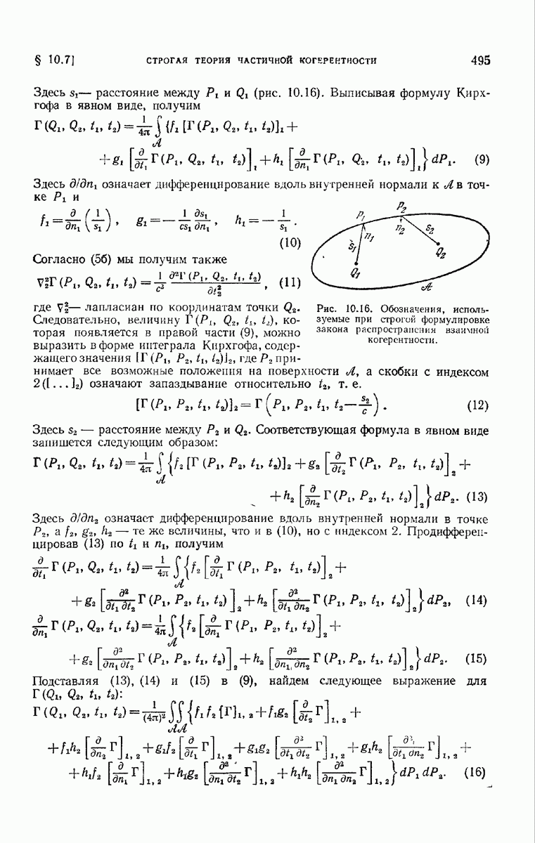 а именно тем, что она удовлетворяет однородному скалярному волновому уравнению. Следовательно, эта теорема и заключения предыдущей главы применимы к каждой декартовой компоненте векторов поля, векторного потенциала, векторов Герца и т. д. в областях, где не существует ни токов, ни зарядов. Для того чтобы полностью описать поле, теорему Кирхгофа следует применять отдельно к каждой декартовой компоненте. Однако в силу удачного стечения обстоятельств в большинстве оптических задач вполне достаточно приближенного описания поля одной комплексной скалярной волновой функцией.