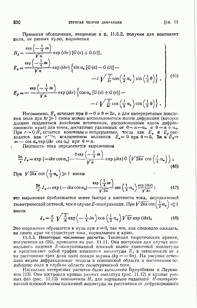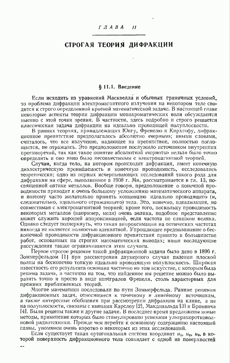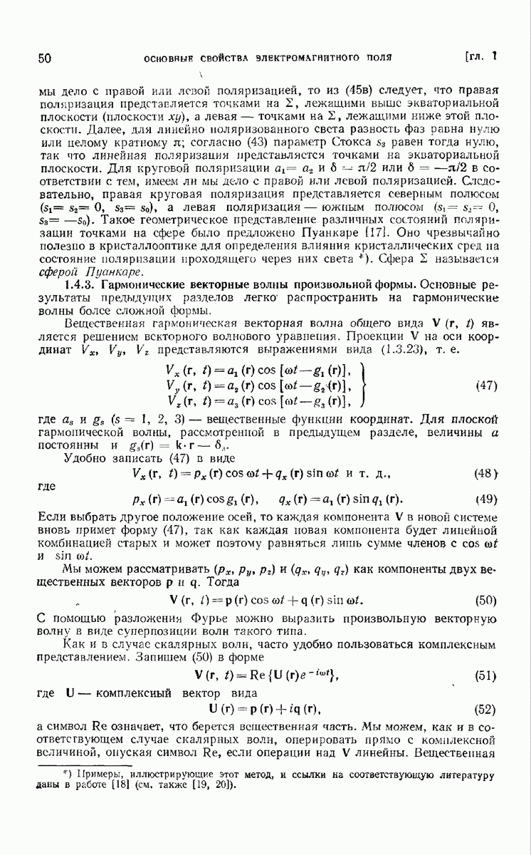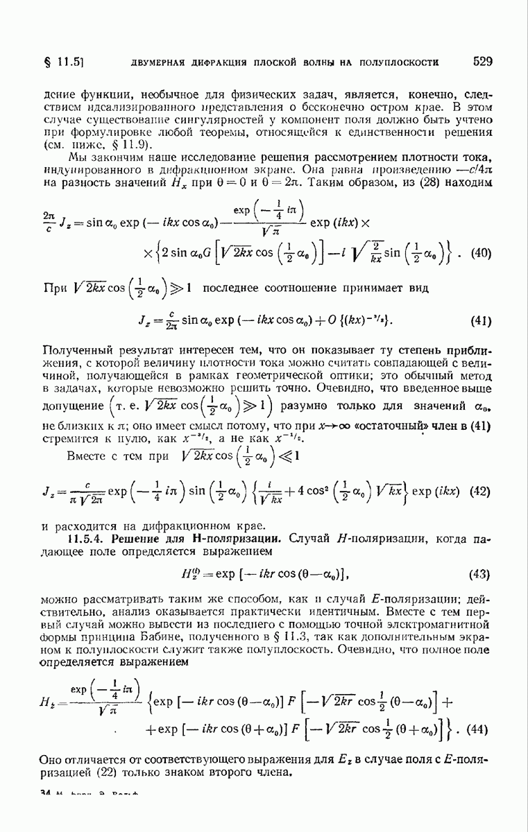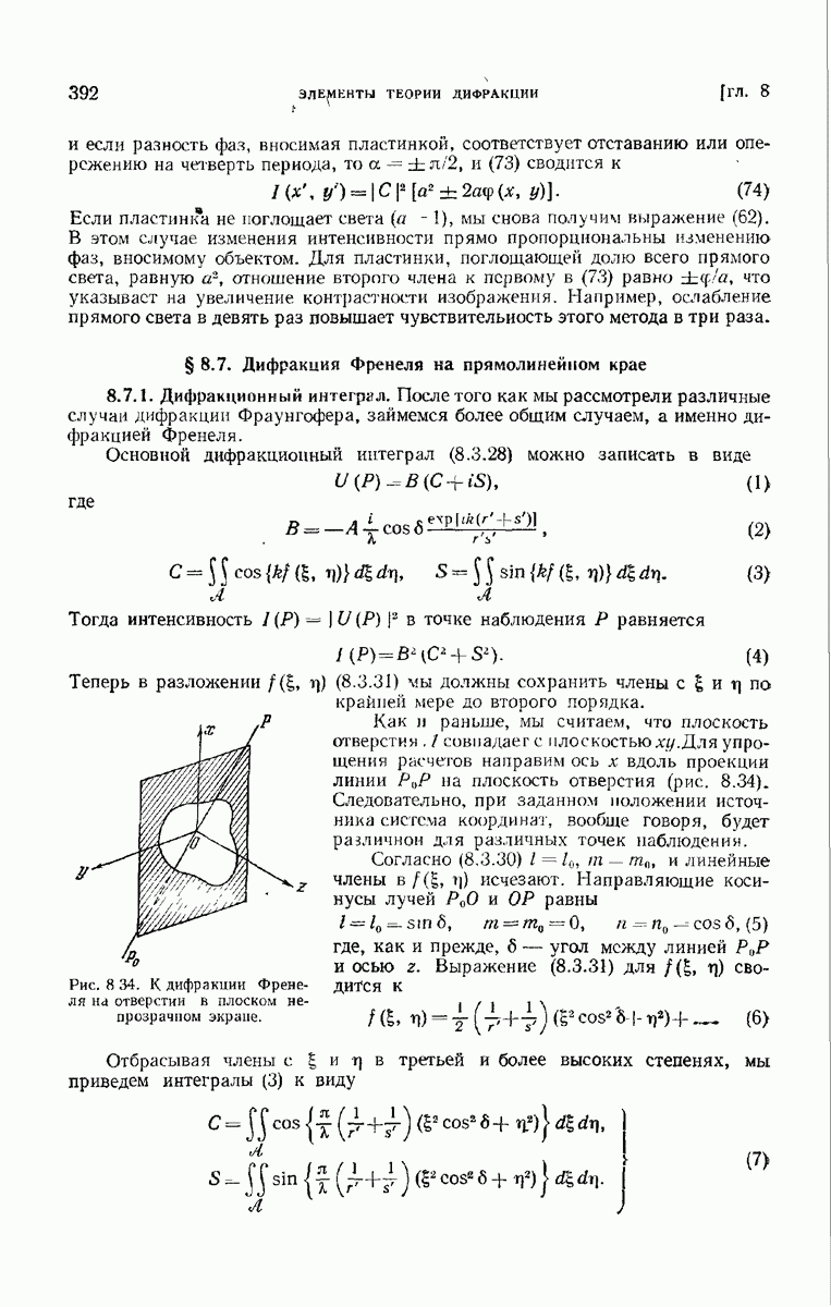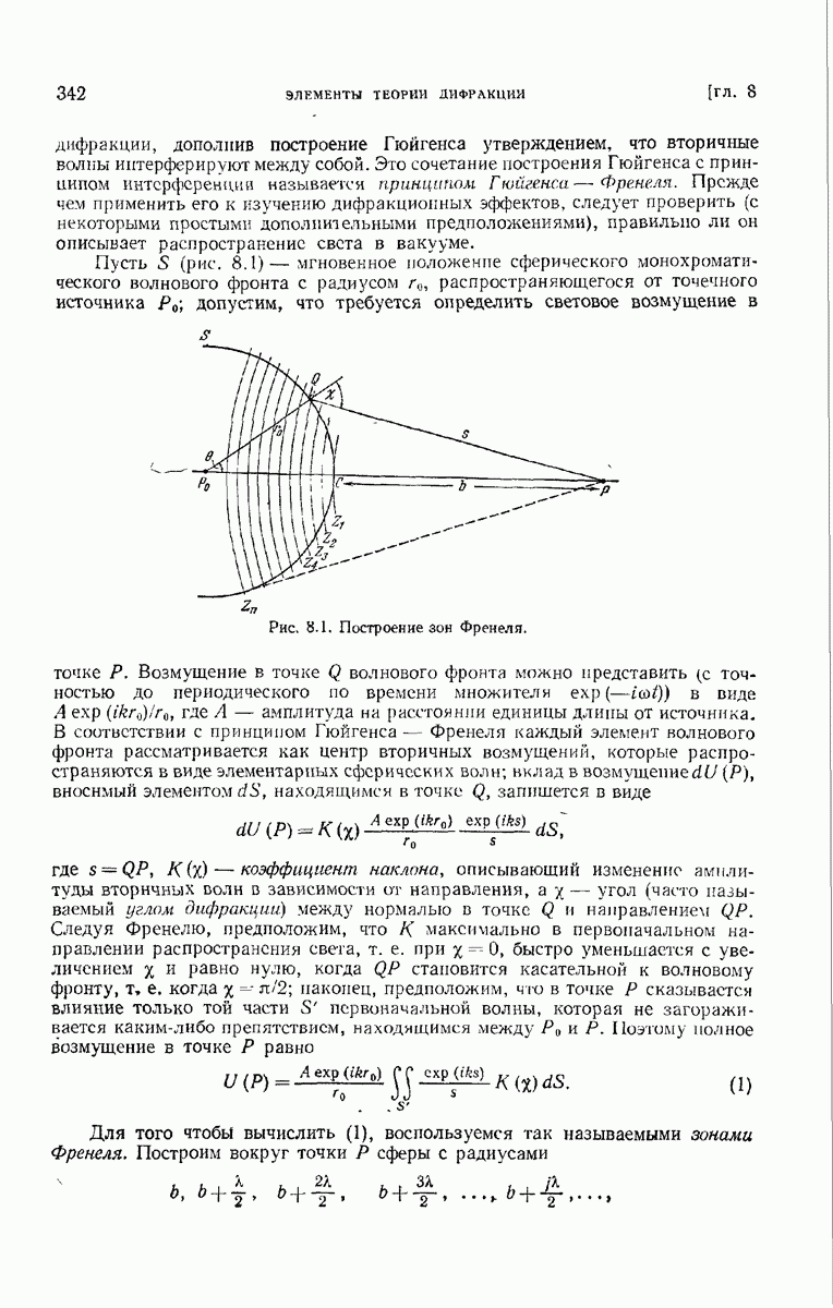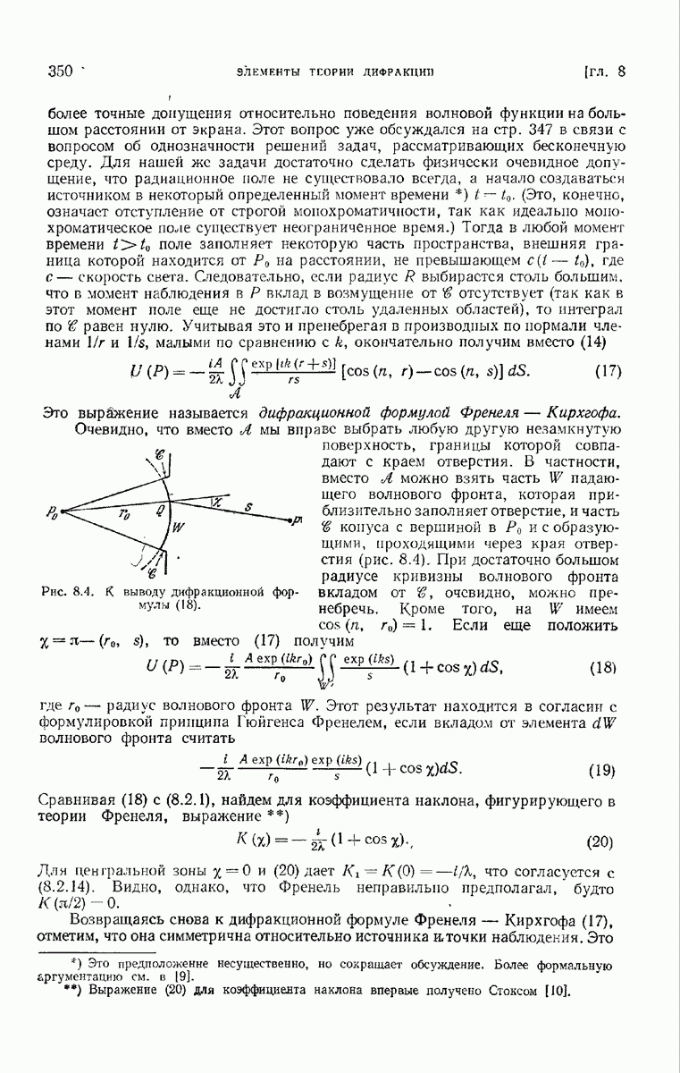 а именно тем, что она удовлетворяет однородному скалярному волновому уравнению. Следовательно, эта теорема и заключения предыдущей главы применимы к каждой декартовой компоненте векторов поля, векторного потенциала, векторов Герца и т. д. в областях, где не существует ни токов, ни зарядов. Для того чтобы полностью описать поле, теорему Кирхгофа следует применять отдельно к каждой декартовой компоненте. Однако в силу удачного стечения обстоятельств в большинстве оптических задач вполне достаточно приближенного описания поля одной комплексной скалярной волновой функцией.