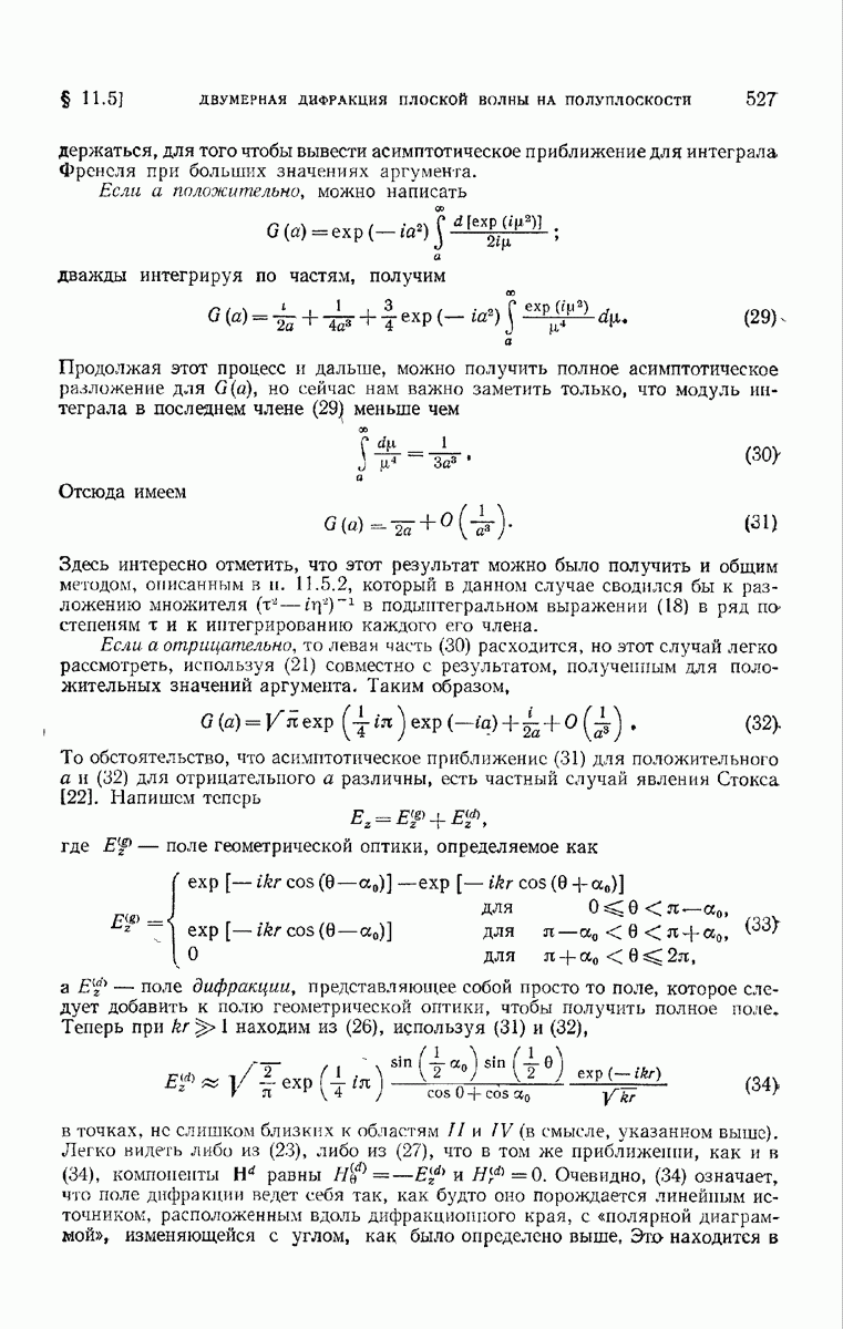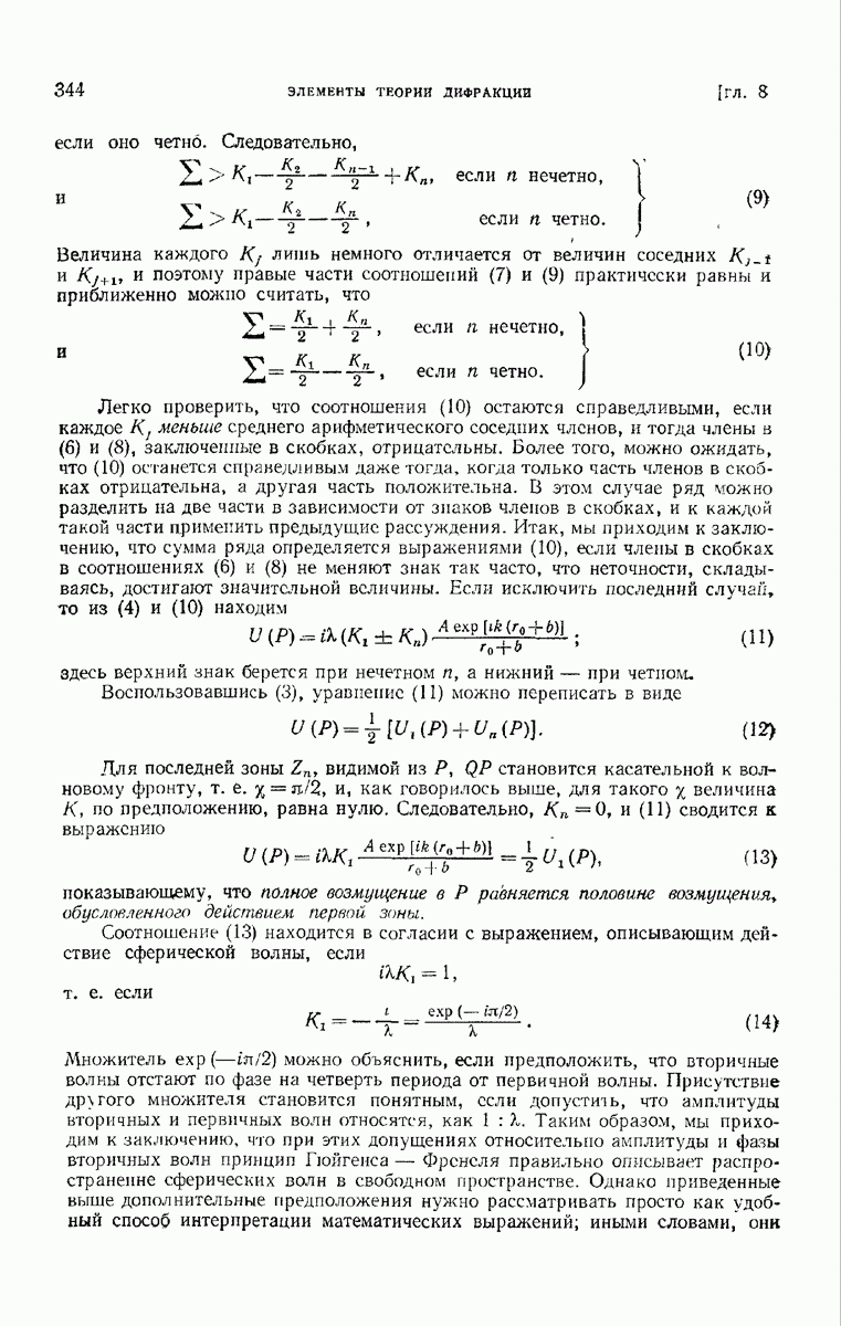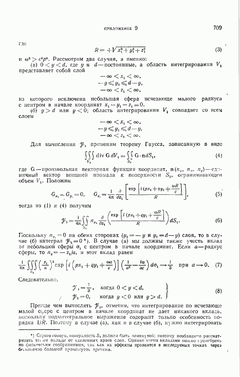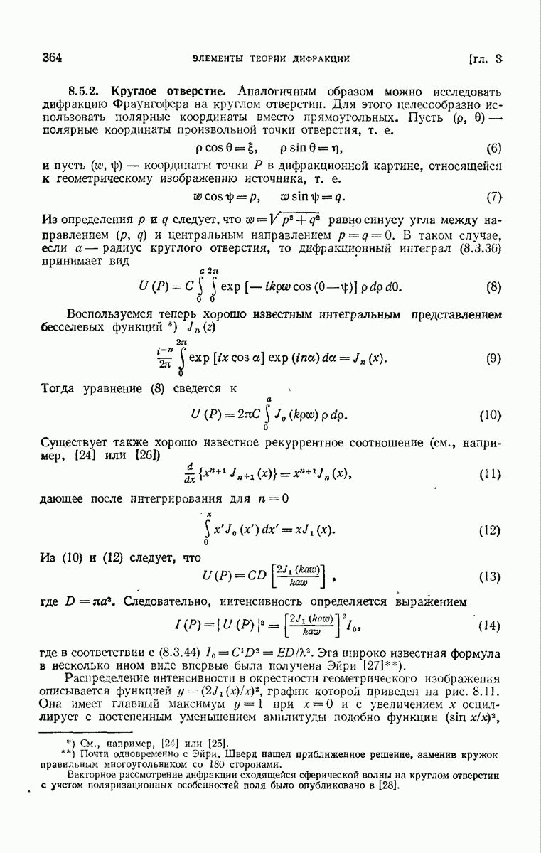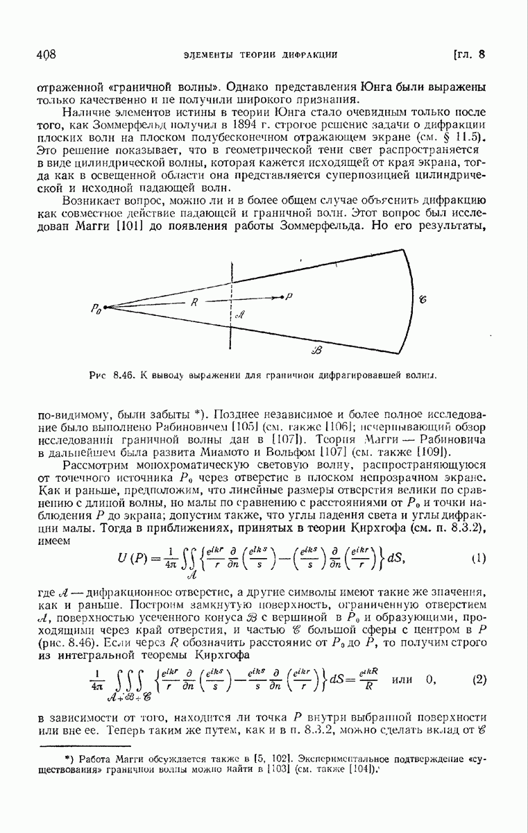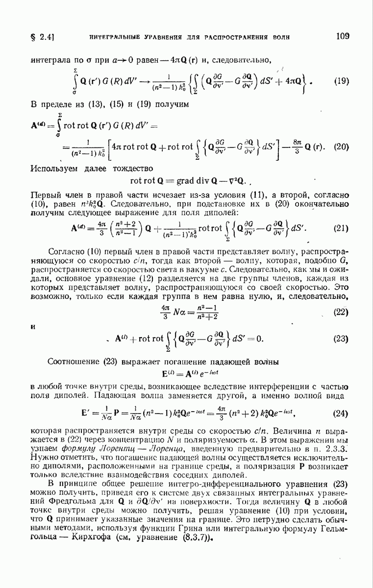 а именно тем, что она удовлетворяет однородному скалярному волновому уравнению. Следовательно, эта теорема и заключения предыдущей главы применимы к каждой декартовой компоненте векторов поля, векторного потенциала, векторов Герца и т. д. в областях, где не существует ни токов, ни зарядов. Для того чтобы полностью описать поле, теорему Кирхгофа следует применять отдельно к каждой декартовой компоненте. Однако в силу удачного стечения обстоятельств в большинстве оптических задач вполне достаточно приближенного описания поля одной комплексной скалярной волновой функцией.
