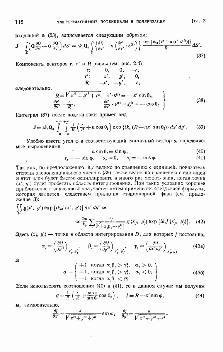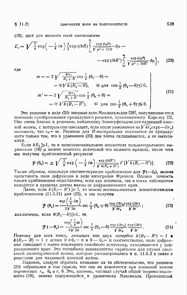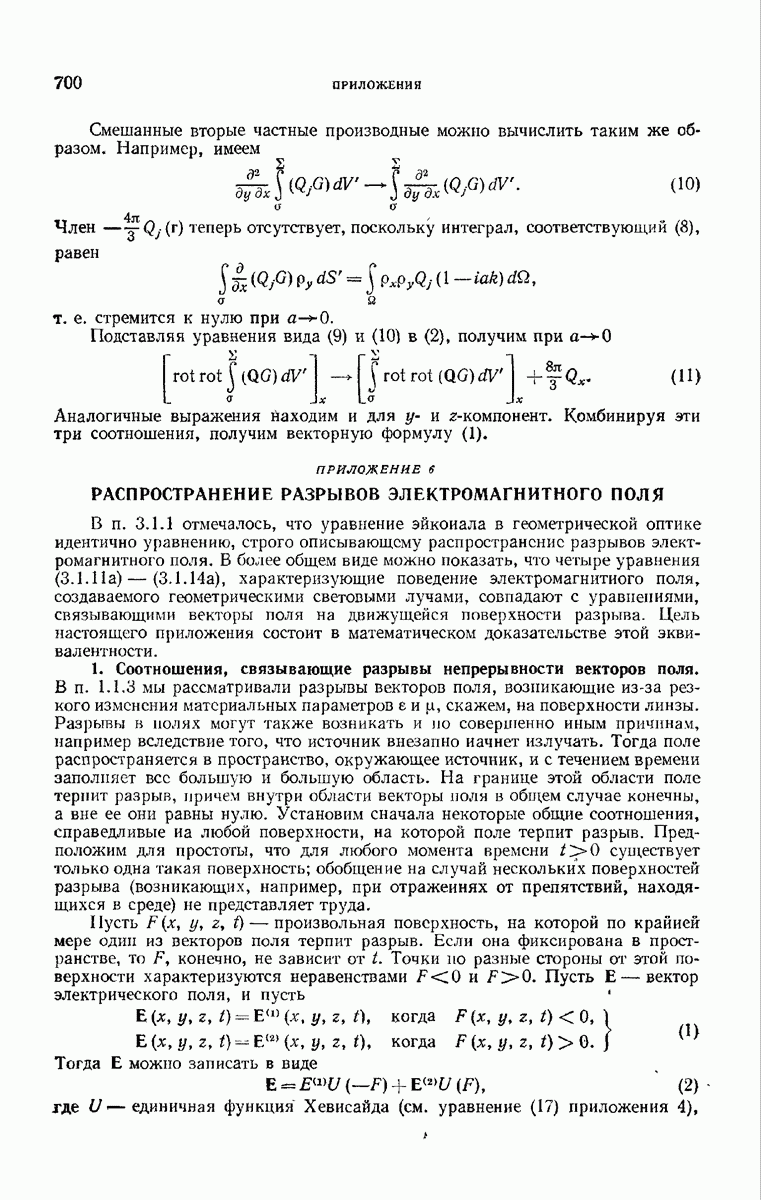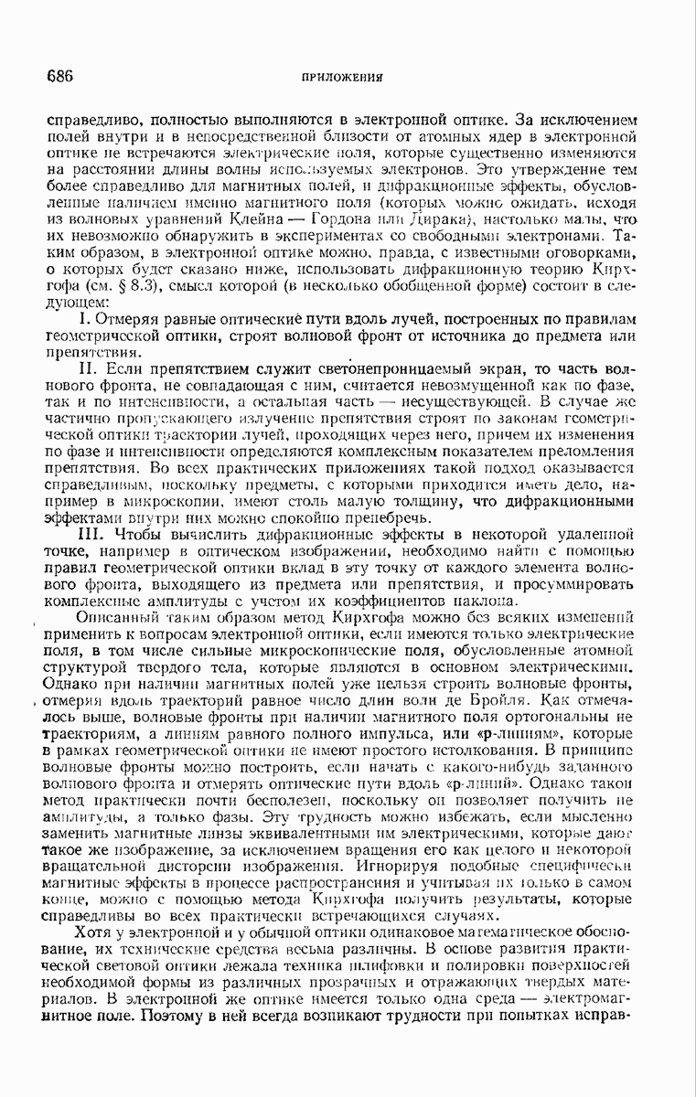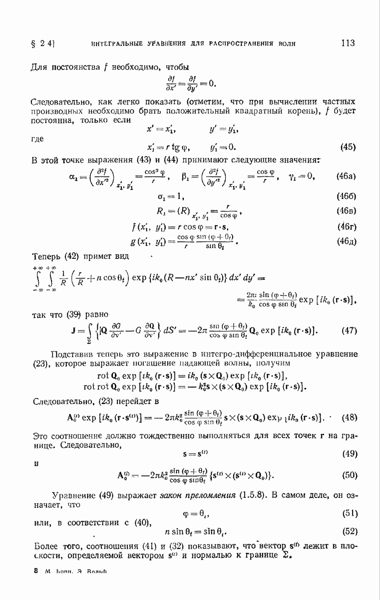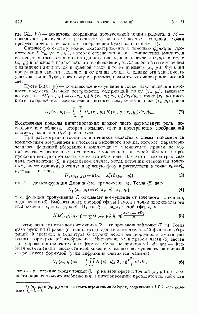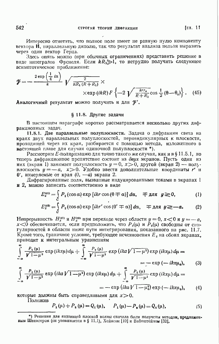 а именно тем, что она удовлетворяет однородному скалярному волновому уравнению. Следовательно, эта теорема и заключения предыдущей главы применимы к каждой декартовой компоненте векторов поля, векторного потенциала, векторов Герца и т. д. в областях, где не существует ни токов, ни зарядов. Для того чтобы полностью описать поле, теорему Кирхгофа следует применять отдельно к каждой декартовой компоненте. Однако в силу удачного стечения обстоятельств в большинстве оптических задач вполне достаточно приближенного описания поля одной комплексной скалярной волновой функцией.