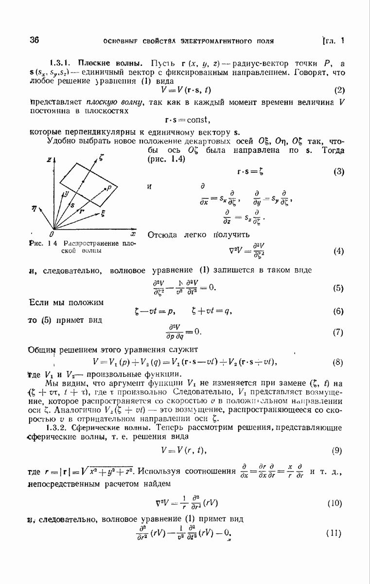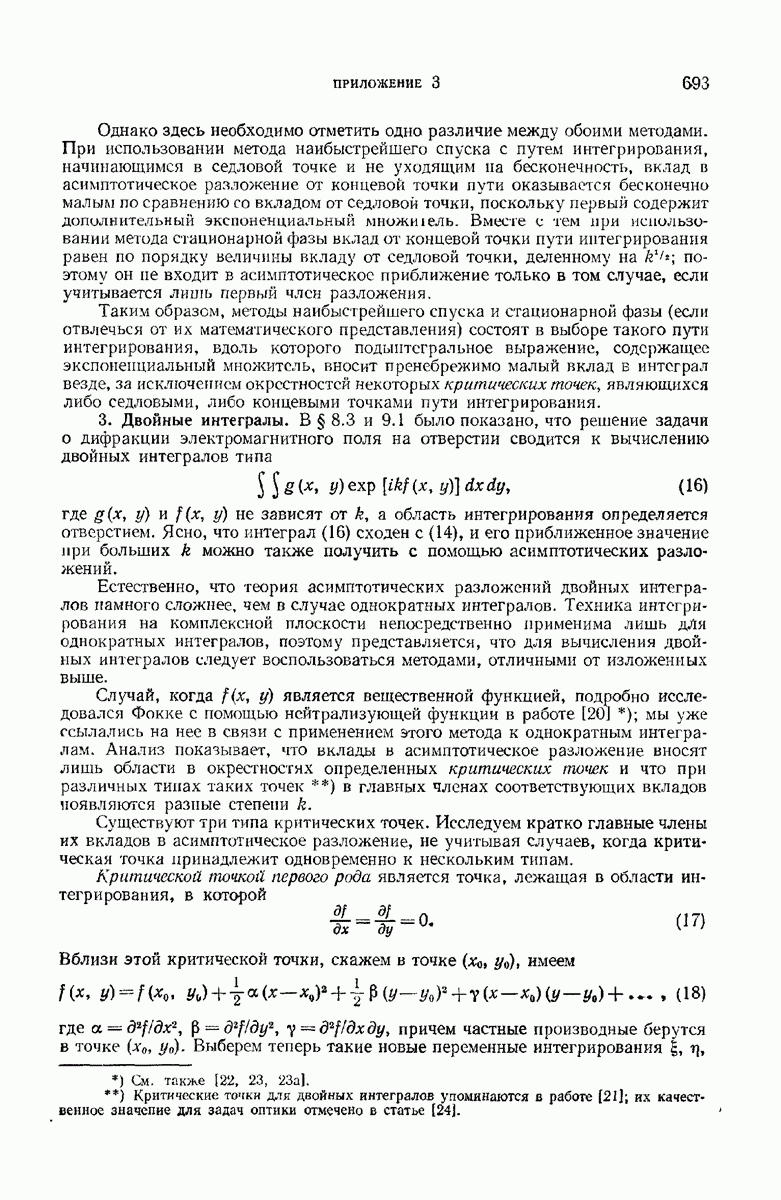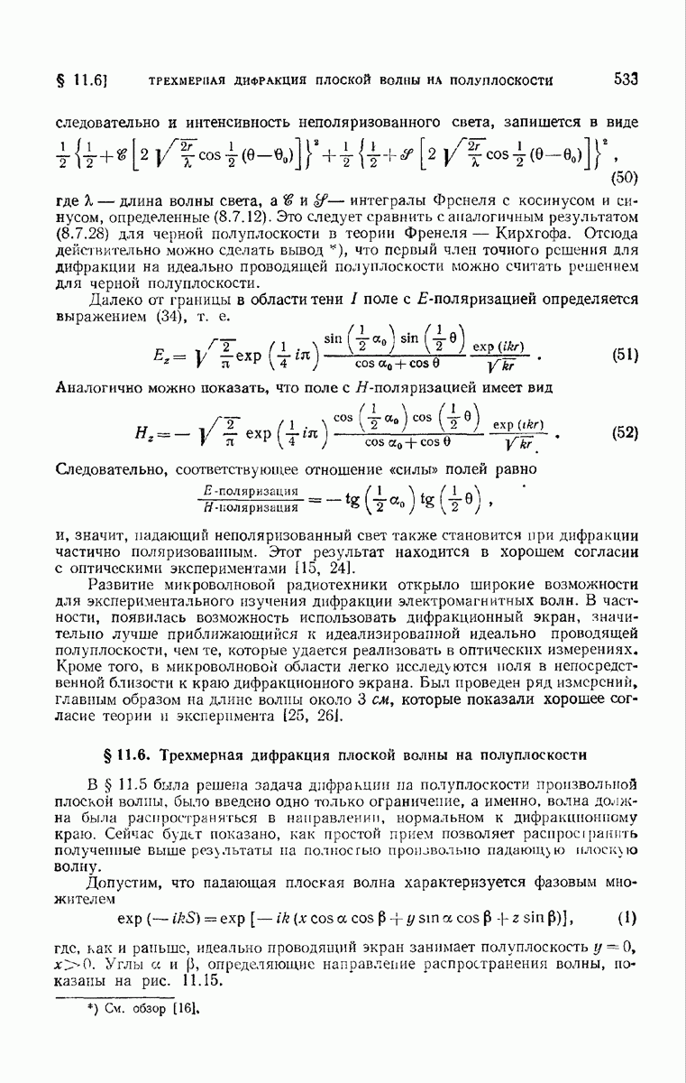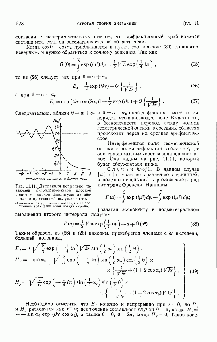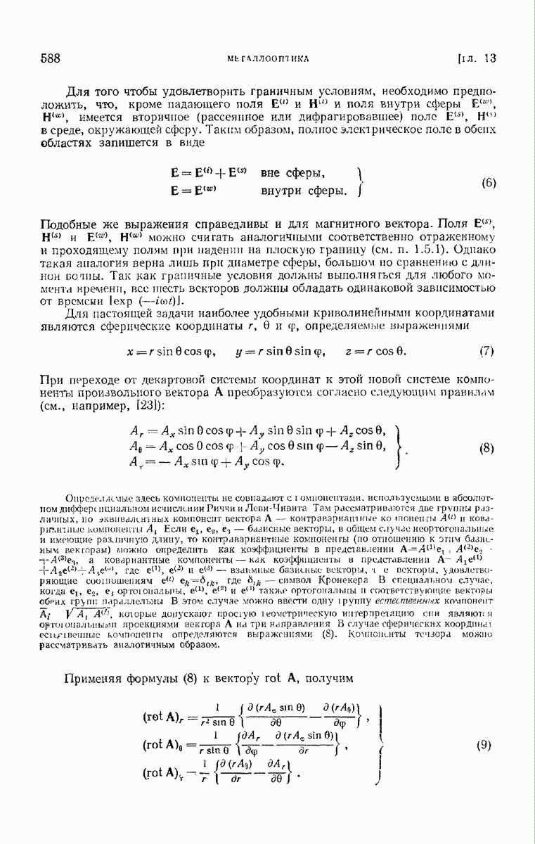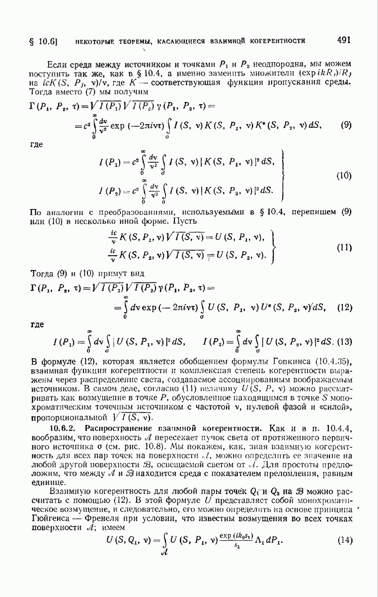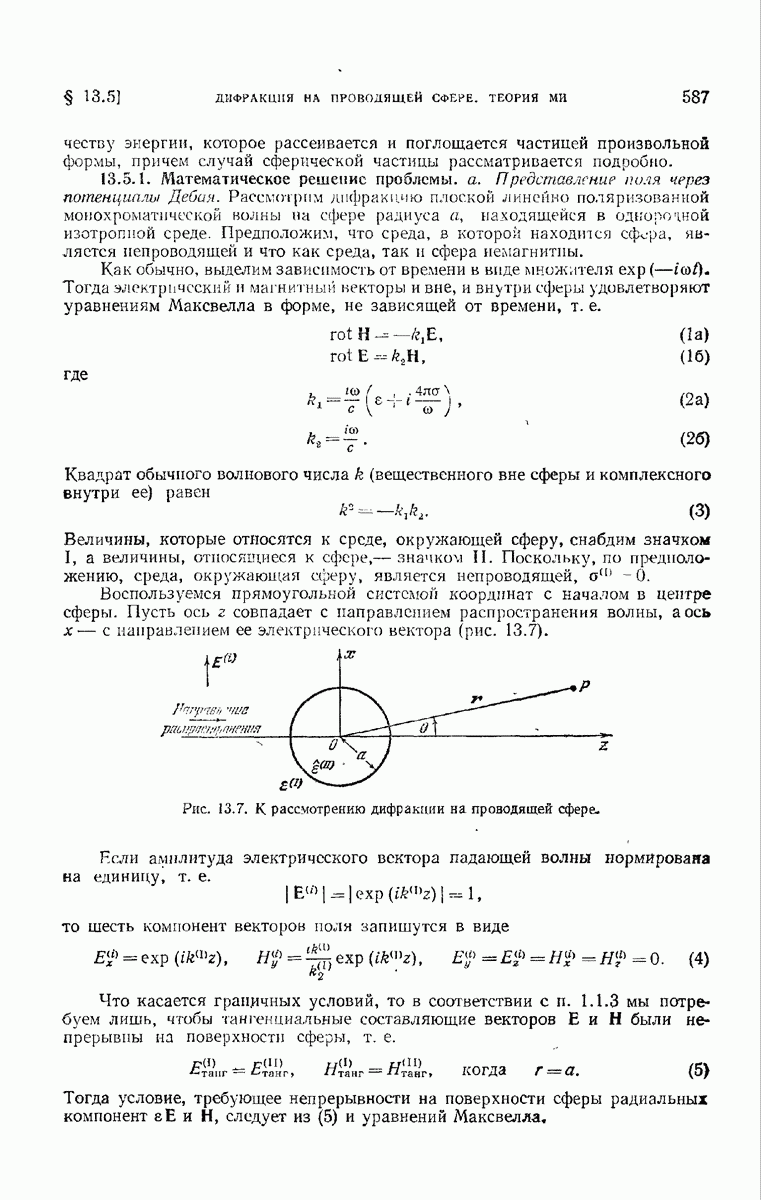 а именно тем, что она удовлетворяет однородному скалярному волновому уравнению. Следовательно, эта теорема и заключения предыдущей главы применимы к каждой декартовой компоненте векторов поля, векторного потенциала, векторов Герца и т. д. в областях, где не существует ни токов, ни зарядов. Для того чтобы полностью описать поле, теорему Кирхгофа следует применять отдельно к каждой декартовой компоненте. Однако в силу удачного стечения обстоятельств в большинстве оптических задач вполне достаточно приближенного описания поля одной комплексной скалярной волновой функцией.