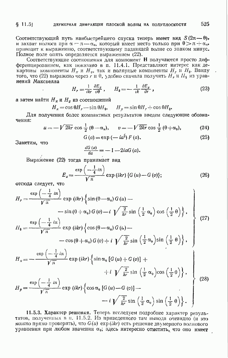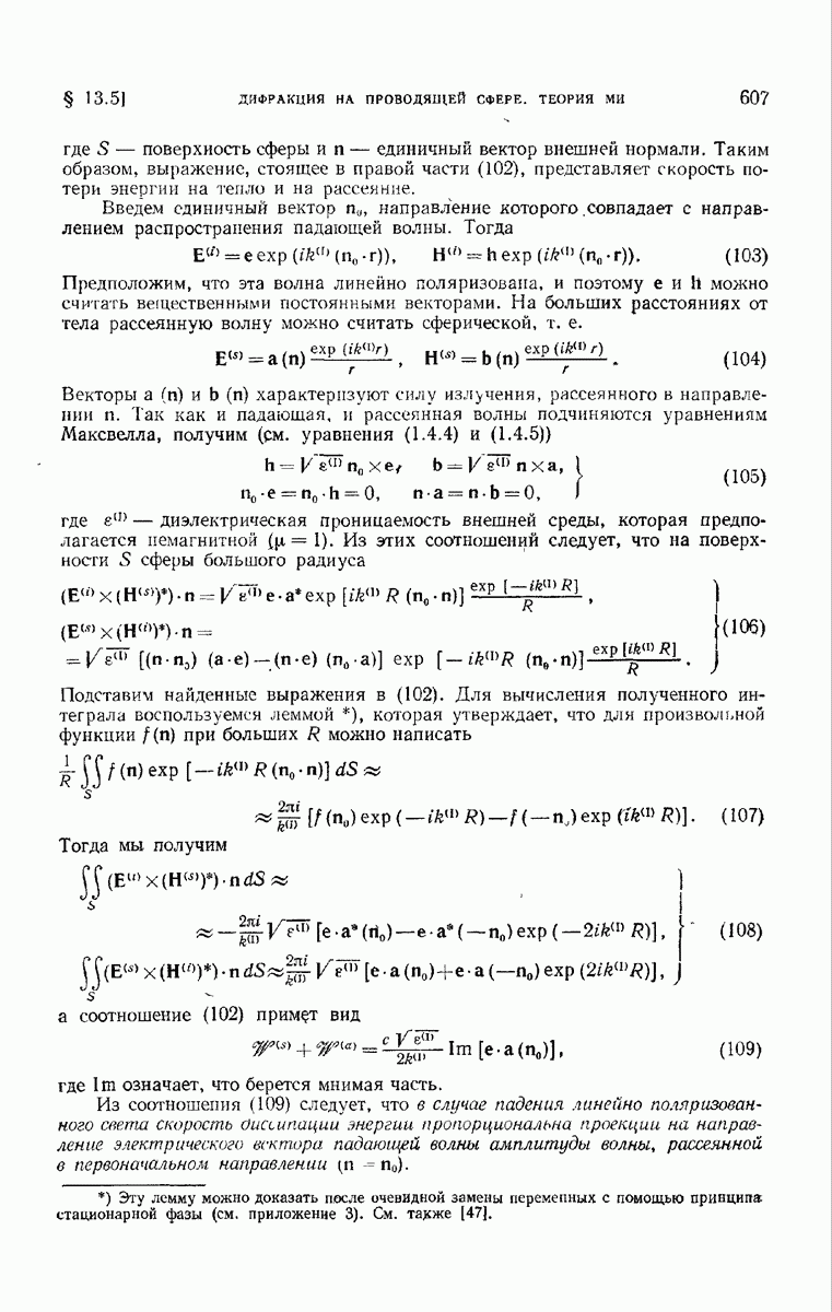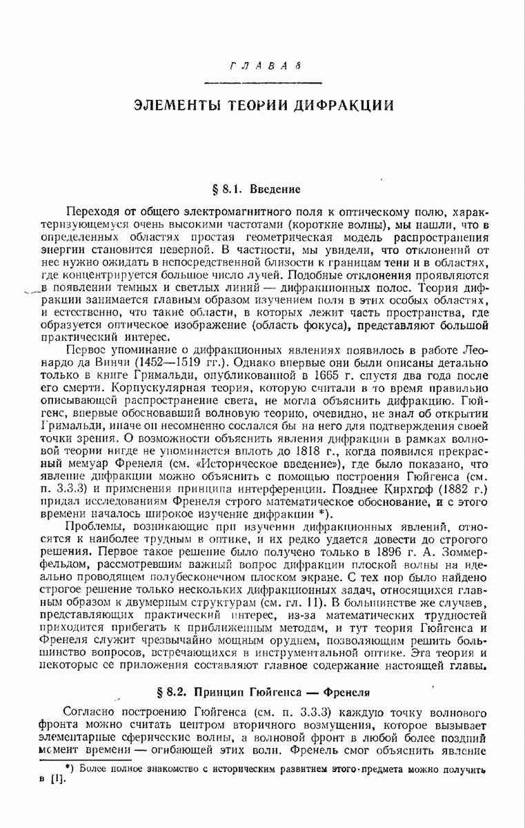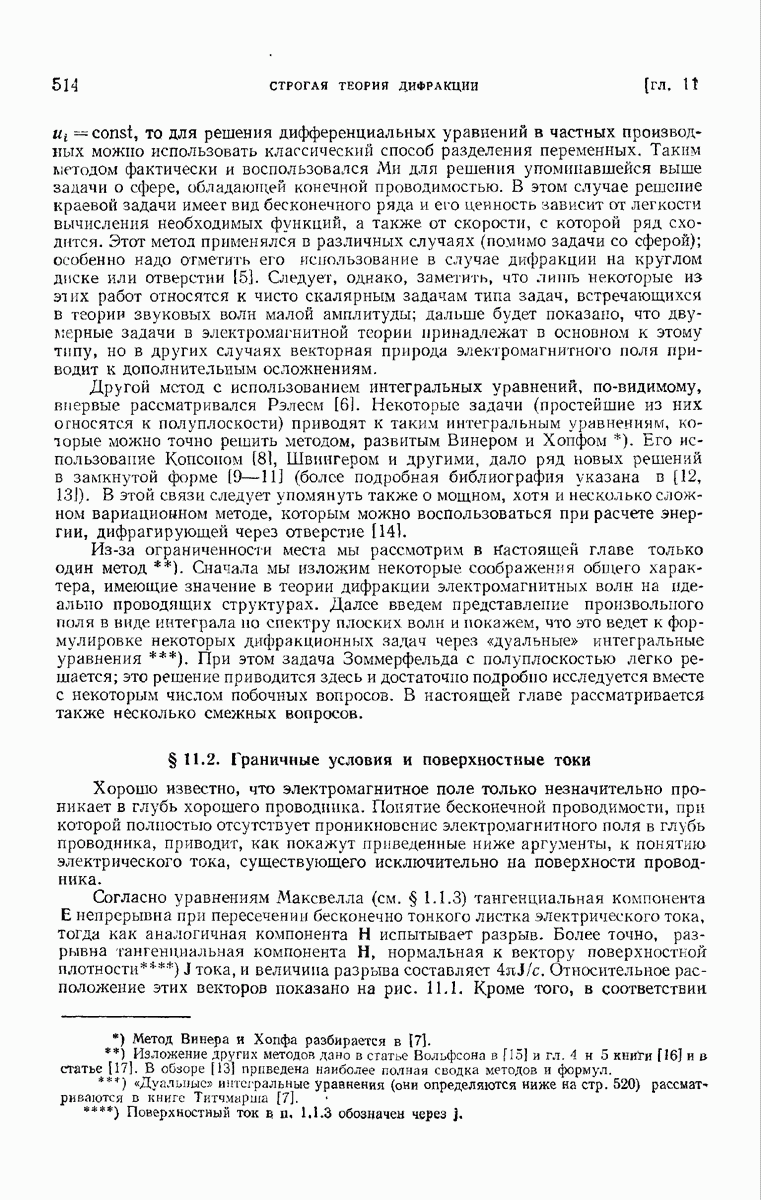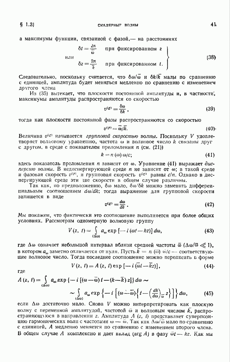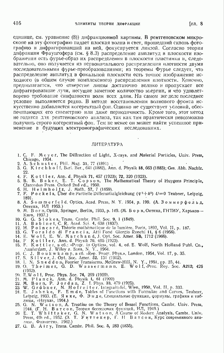 а именно тем, что она удовлетворяет однородному скалярному волновому уравнению. Следовательно, эта теорема и заключения предыдущей главы применимы к каждой декартовой компоненте векторов поля, векторного потенциала, векторов Герца и т. д. в областях, где не существует ни токов, ни зарядов. Для того чтобы полностью описать поле, теорему Кирхгофа следует применять отдельно к каждой декартовой компоненте. Однако в силу удачного стечения обстоятельств в большинстве оптических задач вполне достаточно приближенного описания поля одной комплексной скалярной волновой функцией.