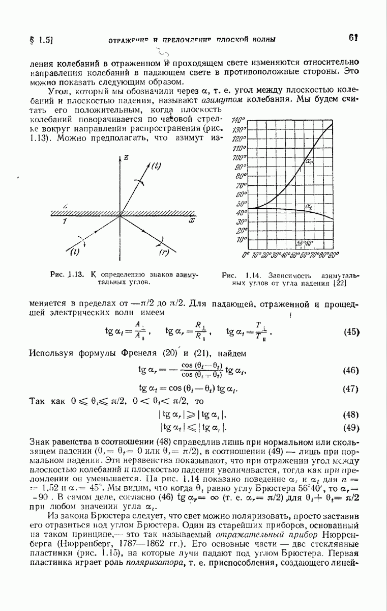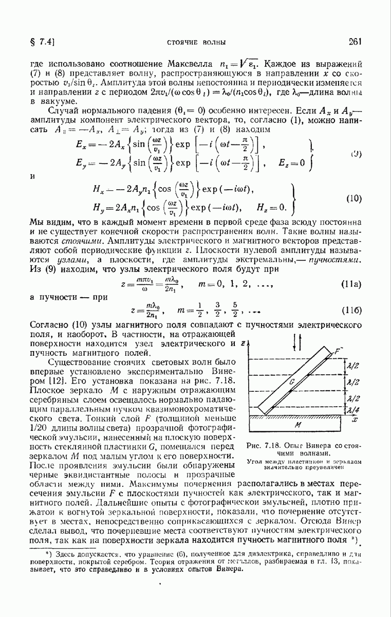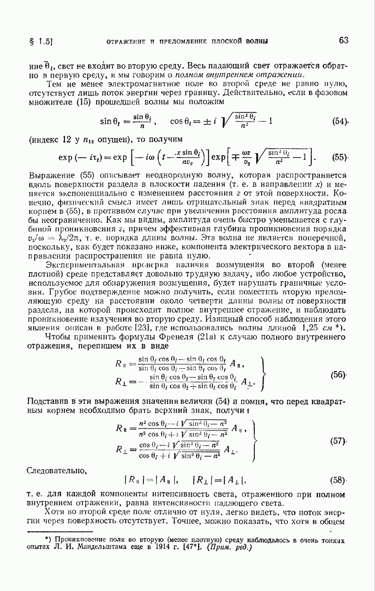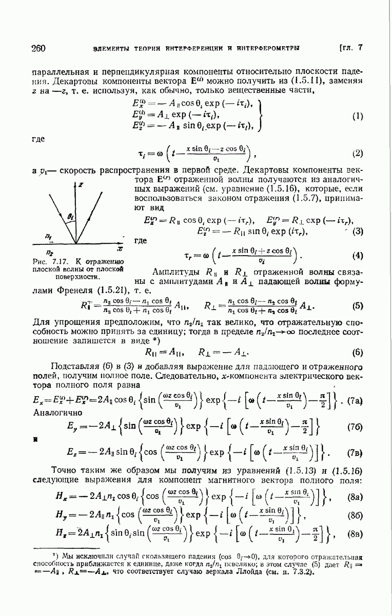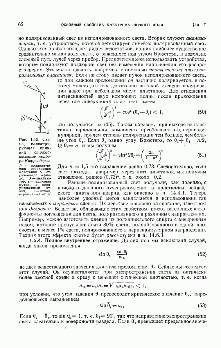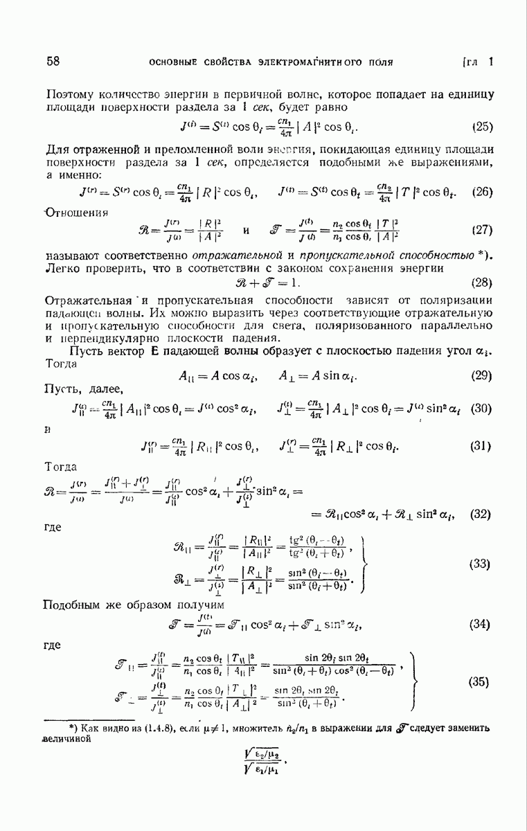 Первая поверхность оказывает на падающее поле двойное действие. Во-первых, амплитуды векторов поля уменьшаются вследствие потерь при отражении и, во-вторых, изменяются направления колебаний. Формулы Френеля показывают, что оба эффекта зависят главным образом от величины утла падения. Если угол мал (около 10°), потери на отражение также малы (около