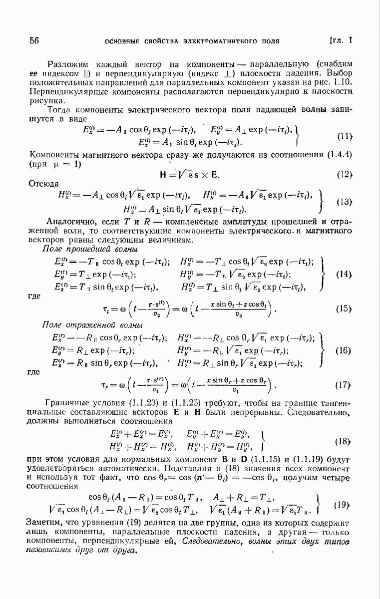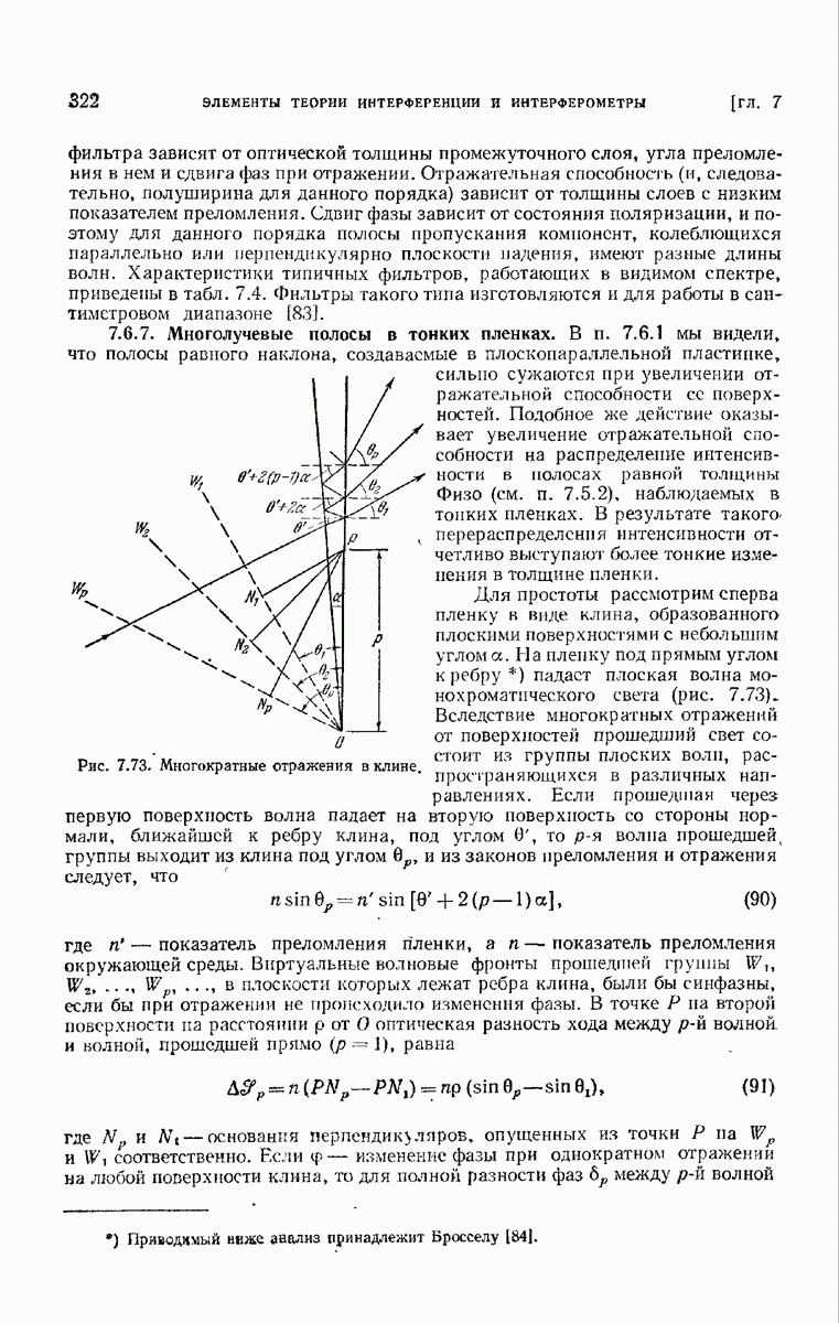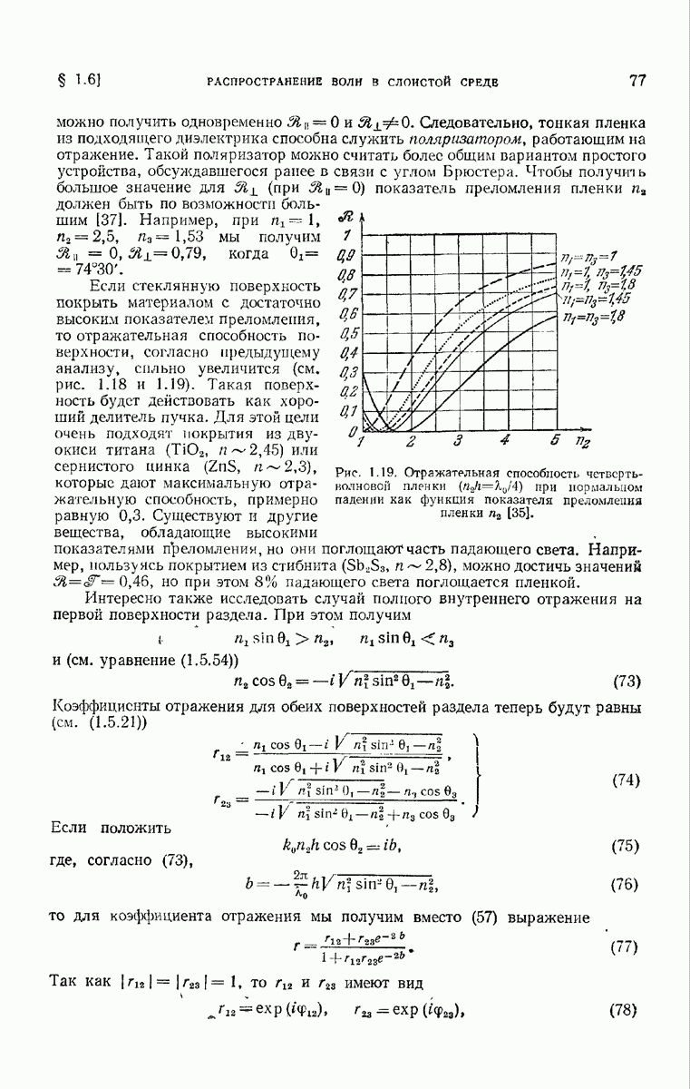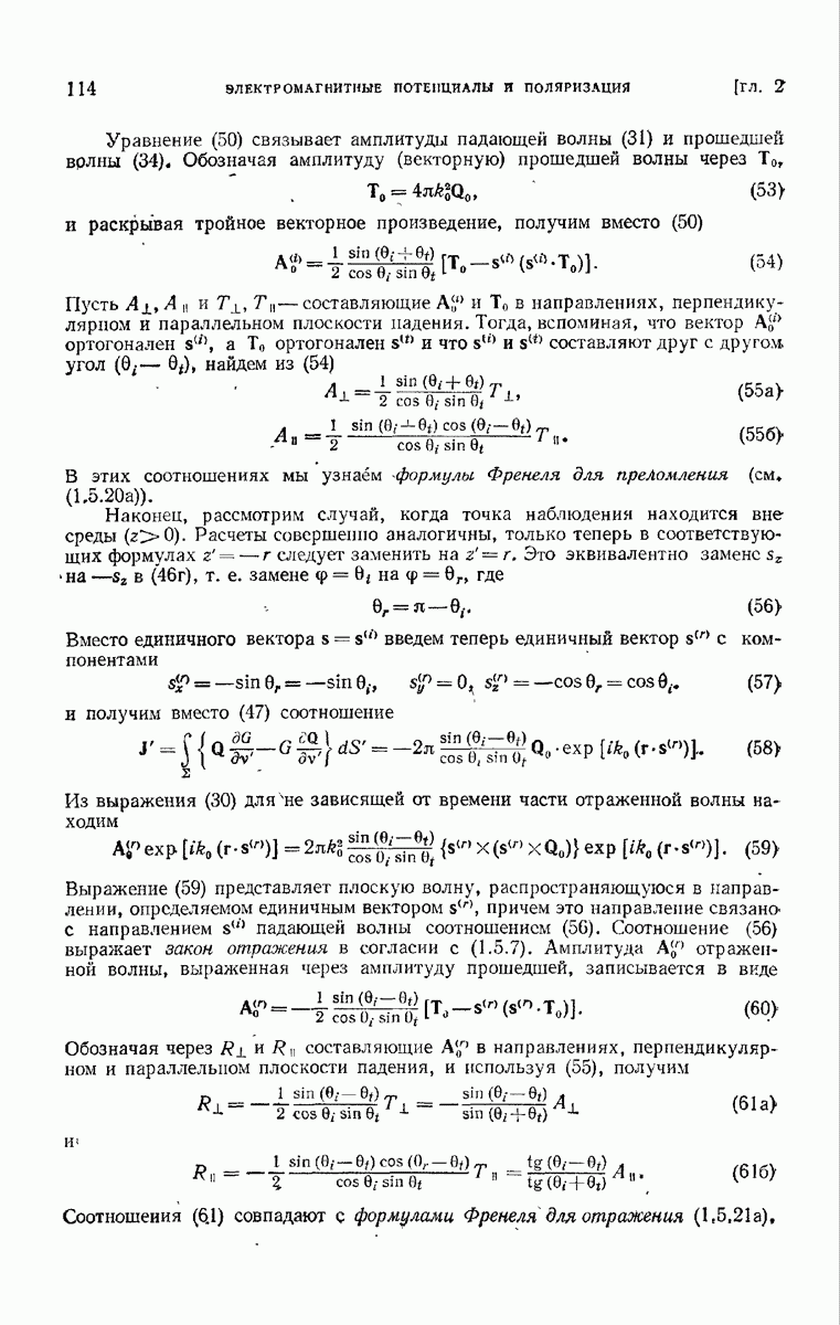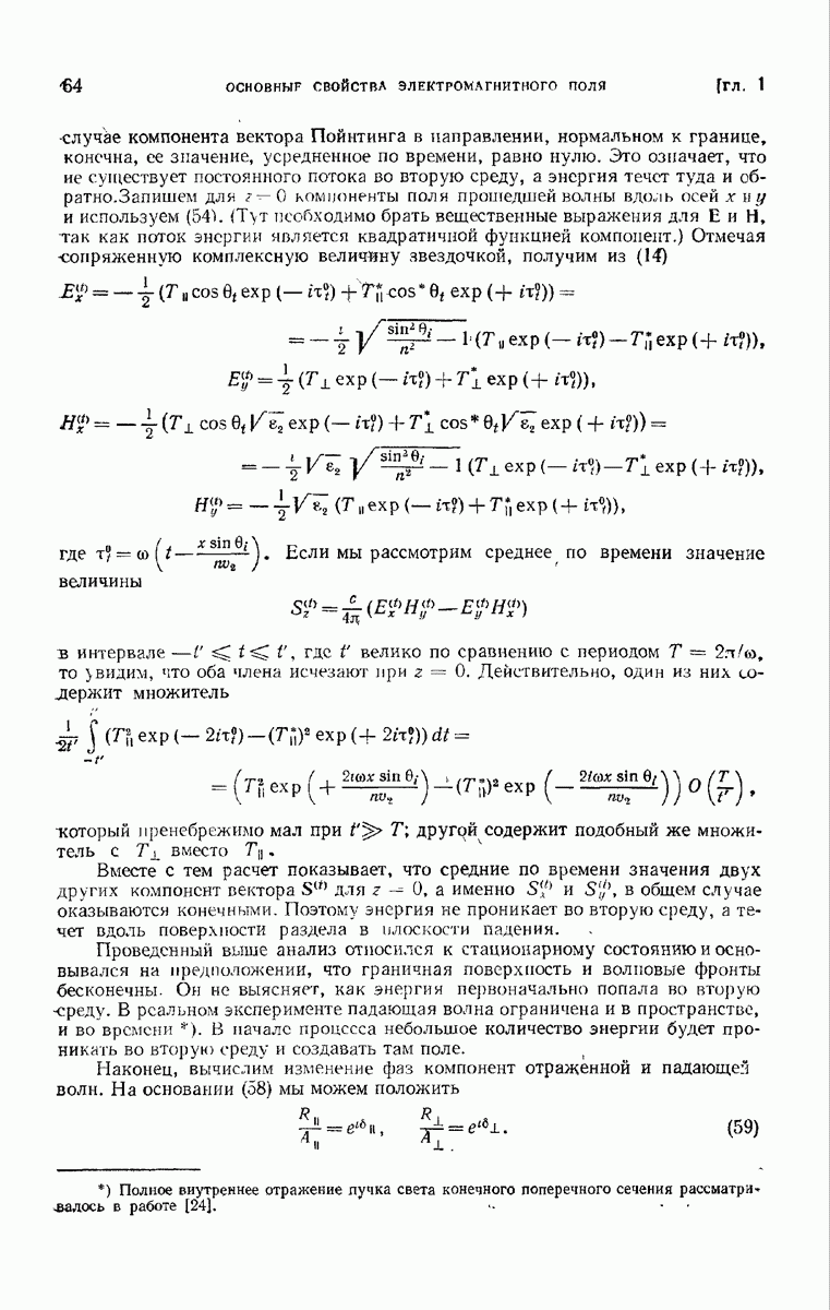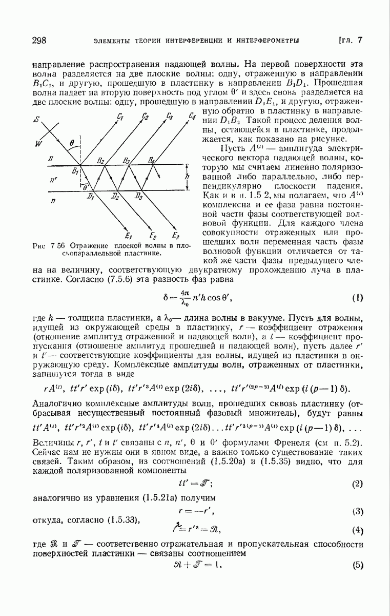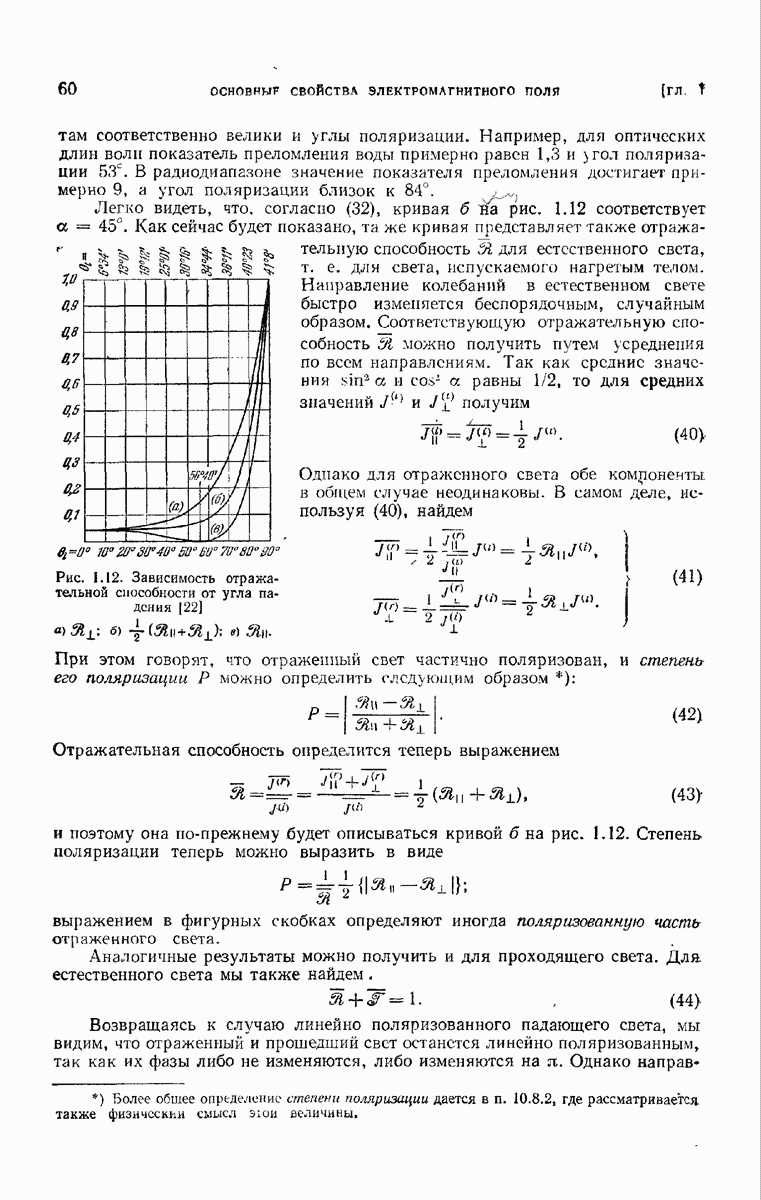 Первая поверхность оказывает на падающее поле двойное действие. Во-первых, амплитуды векторов поля уменьшаются вследствие потерь при отражении и, во-вторых, изменяются направления колебаний. Формулы Френеля показывают, что оба эффекта зависят главным образом от величины утла падения. Если угол мал (около 10°), потери на отражение также малы (около
