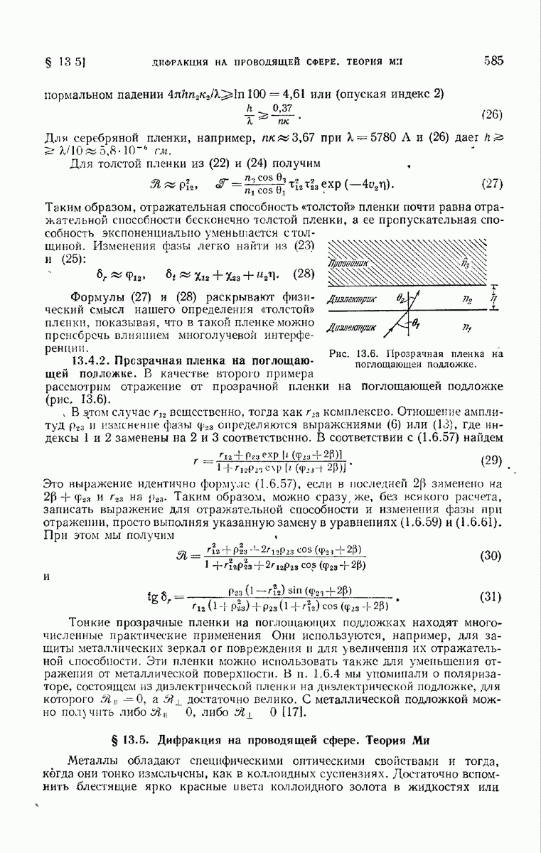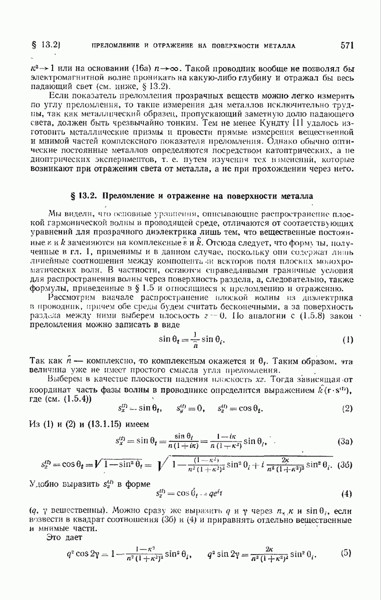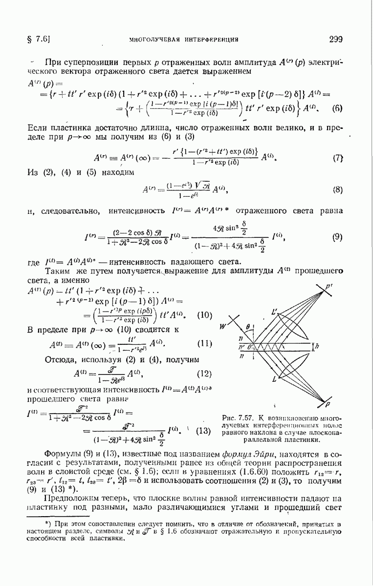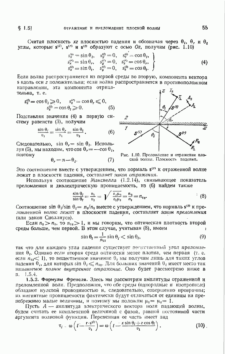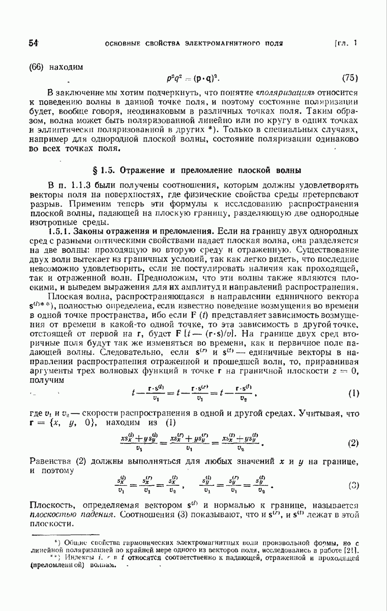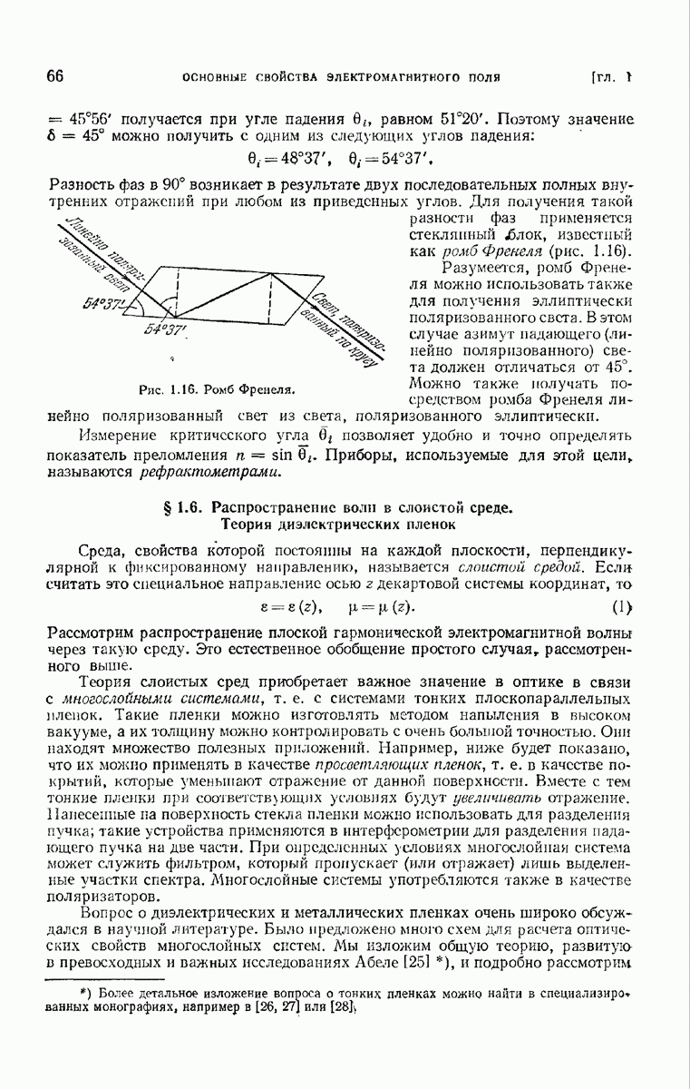 Первая поверхность оказывает на падающее поле двойное действие. Во-первых, амплитуды векторов поля уменьшаются вследствие потерь при отражении и, во-вторых, изменяются направления колебаний. Формулы Френеля показывают, что оба эффекта зависят главным образом от величины утла падения. Если угол мал (около 10°), потери на отражение также малы (около