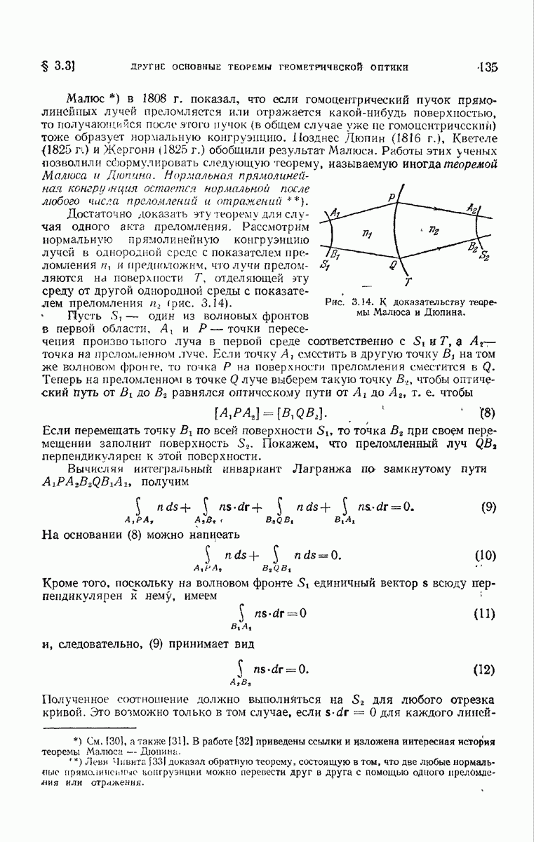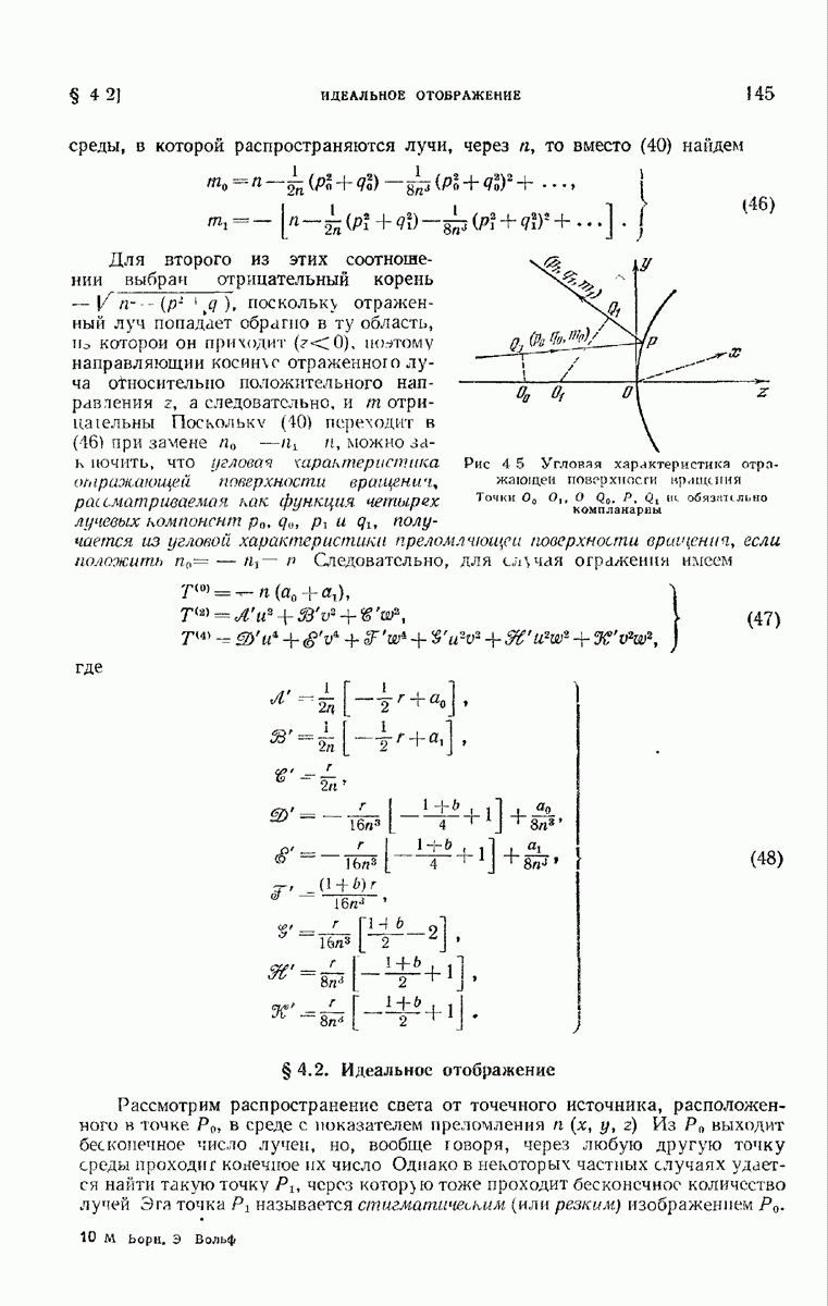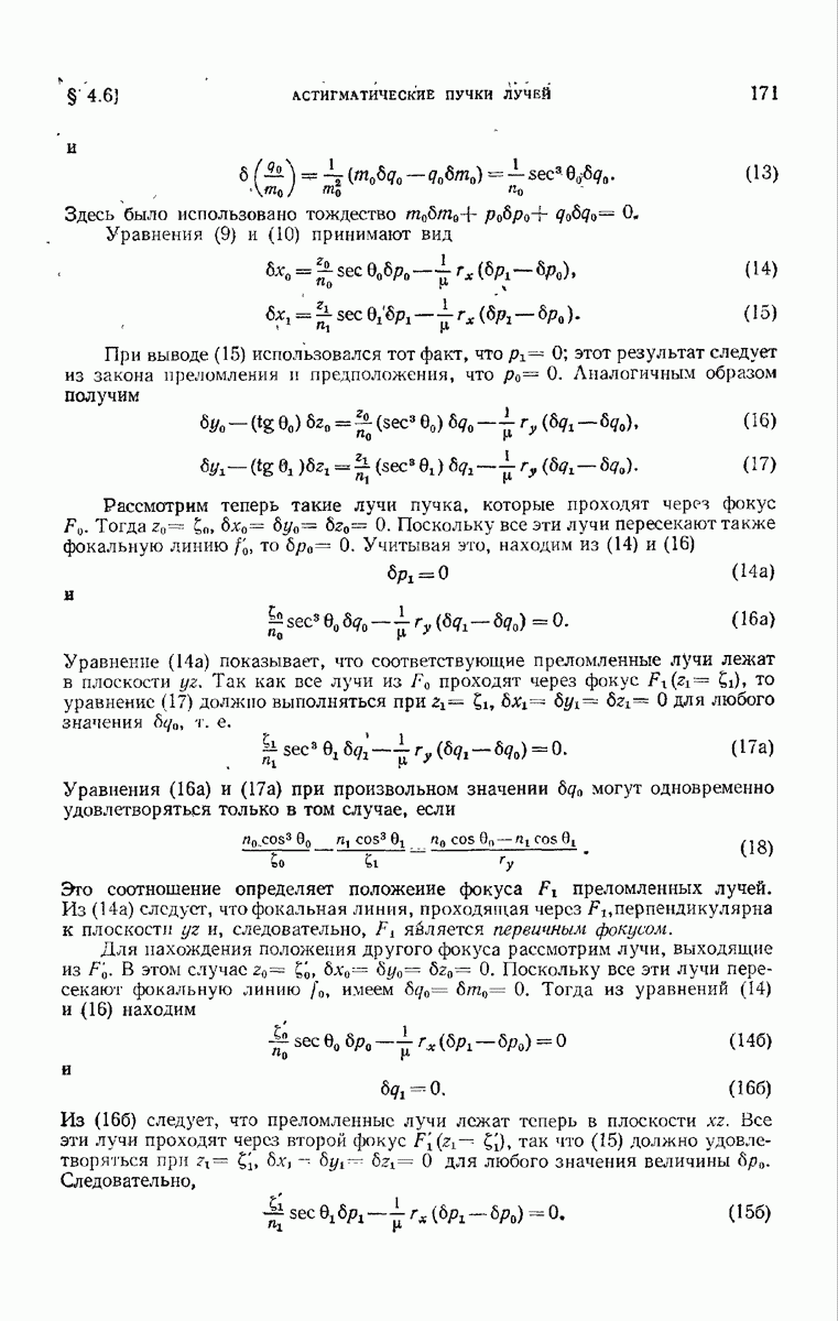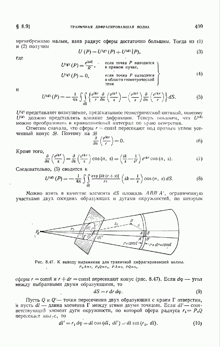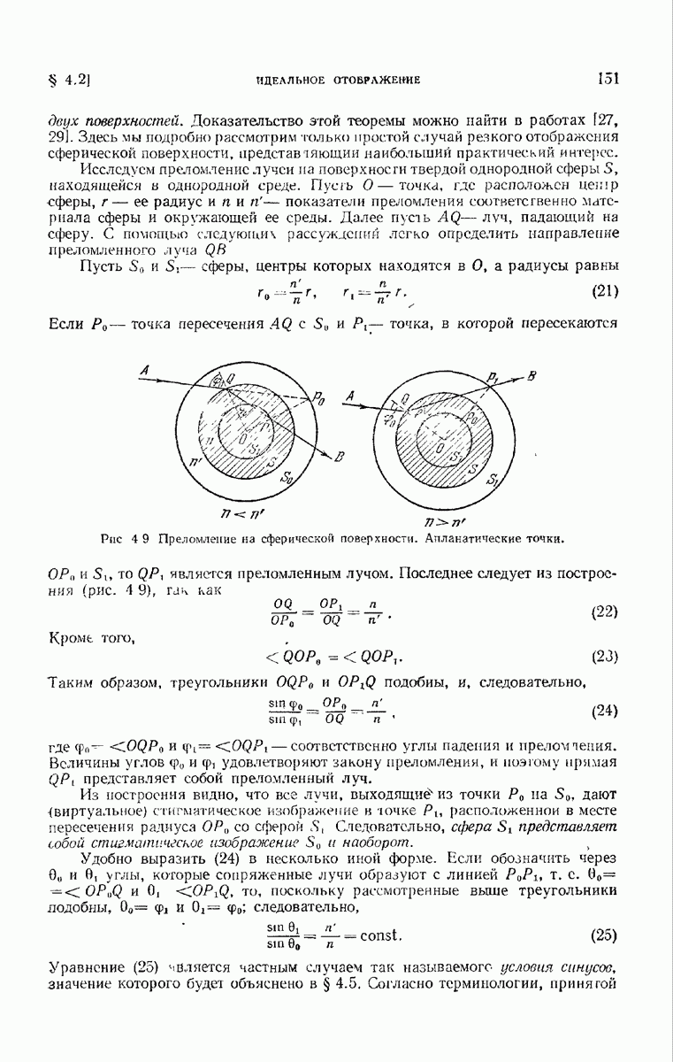 (см. рис. 8.7). Те же рассуждения применимы к обоим нолям и на любом другом волновом фронте, движущемся в пространстве между и второй поверхностью а. В самом деле, в п. 3.1.3 было показано, что в однородной среде направление колебаний вдоль каждого луча остается постоянным и, так как волновые фронты близки к сферическим (с центром в параксиальном изображении точки