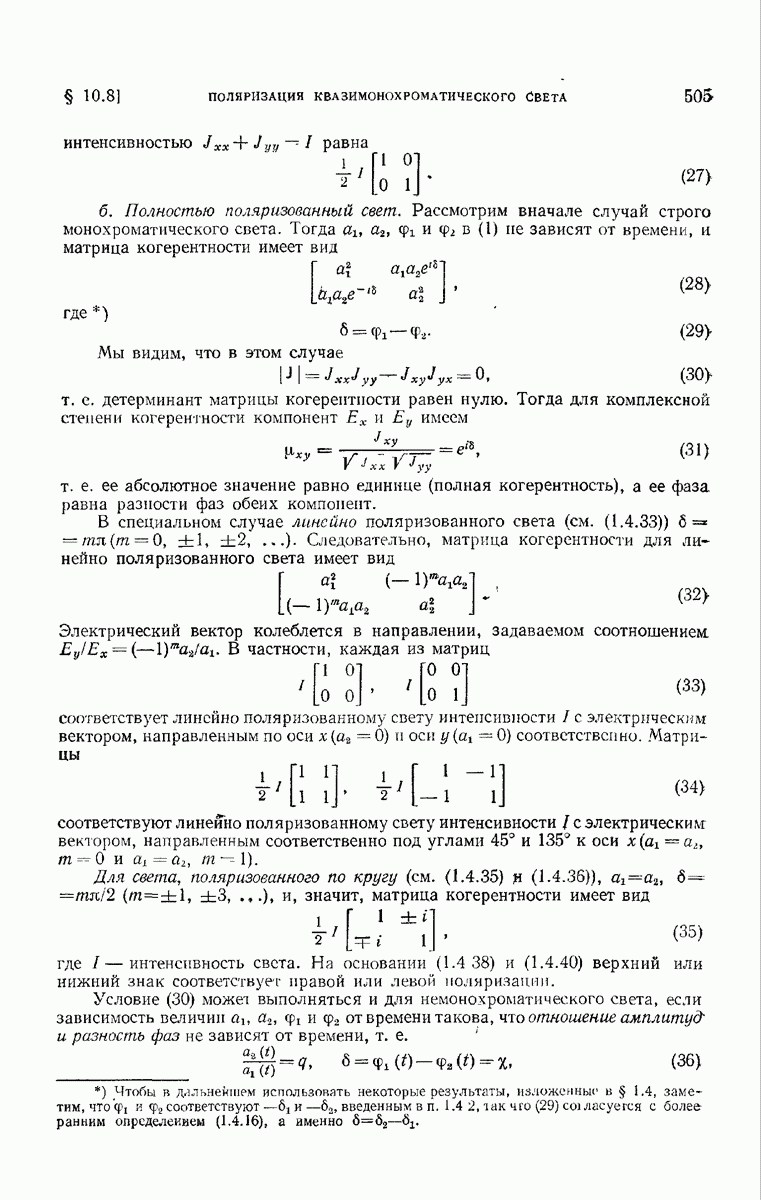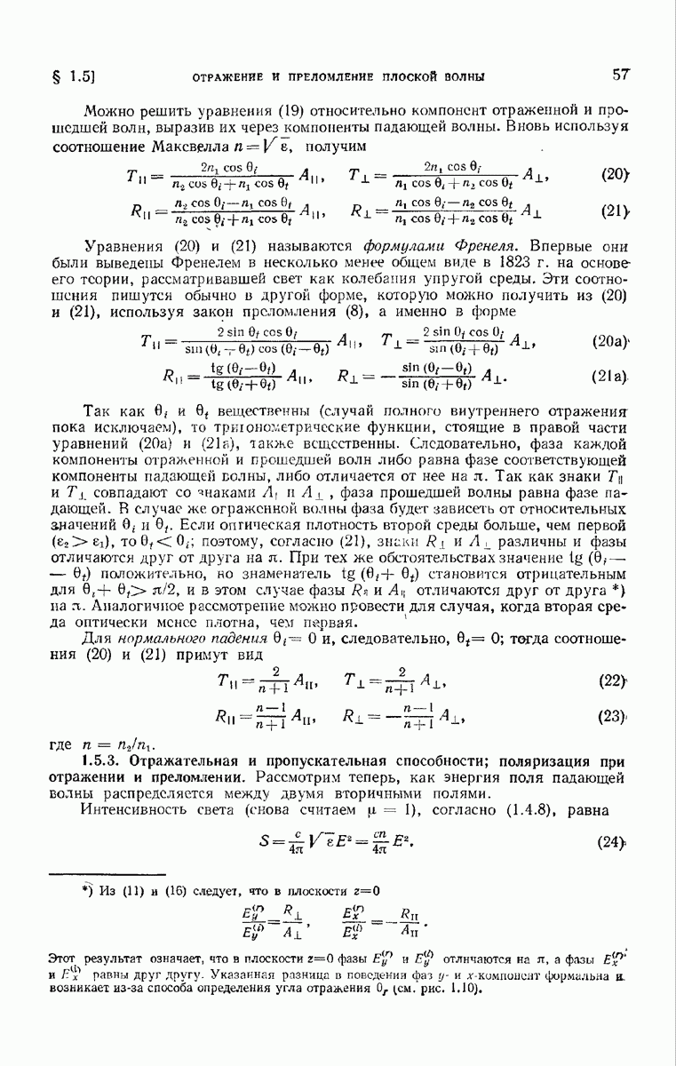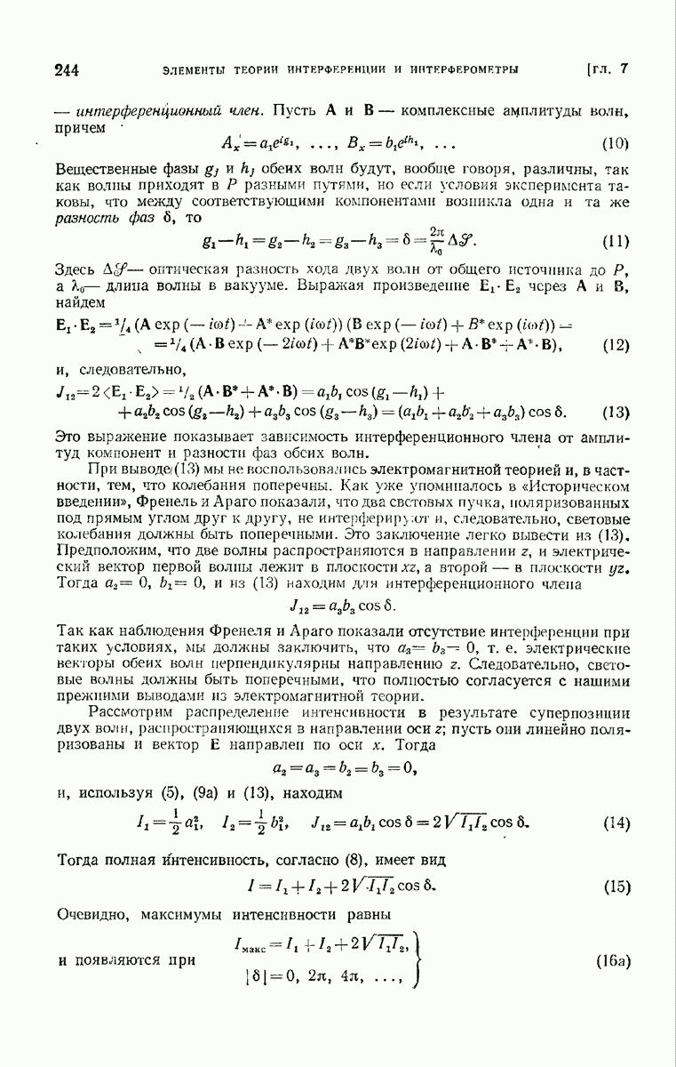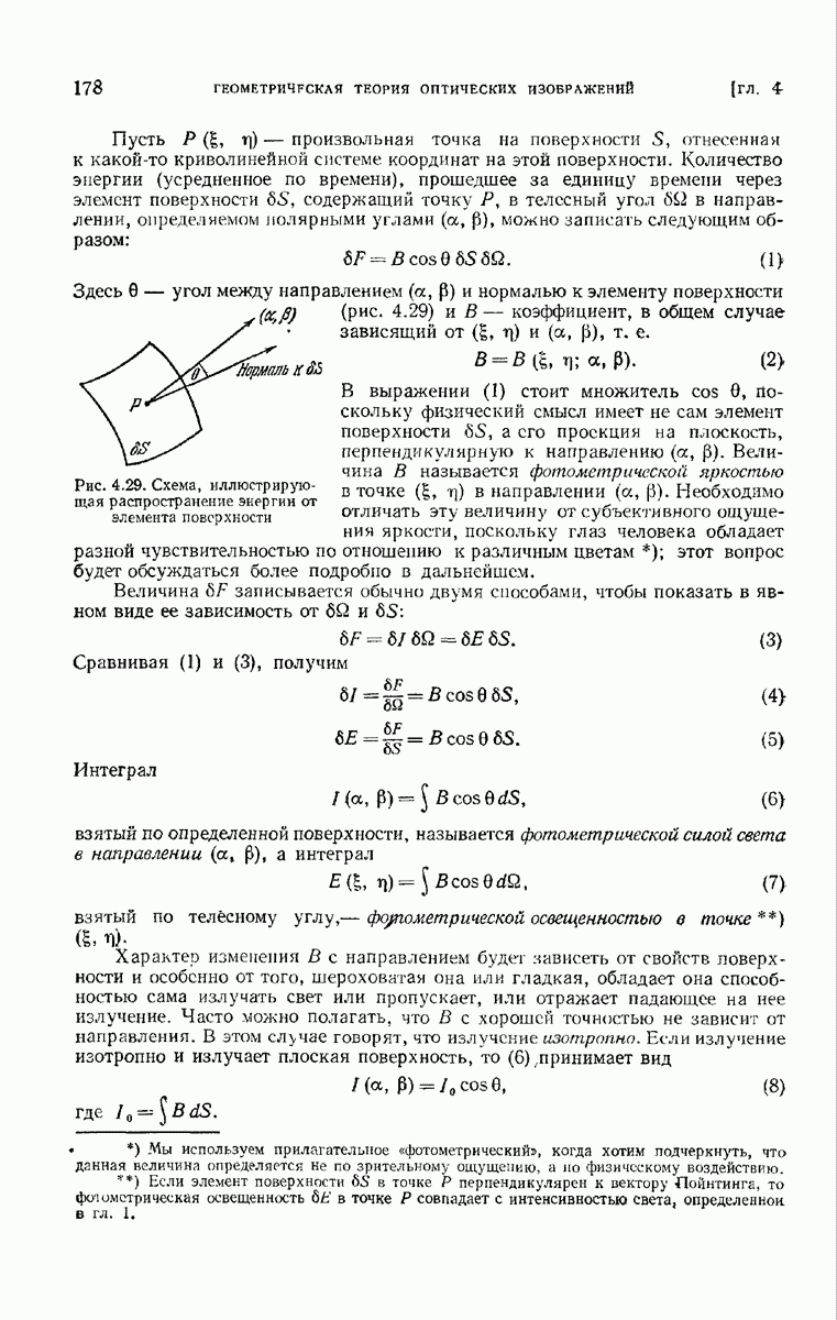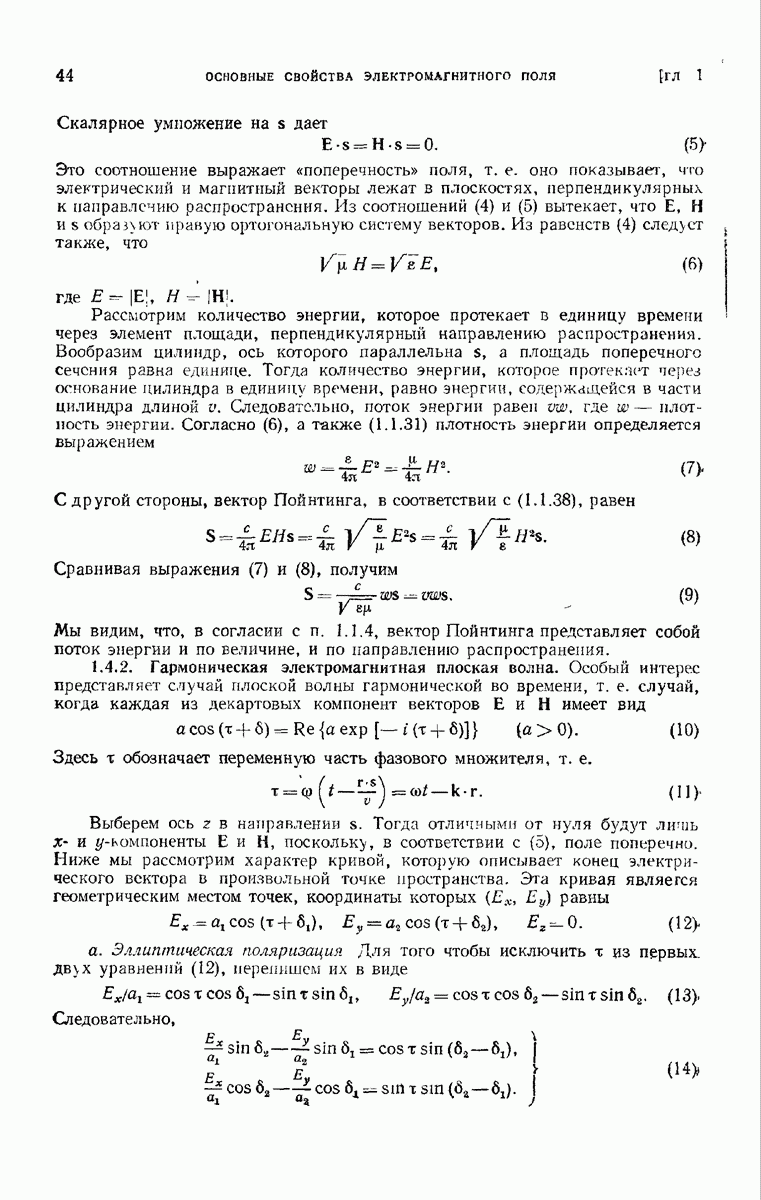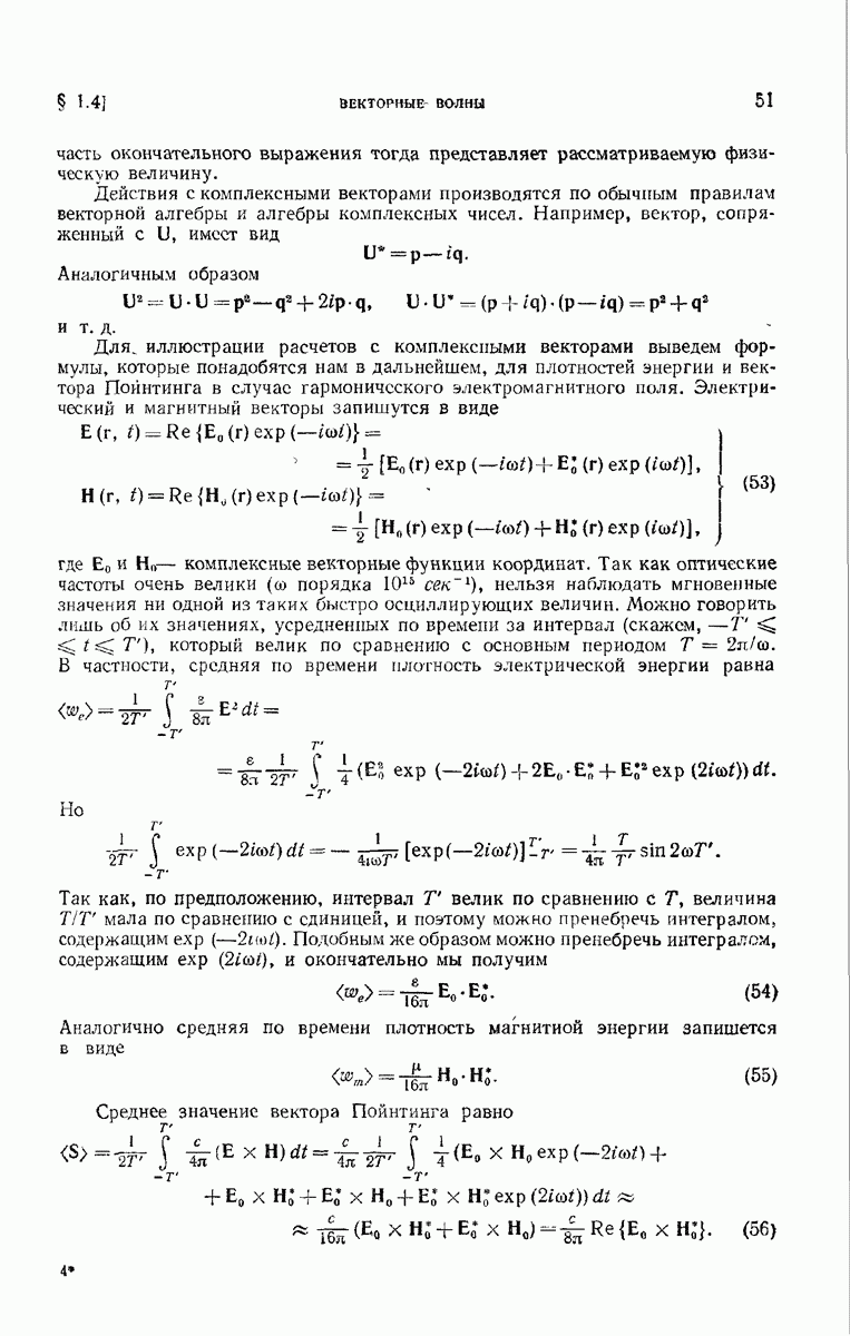 измеряются не мгновенные значения этих величин, а лишь значения, усредненные по времени в интервале, большом по сравнению с периодом световых колебаний. Более того, обычно имеют дело с естественным светом, где в наблюдаемом (макроскопическом) поле нет преимущественных направлений поляризации. В этом случае первостепенное значение имеет интенсивность I, уже определенная в п. 1.1.4 как средняя повремени энергия, протекающая в единицу времени через единицу площади, содержащую электрический и магнитный векторы, т. е.