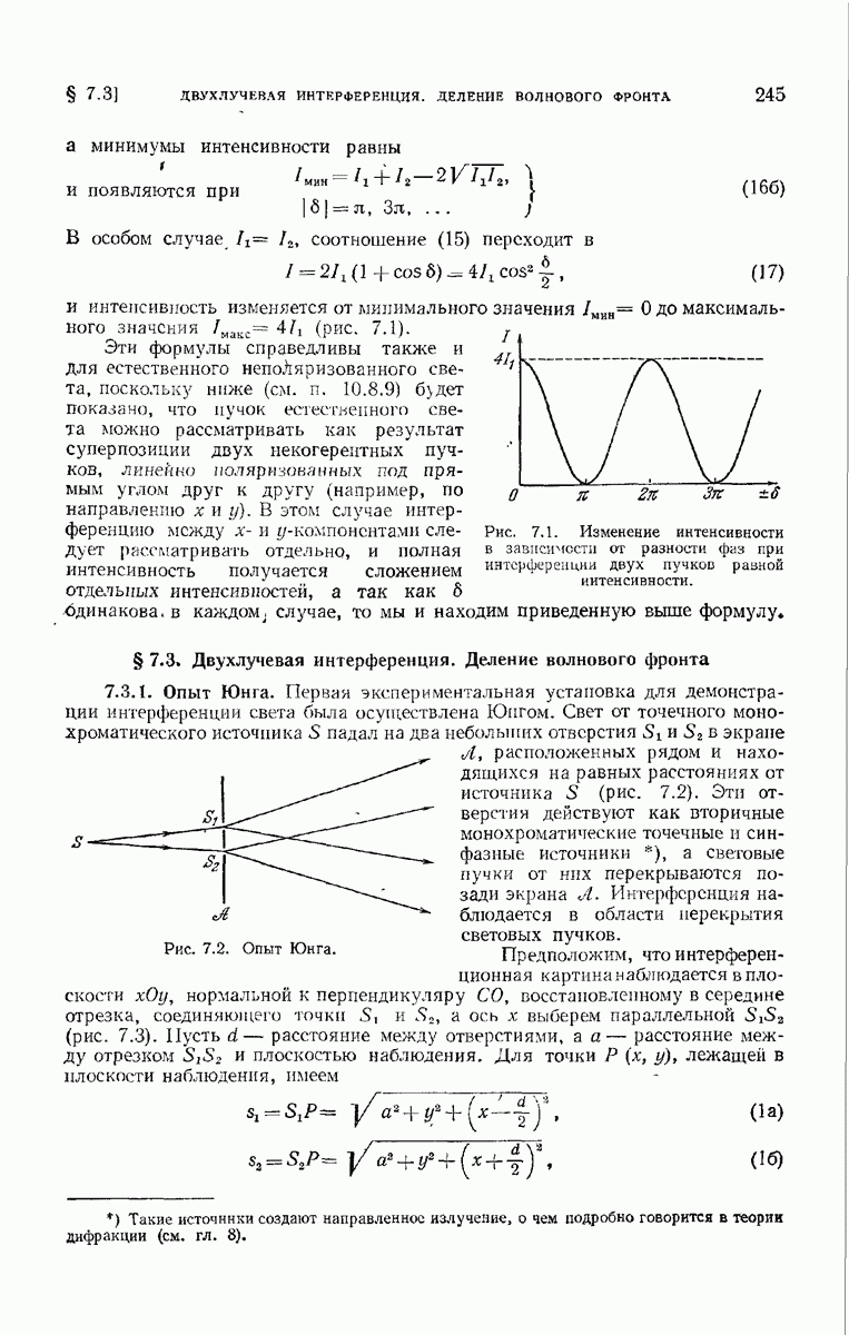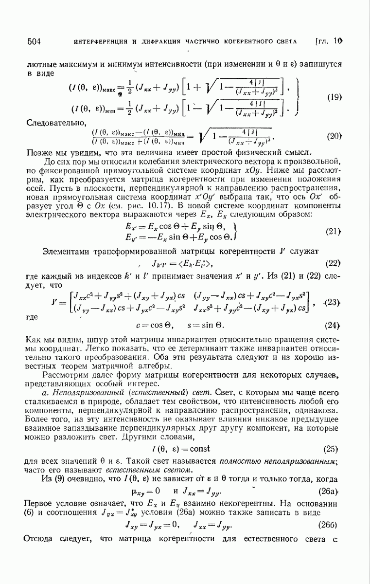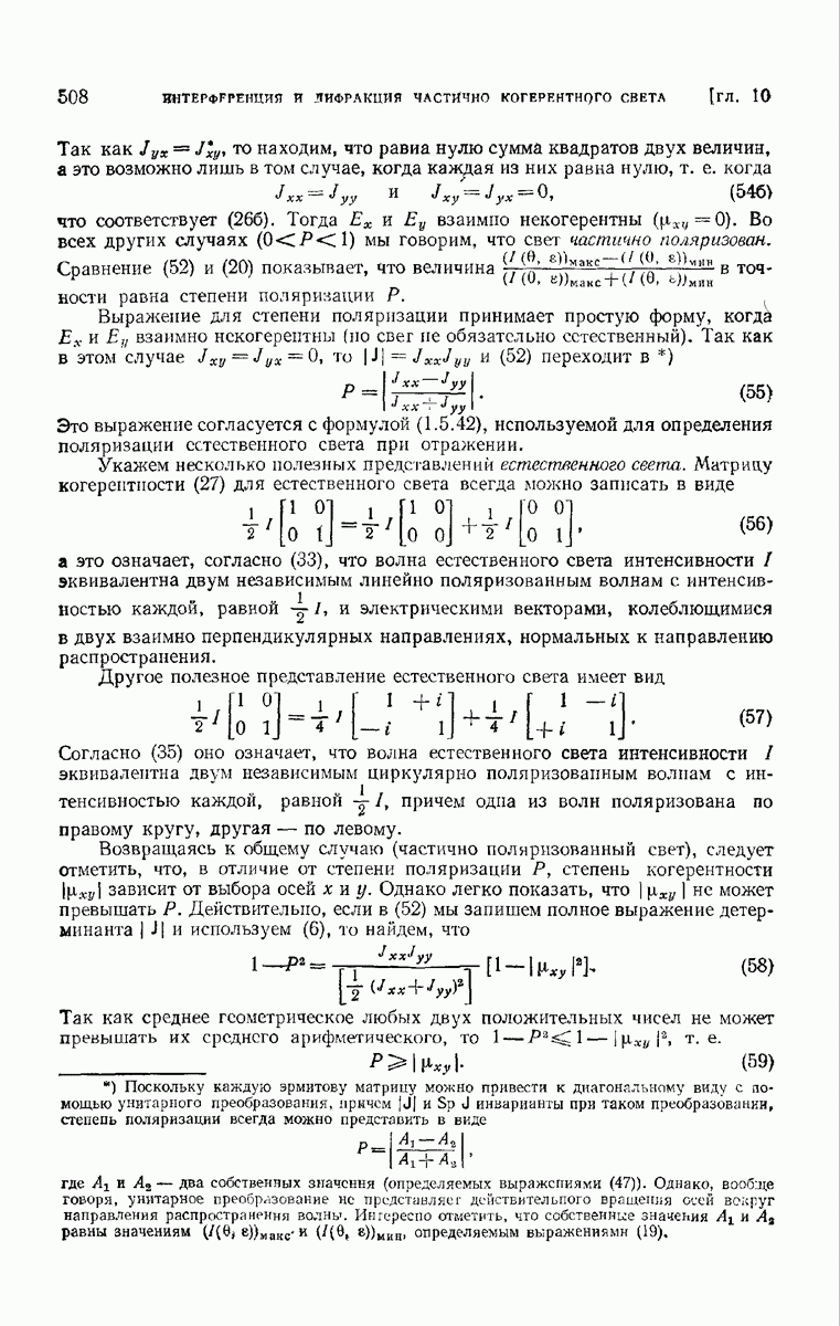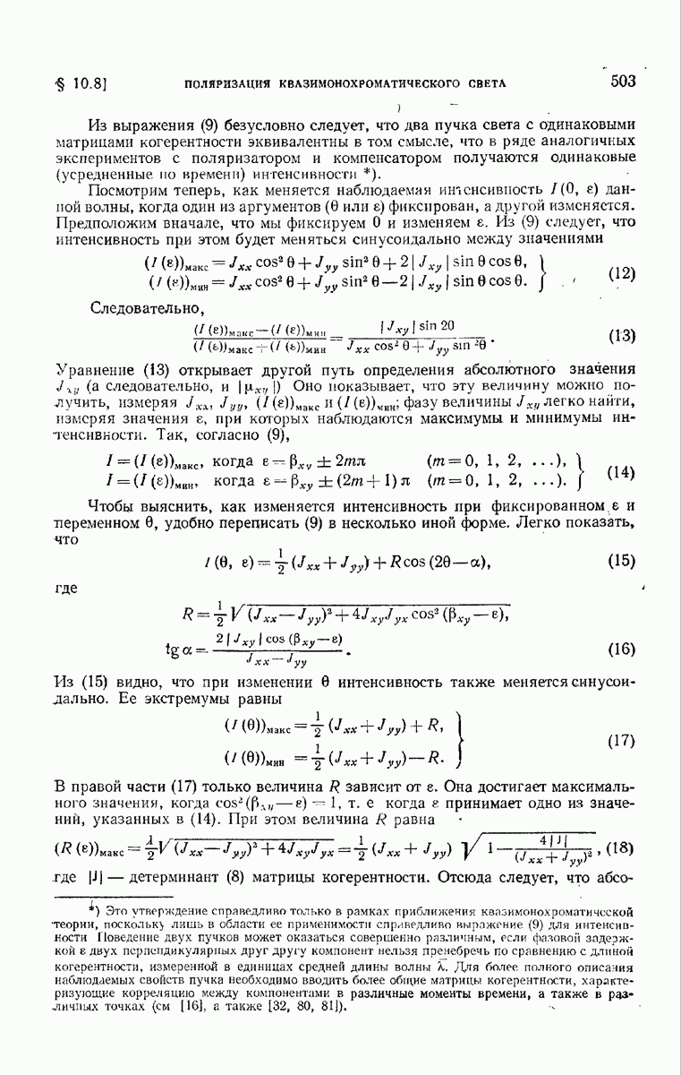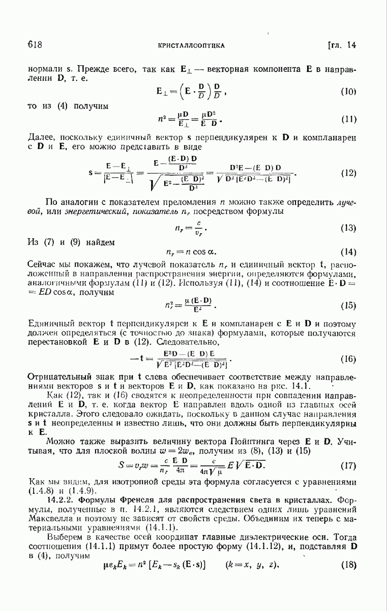 измеряются не мгновенные значения этих величин, а лишь значения, усредненные по времени в интервале, большом по сравнению с периодом световых колебаний. Более того, обычно имеют дело с естественным светом, где в наблюдаемом (макроскопическом) поле нет преимущественных направлений поляризации. В этом случае первостепенное значение имеет интенсивность I, уже определенная в п. 1.1.4 как средняя повремени энергия, протекающая в единицу времени через единицу площади, содержащую электрический и магнитный векторы, т. е.
