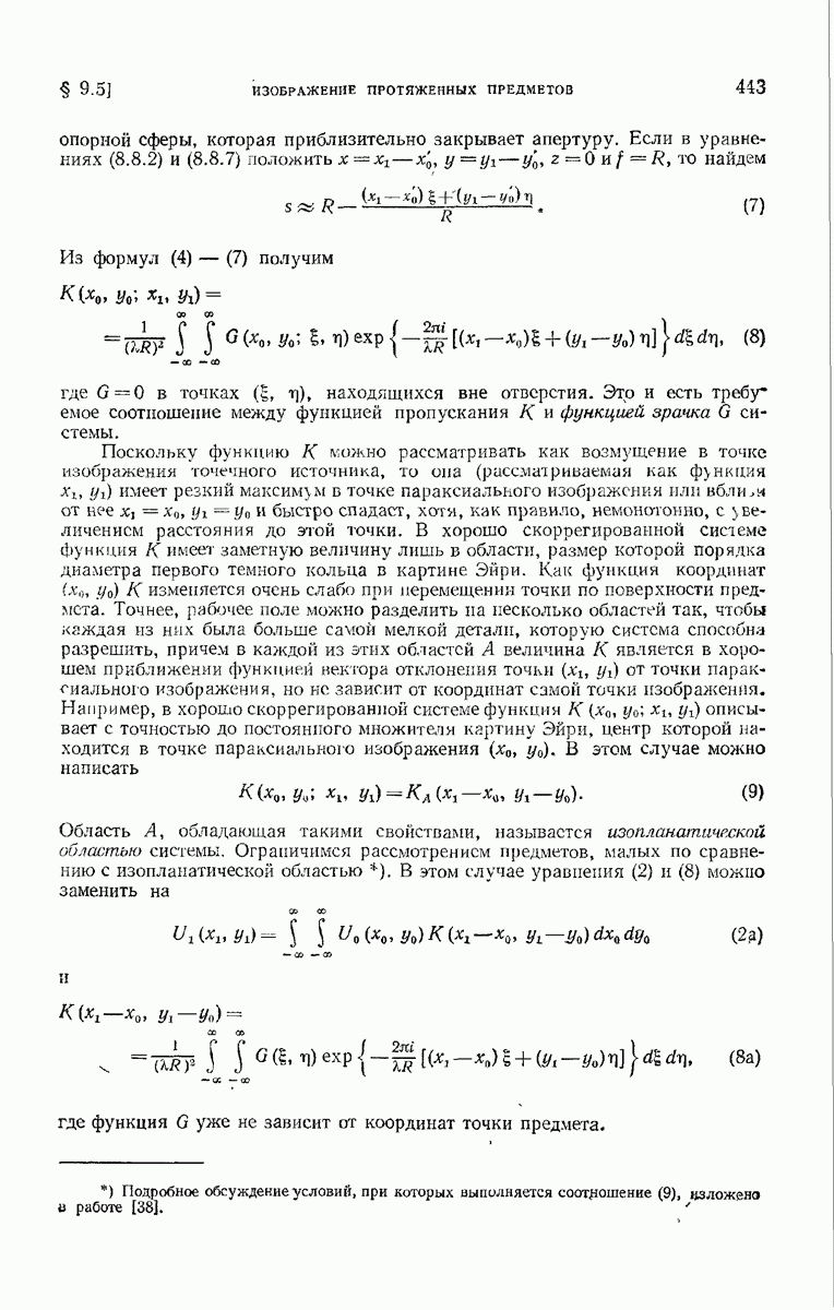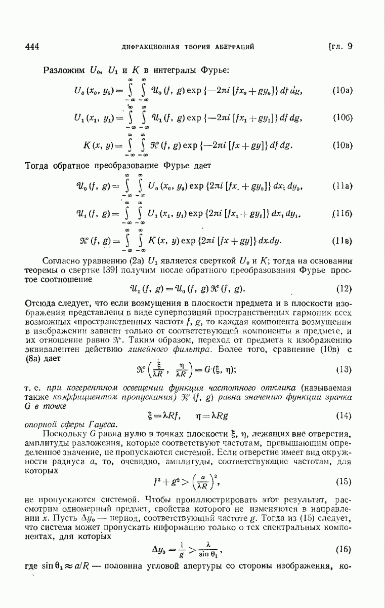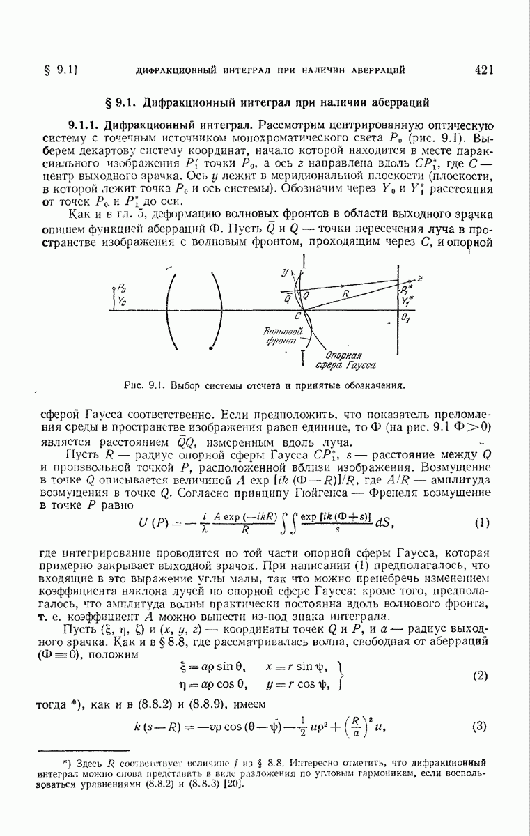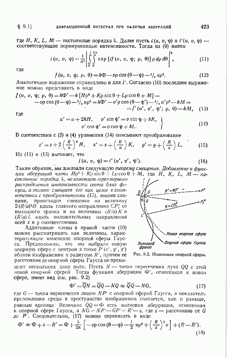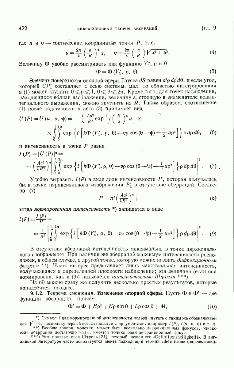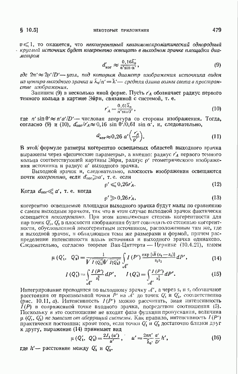 — точка в области изображений, где определяется интенсивность. Если углы, под которыми из Р видны диаметры выходного зрачка, малы, то, используя формулу Кирхгофа с теми же допущениями, как и в предыдущем параграфе, и интегрируя выражение (7) по части