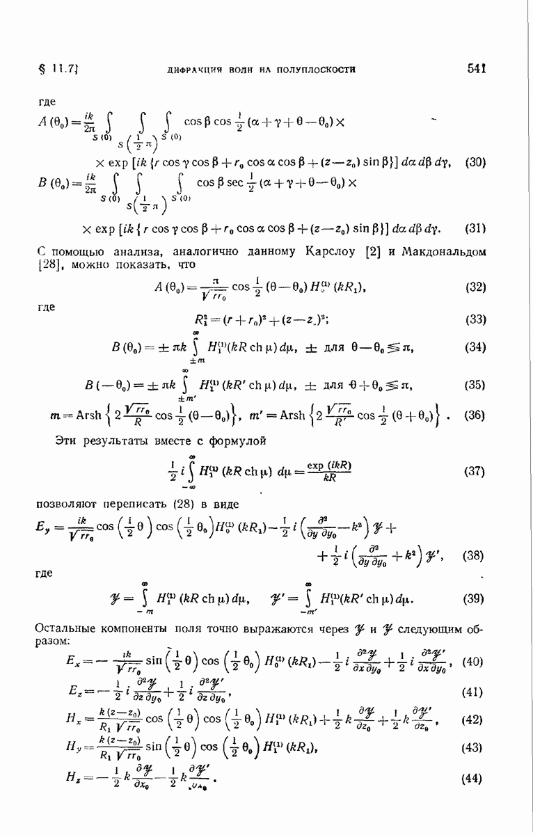 Поле во всех точках отверстия, за исключением точек, находящихся в непосредственной близости от его края, можно приближенно представить в виде выражений (см. гл. 3)