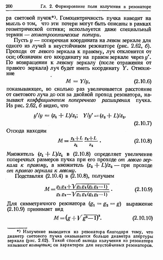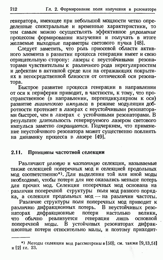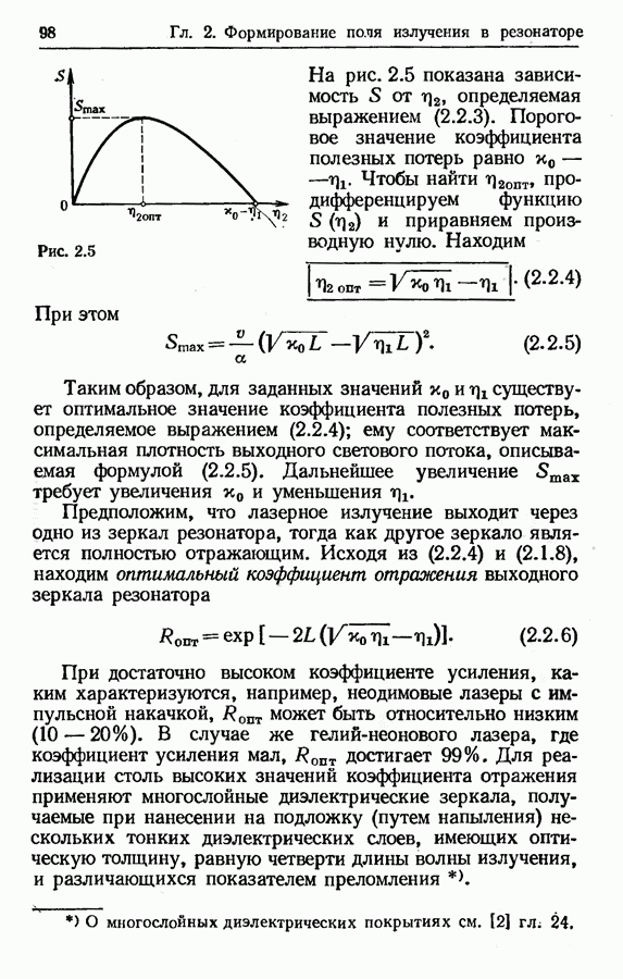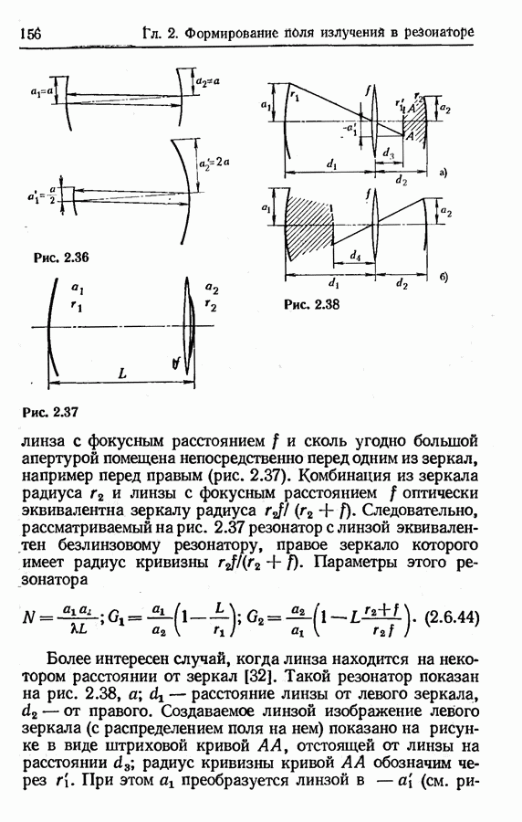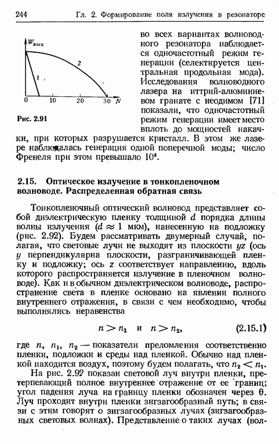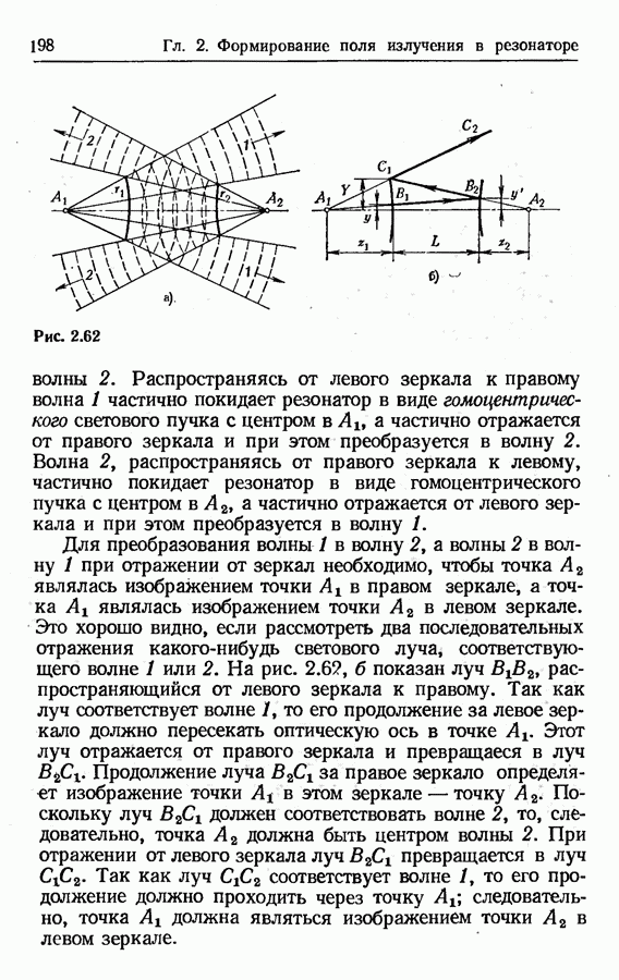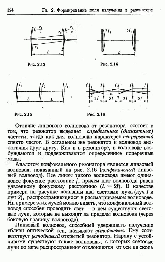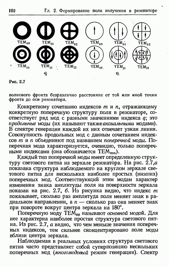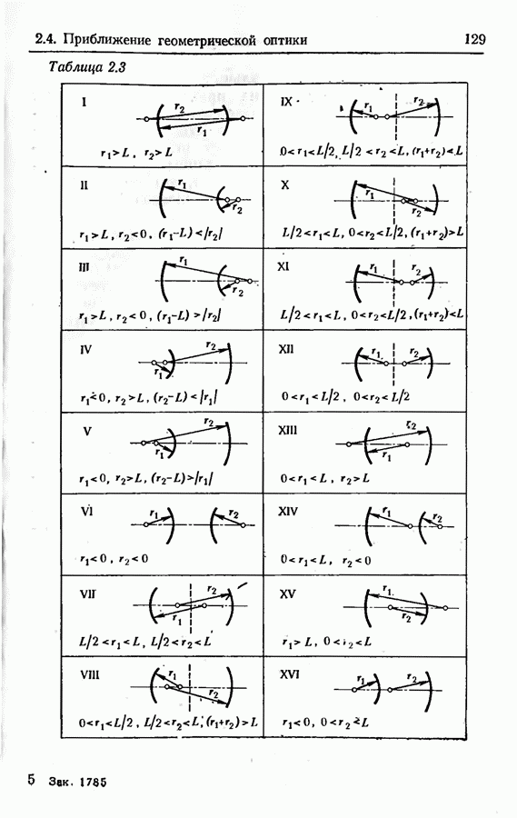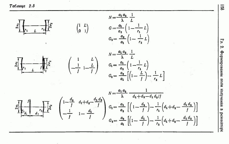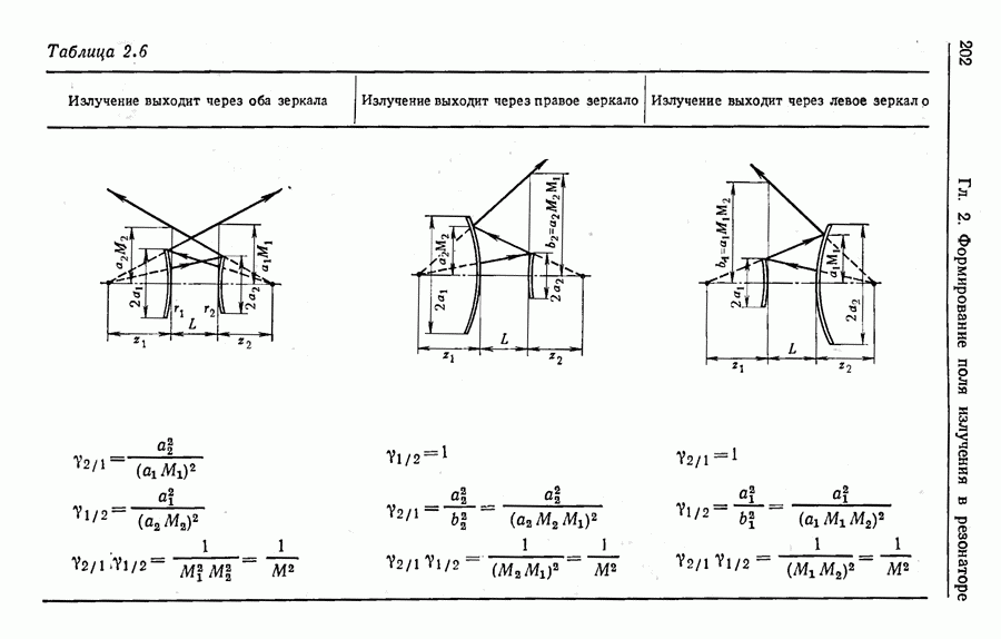 4 — зеркало оптического резонатора, 5 — лазерное излучение. На рис. 1.11, б показано поперечное сечение лазера; поверхность отражателя является в сечении эллипсом, в фокусах которого находятся активный элемент и источник накачки. На практике могут использоваться отражатели различной формы и конструкции. Так, используется двухламповый отражатель, показанный в поперечном сечении на рис. 1.11, в. Такой отражатель позволяет повысить выходную мощность излучения.