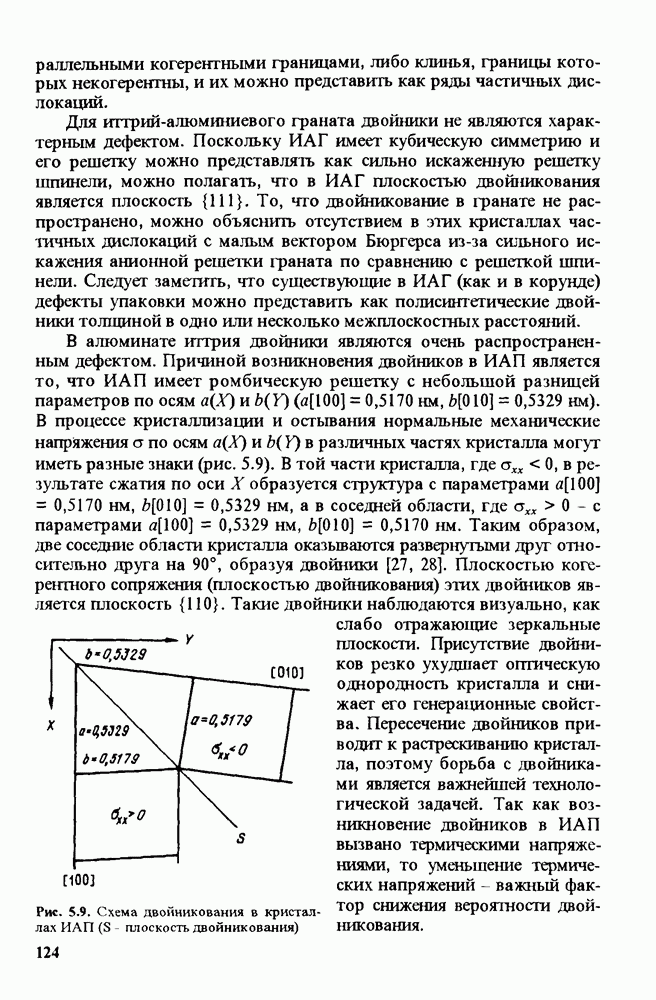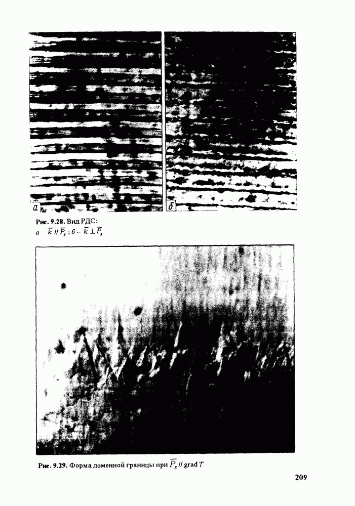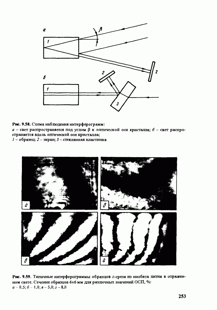(кликните для просмотра скана) интерферометра используется сам кристалл [161, 162]. Этот метод не требует сложного аппаратурного оформления и трудоемкой настройки оптической системы. Наблюдение интерферограмм в отраженном свете проводится при малом (менее 50) отклонении падающего луча от оптической оси кристаллического элемента (рис. 9.58, а). Недостатком такой оптической схемы является то, что в формировании интерференционной картины участвует естественное двупреломление, что затрудняет регистрацию аномальной двуосносги. Этот недостаток можно устранить, поместив на пути луча под углом к нему стеклянную пластинку (рис. 9.58, б). При измерениях используются кристаллические пластинки с гранями, нормальными оптической оси. Интерферограммы кристаллических пластинок в отраженном свете представляют собой систему темных полос различной формы (рис. 9.59). При увеличении угла