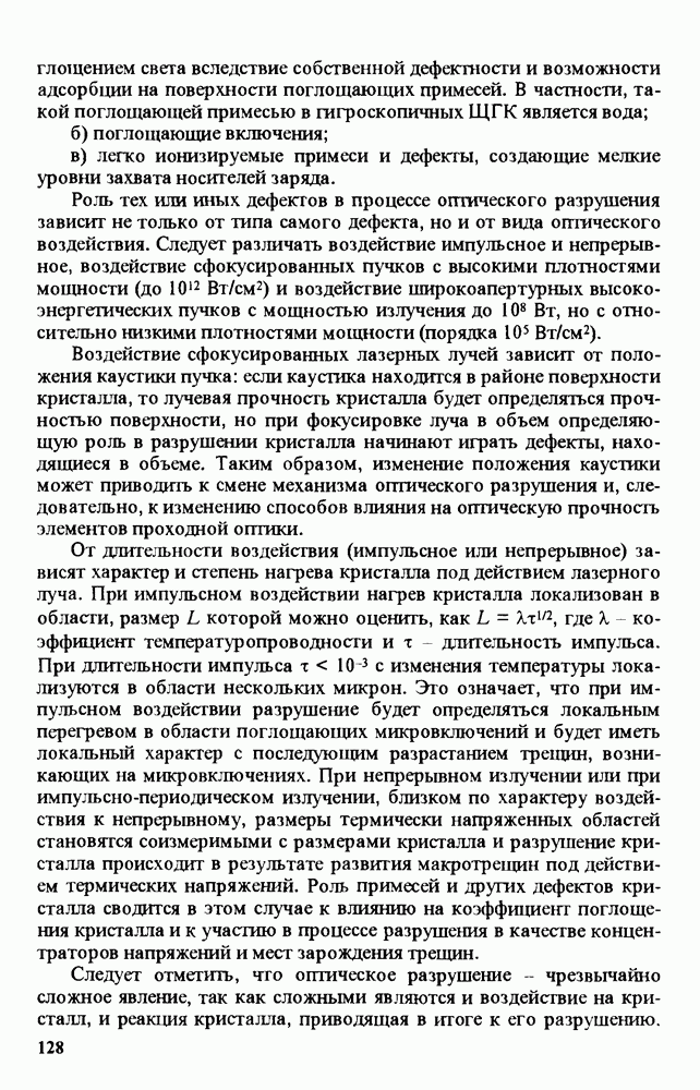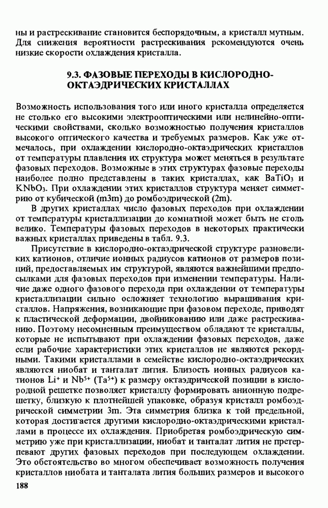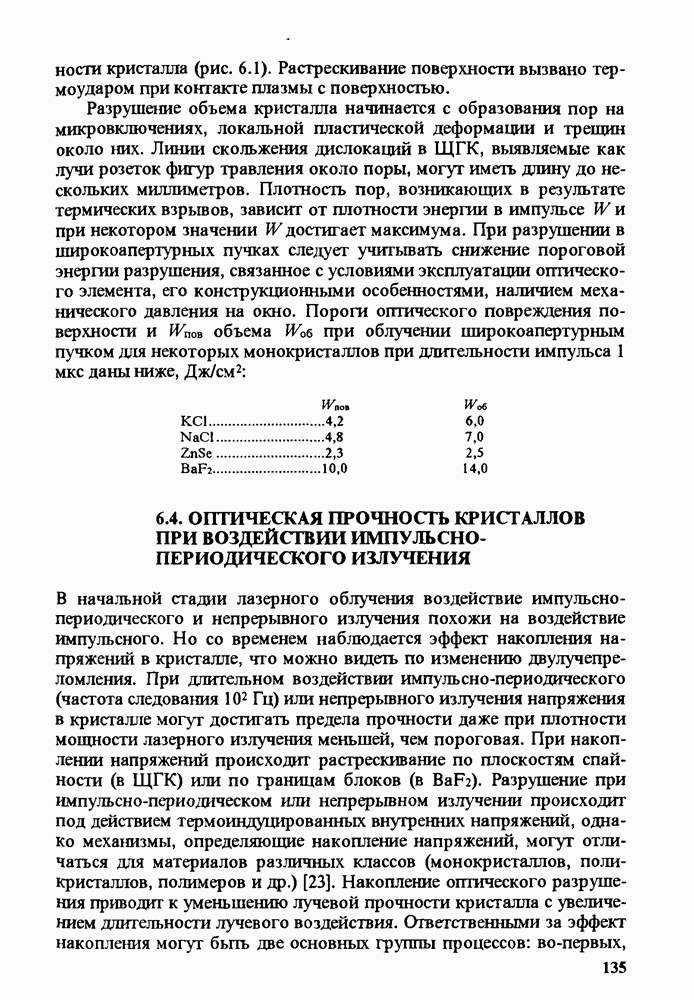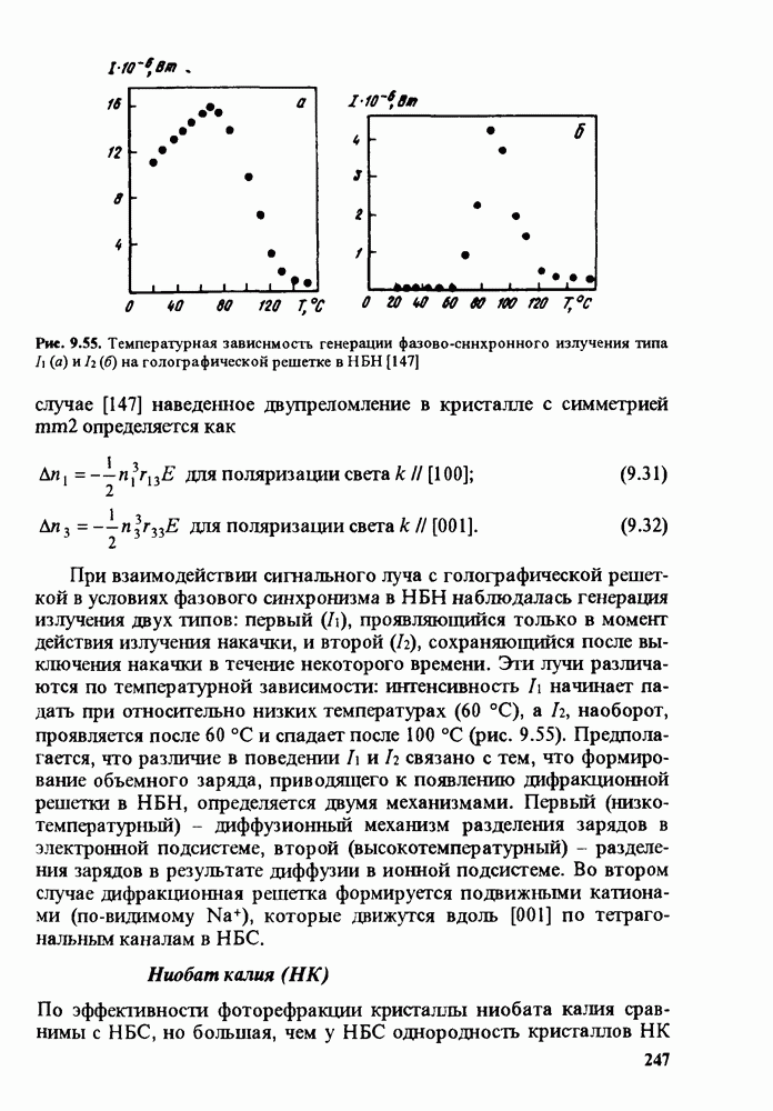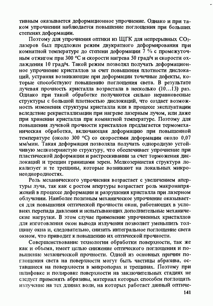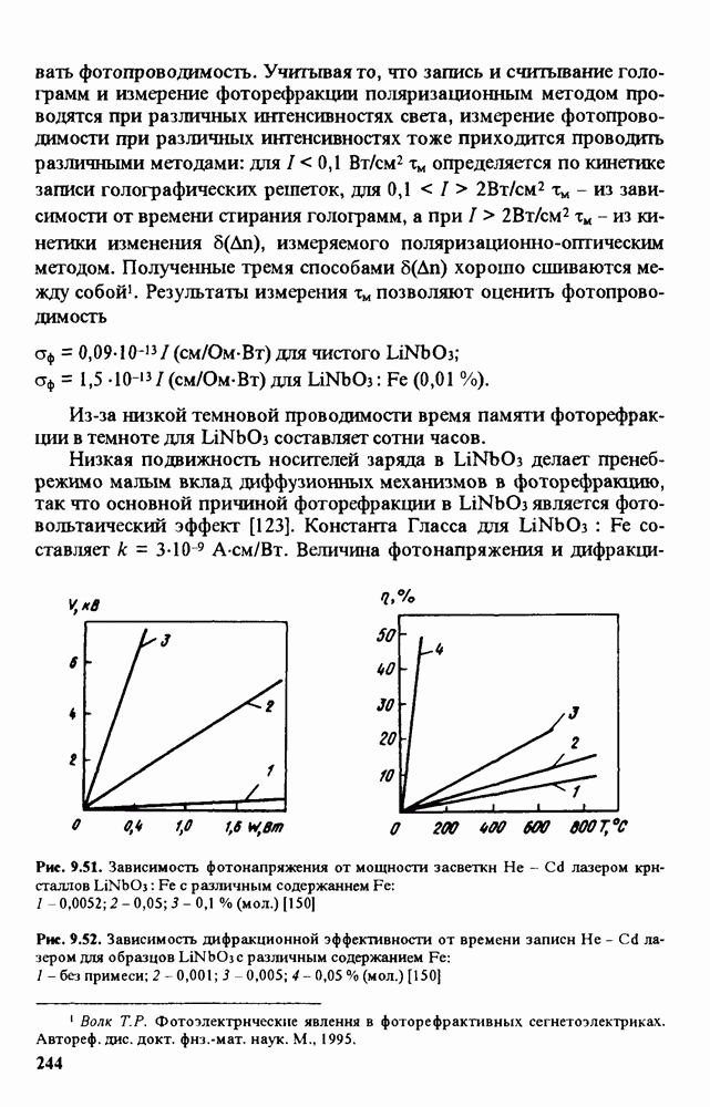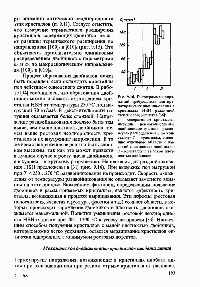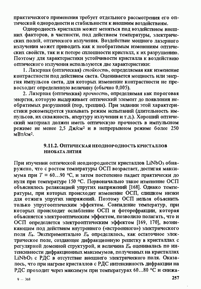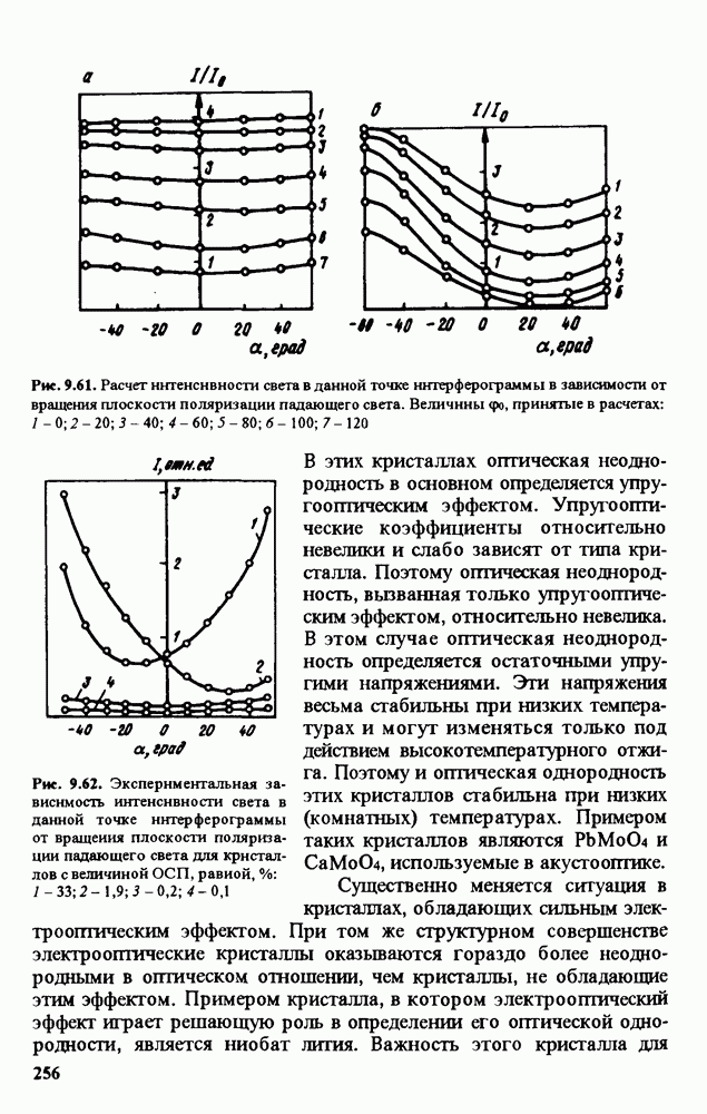 Рис. 9.62. Экспериментальная зависимость интенсивности света в данной точке ннтерферограммы от вращения плоскости поляризации падающего света для кристаллов с величиной ОСП, равной, В этих кристаллах оптическая неоднородность в основном определяется упругооптическим эффектом. Упругооптические коэффициенты относительно невелики и слабо зависят от типа кристалла. Поэтому оптическая неоднородность, вызванная только упругооптическим эффектом, относительно невелика. В этом случае оптическая неоднородность определяется остаточными упругими напряжениями. Эти напряжения весьма стабильны при низких температурах и могут изменяться только под действием высокотемпературного отжига. Поэтому и оптическая однородность этих кристаллов стабильна при низких (комнатных) температурах. Примером таких кристаллов являются Существенно меняется ситуация в кристаллах, обладающих сильным электрооптическим эффектом. При том же структурном совершенстве электрооптические кристаллы оказываются гораздо более неоднородными в оптическом отношении, чем кристаллы, не обладающие этим эффектом. Примером кристалла, в котором электрооптический эффект играет решающую роль в определении его оптической однородности, является ниобат лития. Важность этого кристалла для практического применения требует отдельного рассмотрения его оптической однородности и стабильности к внешним воздействиям. Однородность кристалла может меняться под воздействием внешних факторов, в частности, под действием температуры, электрических полей, оптического излучения. Воздействие мощного лазерного излучения может приводить как к необратимым изменениям оптических свойств, так и к потере сплошности кристалл, к их разрушению. Поэтому для характеристики устойчивости кристалла к воздействию оптического излучения используются две характеристики: 1. Лазерная (оптическая) стойкость, определяемая как изменение контрастности под действием света. Оценивается мощность или энергия импульсов света, для которых изменение контрастности не превосходит определенную величину (обычно 0,005). 2. Лазерная (оптическая) прочность, определяемая как пороговая энергия, которую выдерживает оптический элемент до появления необратимых разрушений (пор, трещин). При задании этой характеристики рекомендуется указывать режим испытаний (длительность импульсов, их скважность, апертуру излучения и т. д.). Хороший оптический материал должен иметь оптическую прочность в импульсном режиме не менее