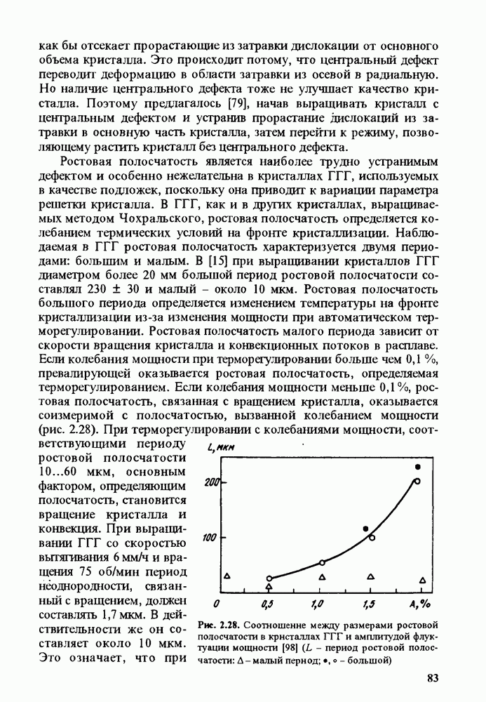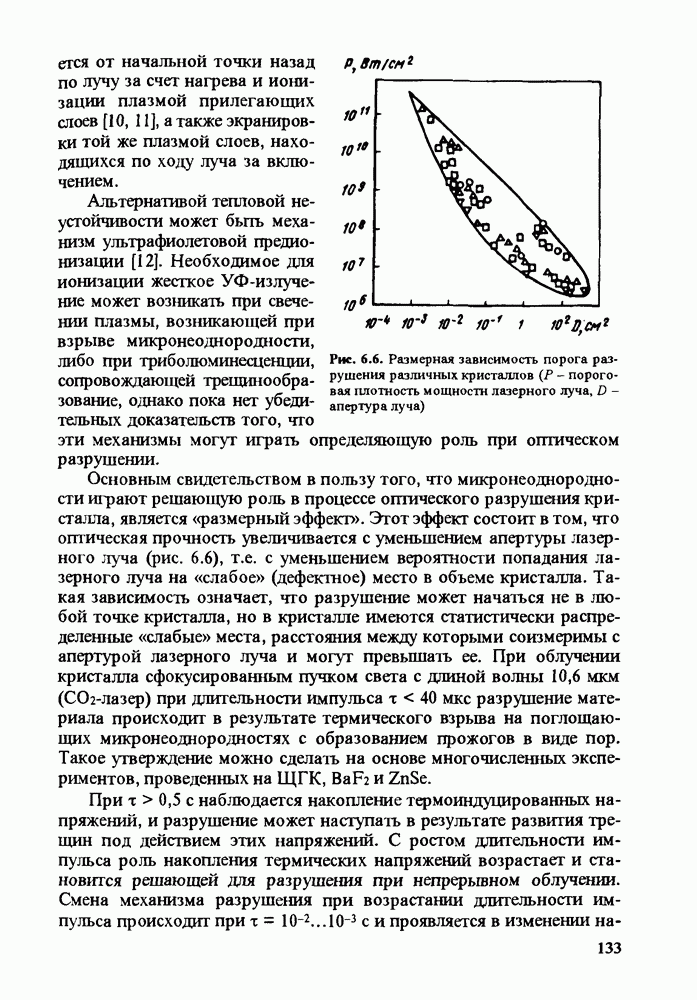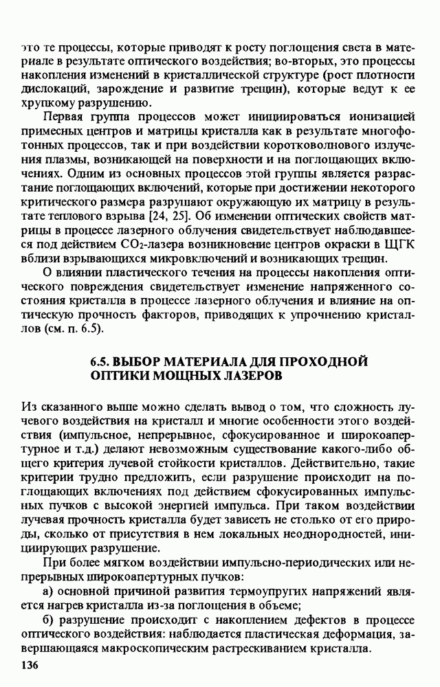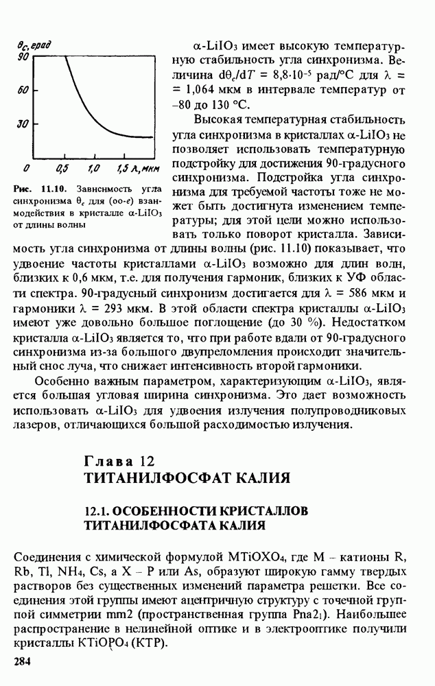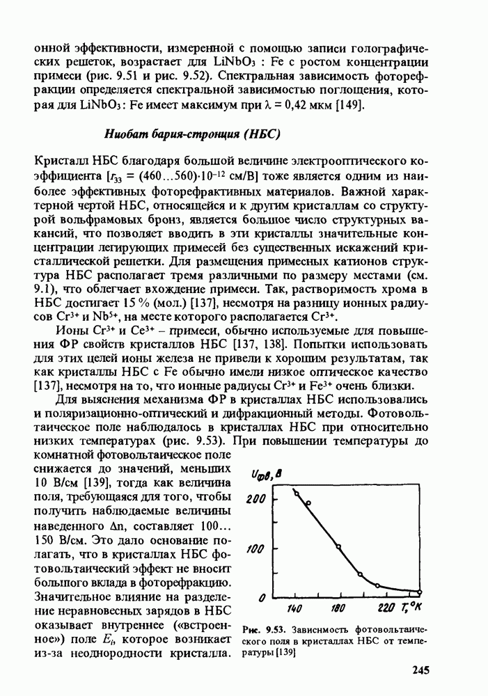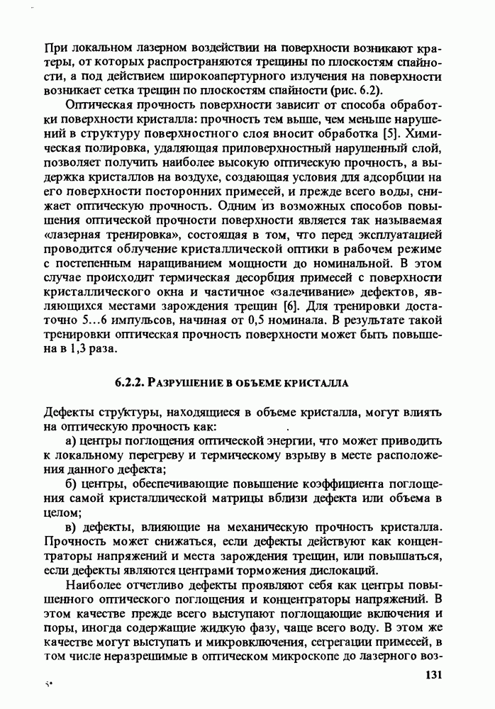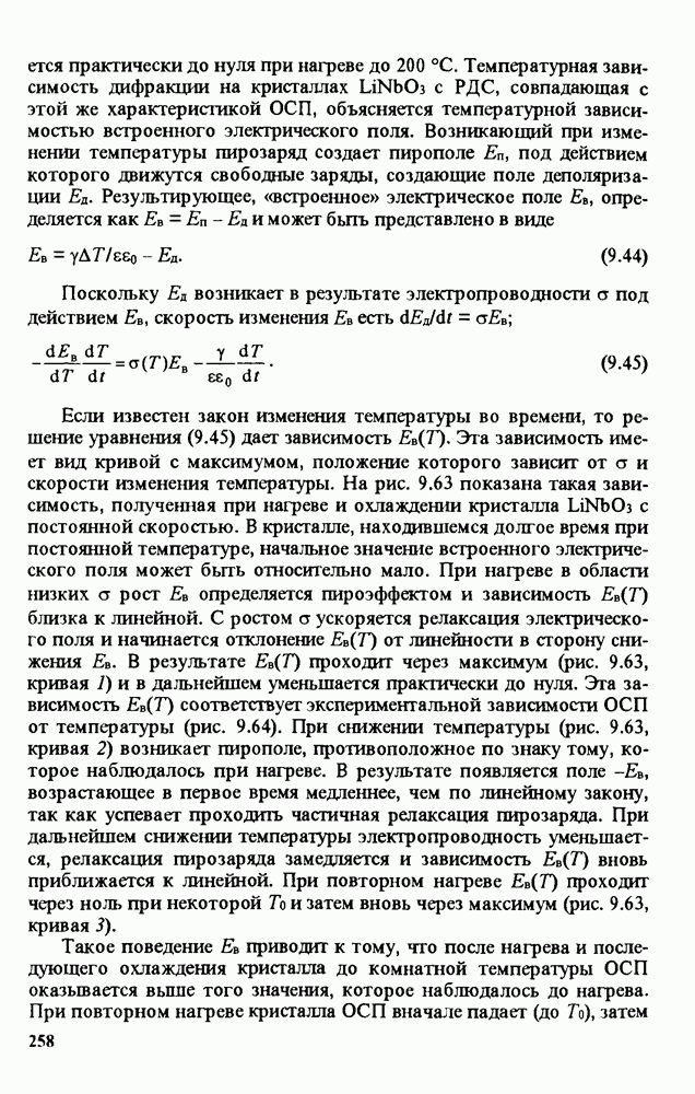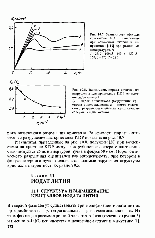 Рис. 9.62. Экспериментальная зависимость интенсивности света в данной точке ннтерферограммы от вращения плоскости поляризации падающего света для кристаллов с величиной ОСП, равной, В этих кристаллах оптическая неоднородность в основном определяется упругооптическим эффектом. Упругооптические коэффициенты относительно невелики и слабо зависят от типа кристалла. Поэтому оптическая неоднородность, вызванная только упругооптическим эффектом, относительно невелика. В этом случае оптическая неоднородность определяется остаточными упругими напряжениями. Эти напряжения весьма стабильны при низких температурах и могут изменяться только под действием высокотемпературного отжига. Поэтому и оптическая однородность этих кристаллов стабильна при низких (комнатных) температурах. Примером таких кристаллов являются Существенно меняется ситуация в кристаллах, обладающих сильным электрооптическим эффектом. При том же структурном совершенстве электрооптические кристаллы оказываются гораздо более неоднородными в оптическом отношении, чем кристаллы, не обладающие этим эффектом. Примером кристалла, в котором электрооптический эффект играет решающую роль в определении его оптической однородности, является ниобат лития. Важность этого кристалла для практического применения требует отдельного рассмотрения его оптической однородности и стабильности к внешним воздействиям. Однородность кристалла может меняться под воздействием внешних факторов, в частности, под действием температуры, электрических полей, оптического излучения. Воздействие мощного лазерного излучения может приводить как к необратимым изменениям оптических свойств, так и к потере сплошности кристалл, к их разрушению. Поэтому для характеристики устойчивости кристалла к воздействию оптического излучения используются две характеристики: 1. Лазерная (оптическая) стойкость, определяемая как изменение контрастности под действием света. Оценивается мощность или энергия импульсов света, для которых изменение контрастности не превосходит определенную величину (обычно 0,005). 2. Лазерная (оптическая) прочность, определяемая как пороговая энергия, которую выдерживает оптический элемент до появления необратимых разрушений (пор, трещин). При задании этой характеристики рекомендуется указывать режим испытаний (длительность импульсов, их скважность, апертуру излучения и т. д.). Хороший оптический материал должен иметь оптическую прочность в импульсном режиме не менее