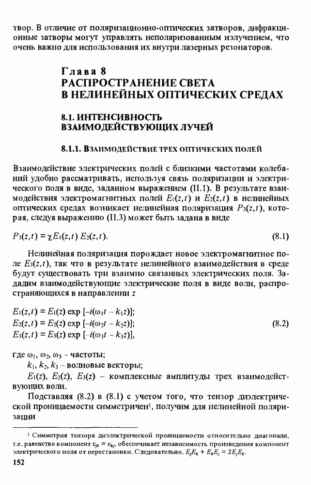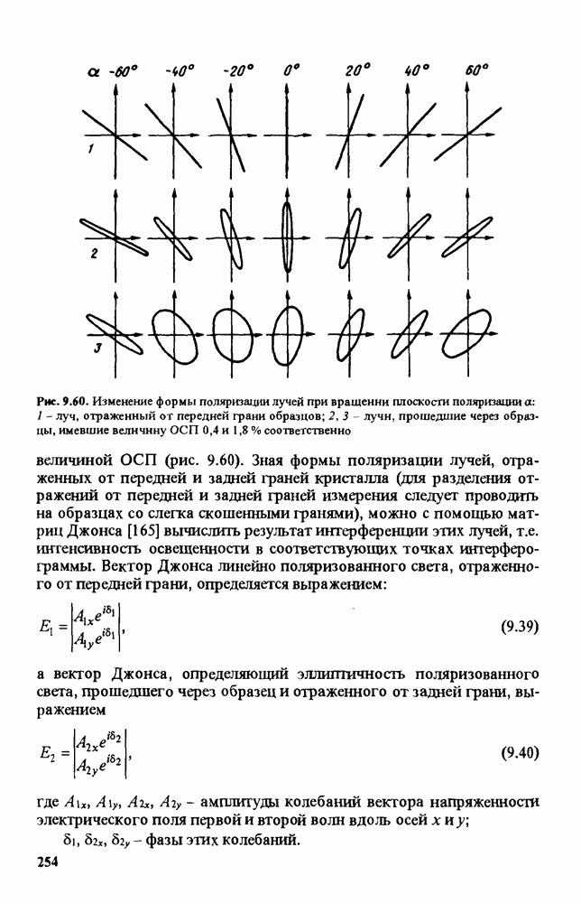 Рис. 9.60. Изменение формы поляризации лучей при вращении плоскости поляризации а: I - луч, отраженный от передней грани образцов; 2,3 - лучн, прошедшие через образцы, имевшие величину ОСП 0,4 и 1,8 % соответственно величиной ОСП (рис. 9.60). Зная формы поляризации лучей, отраженных от передней и задней граней кристалла (для разделения отражений от передней и задней граней измерения следует проводить на образцах со слегка скошенными гранями), можно с помощью матриц Джонса [165] вычислить результат интерференции этих лучей, т.е. интенсивность освещенности в соответствующих точках интерферограммы. Вектор Джонса линейно поляризованного света, отраженного от передней грани, определяется выражением:
