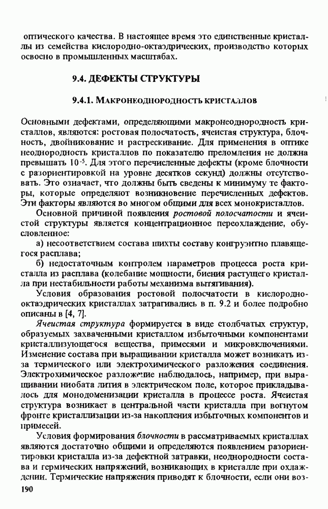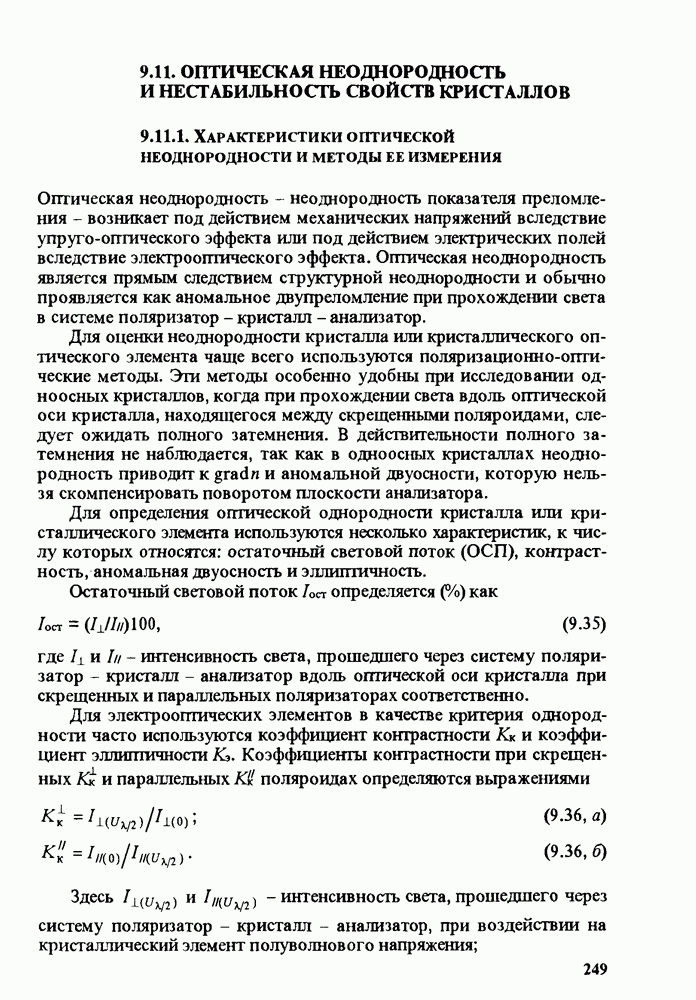9.11. ОПТИЧЕСКАЯ НЕОДНОРОДНОСТЬ И НЕСТАБИЛЬНОСТЬ СВОЙСТВ КРИСТАЛЛОВ9.11.1. ХАРАКТЕРИСТИКА ОПТИЧЕСКОЙ НЕОДНОРОДНОСТИ И МЕТОДЫ ЕЕ ИЗМЕРЕНИЯОптическая неоднородность - неоднородность показателя преломления - возникает под действием механических напряжений вследствие упруго-оптического эффекта или под действием электрических полей вследствие электрооптического эффекта. Оптическая неоднородность является прямым следствием структурной неоднородности и обычно проявляется как аномальное двупреломление при прохождении света в системе поляризатор - кристалл - анализатор. Для оценки неоднородности кристалла или кристаллического оптического элемента чаще всего используются поляризационно-оптические методы. Эти методы особенно удобны при исследовании одноосных кристаллов, когда при прохождении света вдоль оптической оси кристалла, находящегося между скрещенными поляроидами, следует ожидать полного затемнения. В действительности полного затемнения не наблюдается, так как в одноосных кристаллах неоднородность приводит к Для определения оптической однородности кристалла или кристаллического элемента используются несколько характеристик, к числу которых относятся: остаточный световой поток (ОСП), контрастность, аномальная двуосность и эллиптичность. Остаточный световой поток