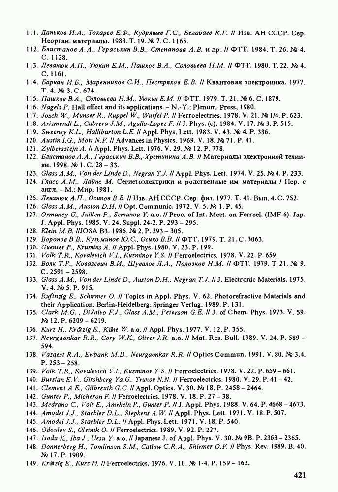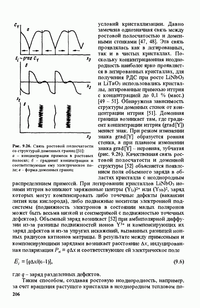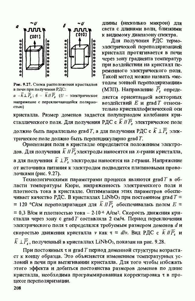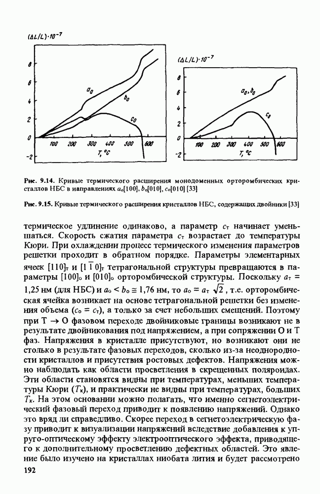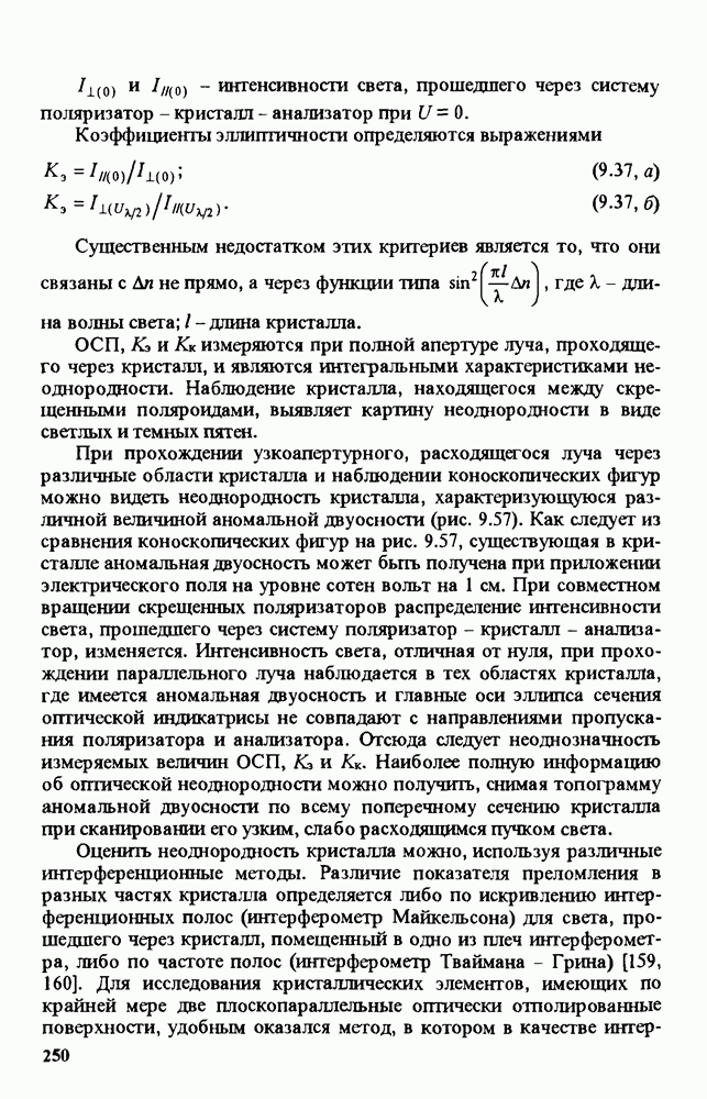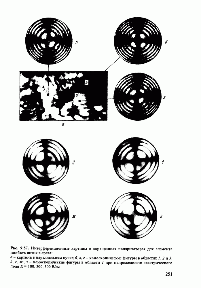 Существенным недостатком этих критериев является то, что они связаны с ОСП При прохождении узкоапертурного, расходящегося луча через различные области кристалла и наблюдении коноскопических фигур можно видеть неоднородность кристалла, характеризующуюся различной величиной аномальной двуосности (рис. 9.57). Как следует из сравнения коноскопических фигур на рис. 9.57, существующая в кристалле аномальная двуосность может быть получена при приложении электрического поля на уровне сотен вольт на 1 см. При совместном вращении скрещенных поляризаторов распределение интенсивности света, прошедшего через систему поляризатор - кристалл - анализатор, изменяется. Интенсивность света, отличная от нуля, при прохождении параллельного луча наблюдается в тех областях кристалла, где имеется аномальная двуосность и главные оси эллипса сечения оптической индикатрисы не совпадают с направлениями пропускания поляризатора и анализатора. Отсюда следует неоднозначность измеряемых величин Оценить неоднородность кристалла можно, используя различные интерференционные методы. Различие показателя преломления в разных частях кристалла определяется либо по искривлению интерференционных полос (интерферометр Майкельсона) для света, прошедшего через кристалл, помещенный в одно из плеч интерферометра, либо по частоте полос (интерферометр Тваймана - Грина) [159, 160]. Для исследования кристаллических элементов, имеющих по крайней мере две плоскопараллельные оптически отполированные поверхности, удобным оказался метод, в котором в качестве