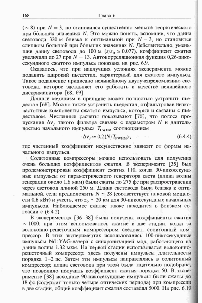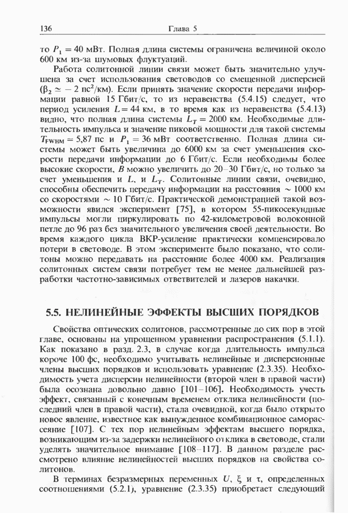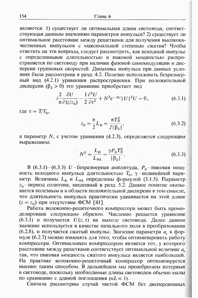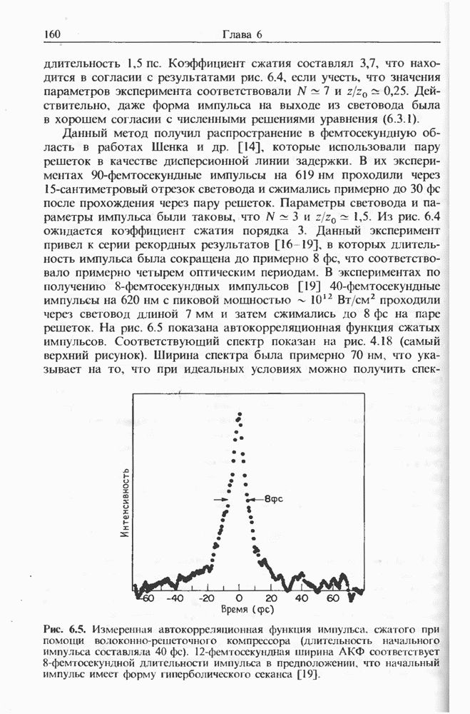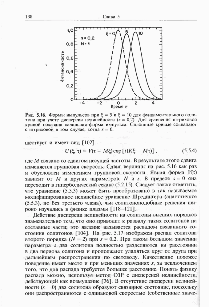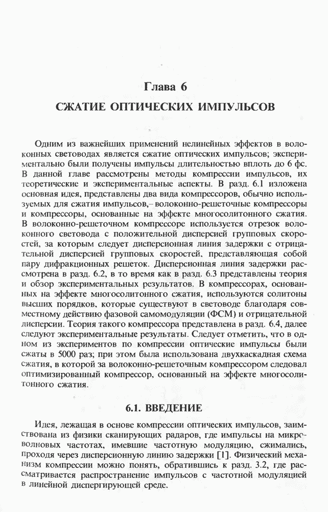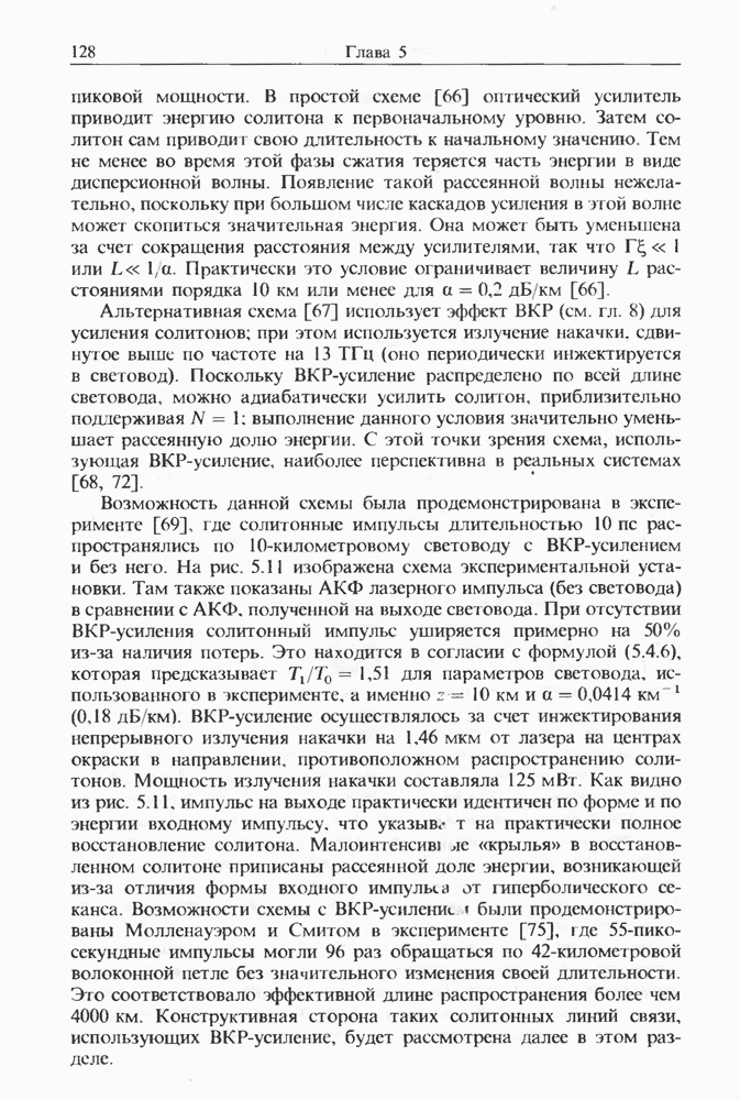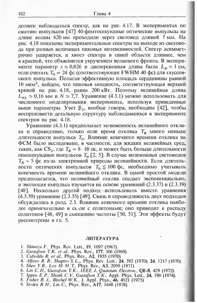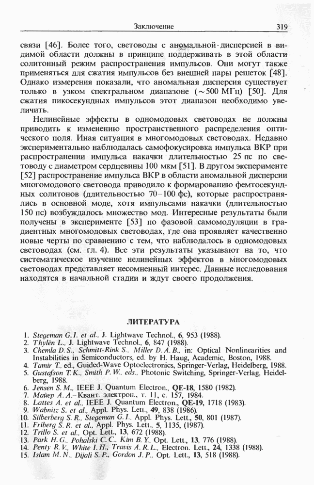Подводя итоги данной главы, отметим, что ВКР сверхкоротких импульсов в области отрицательной дисперсии световодов это нелинейное явление, при котором могут генерироваться сверхкороткие солитоноподобные импульсы длительностью менее Эти солитоны нужно отличать от солитонов ВКР, возникающих в молекулярных газах [139]. Там время отклика среды больше длительности солитона, и необходимо учитывать динамику колебательных мод, участвующих в процессе ВКР [139 - 141] В случае световодов время комбинационного отклика много меньше длительности солитона.