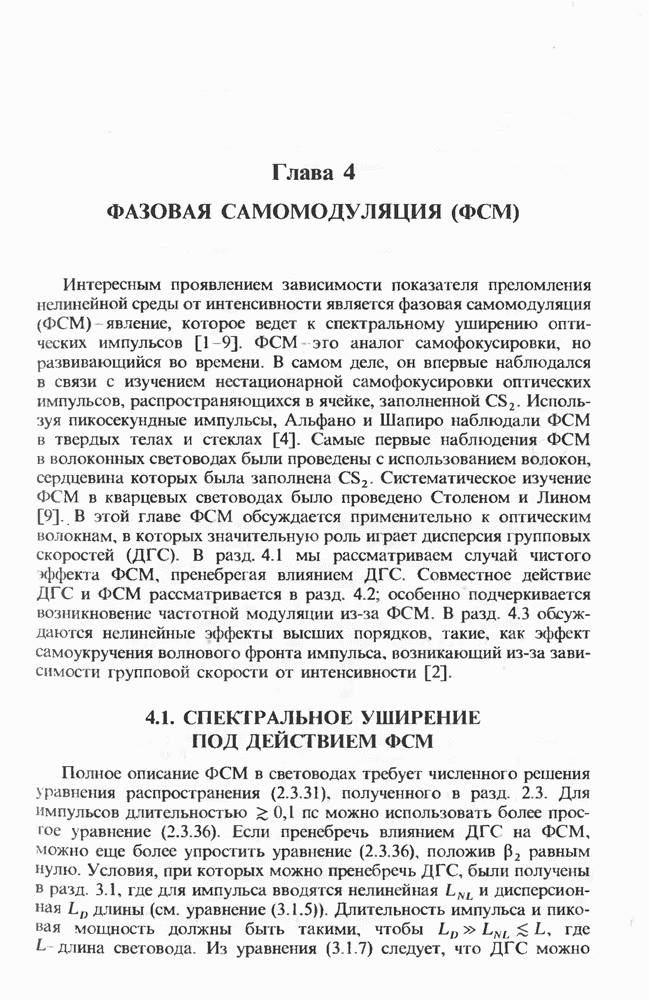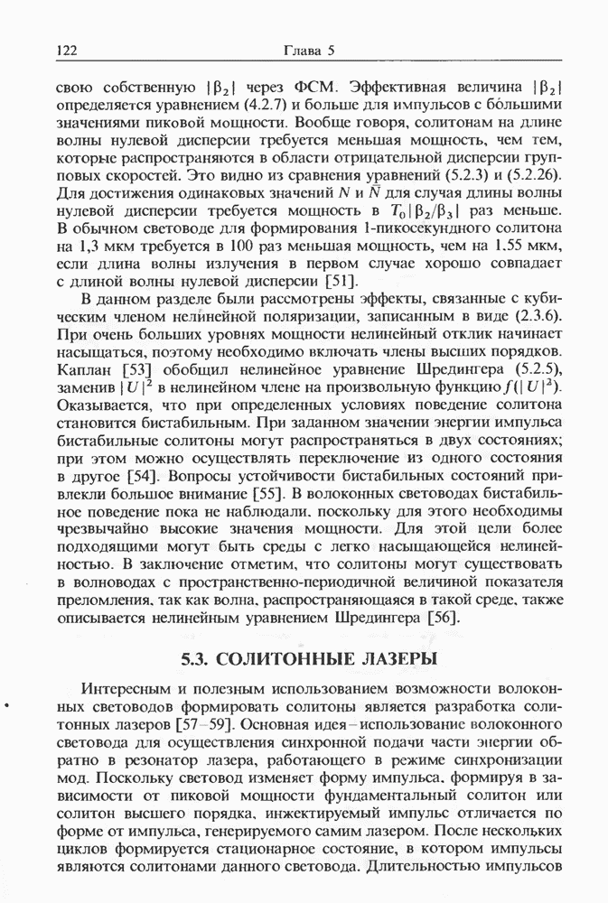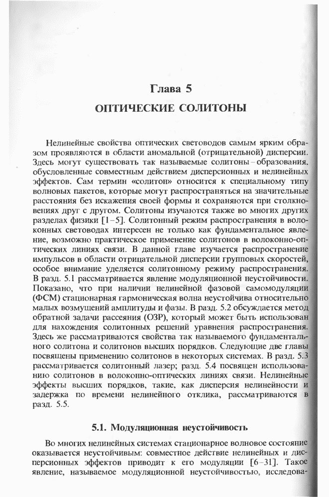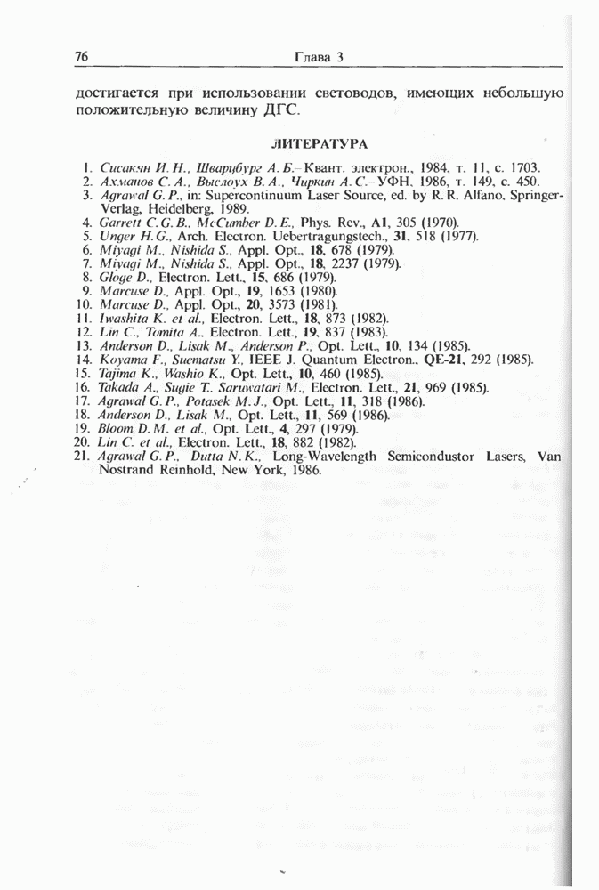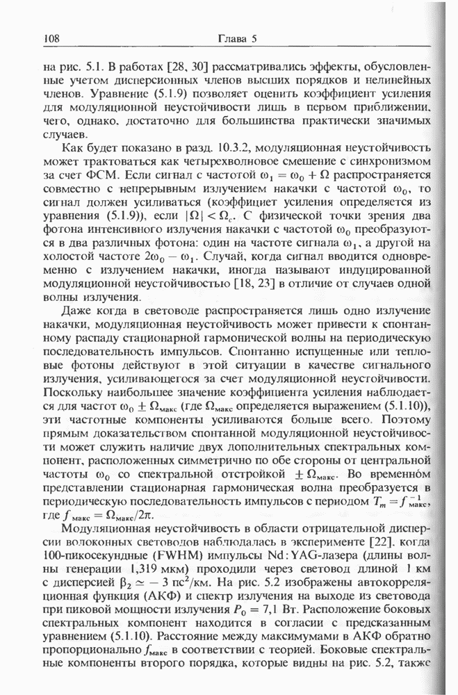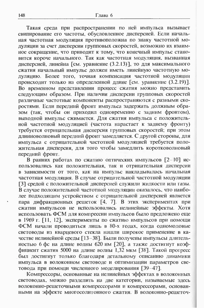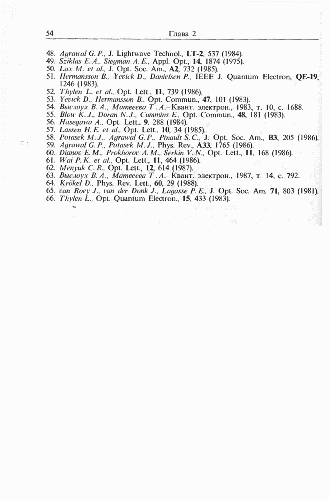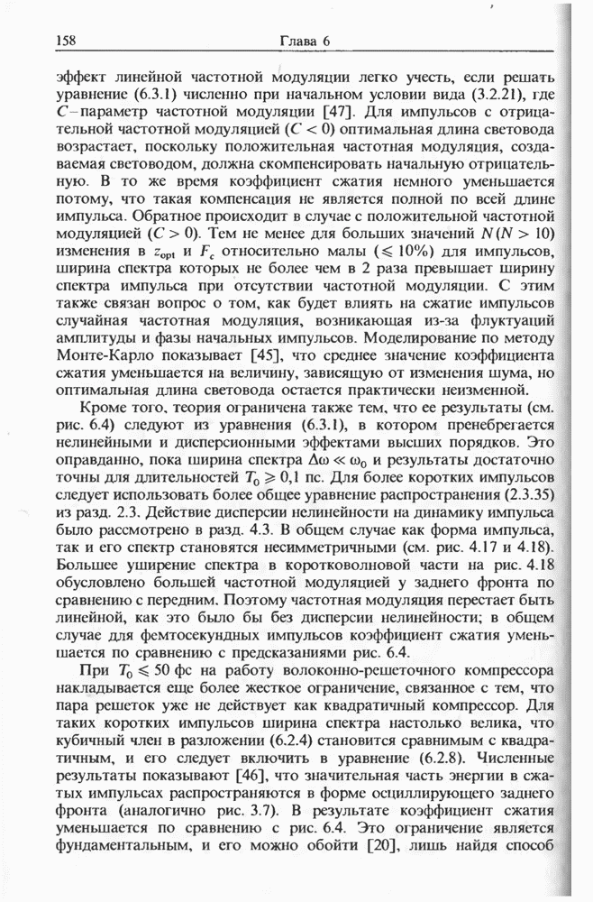 Подводя итоги данной главы, отметим, что ВКР сверхкоротких импульсов в области отрицательной дисперсии световодов это нелинейное явление, при котором могут генерироваться сверхкороткие солитоноподобные импульсы длительностью менее Эти солитоны нужно отличать от солитонов ВКР, возникающих в молекулярных газах [139]. Там время отклика среды больше длительности солитона, и необходимо учитывать динамику колебательных мод, участвующих в процессе ВКР [139 - 141] В случае световодов время комбинационного отклика много меньше длительности солитона.