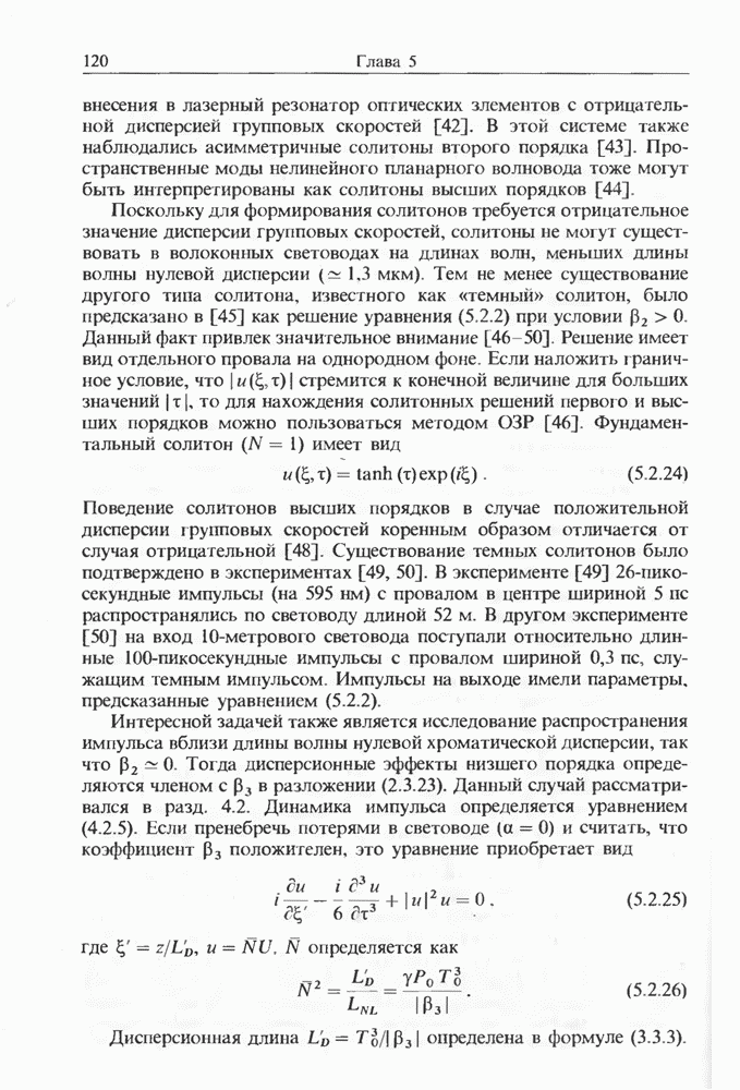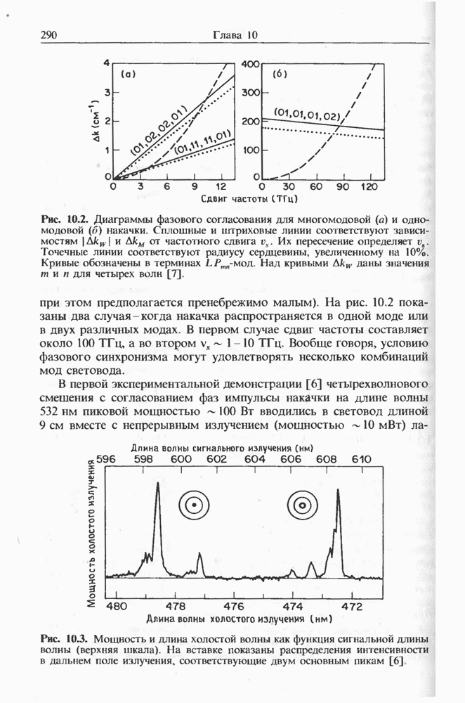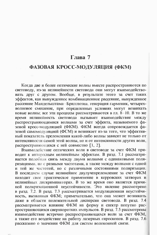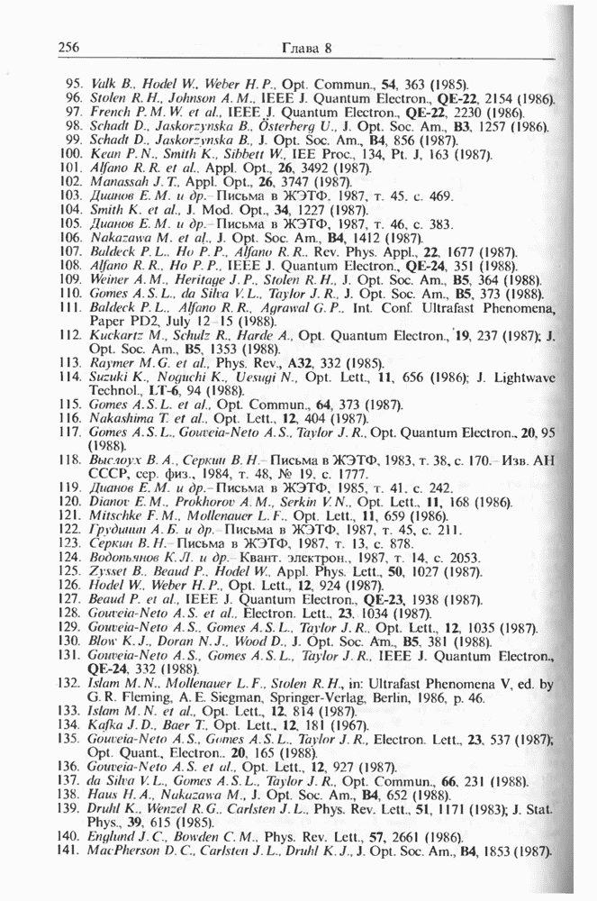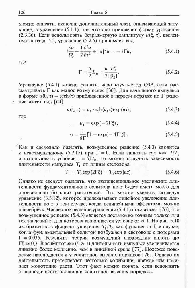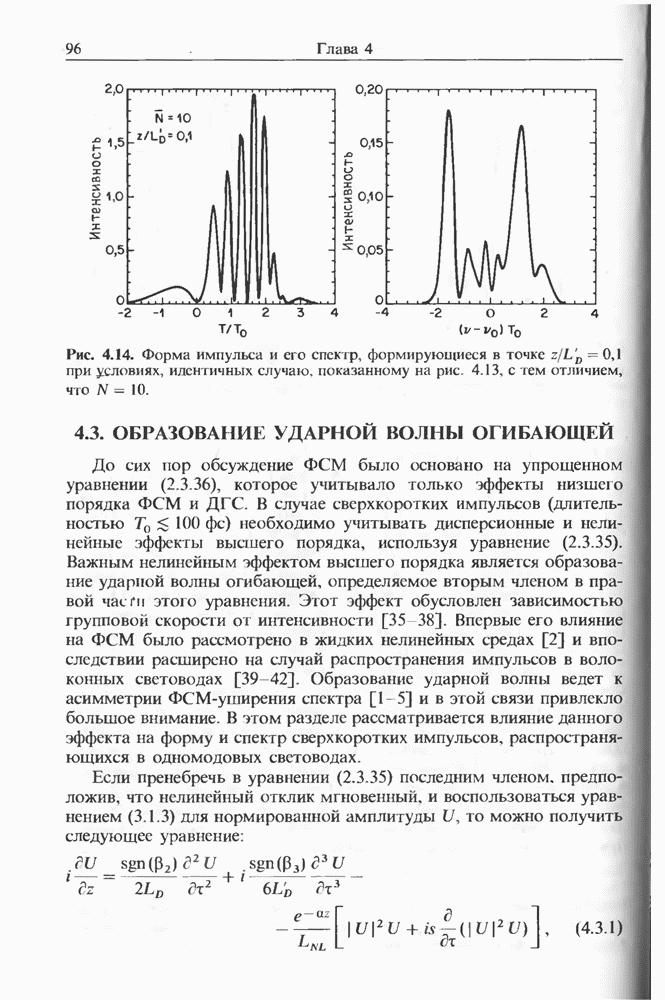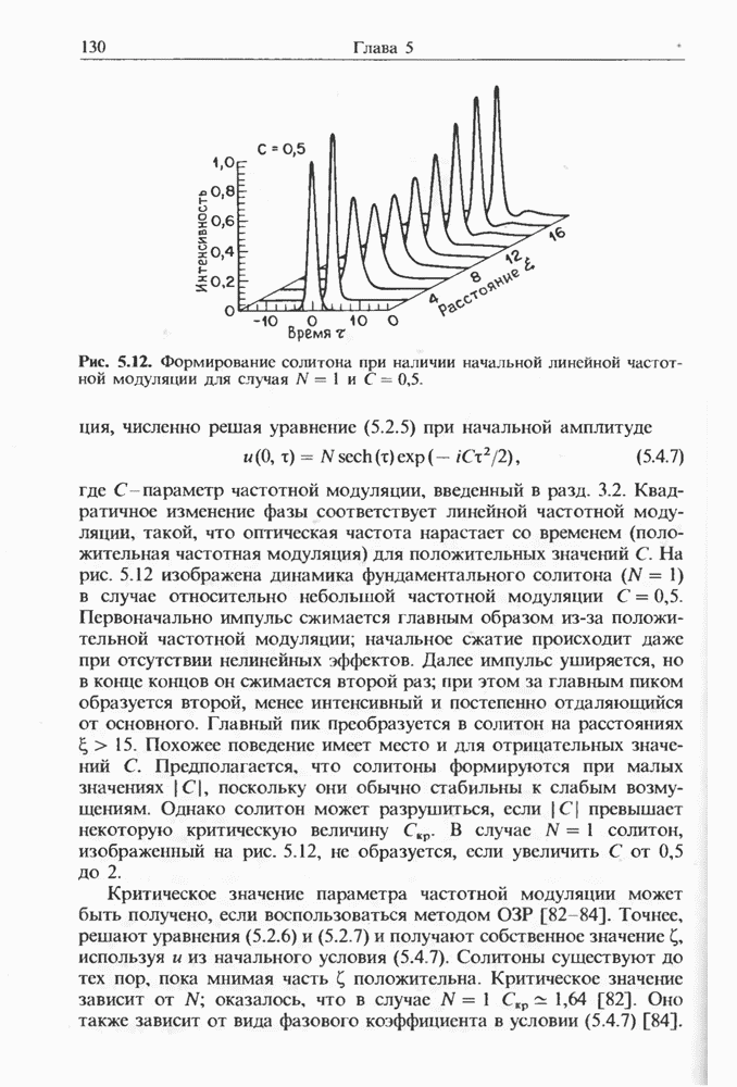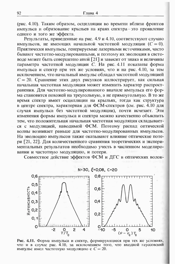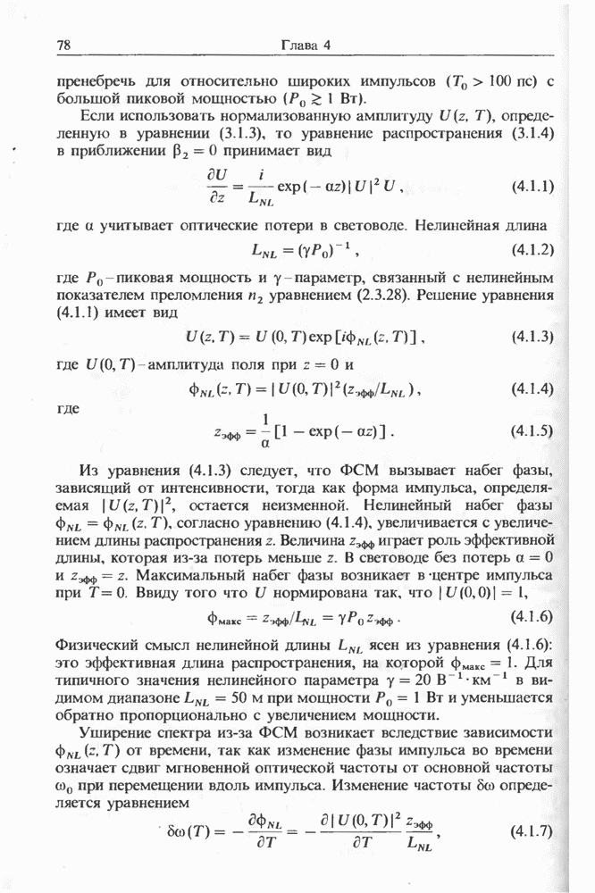 Подводя итоги данной главы, отметим, что ВКР сверхкоротких импульсов в области отрицательной дисперсии световодов это нелинейное явление, при котором могут генерироваться сверхкороткие солитоноподобные импульсы длительностью менее Эти солитоны нужно отличать от солитонов ВКР, возникающих в молекулярных газах [139]. Там время отклика среды больше длительности солитона, и необходимо учитывать динамику колебательных мод, участвующих в процессе ВКР [139 - 141] В случае световодов время комбинационного отклика много меньше длительности солитона.