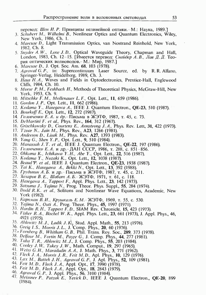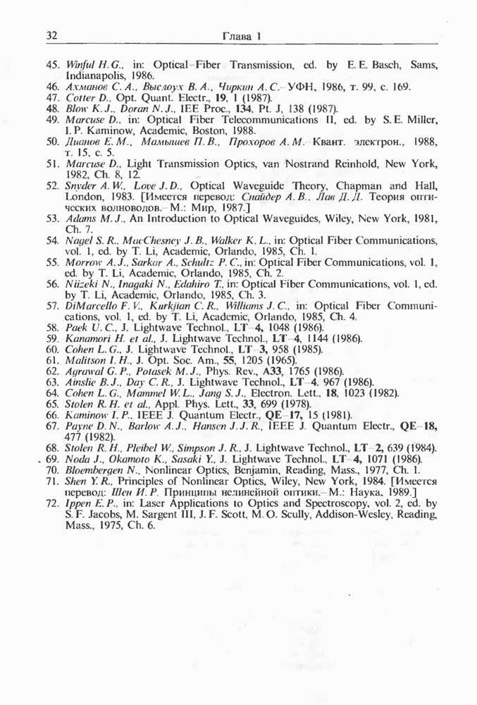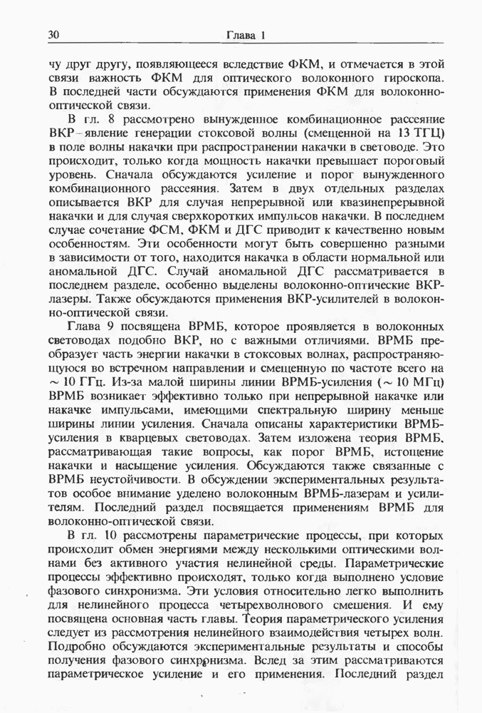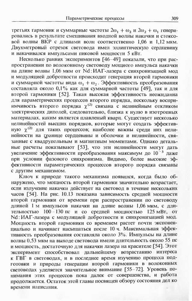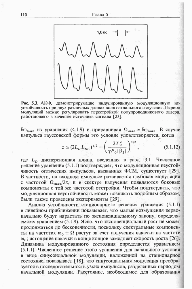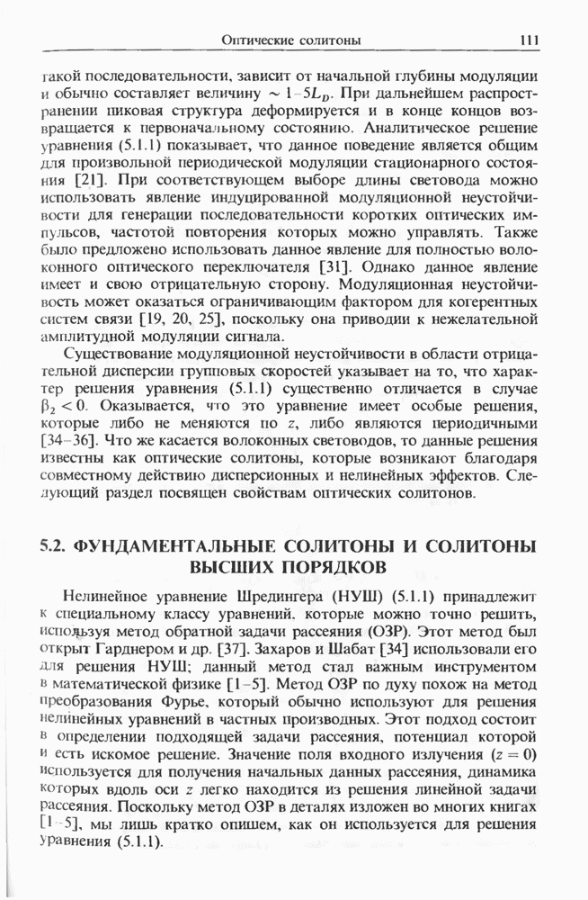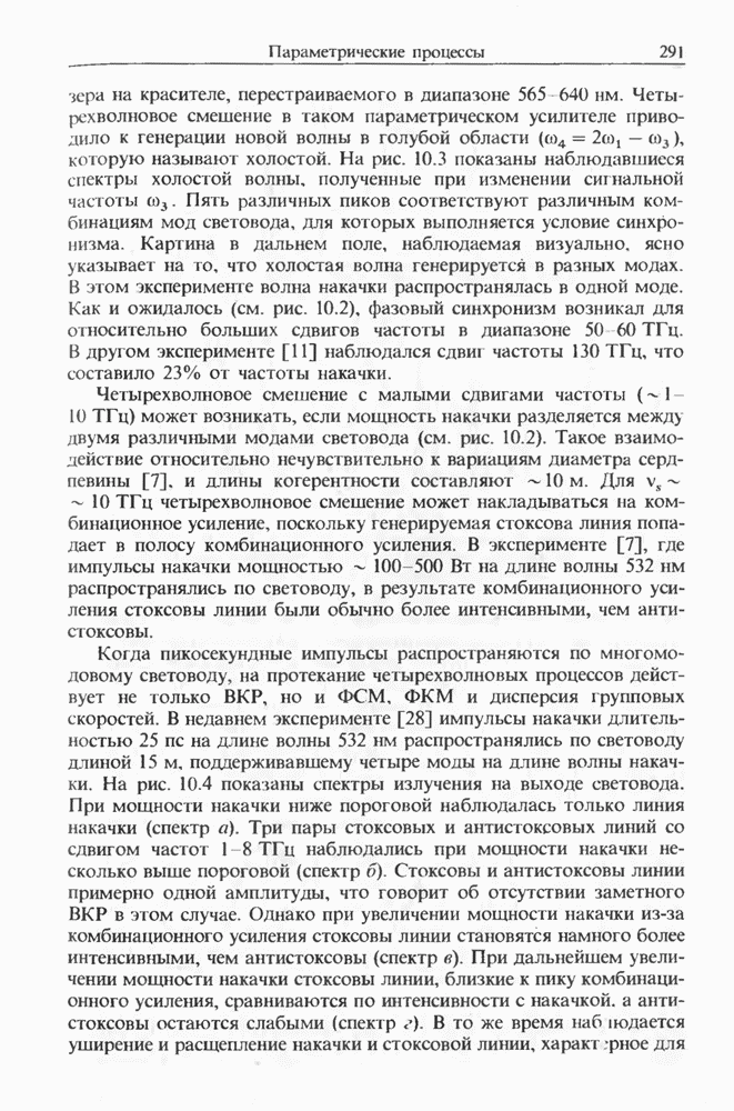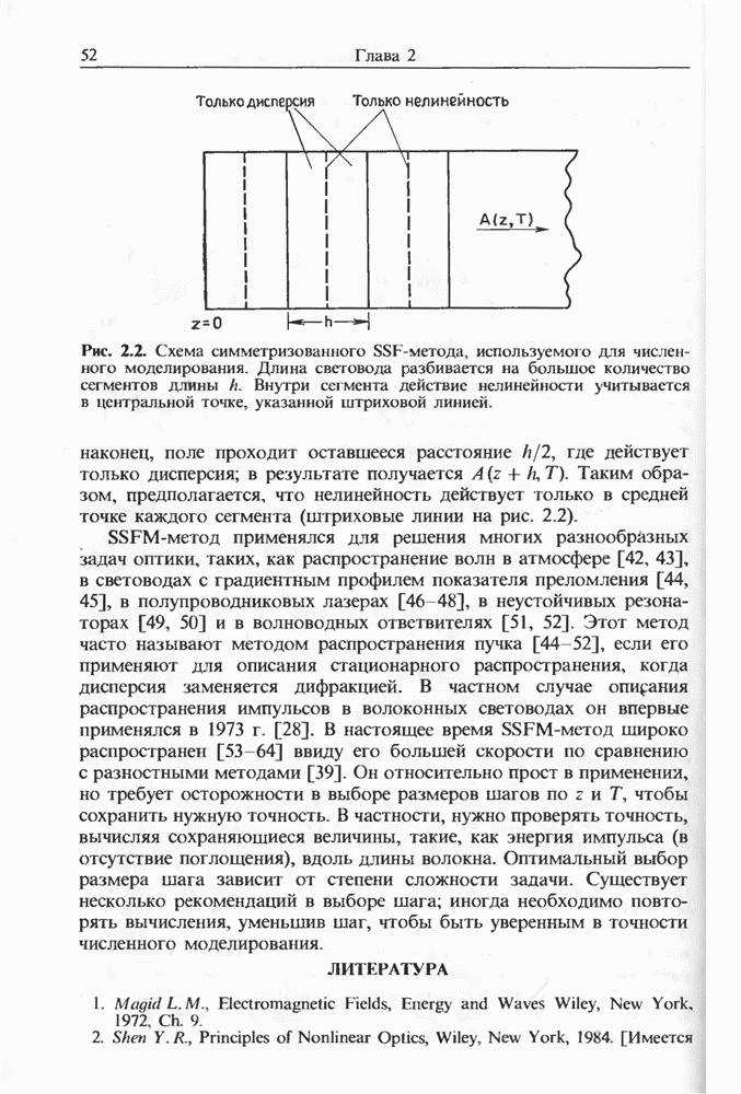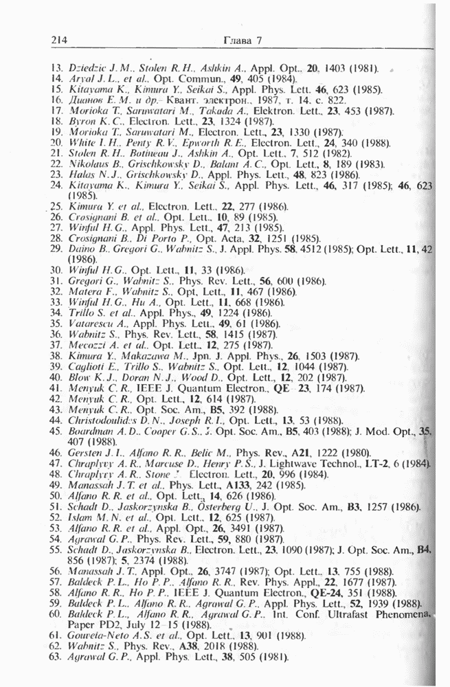 Подводя итоги данной главы, отметим, что ВКР сверхкоротких импульсов в области отрицательной дисперсии световодов это нелинейное явление, при котором могут генерироваться сверхкороткие солитоноподобные импульсы длительностью менее Эти солитоны нужно отличать от солитонов ВКР, возникающих в молекулярных газах [139]. Там время отклика среды больше длительности солитона, и необходимо учитывать динамику колебательных мод, участвующих в процессе ВКР [139 - 141] В случае световодов время комбинационного отклика много меньше длительности солитона.