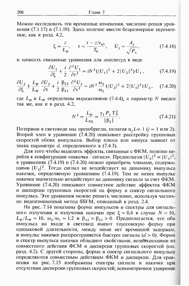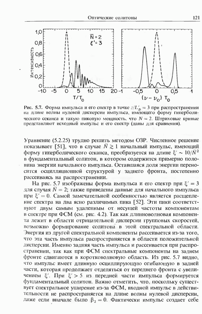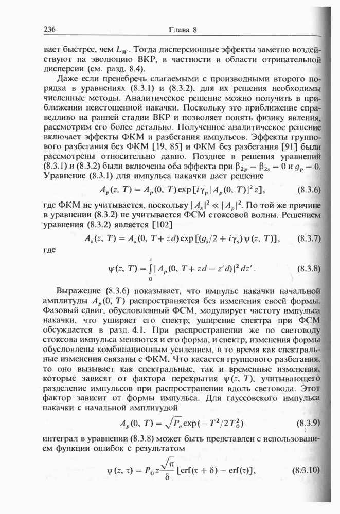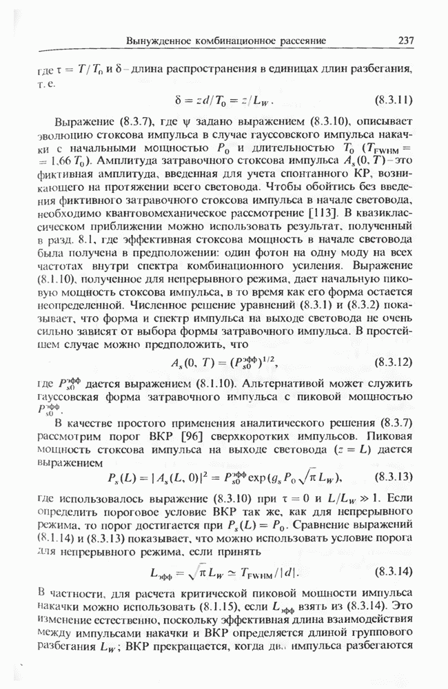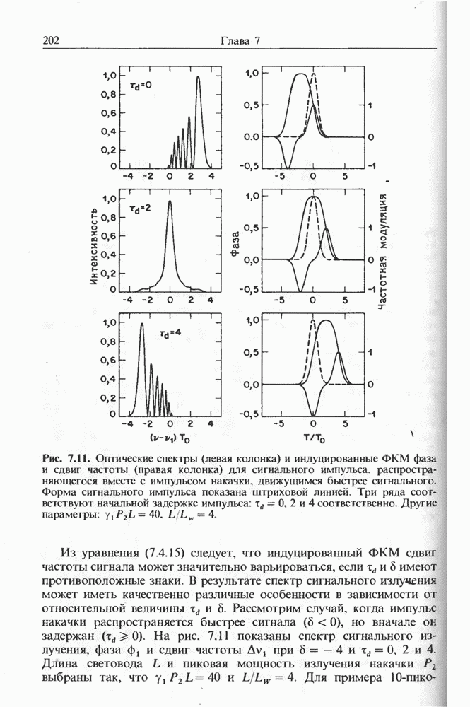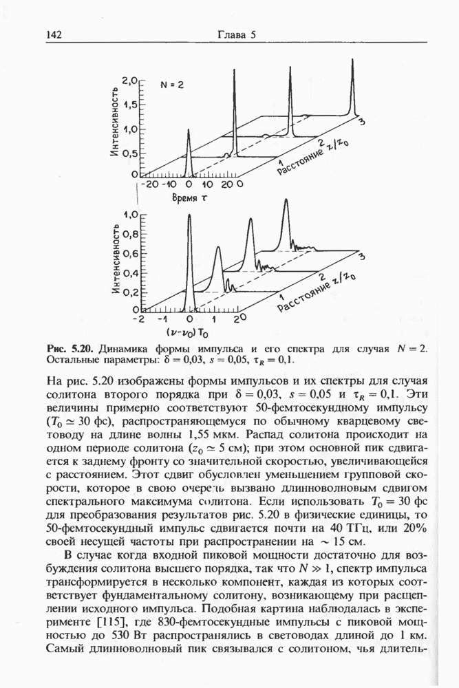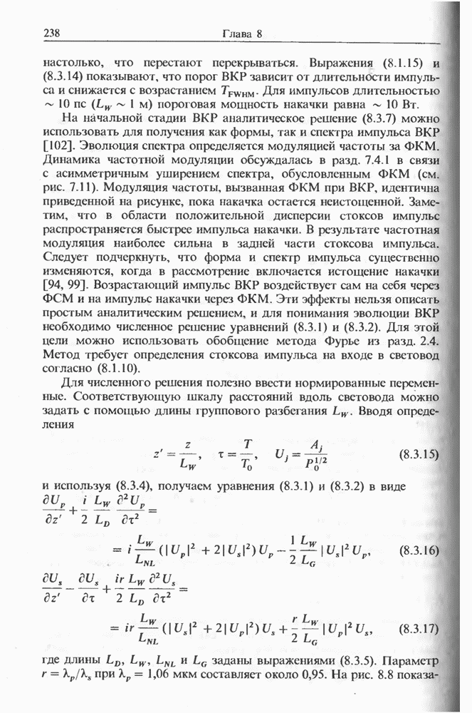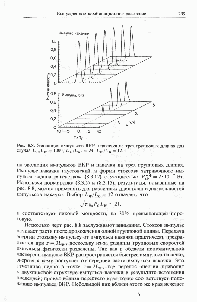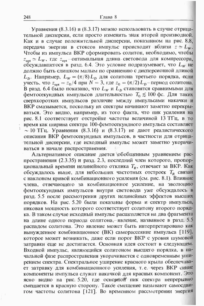 Уравнения (8 3.16) и (8.3.17) можно использовать в случае отрицательной дисперсии, если просто изменить знак второй производной. Как и в случае положительной дисперсии, показанном на рис. 8.8, передача энергии в стоксов импульс происходит вблизи Чтобы из импульса ВКР сформировать солитон, необходимо, чтобы где оптимальная длина световода для компрессора, обсуждавшегося в разд. 6.4 Это условие подразумевает, что не должно быть слишком малым по сравнению с дисперсионной длиной Например, для солитона третьего порядка, если учесть, что при где период солитона. В разд. 6.4 было показано, что и становятся сравнимыми для фемтосекундных импульсов длительностью Для таких сверхкоротких импульсов различие между импульсами накачки и ВКР смазывается, поскольку их спектры начинают заметно перекрываться. Это видно, например, из того факта, что пик усиления на рис. 8.1 соответствует отстройке частоты величиной в то время как ширина спектра -фемтосекундного импульса составляет Уравнения (8.3.16) и (8.3.17) не дают реалистического описания ВКР фемтосекундных импульсов, в частности для отрицательной дисперсии, где исходный импульс может заметно укорачиваться в начале распространения.