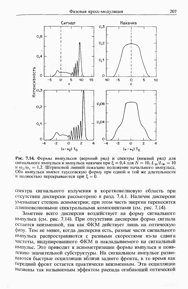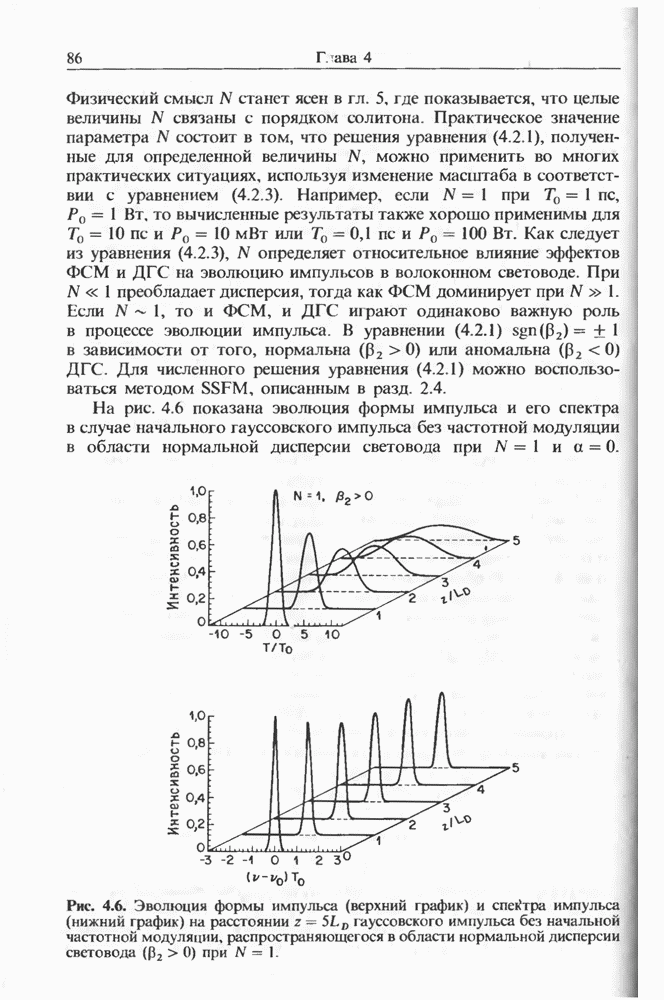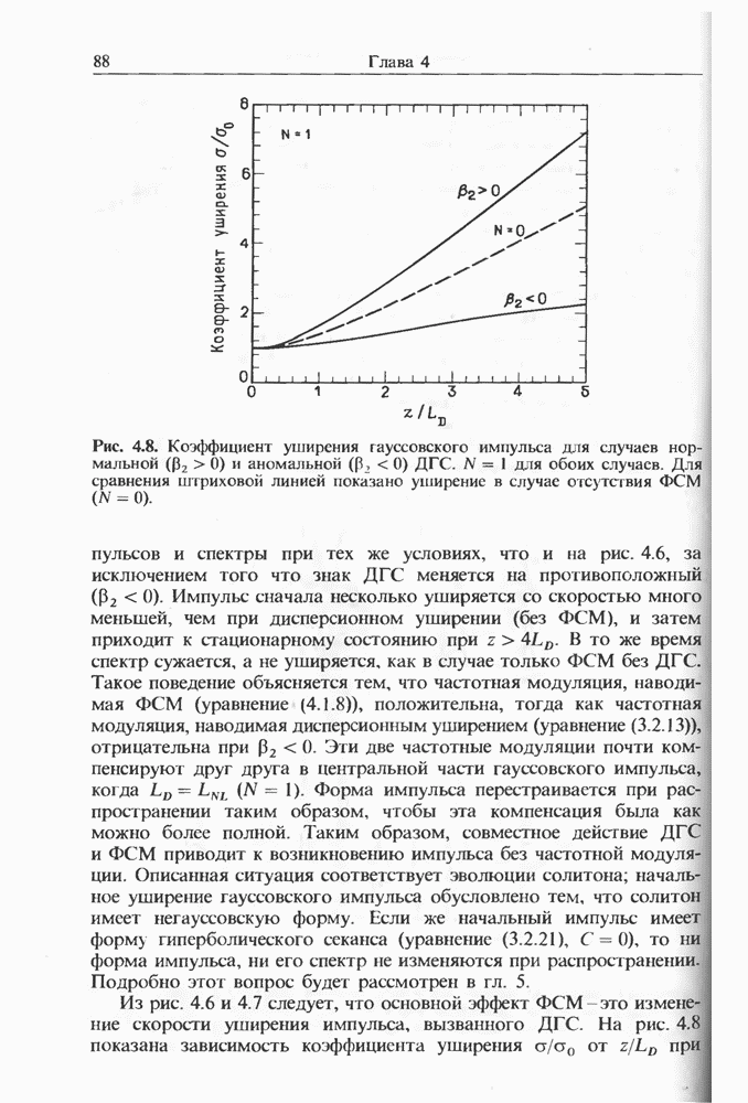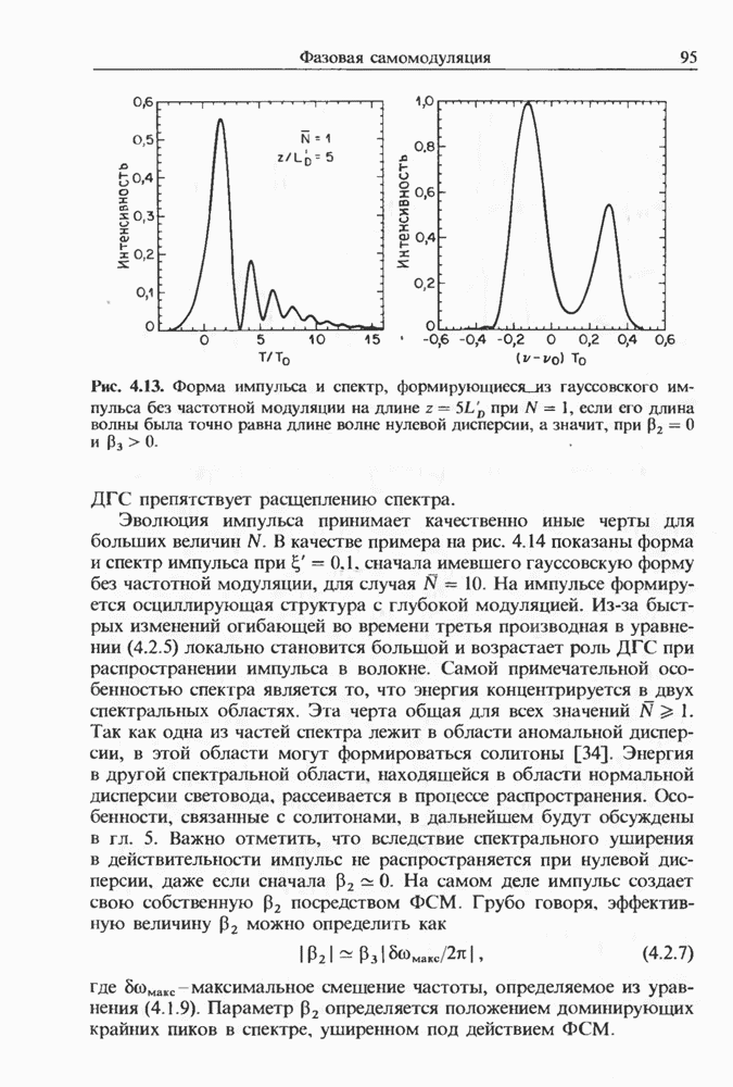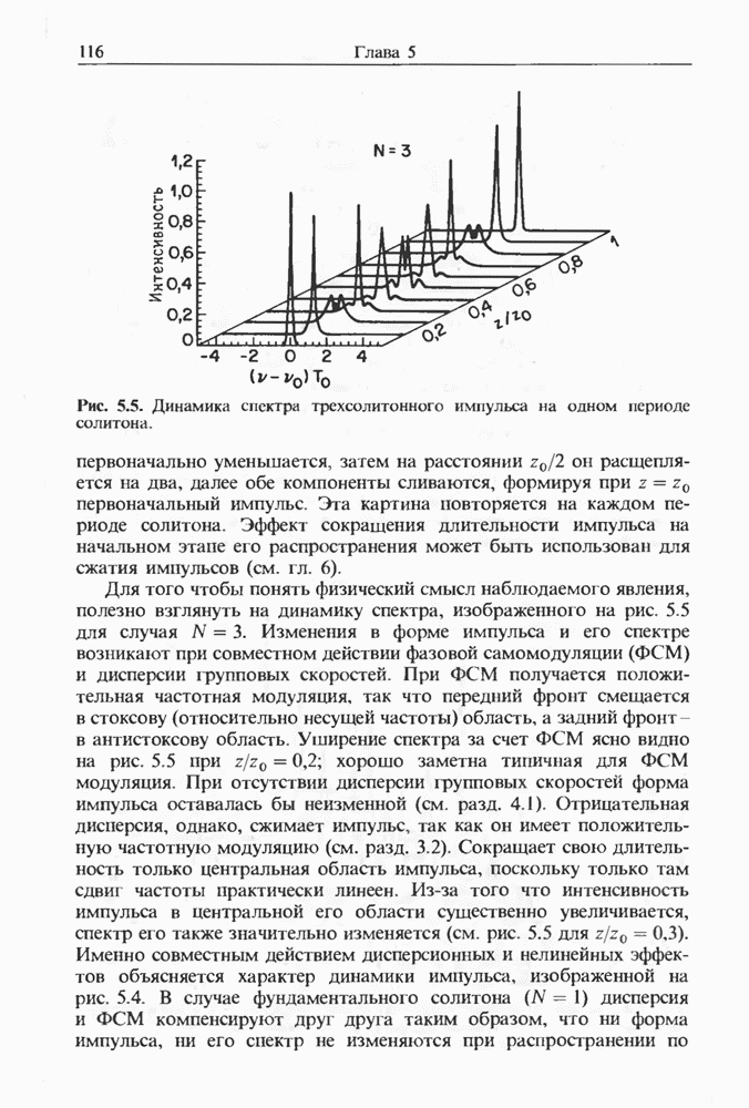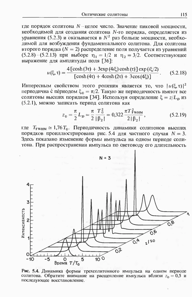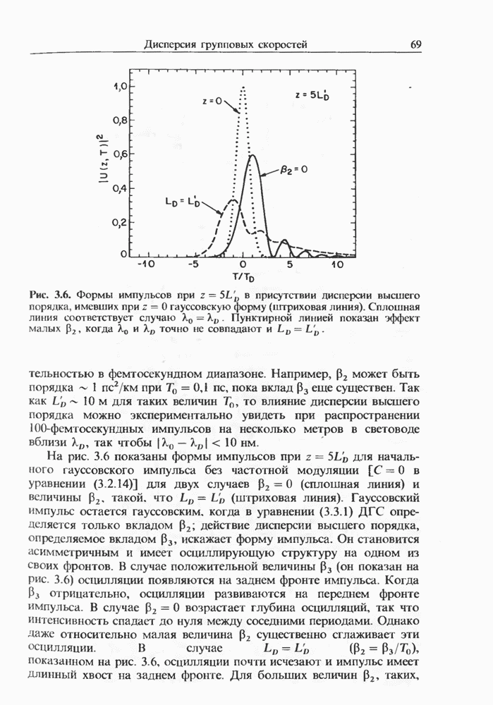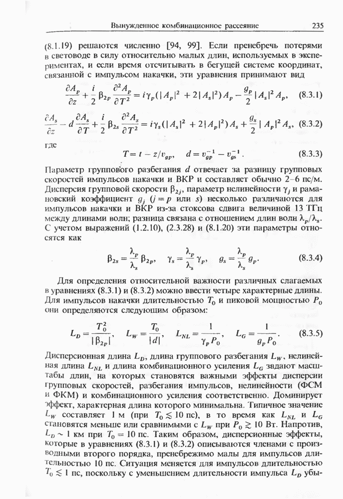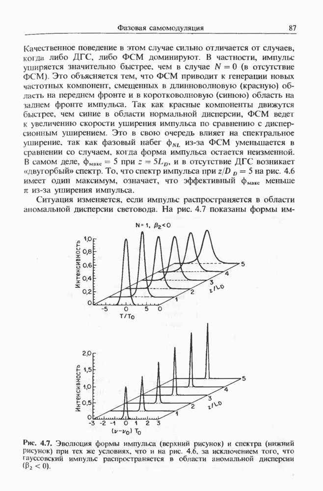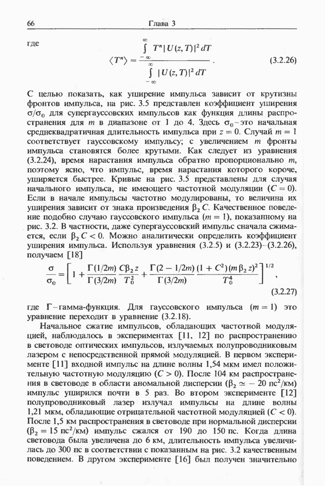 Уравнения (8 3.16) и (8.3.17) можно использовать в случае отрицательной дисперсии, если просто изменить знак второй производной. Как и в случае положительной дисперсии, показанном на рис. 8.8, передача энергии в стоксов импульс происходит вблизи Чтобы из импульса ВКР сформировать солитон, необходимо, чтобы где оптимальная длина световода для компрессора, обсуждавшегося в разд. 6.4 Это условие подразумевает, что не должно быть слишком малым по сравнению с дисперсионной длиной Например, для солитона третьего порядка, если учесть, что при где период солитона. В разд. 6.4 было показано, что и становятся сравнимыми для фемтосекундных импульсов длительностью Для таких сверхкоротких импульсов различие между импульсами накачки и ВКР смазывается, поскольку их спектры начинают заметно перекрываться. Это видно, например, из того факта, что пик усиления на рис. 8.1 соответствует отстройке частоты величиной в то время как ширина спектра -фемтосекундного импульса составляет Уравнения (8.3.16) и (8.3.17) не дают реалистического описания ВКР фемтосекундных импульсов, в частности для отрицательной дисперсии, где исходный импульс может заметно укорачиваться в начале распространения.