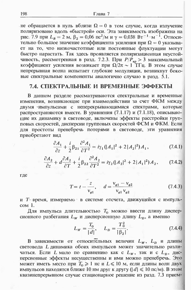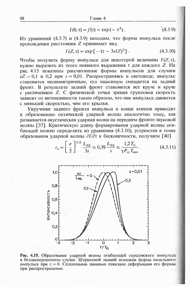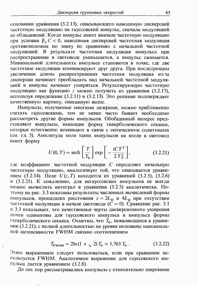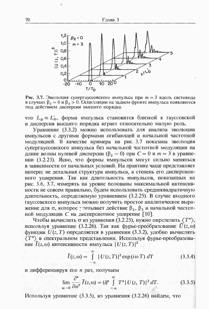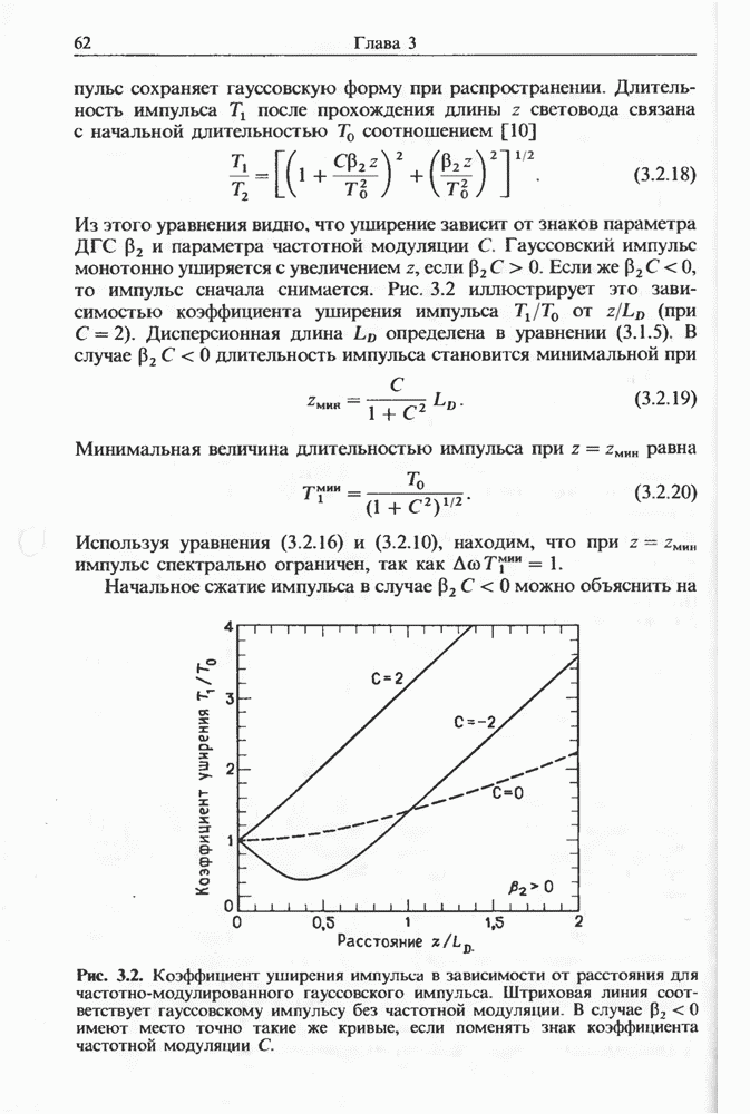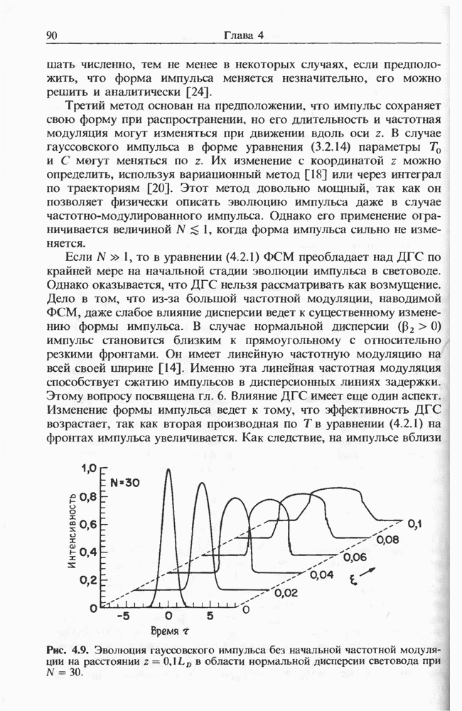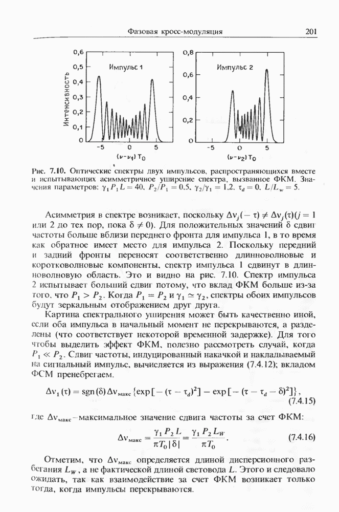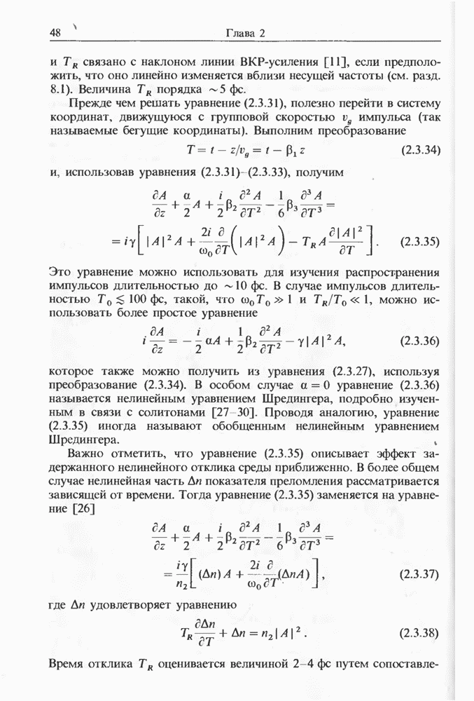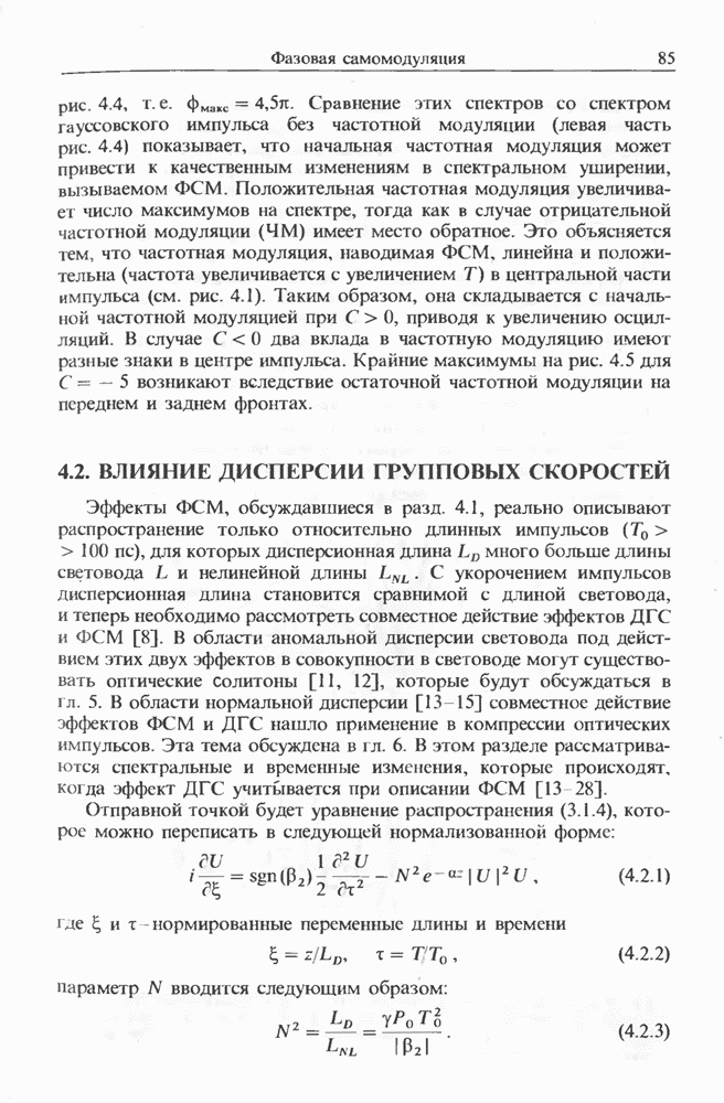 Уравнения (8 3.16) и (8.3.17) можно использовать в случае отрицательной дисперсии, если просто изменить знак второй производной. Как и в случае положительной дисперсии, показанном на рис. 8.8, передача энергии в стоксов импульс происходит вблизи Чтобы из импульса ВКР сформировать солитон, необходимо, чтобы где оптимальная длина световода для компрессора, обсуждавшегося в разд. 6.4 Это условие подразумевает, что не должно быть слишком малым по сравнению с дисперсионной длиной Например, для солитона третьего порядка, если учесть, что при где период солитона. В разд. 6.4 было показано, что и становятся сравнимыми для фемтосекундных импульсов длительностью Для таких сверхкоротких импульсов различие между импульсами накачки и ВКР смазывается, поскольку их спектры начинают заметно перекрываться. Это видно, например, из того факта, что пик усиления на рис. 8.1 соответствует отстройке частоты величиной в то время как ширина спектра -фемтосекундного импульса составляет Уравнения (8.3.16) и (8.3.17) не дают реалистического описания ВКР фемтосекундных импульсов, в частности для отрицательной дисперсии, где исходный импульс может заметно укорачиваться в начале распространения.