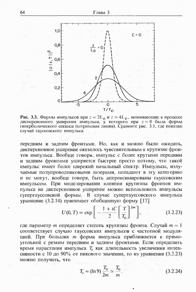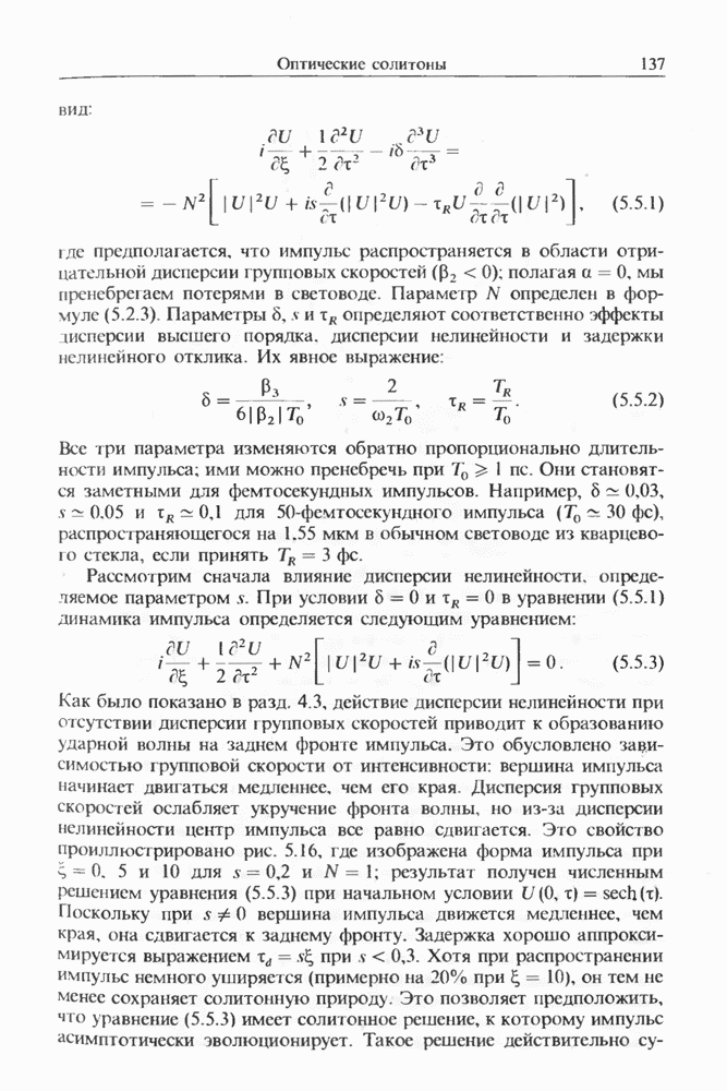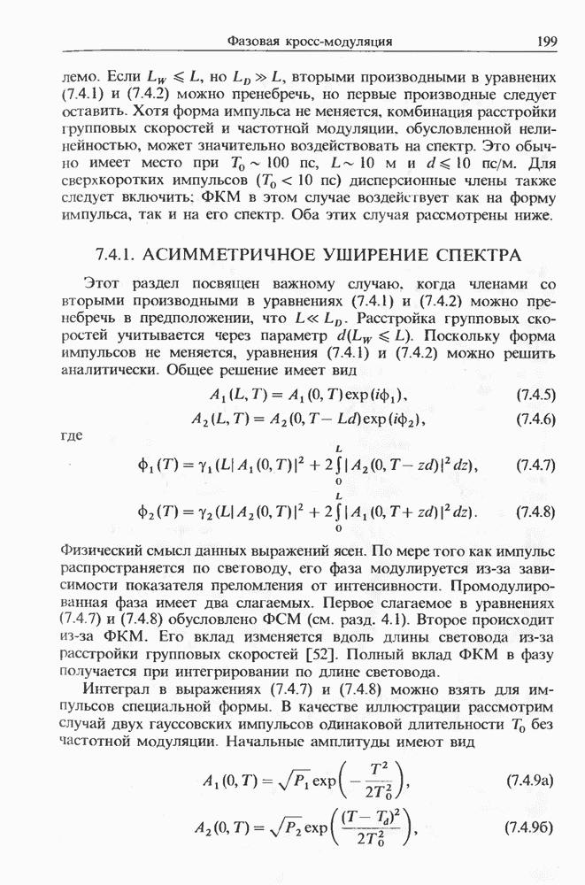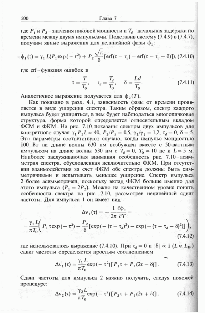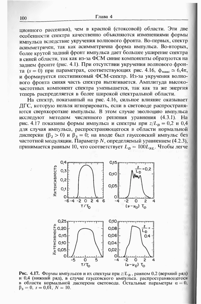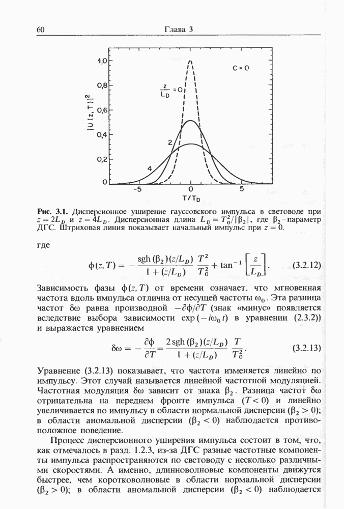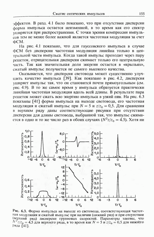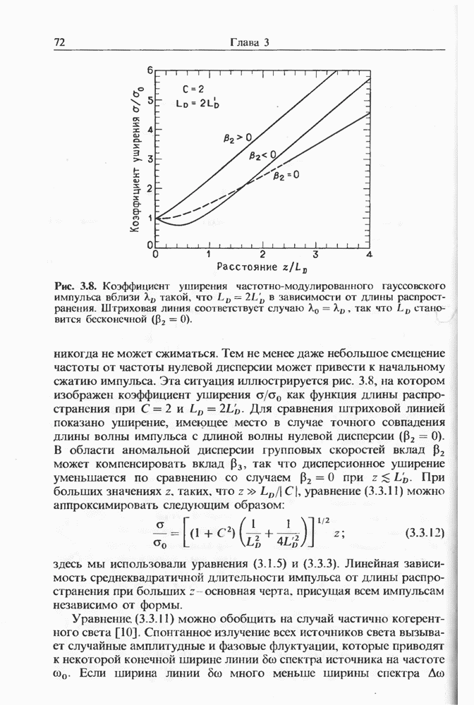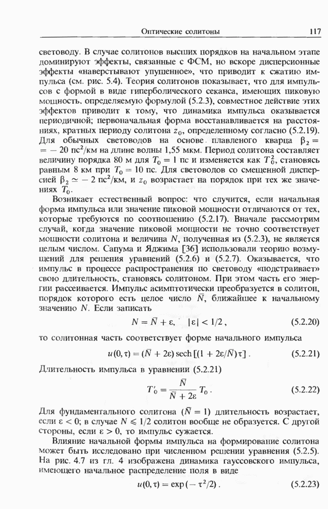 Уравнения (8 3.16) и (8.3.17) можно использовать в случае отрицательной дисперсии, если просто изменить знак второй производной. Как и в случае положительной дисперсии, показанном на рис. 8.8, передача энергии в стоксов импульс происходит вблизи Чтобы из импульса ВКР сформировать солитон, необходимо, чтобы где оптимальная длина световода для компрессора, обсуждавшегося в разд. 6.4 Это условие подразумевает, что не должно быть слишком малым по сравнению с дисперсионной длиной Например, для солитона третьего порядка, если учесть, что при где период солитона. В разд. 6.4 было показано, что и становятся сравнимыми для фемтосекундных импульсов длительностью Для таких сверхкоротких импульсов различие между импульсами накачки и ВКР смазывается, поскольку их спектры начинают заметно перекрываться. Это видно, например, из того факта, что пик усиления на рис. 8.1 соответствует отстройке частоты величиной в то время как ширина спектра -фемтосекундного импульса составляет Уравнения (8.3.16) и (8.3.17) не дают реалистического описания ВКР фемтосекундных импульсов, в частности для отрицательной дисперсии, где исходный импульс может заметно укорачиваться в начале распространения.