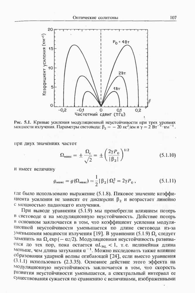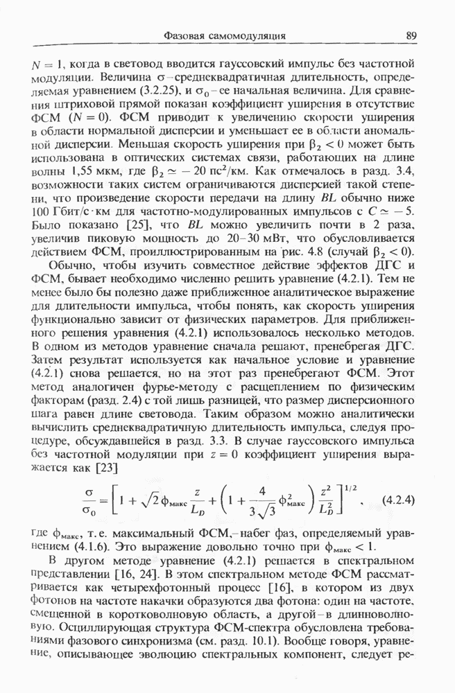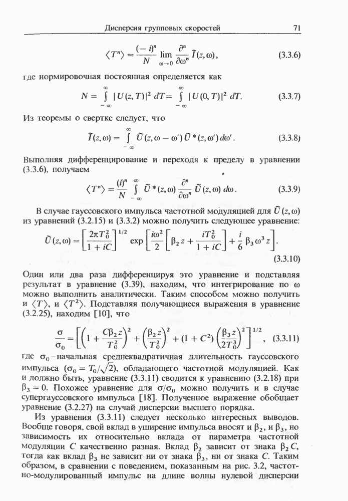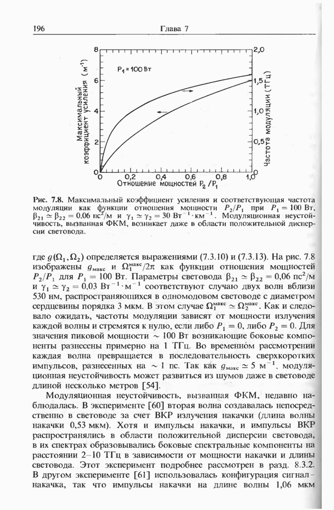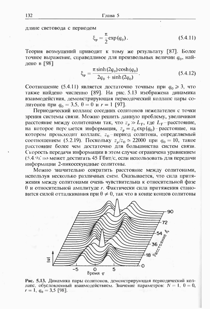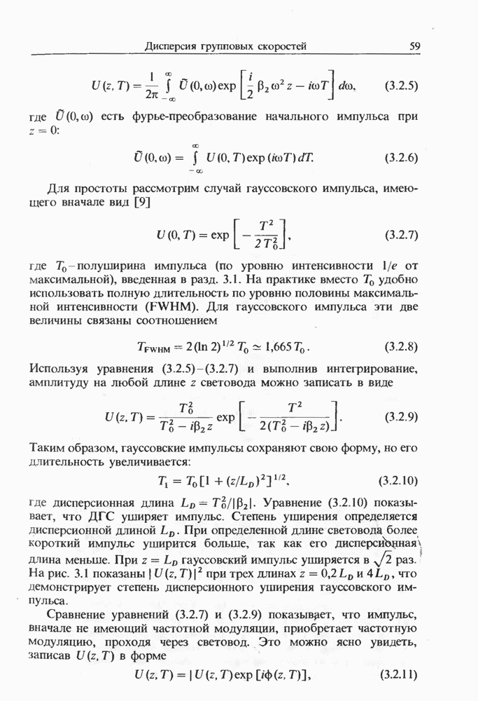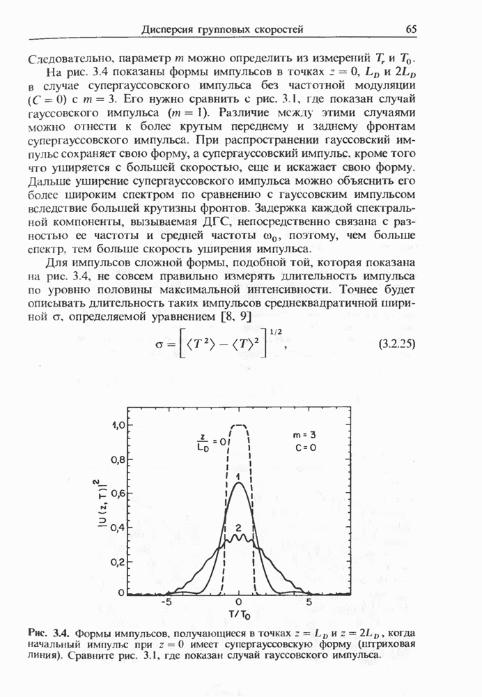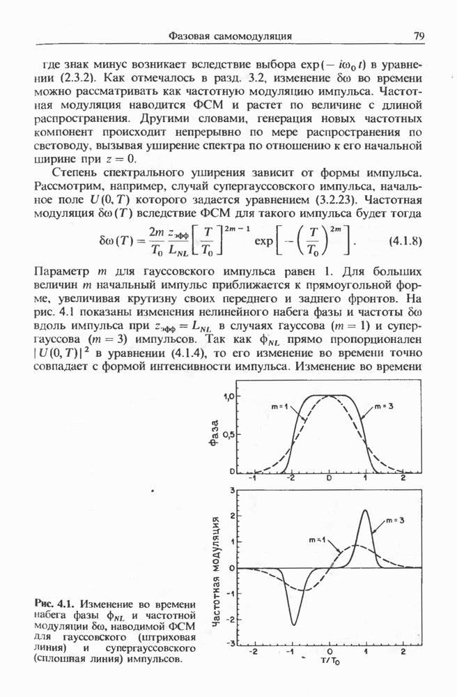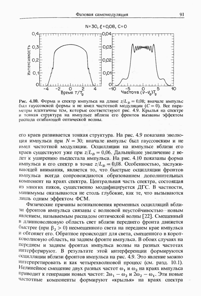 Уравнения (8 3.16) и (8.3.17) можно использовать в случае отрицательной дисперсии, если просто изменить знак второй производной. Как и в случае положительной дисперсии, показанном на рис. 8.8, передача энергии в стоксов импульс происходит вблизи Чтобы из импульса ВКР сформировать солитон, необходимо, чтобы где оптимальная длина световода для компрессора, обсуждавшегося в разд. 6.4 Это условие подразумевает, что не должно быть слишком малым по сравнению с дисперсионной длиной Например, для солитона третьего порядка, если учесть, что при где период солитона. В разд. 6.4 было показано, что и становятся сравнимыми для фемтосекундных импульсов длительностью Для таких сверхкоротких импульсов различие между импульсами накачки и ВКР смазывается, поскольку их спектры начинают заметно перекрываться. Это видно, например, из того факта, что пик усиления на рис. 8.1 соответствует отстройке частоты величиной в то время как ширина спектра -фемтосекундного импульса составляет Уравнения (8.3.16) и (8.3.17) не дают реалистического описания ВКР фемтосекундных импульсов, в частности для отрицательной дисперсии, где исходный импульс может заметно укорачиваться в начале распространения.