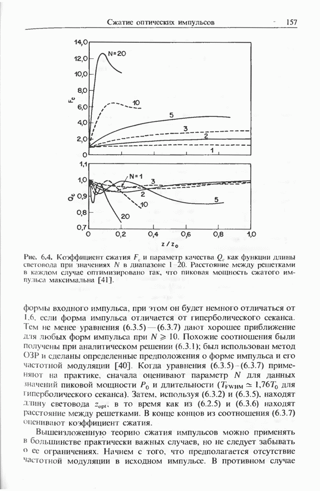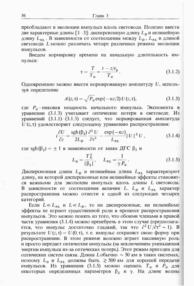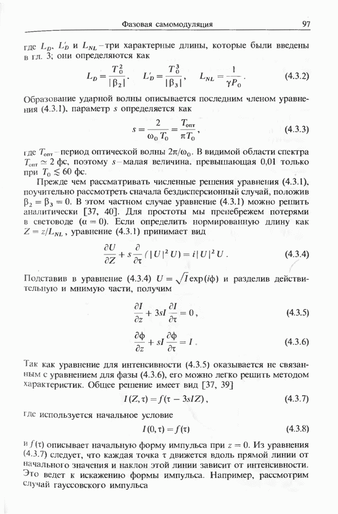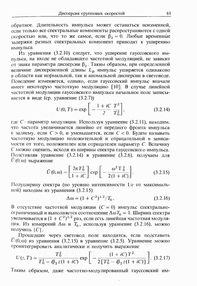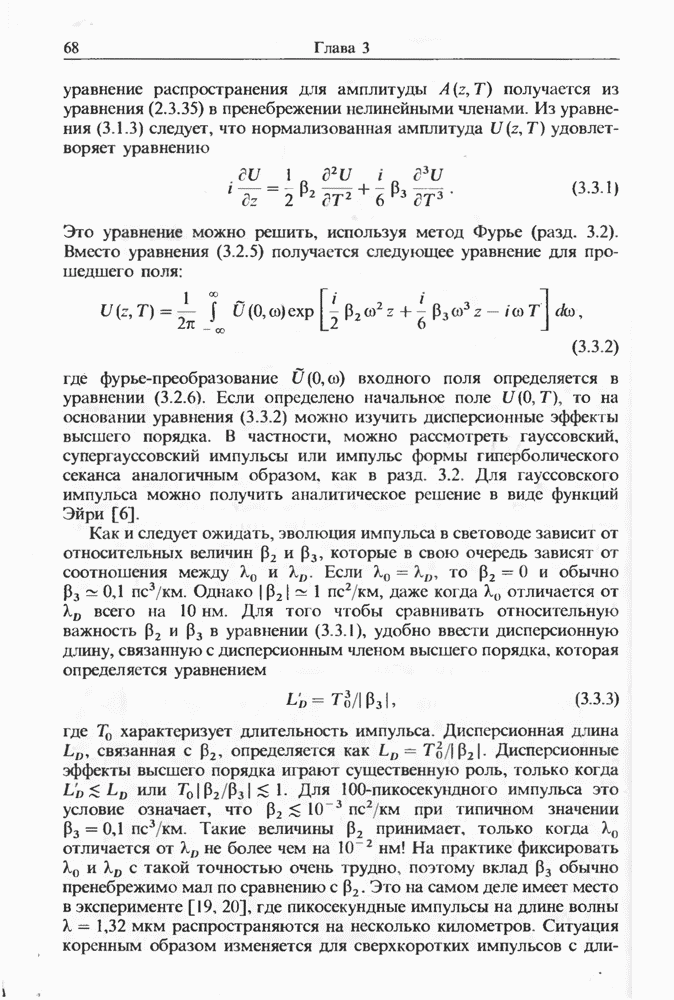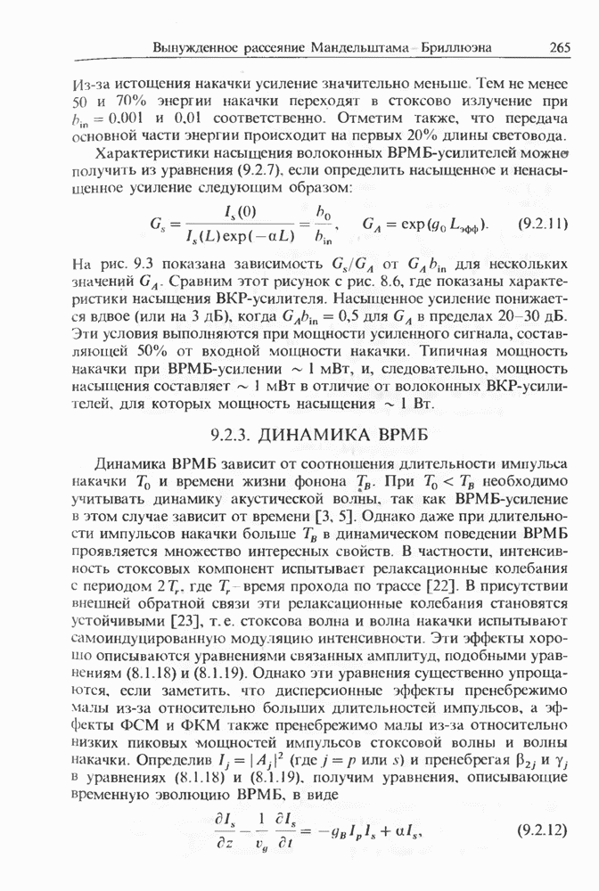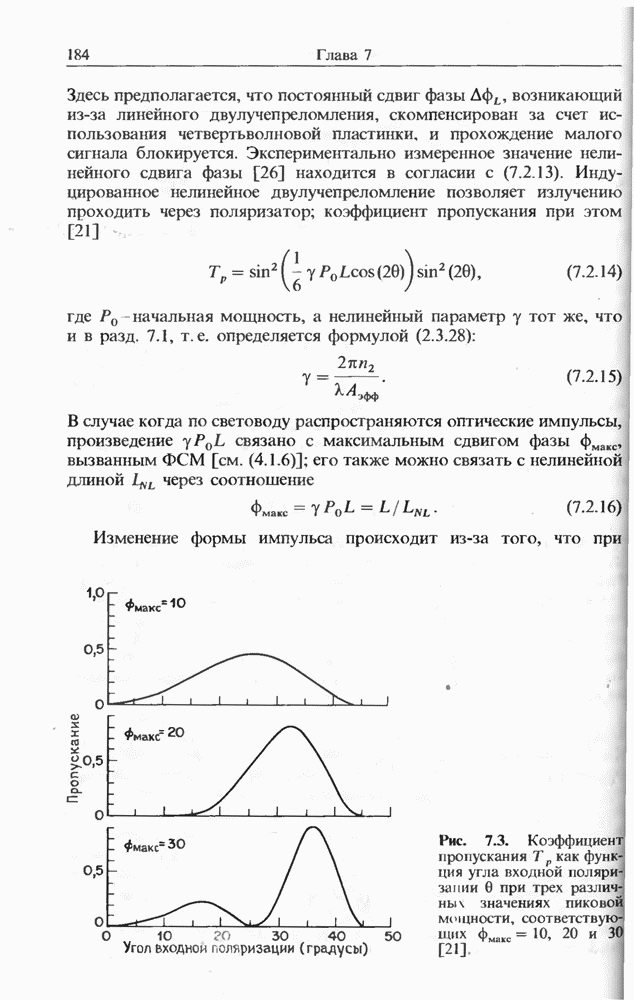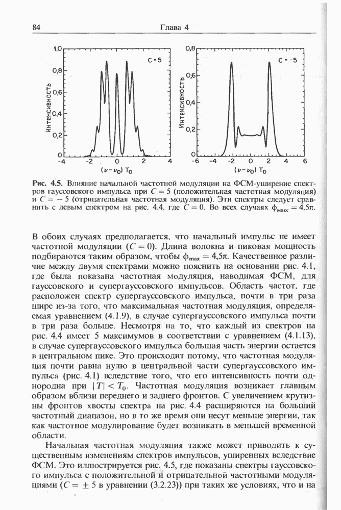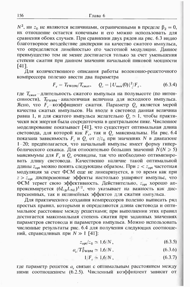 Уравнения (8 3.16) и (8.3.17) можно использовать в случае отрицательной дисперсии, если просто изменить знак второй производной. Как и в случае положительной дисперсии, показанном на рис. 8.8, передача энергии в стоксов импульс происходит вблизи Чтобы из импульса ВКР сформировать солитон, необходимо, чтобы где оптимальная длина световода для компрессора, обсуждавшегося в разд. 6.4 Это условие подразумевает, что не должно быть слишком малым по сравнению с дисперсионной длиной Например, для солитона третьего порядка, если учесть, что при где период солитона. В разд. 6.4 было показано, что и становятся сравнимыми для фемтосекундных импульсов длительностью Для таких сверхкоротких импульсов различие между импульсами накачки и ВКР смазывается, поскольку их спектры начинают заметно перекрываться. Это видно, например, из того факта, что пик усиления на рис. 8.1 соответствует отстройке частоты величиной в то время как ширина спектра -фемтосекундного импульса составляет Уравнения (8.3.16) и (8.3.17) не дают реалистического описания ВКР фемтосекундных импульсов, в частности для отрицательной дисперсии, где исходный импульс может заметно укорачиваться в начале распространения.