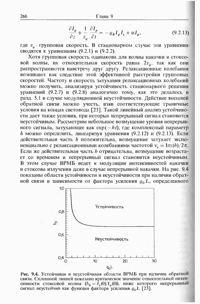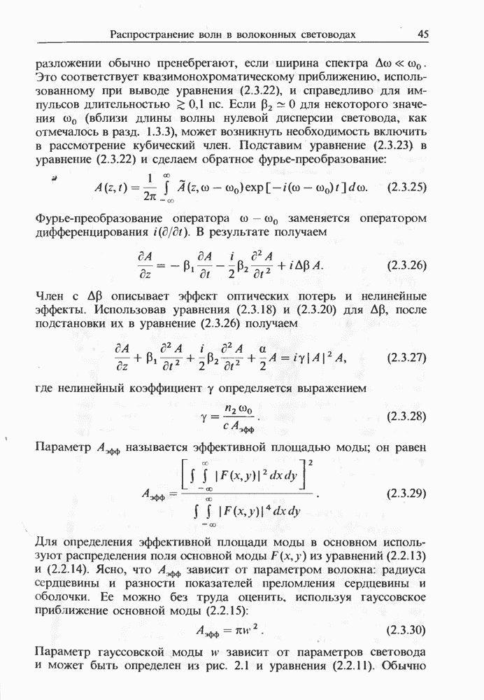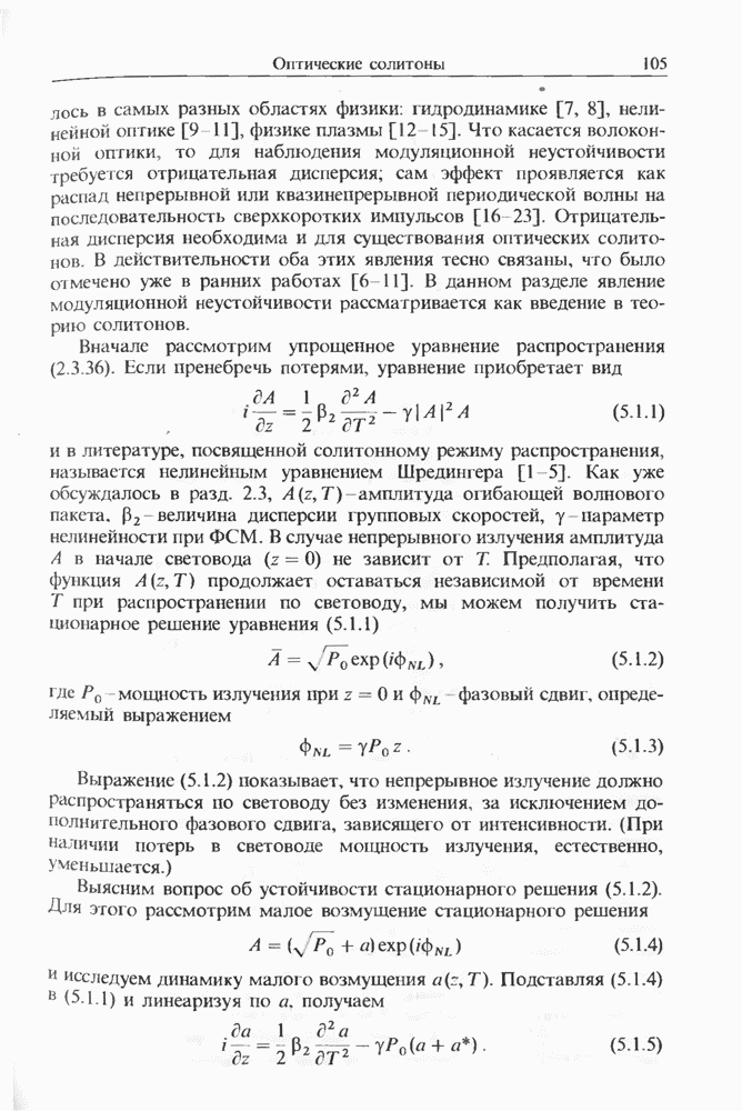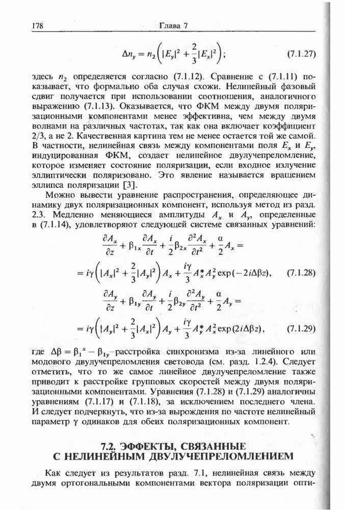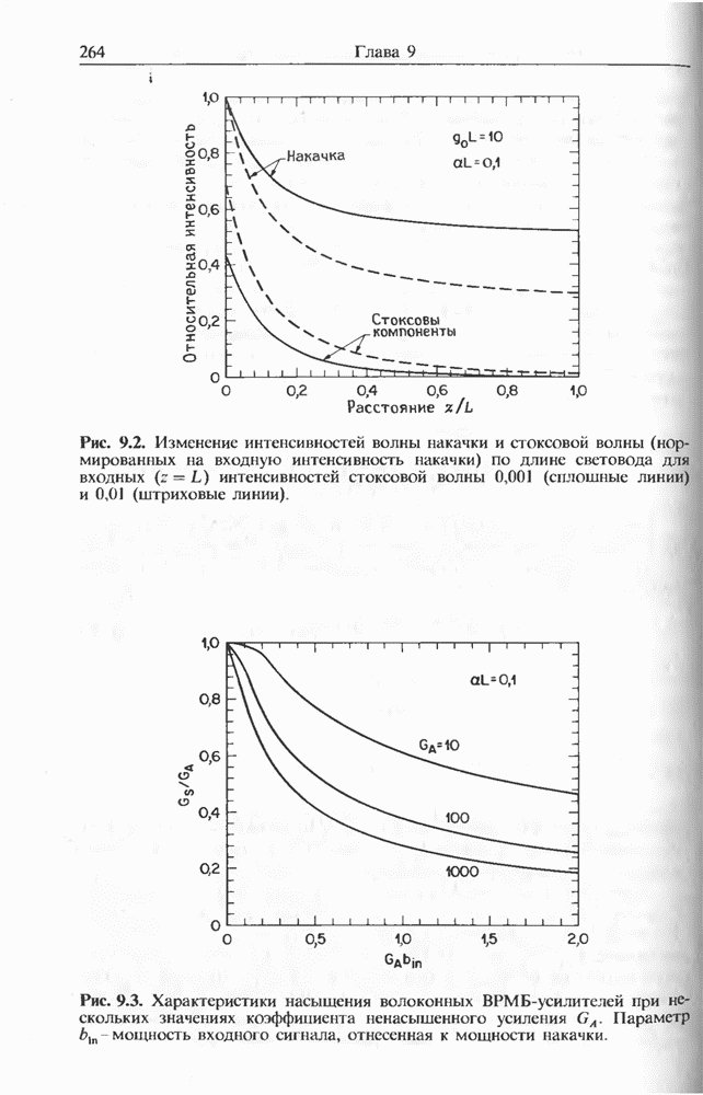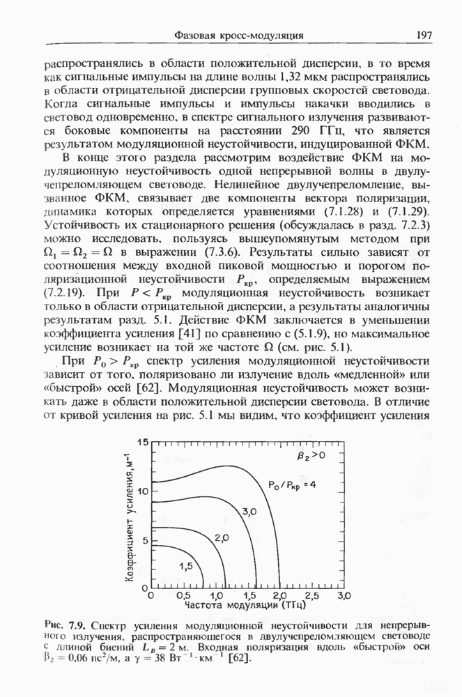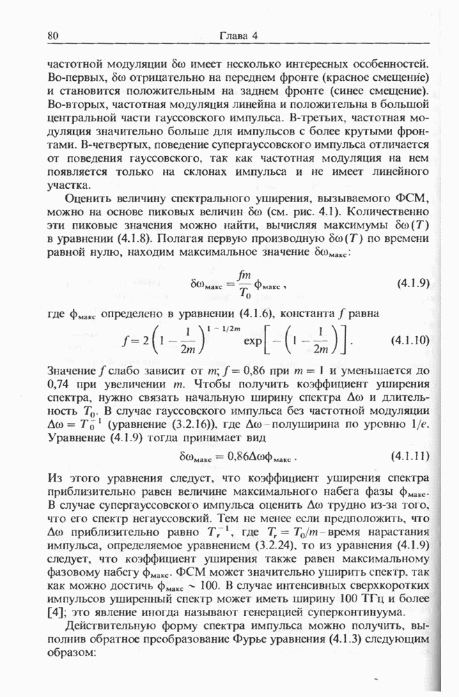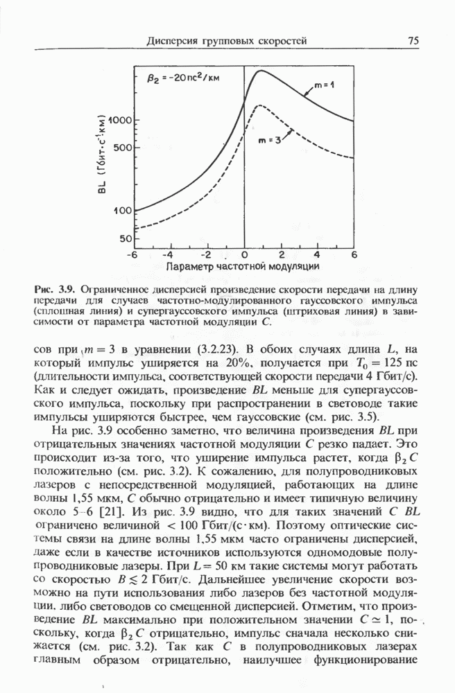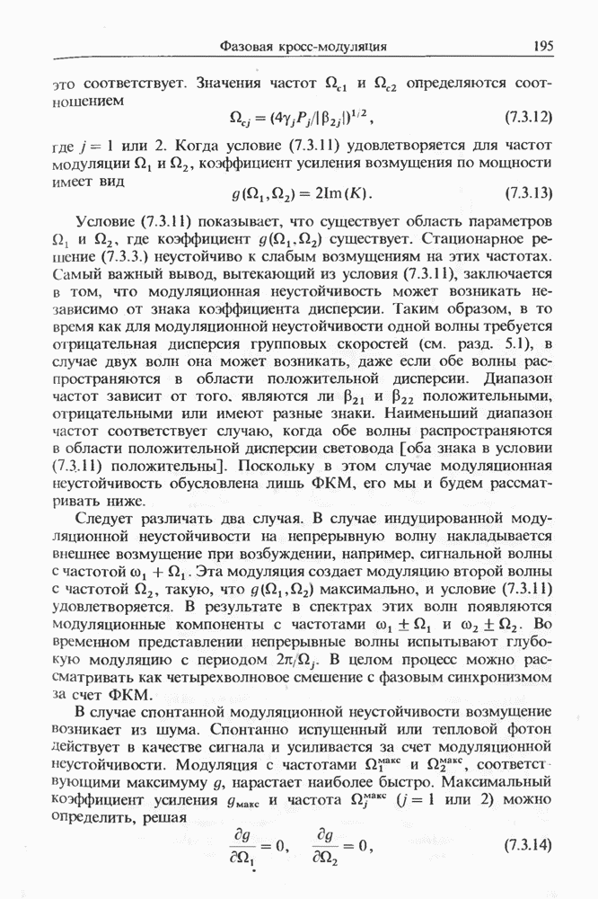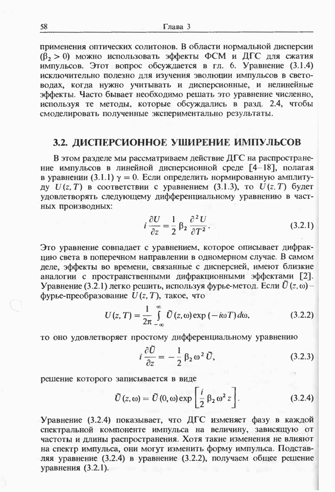 Уравнения (8 3.16) и (8.3.17) можно использовать в случае отрицательной дисперсии, если просто изменить знак второй производной. Как и в случае положительной дисперсии, показанном на рис. 8.8, передача энергии в стоксов импульс происходит вблизи Чтобы из импульса ВКР сформировать солитон, необходимо, чтобы где оптимальная длина световода для компрессора, обсуждавшегося в разд. 6.4 Это условие подразумевает, что не должно быть слишком малым по сравнению с дисперсионной длиной Например, для солитона третьего порядка, если учесть, что при где период солитона. В разд. 6.4 было показано, что и становятся сравнимыми для фемтосекундных импульсов длительностью Для таких сверхкоротких импульсов различие между импульсами накачки и ВКР смазывается, поскольку их спектры начинают заметно перекрываться. Это видно, например, из того факта, что пик усиления на рис. 8.1 соответствует отстройке частоты величиной в то время как ширина спектра -фемтосекундного импульса составляет Уравнения (8.3.16) и (8.3.17) не дают реалистического описания ВКР фемтосекундных импульсов, в частности для отрицательной дисперсии, где исходный импульс может заметно укорачиваться в начале распространения.