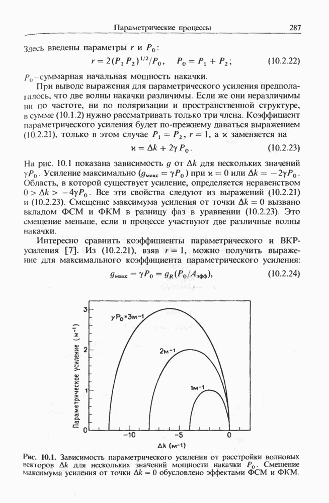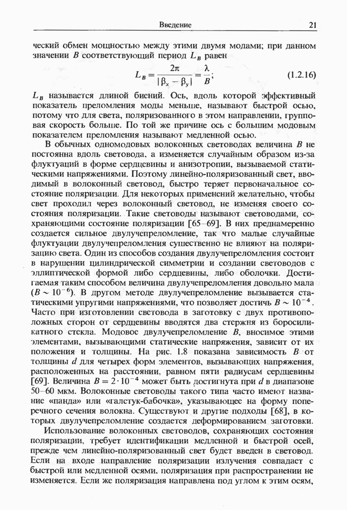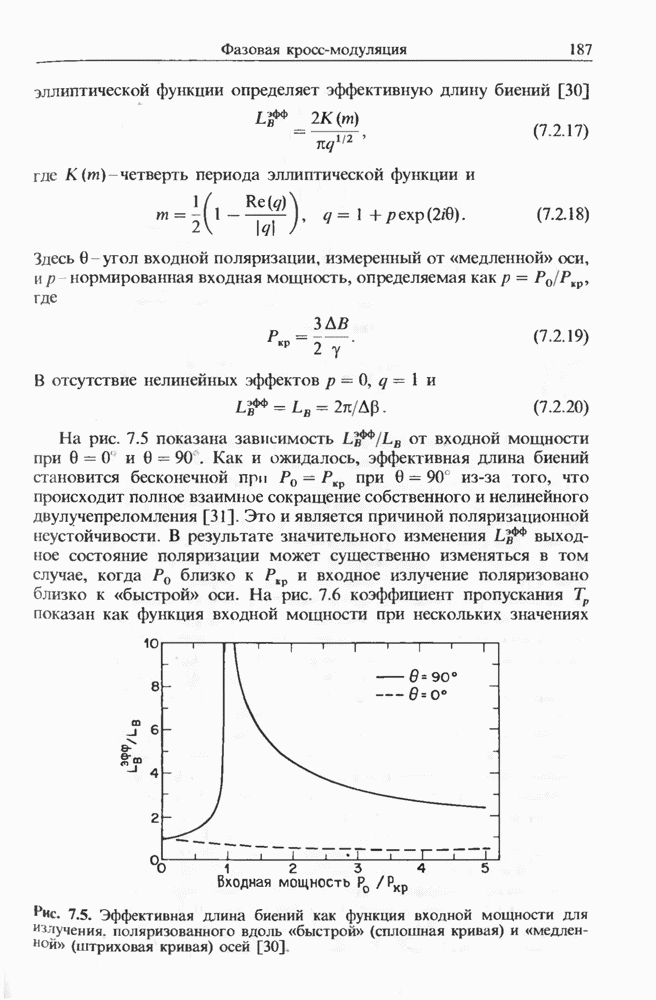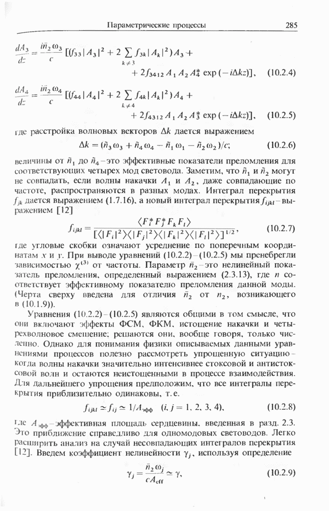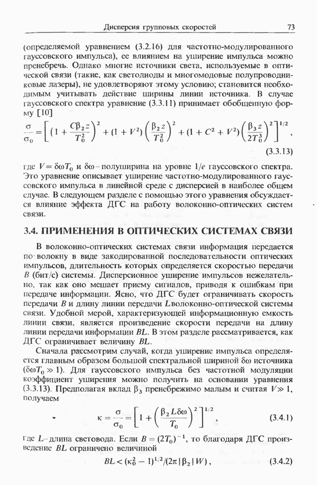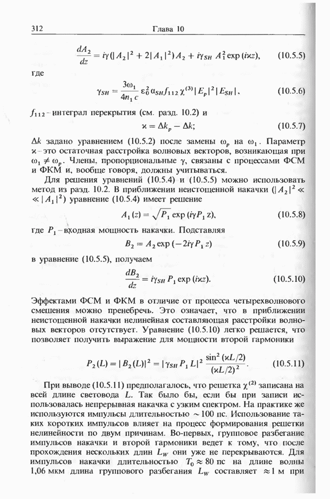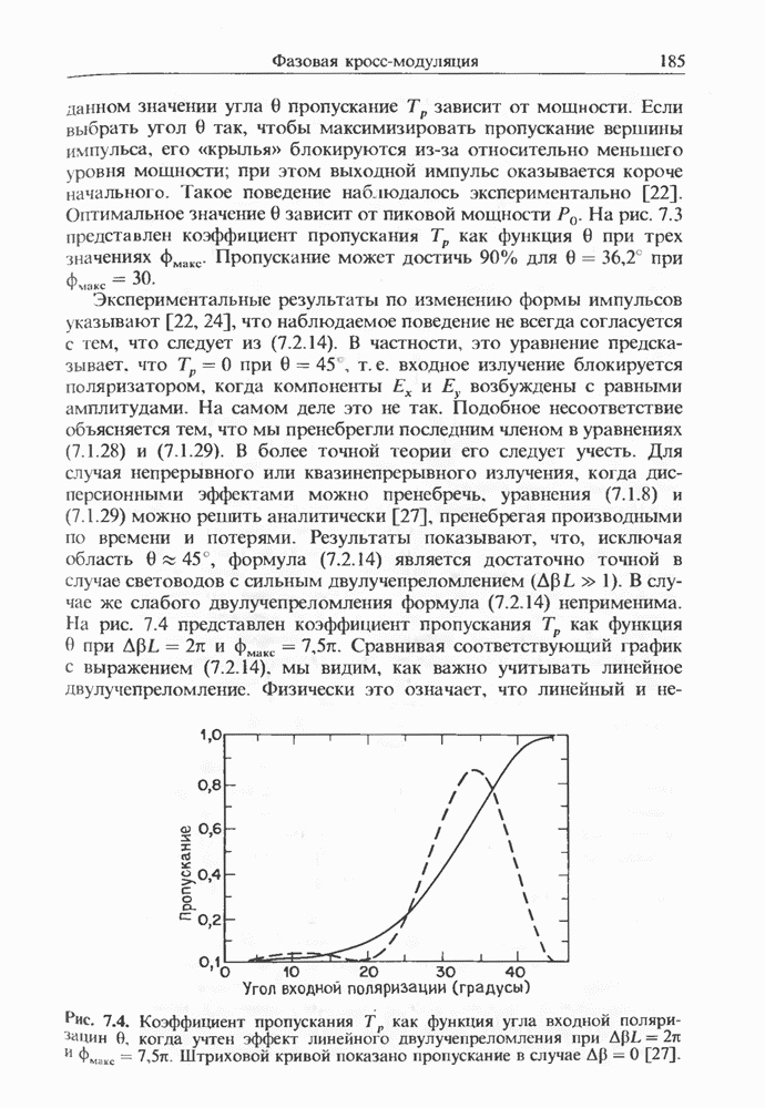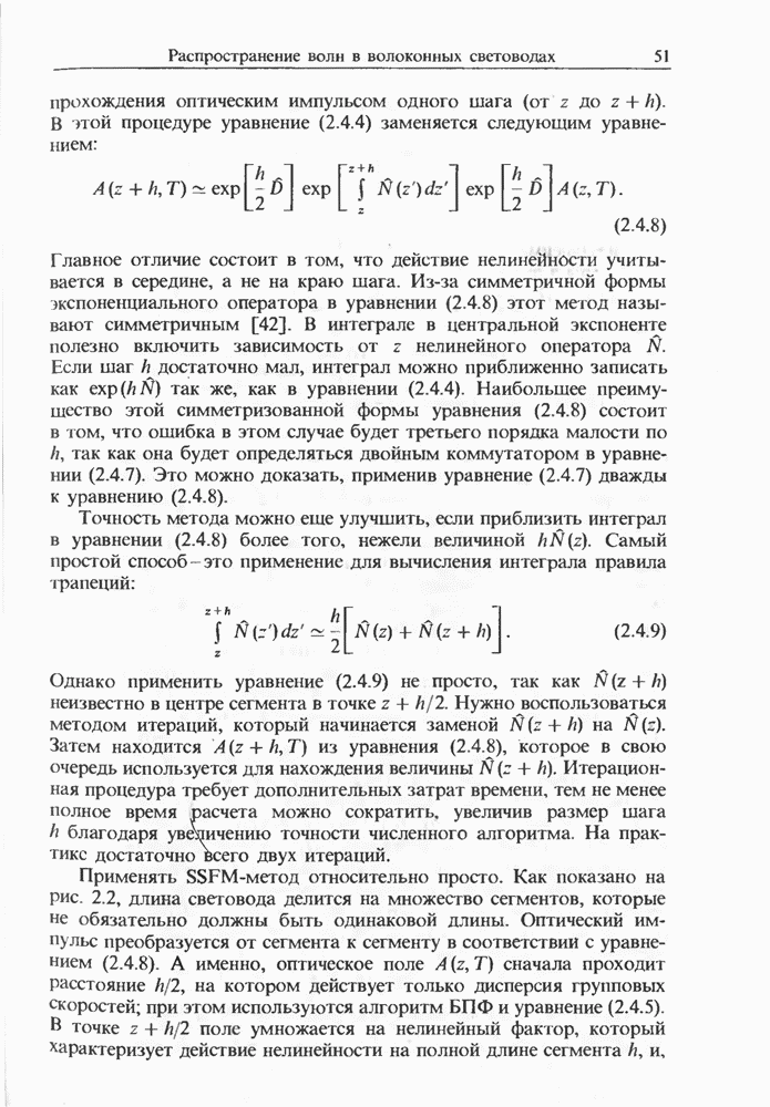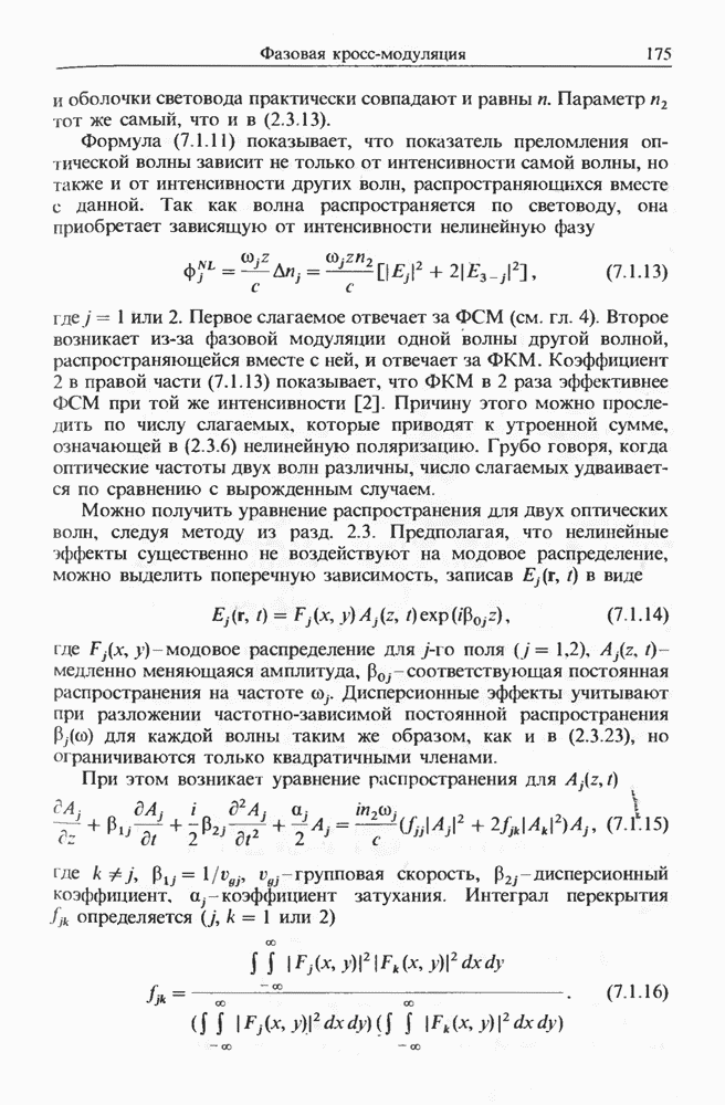 Уравнения (8 3.16) и (8.3.17) можно использовать в случае отрицательной дисперсии, если просто изменить знак второй производной. Как и в случае положительной дисперсии, показанном на рис. 8.8, передача энергии в стоксов импульс происходит вблизи Чтобы из импульса ВКР сформировать солитон, необходимо, чтобы где оптимальная длина световода для компрессора, обсуждавшегося в разд. 6.4 Это условие подразумевает, что не должно быть слишком малым по сравнению с дисперсионной длиной Например, для солитона третьего порядка, если учесть, что при где период солитона. В разд. 6.4 было показано, что и становятся сравнимыми для фемтосекундных импульсов длительностью Для таких сверхкоротких импульсов различие между импульсами накачки и ВКР смазывается, поскольку их спектры начинают заметно перекрываться. Это видно, например, из того факта, что пик усиления на рис. 8.1 соответствует отстройке частоты величиной в то время как ширина спектра -фемтосекундного импульса составляет Уравнения (8.3.16) и (8.3.17) не дают реалистического описания ВКР фемтосекундных импульсов, в частности для отрицательной дисперсии, где исходный импульс может заметно укорачиваться в начале распространения.