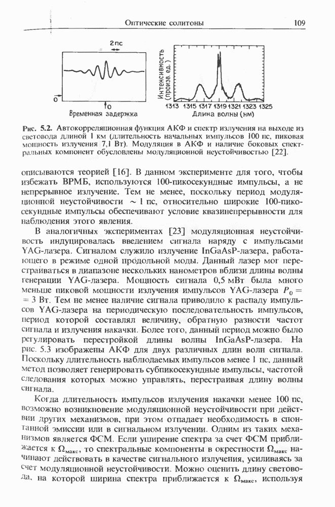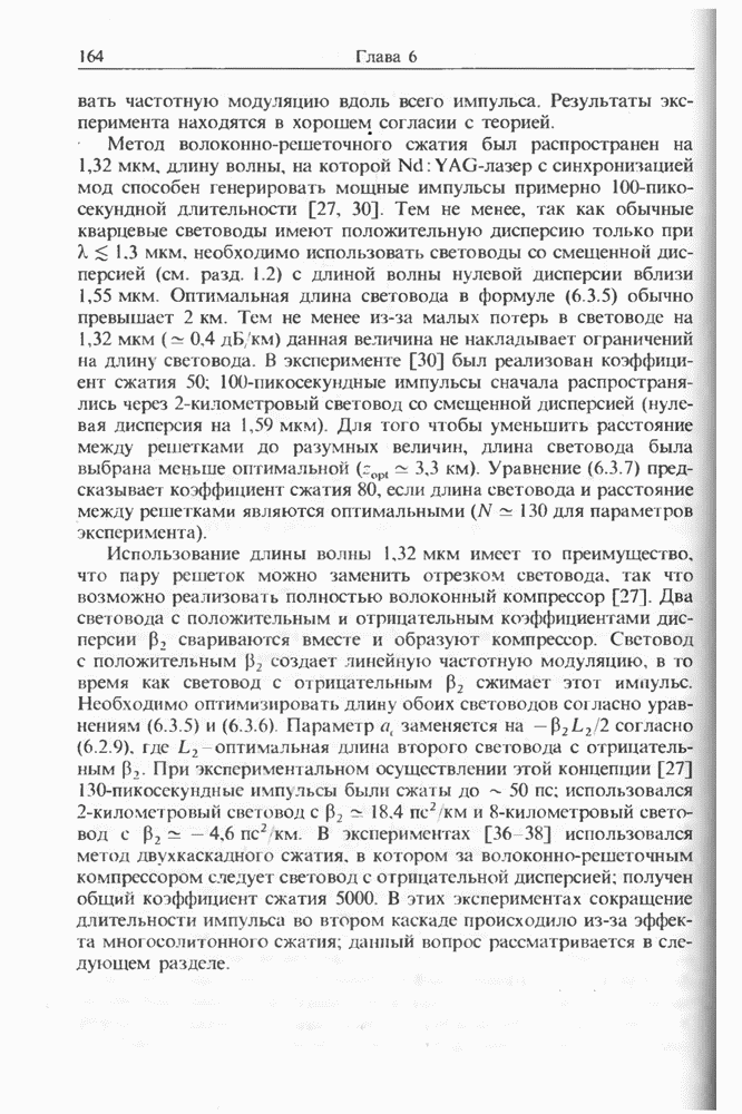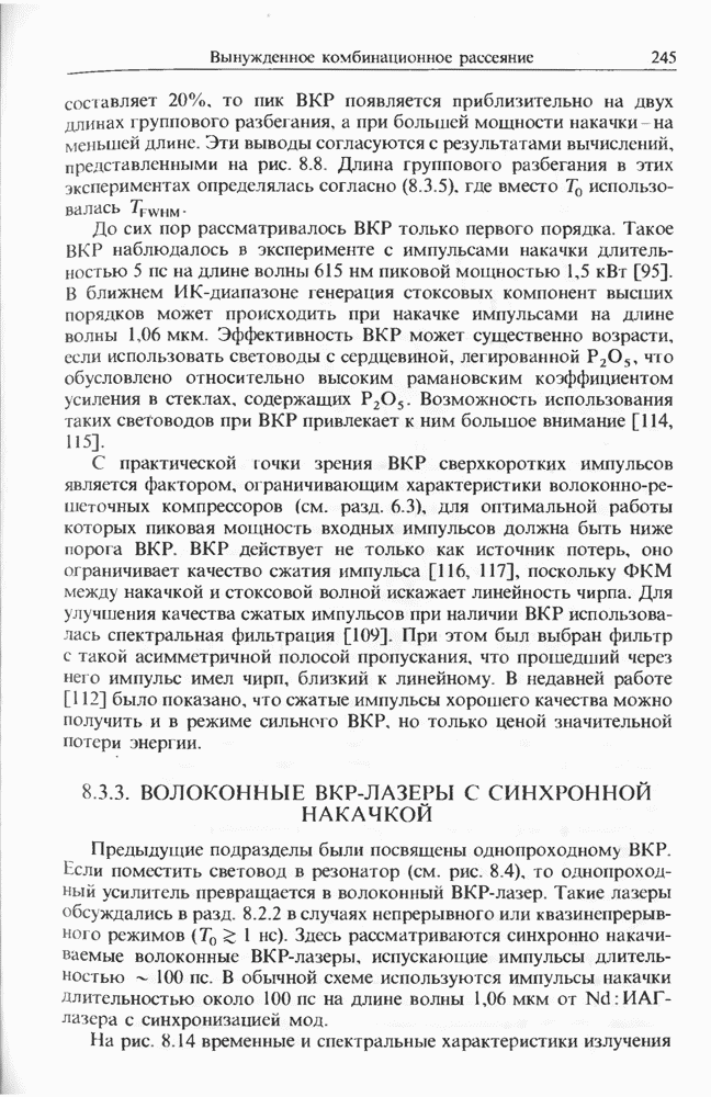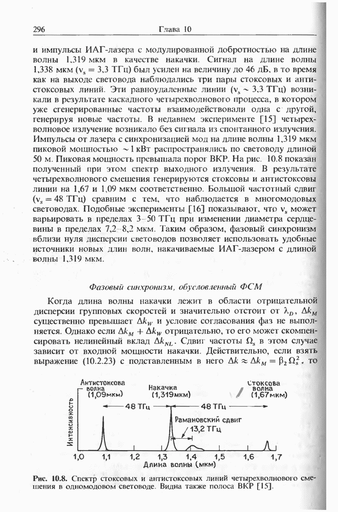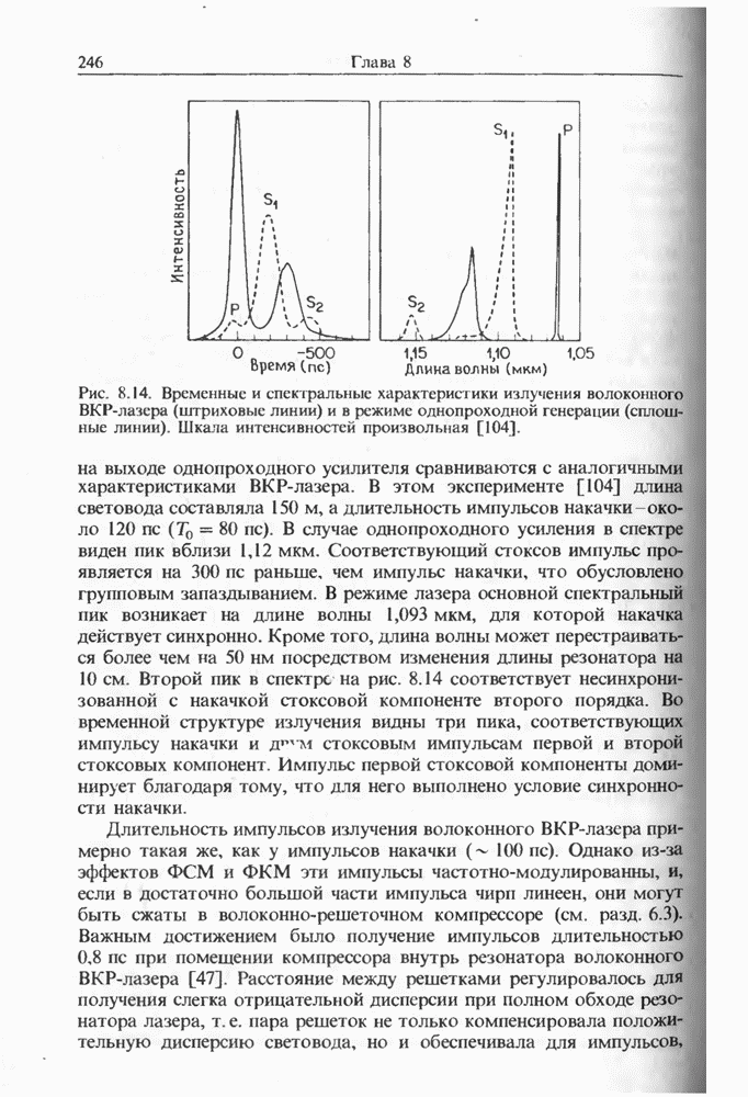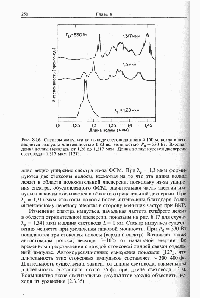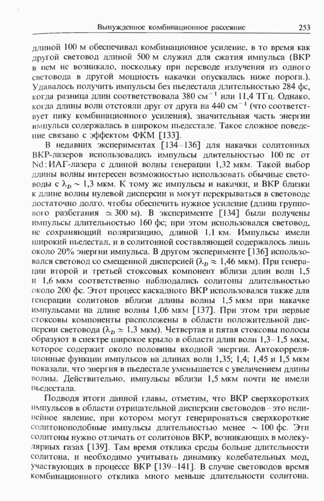 Солитоны ВКР были также получены при накачке -пикосекунд-ными импульсами от Nd ИАГ-лазера с синхронизацией мод, работавшего на длине волны 1,32 мкм. В эксперименте [129] в обычном световоде с нулем дисперсии вблизи 1,3 мкм были получены -фем-тосекундные импульсы ВКР на длине волны 1,4 мкм. В другом