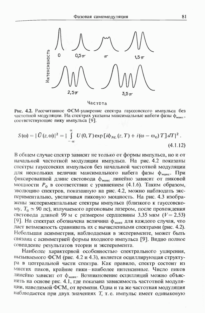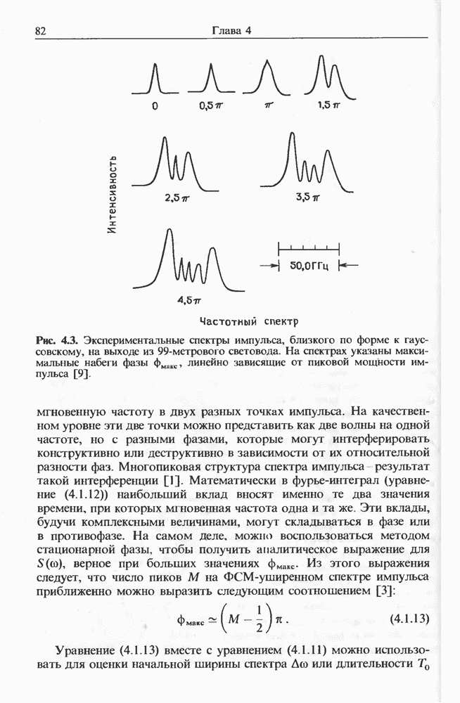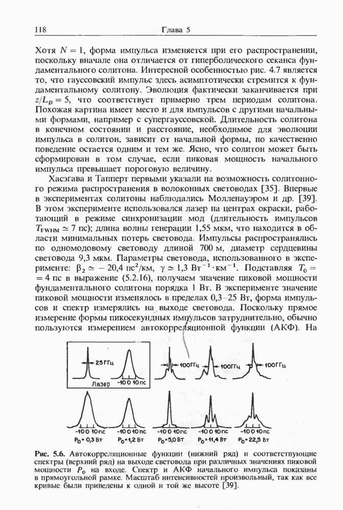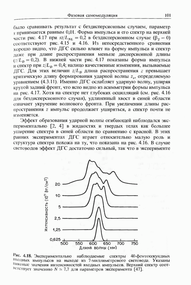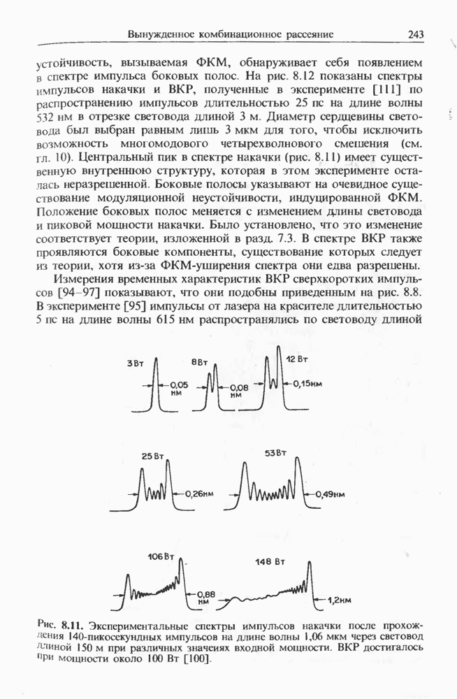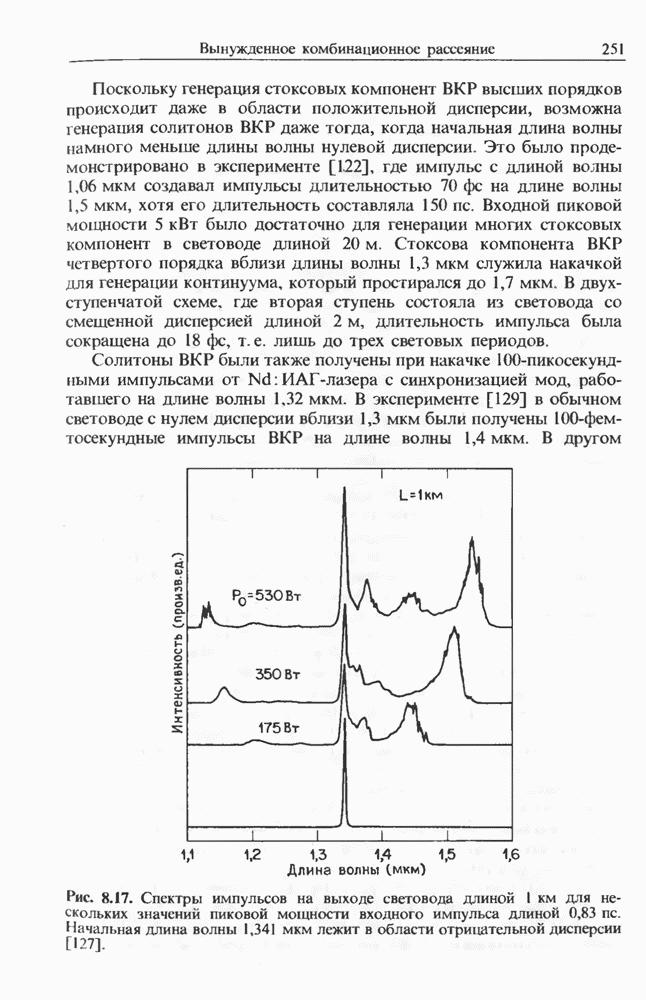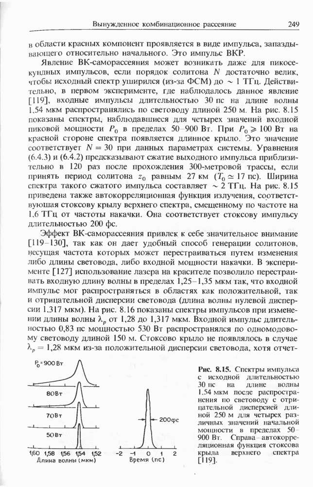 Изменения спектра импульса, начальная частота которого лежит в области отрицательной дисперсии, показаны на рис. 8.17 для случая мкм и длина световода км. Спектр импульса существенно меняется при увеличении пиковой мощности. При появляются три стоксовы полосы (верхний спектр). Возникает также антистоксова полоса, несущая 5-10% от начальной энергии. Во временном представлении с каждой стоксовой линией связан отдельный импульс. Автокорреляционные измерения показали [127], что длительность этих стоксовых импульсов составляет Длительность существенно зависит от длины световода; наименьшая длительность составляла около при длине световода Большинство экспериментальных результатов можно объяснить, исходя из уравнения (2.3.35).