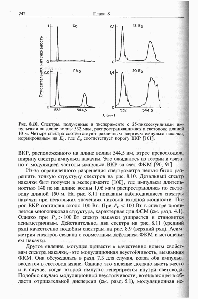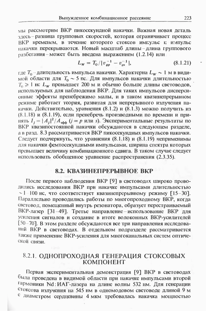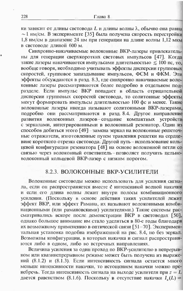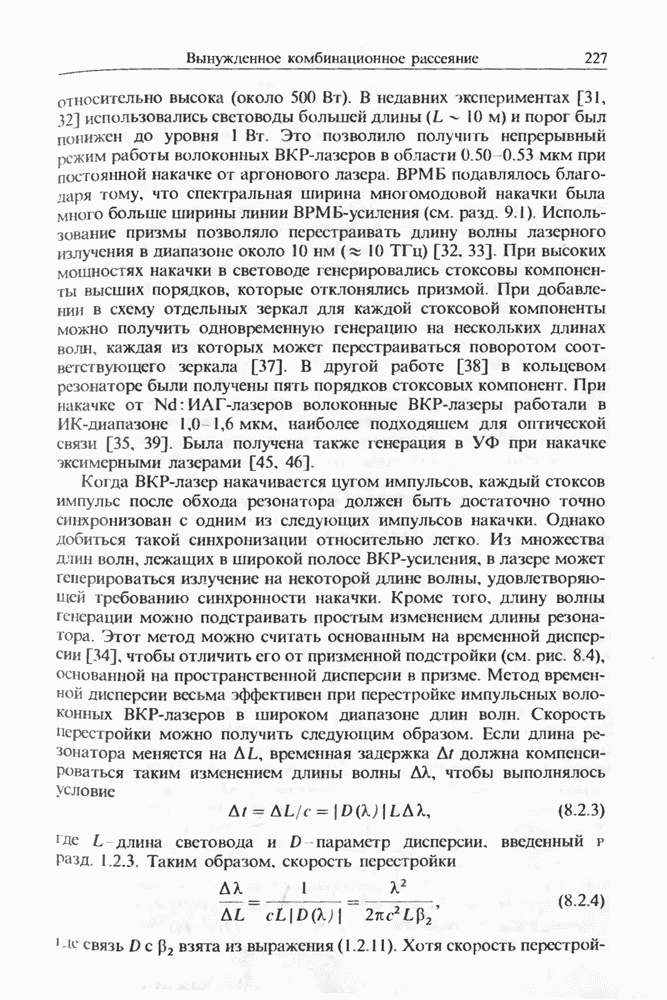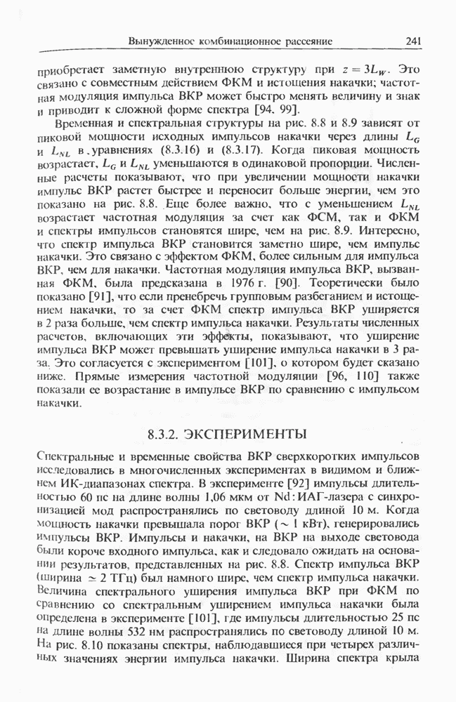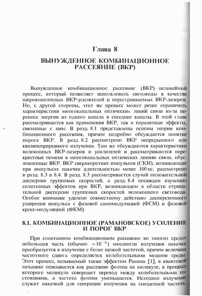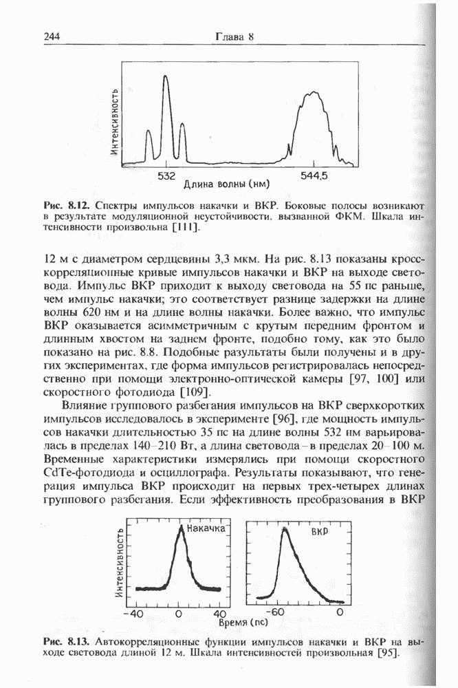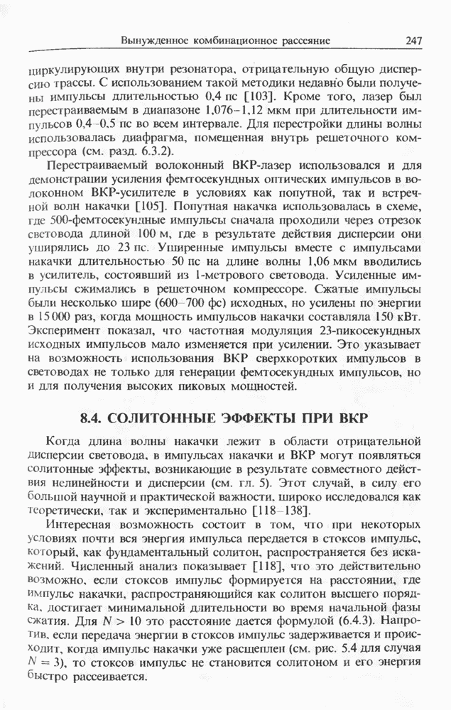Когда длина волны накачки лежит в области отрицательной дисперсии световода, в импульсах накачки и ВКР могут появляться солитонные эффекты, возникающие в результате совместного действия нелинейности и дисперсии (см. гл. 5). Этот случай, в силу его большой научной и практической важности, широко исследовался как теоретически, так и экспериментально [118 138].