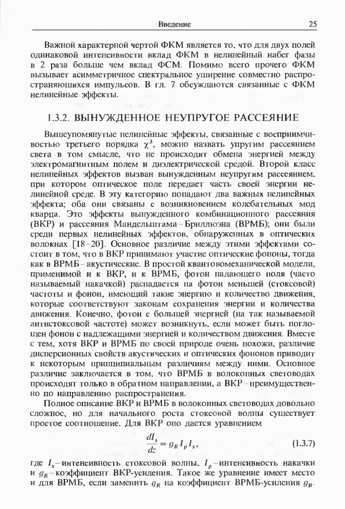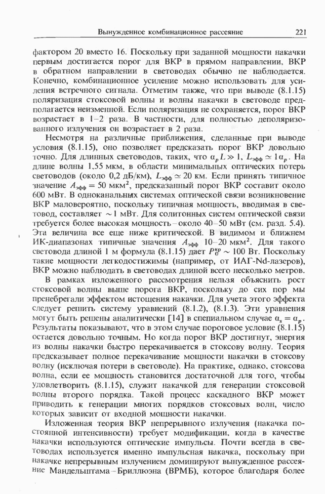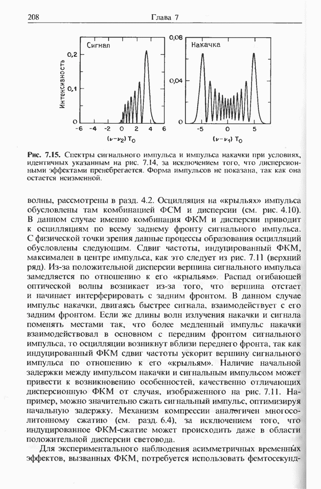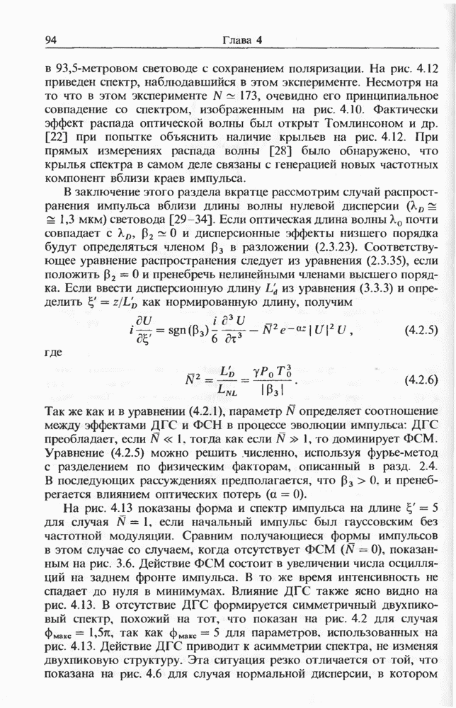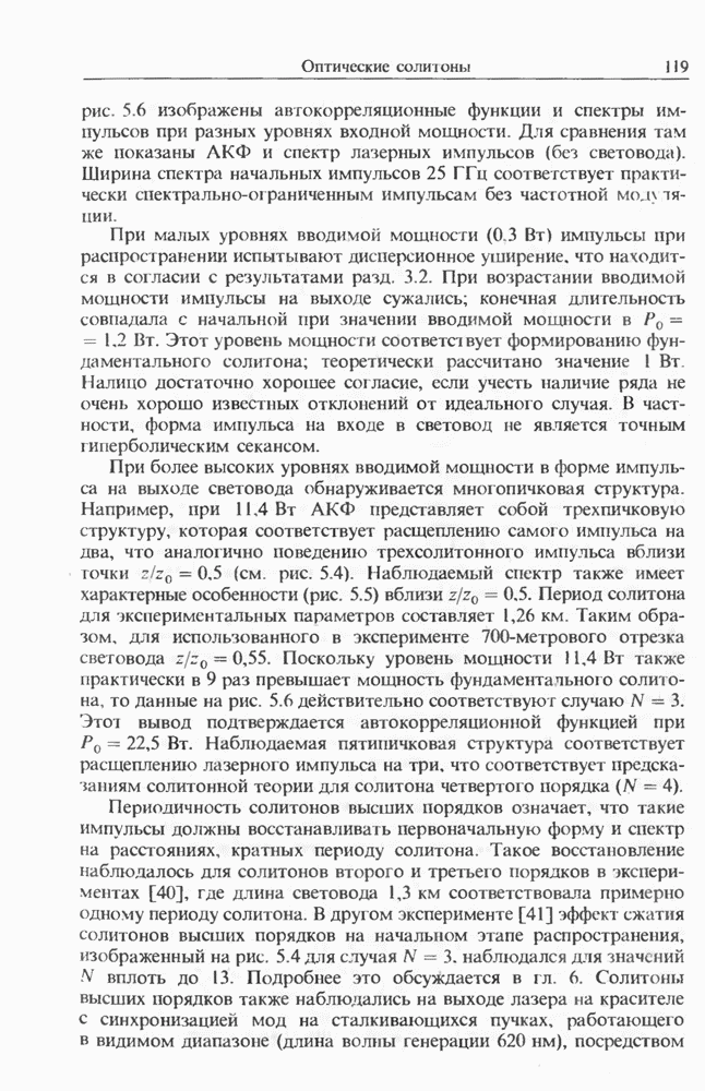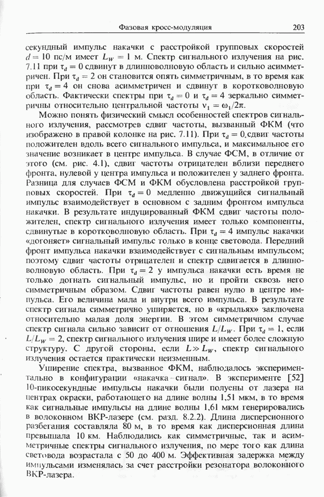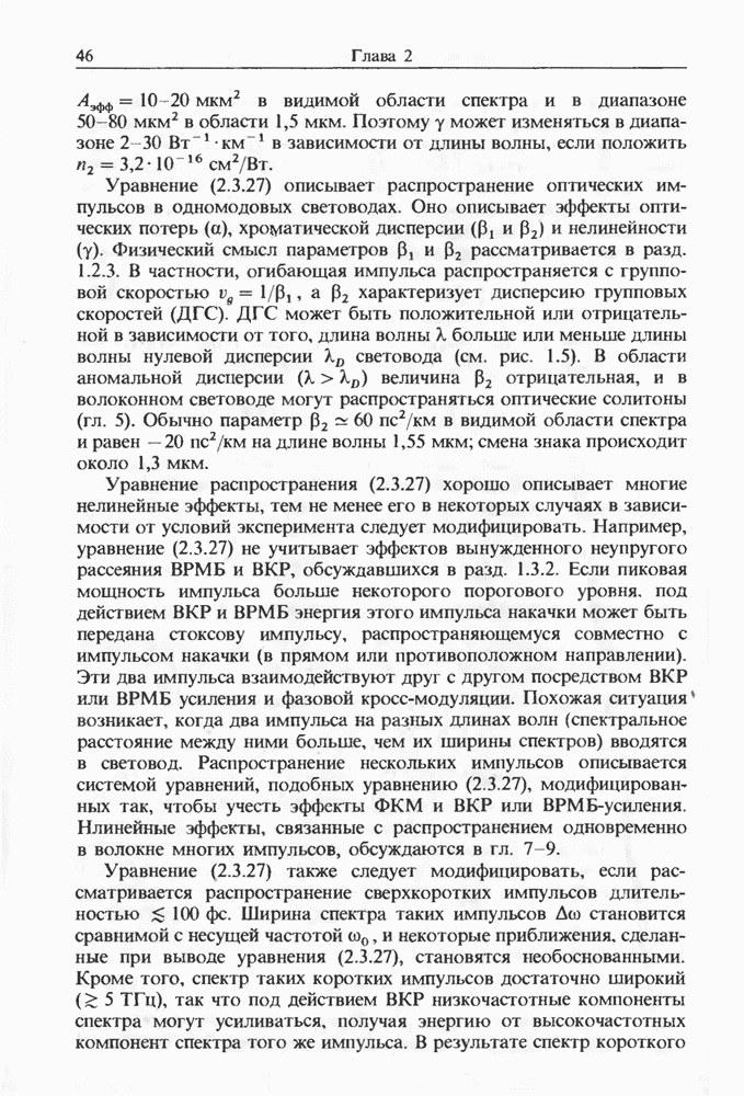 Когда длина волны накачки лежит в области отрицательной дисперсии световода, в импульсах накачки и ВКР могут появляться солитонные эффекты, возникающие в результате совместного действия нелинейности и дисперсии (см. гл. 5). Этот случай, в силу его большой научной и практической важности, широко исследовался как теоретически, так и экспериментально [118 138].